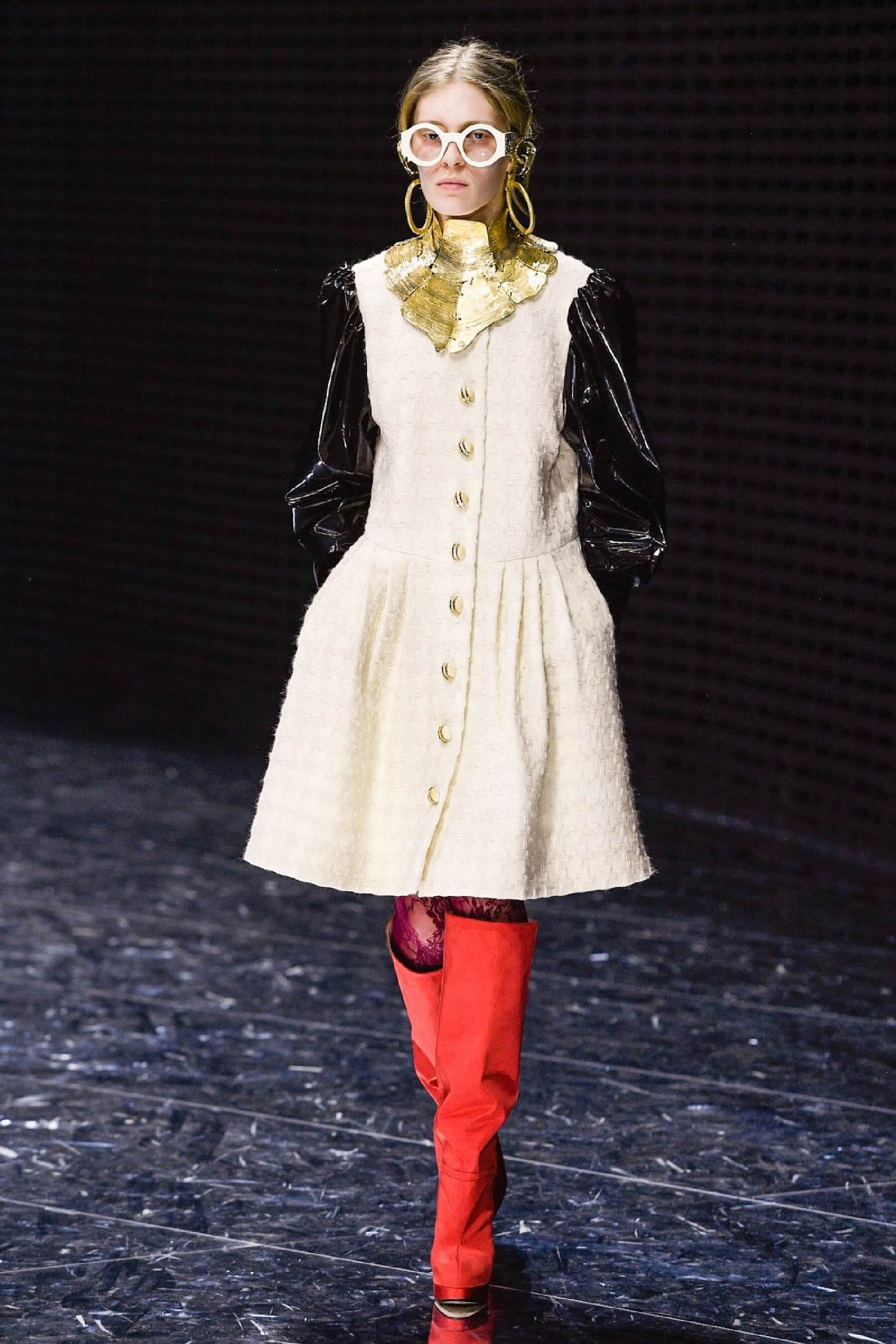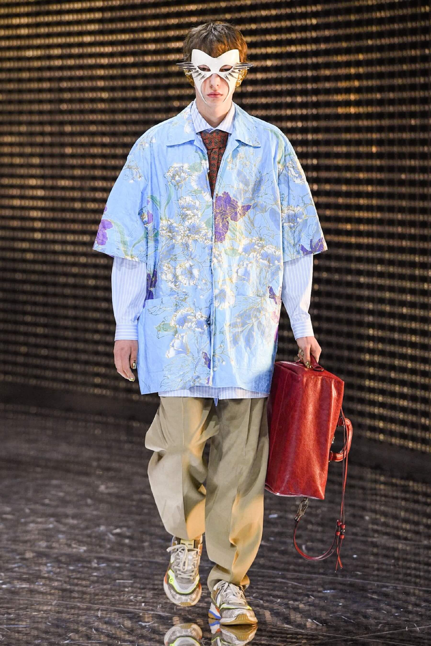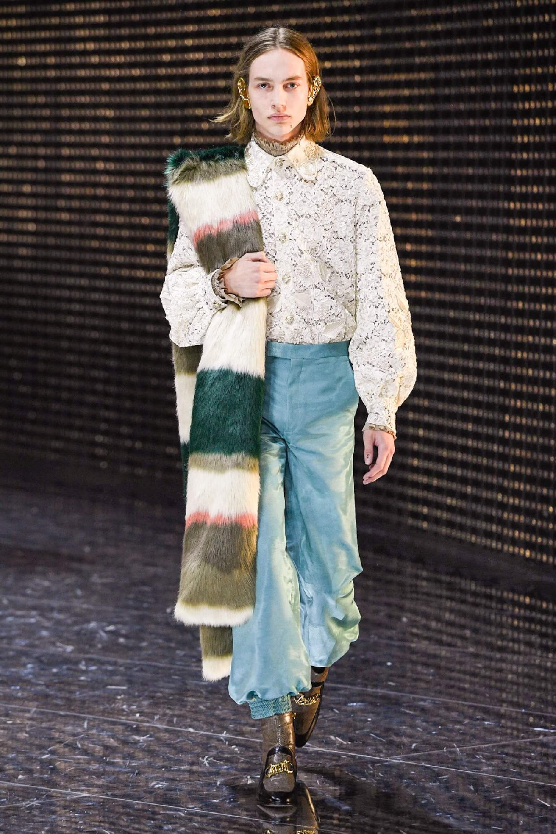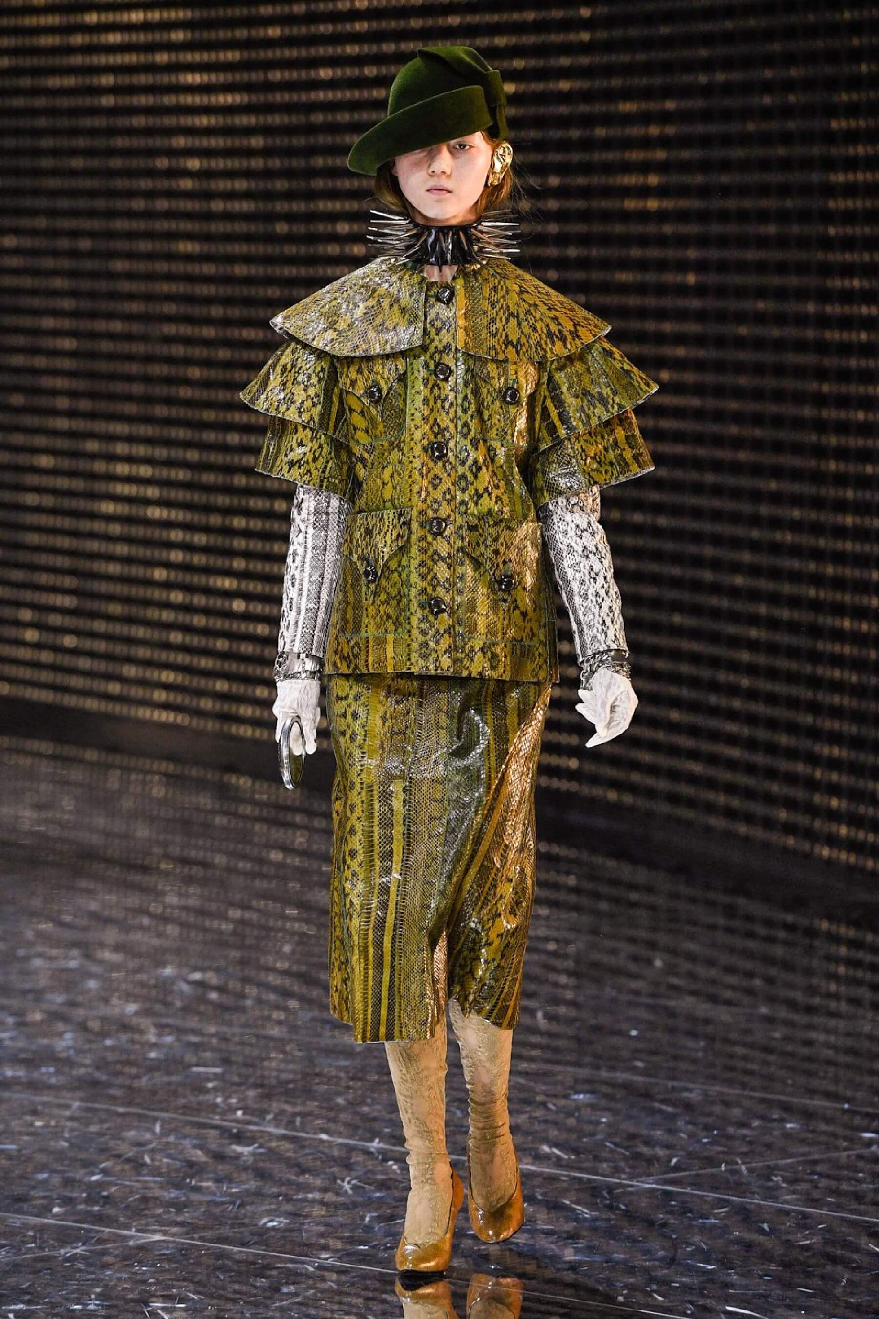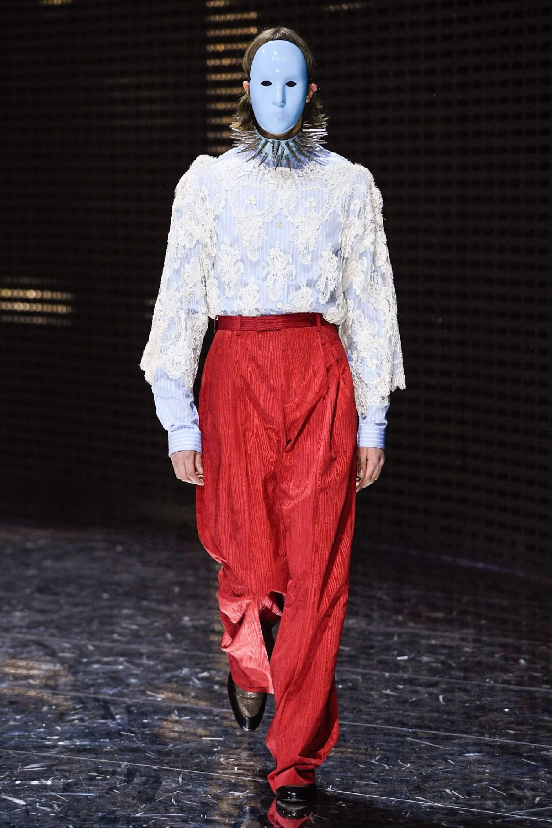 Свою новую (весьма скромную – 87 образов вместо привычных 120) коллекцию для Gucci Алессандро Микеле посвятил античной красоте, фетишизму и маскам, которые олицетворяют дуальность человеческой природы согласно философии Ханны Арендт, чьё мнение созвучно с восприятием самого дизайнера.