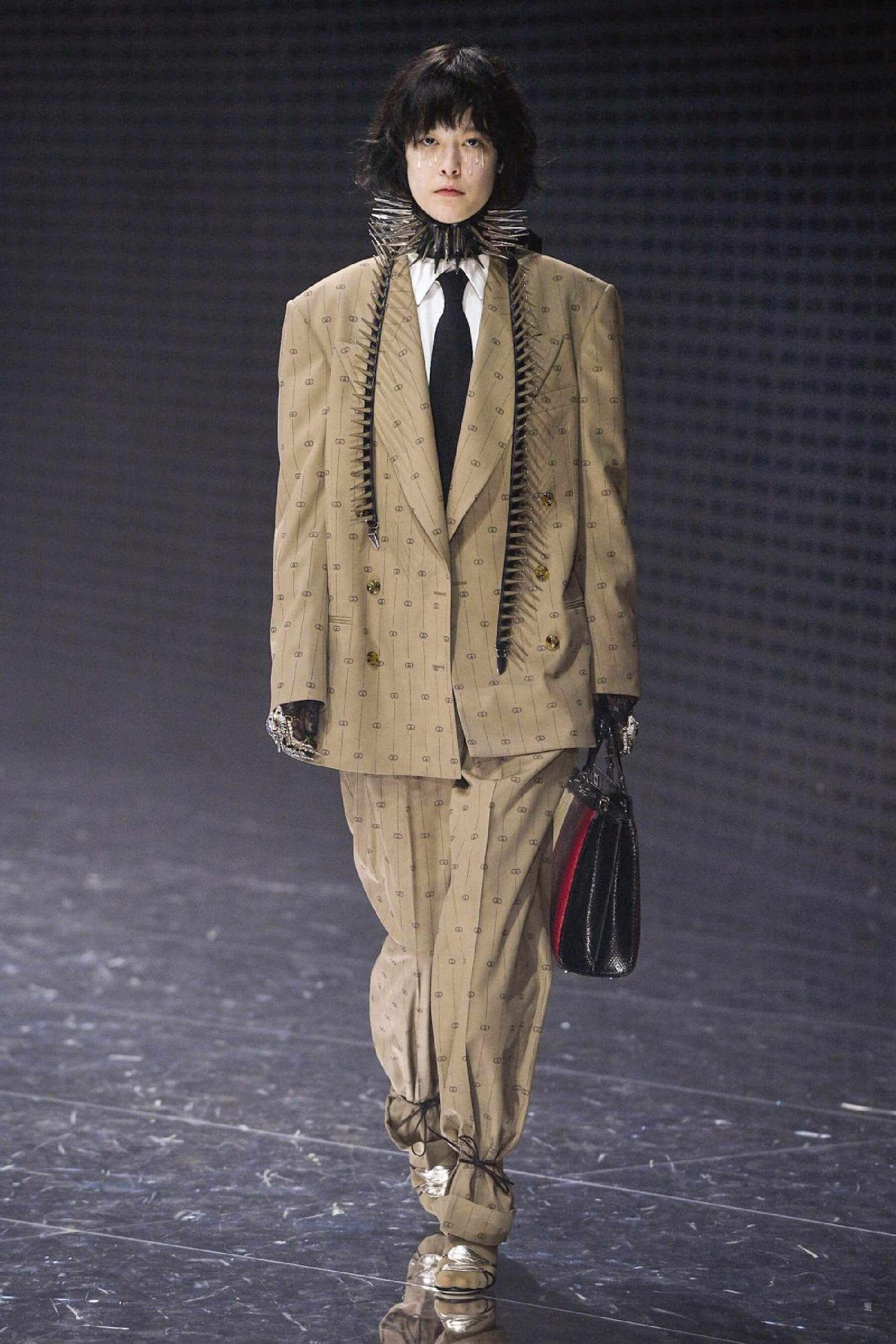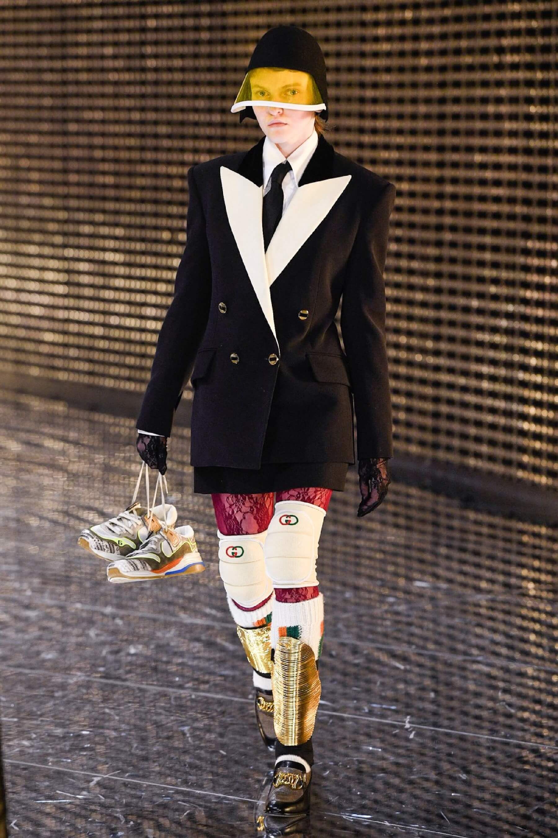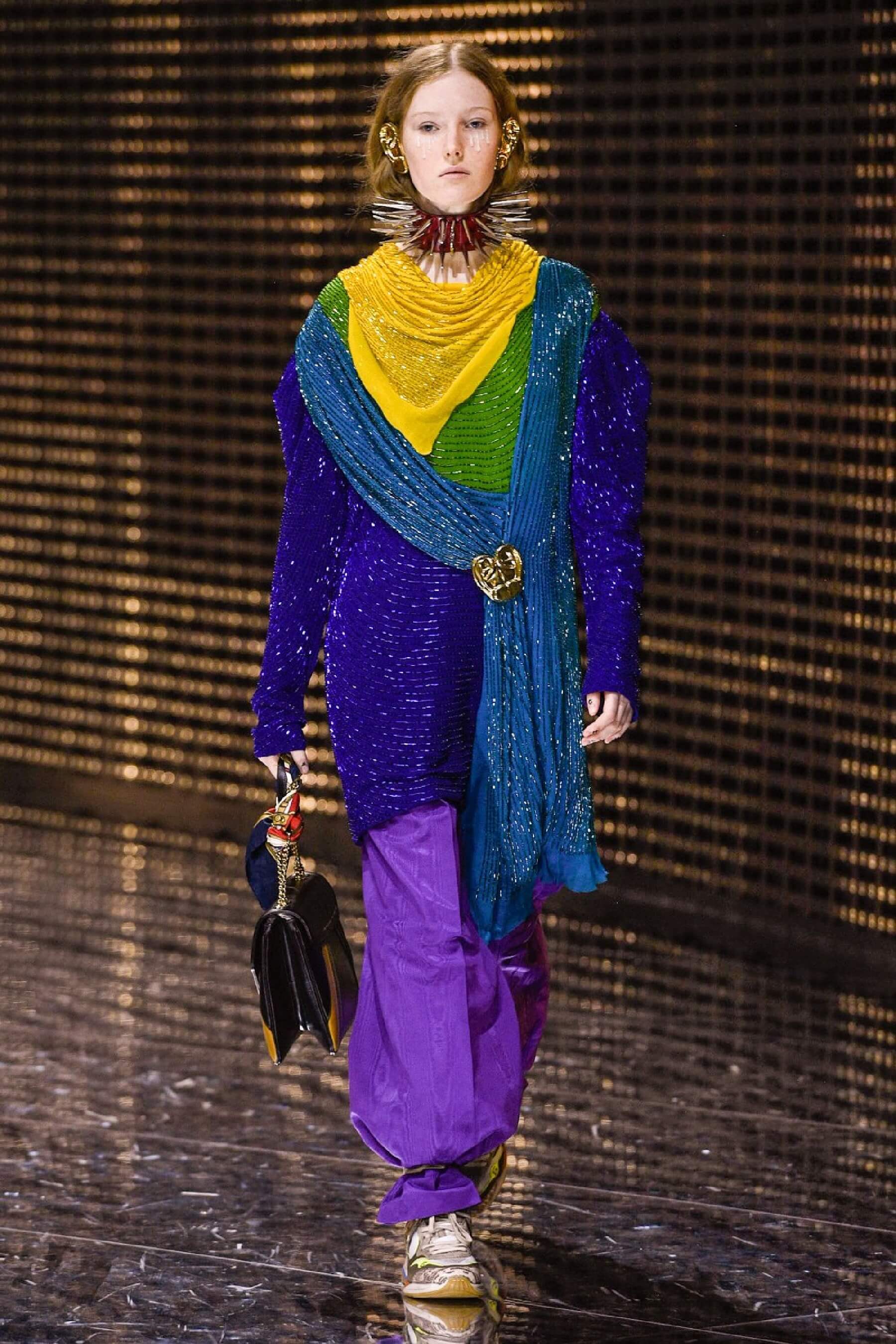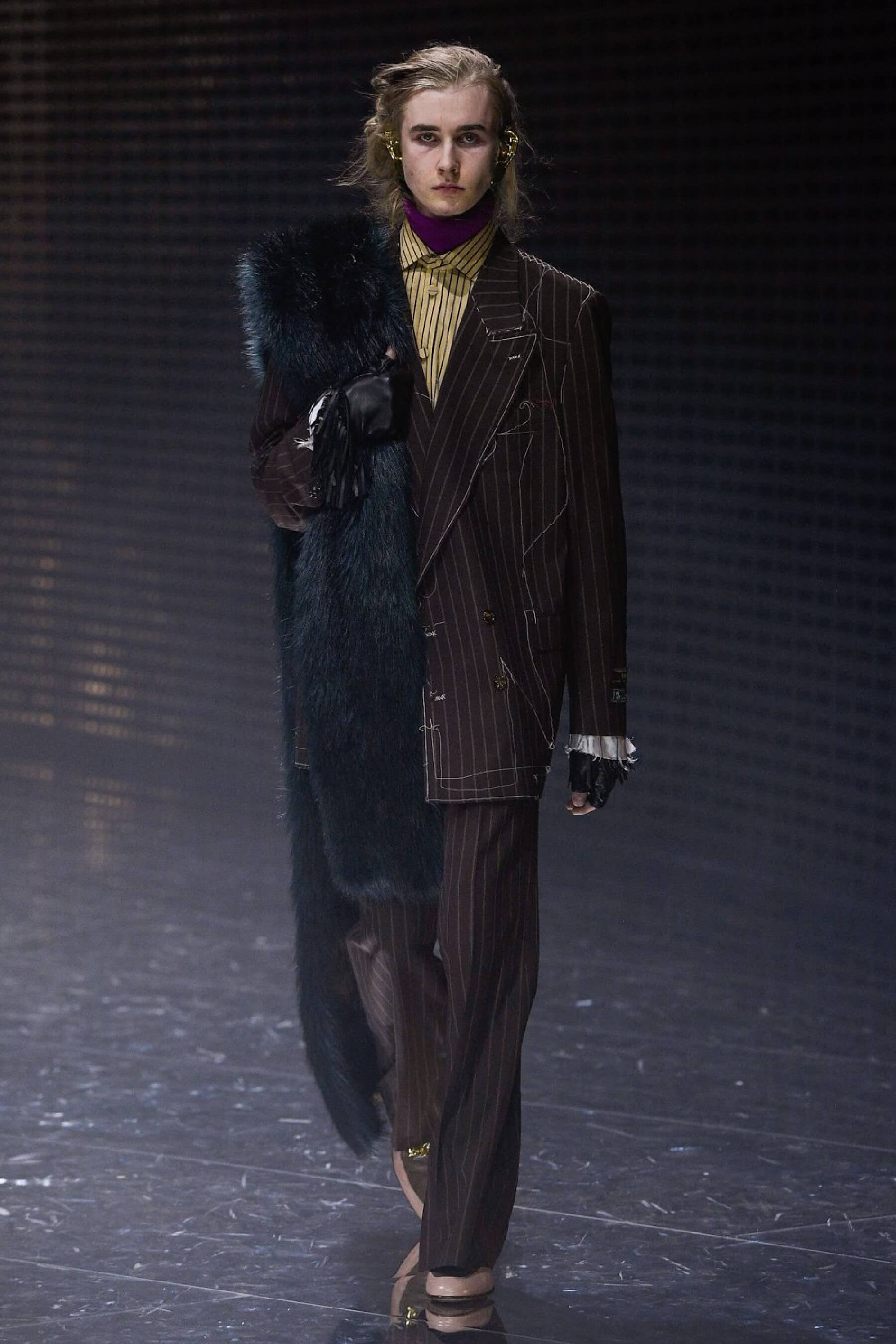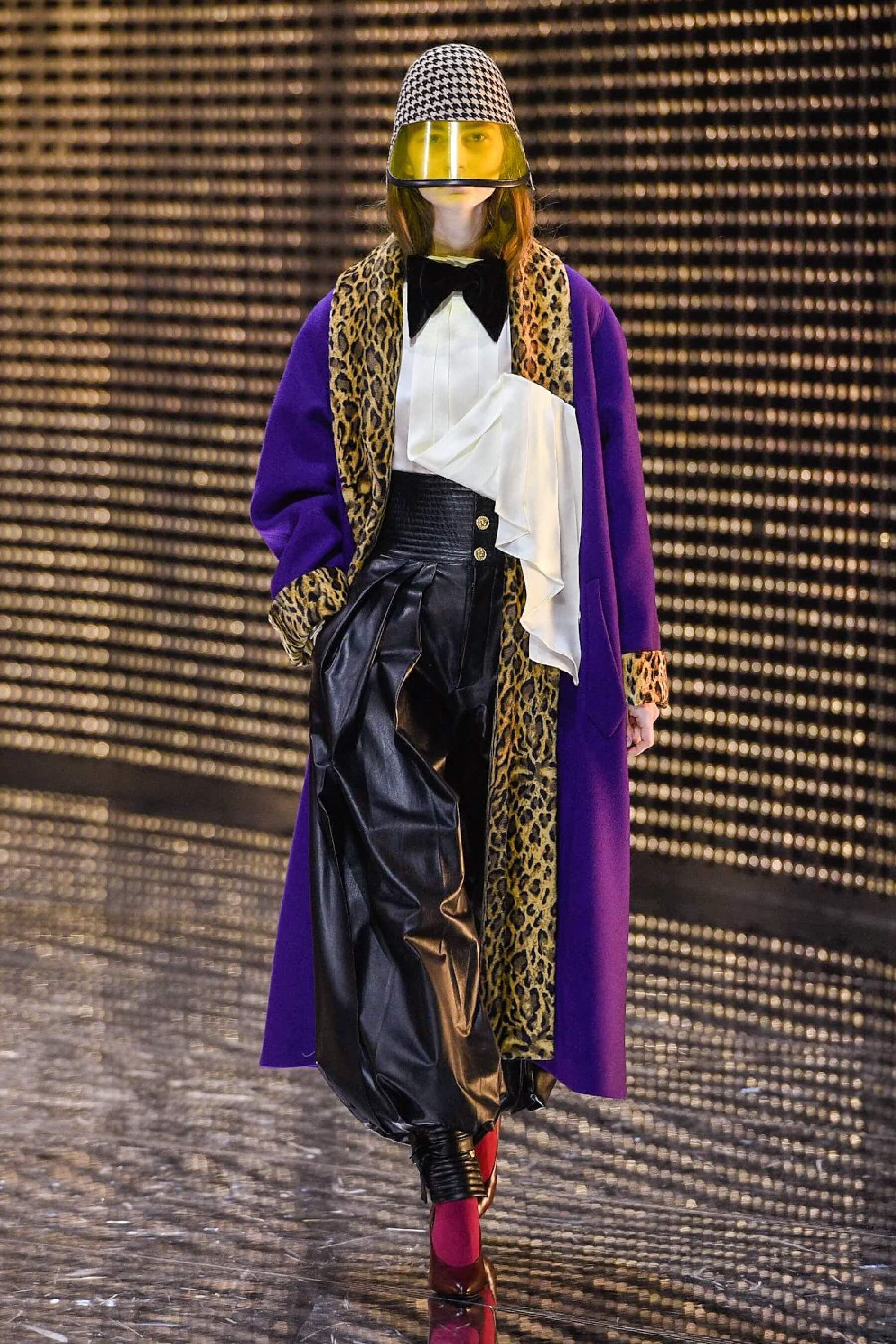 Свою новую (весьма скромную – 87 образов вместо привычных 120) коллекцию для Gucci Алессандро Микеле посвятил античной красоте, фетишизму и маскам, которые олицетворяют дуальность человеческой природы согласно философии Ханны Арендт, чьё мнение созвучно с восприятием самого дизайнера.