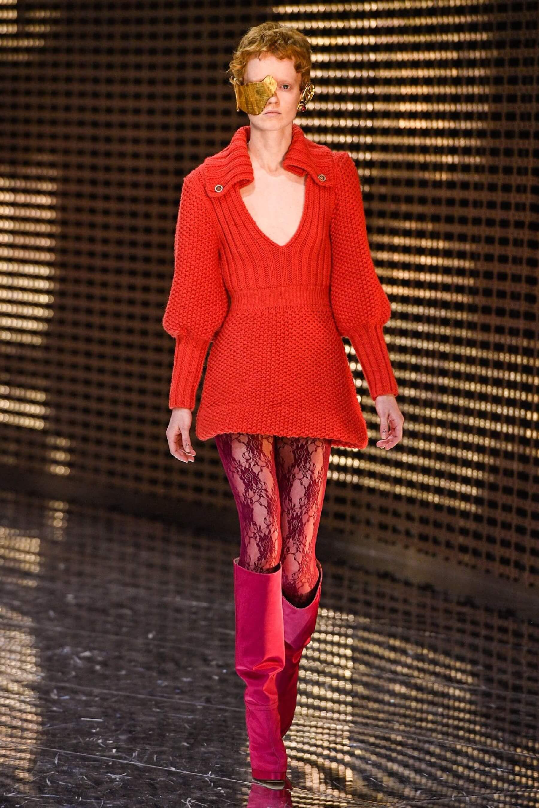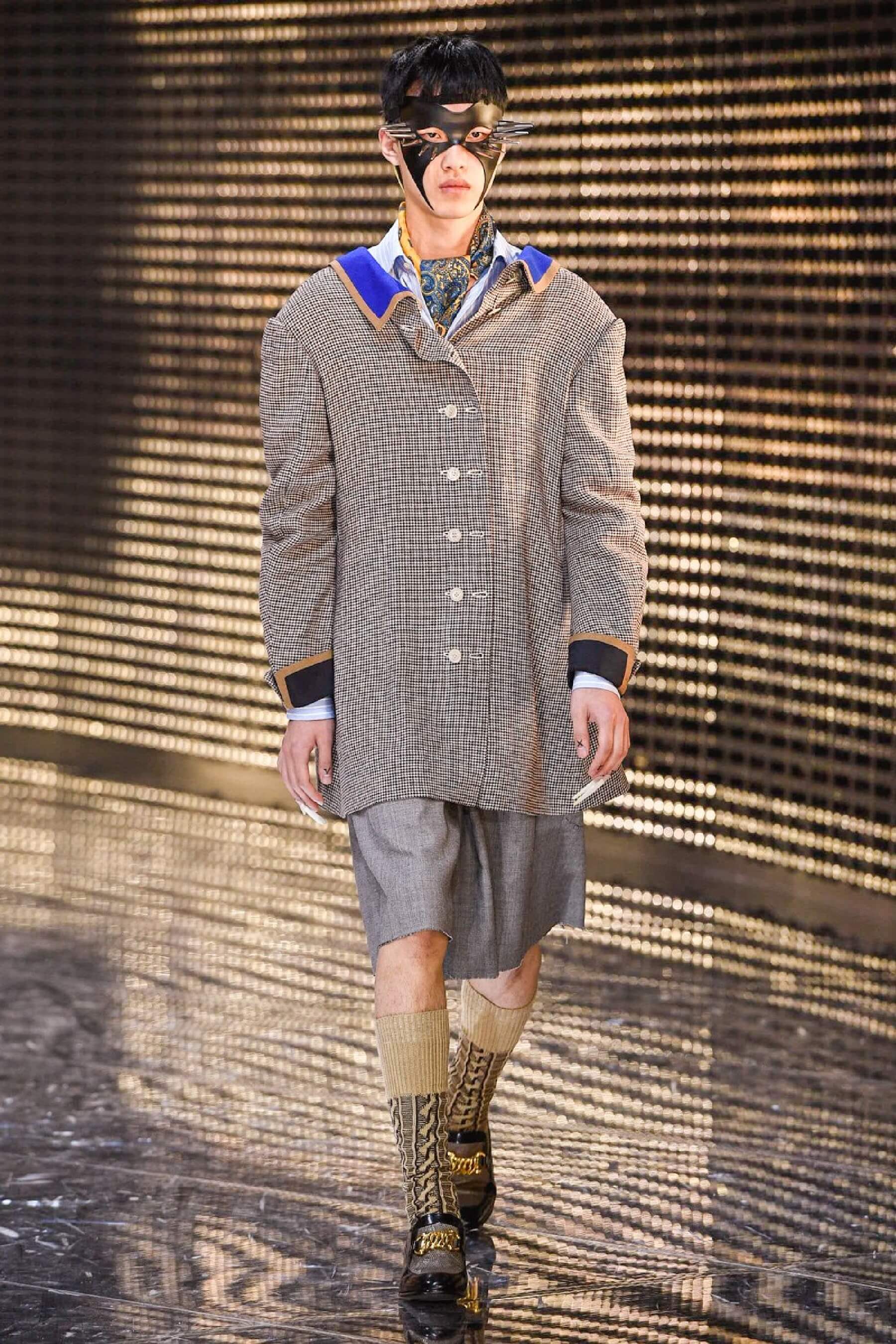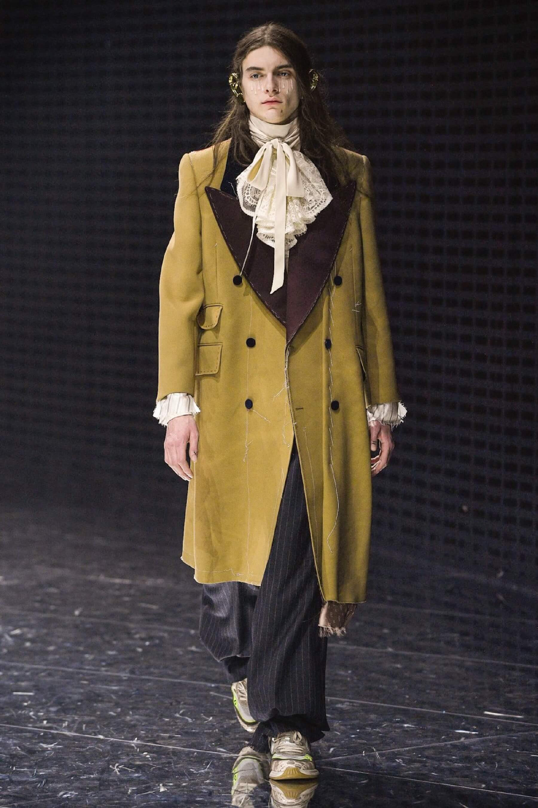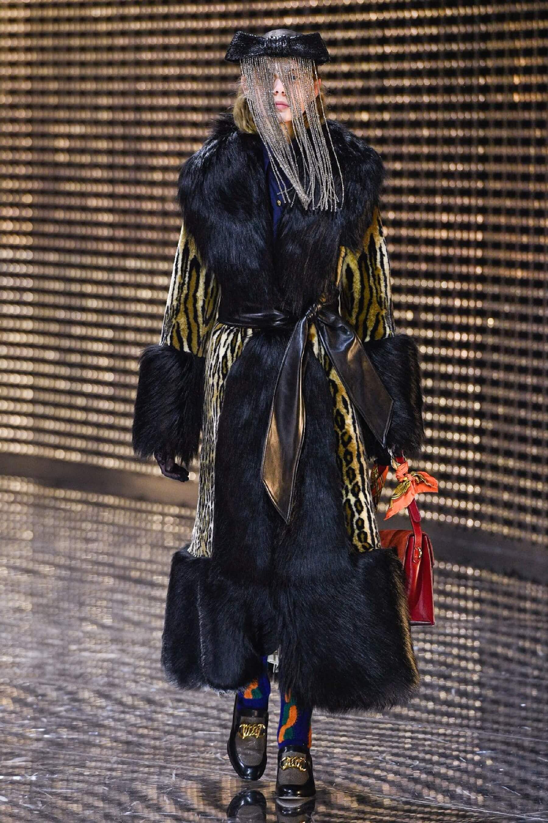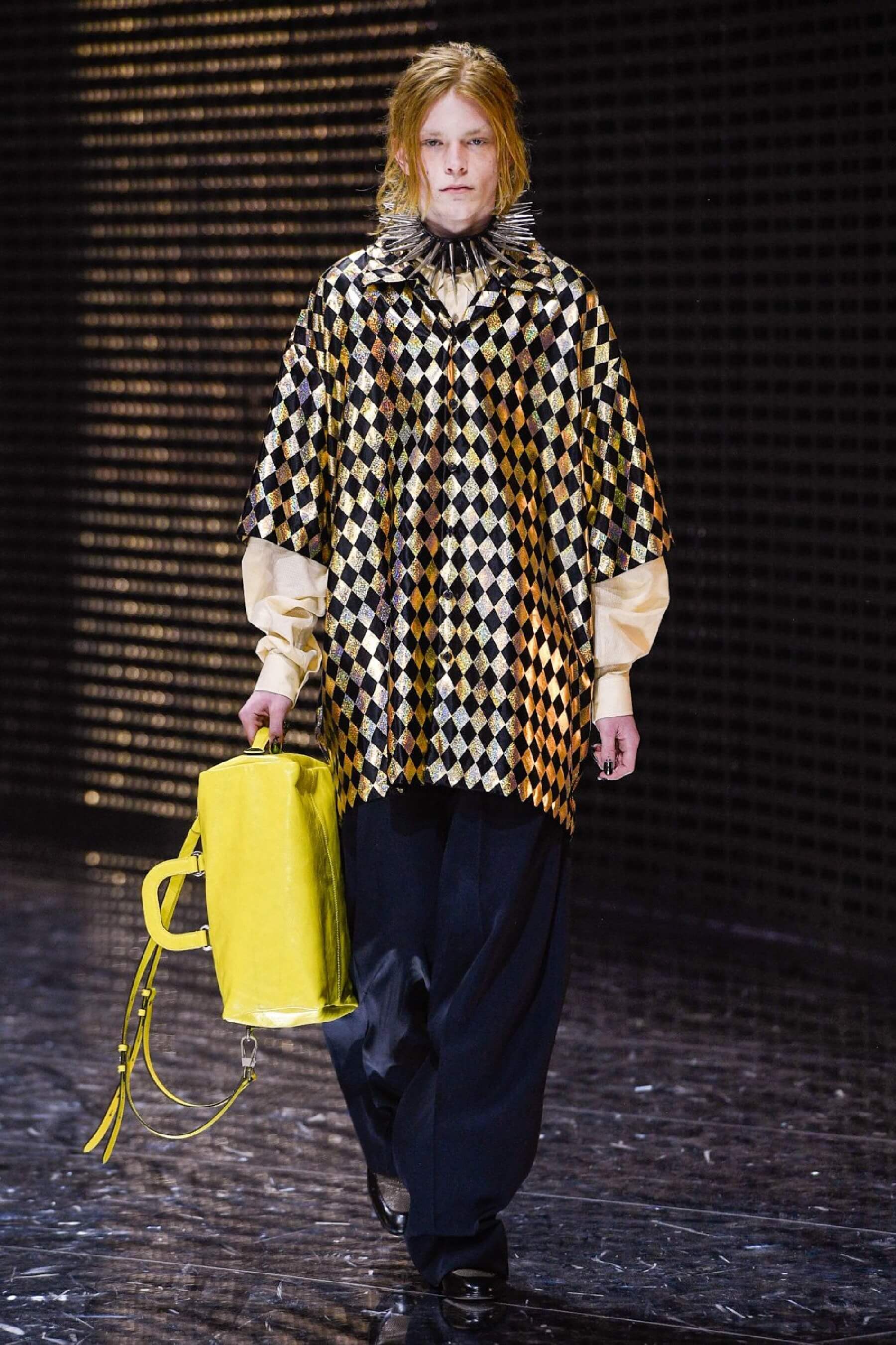 Свою новую (весьма скромную – 87 образов вместо привычных 120) коллекцию для Gucci Алессандро Микеле посвятил античной красоте, фетишизму и маскам, которые олицетворяют дуальность человеческой природы согласно философии Ханны Арендт, чьё мнение созвучно с восприятием самого дизайнера.