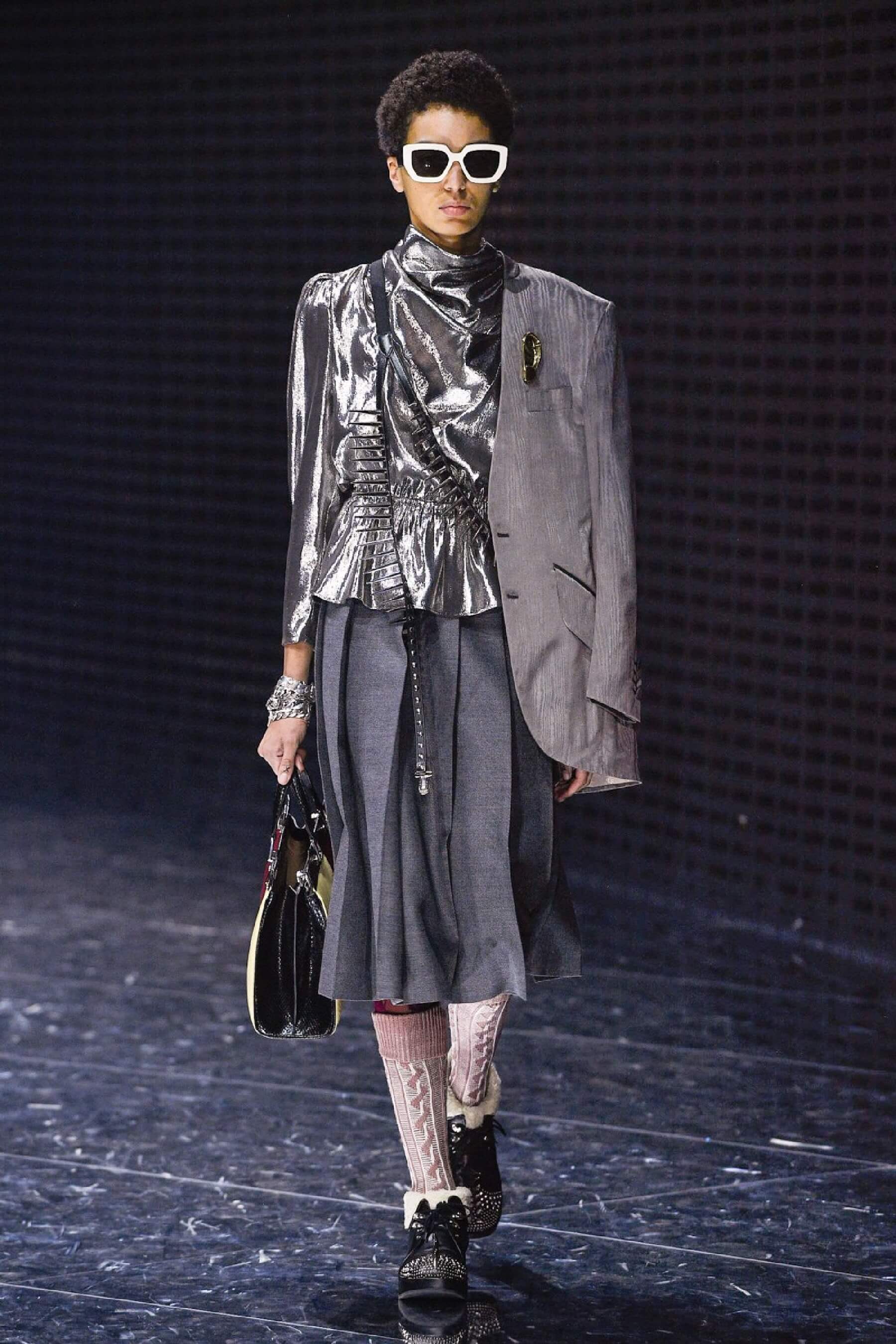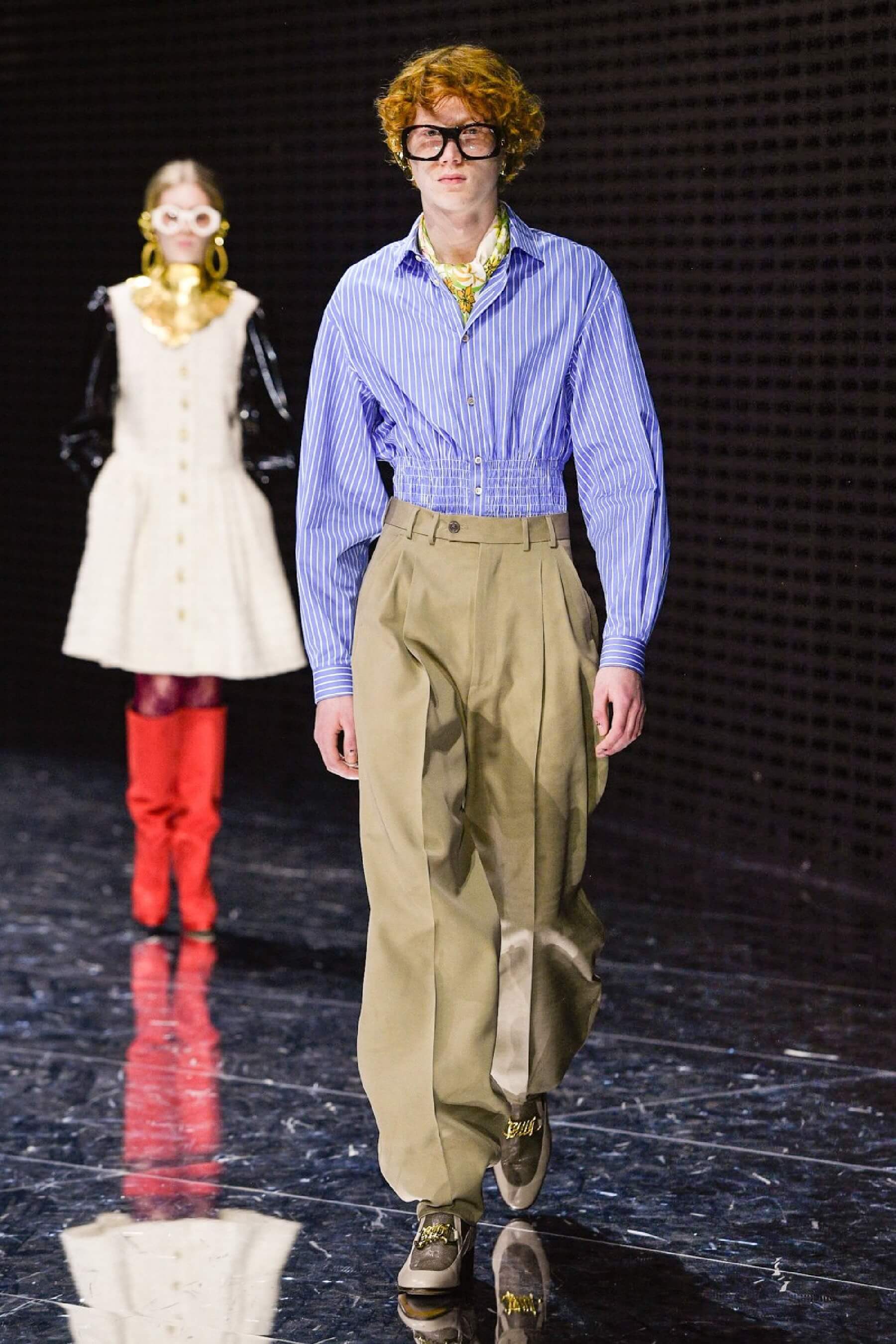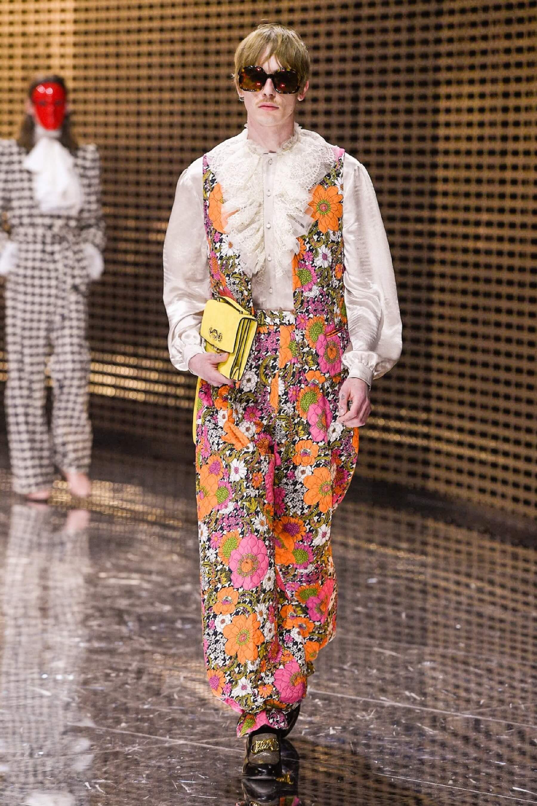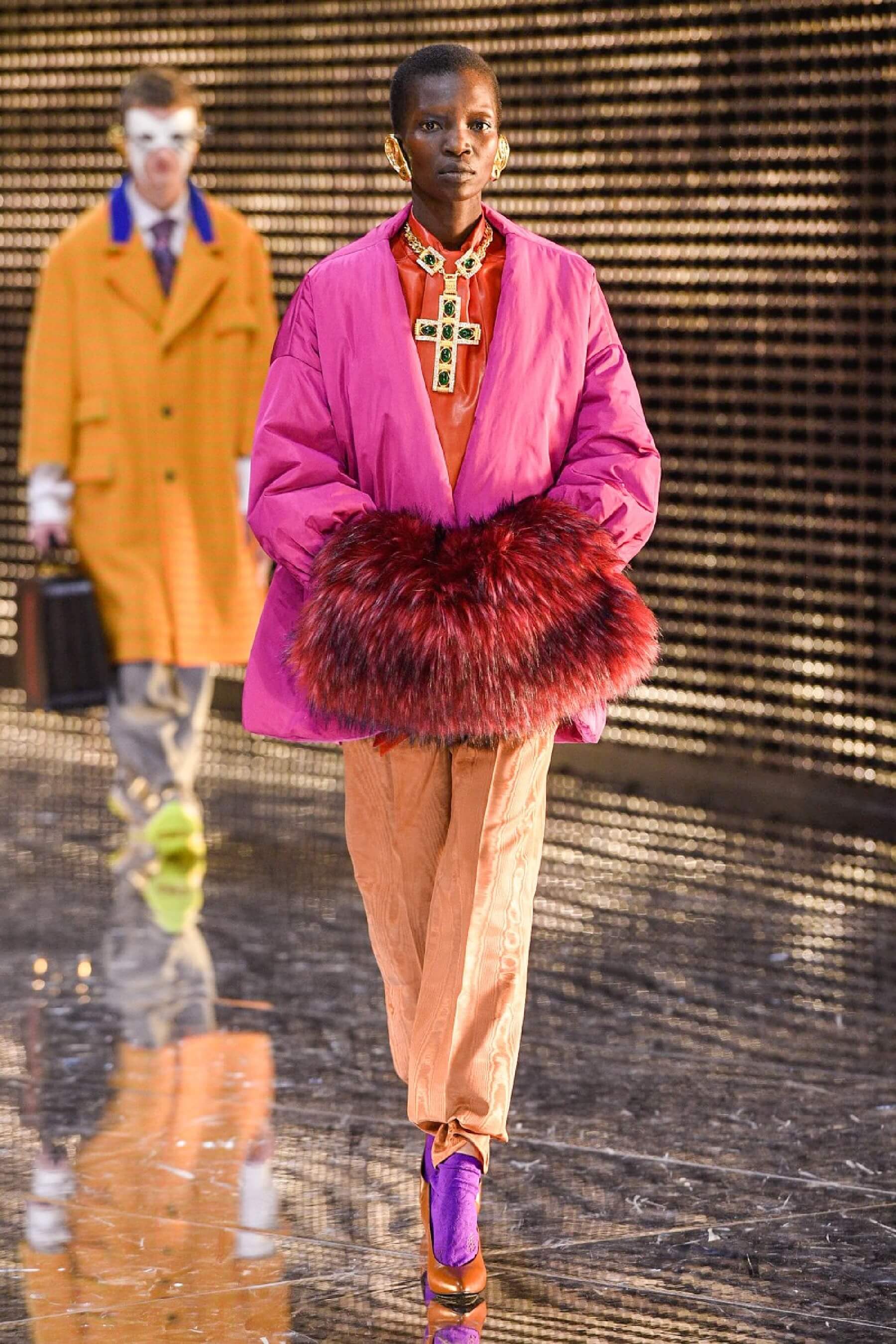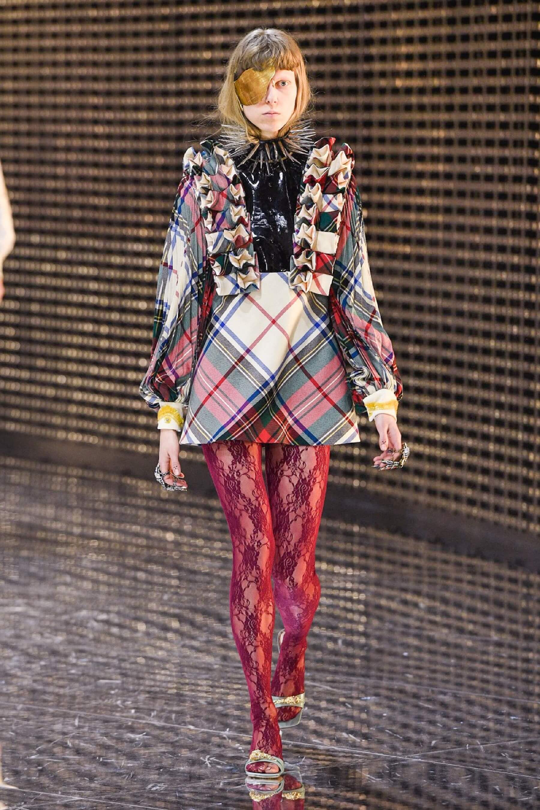 Свою новую (весьма скромную – 87 образов вместо привычных 120) коллекцию для Gucci Алессандро Микеле посвятил античной красоте, фетишизму и маскам, которые олицетворяют дуальность человеческой природы согласно философии Ханны Арендт, чьё мнение созвучно с восприятием самого дизайнера.