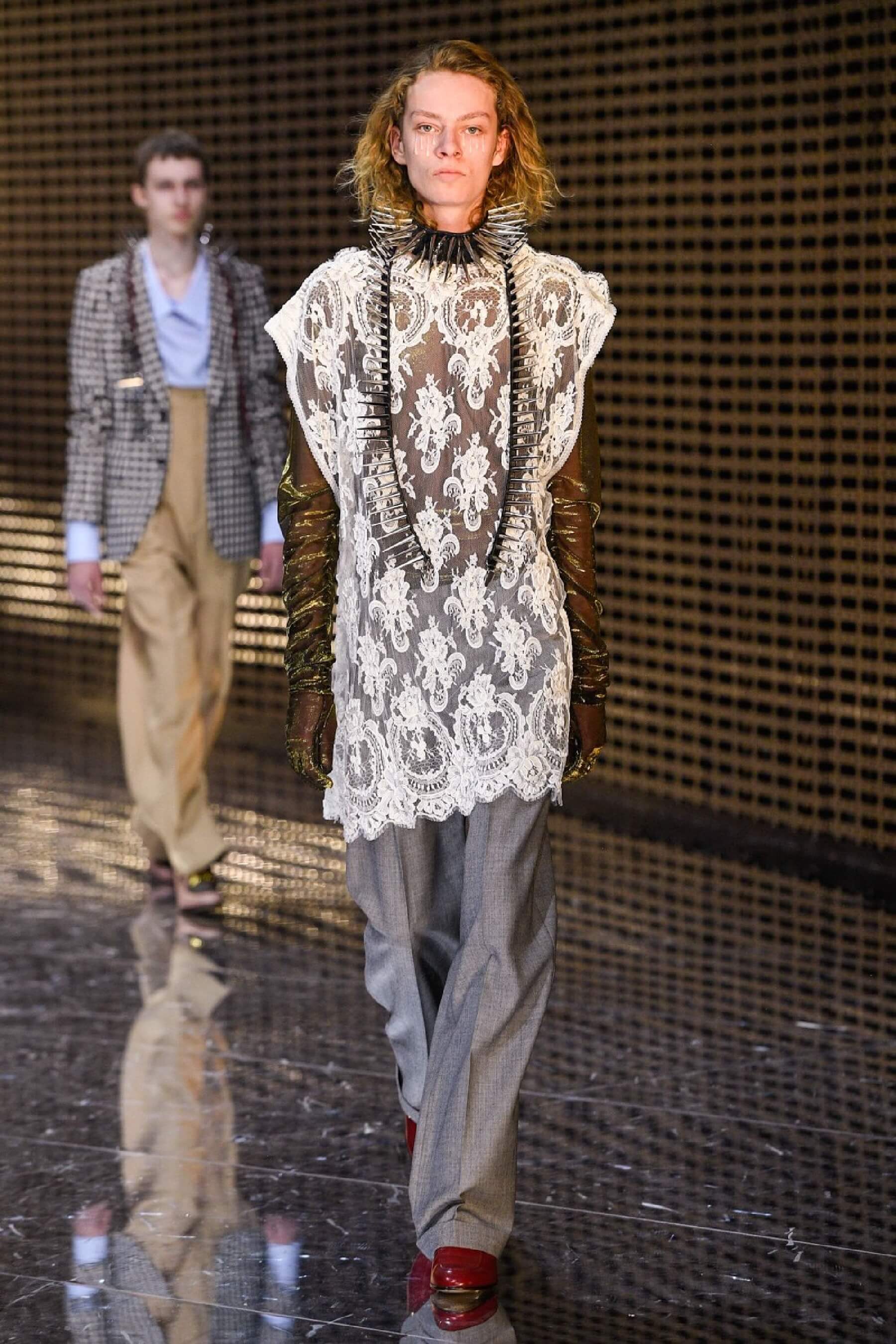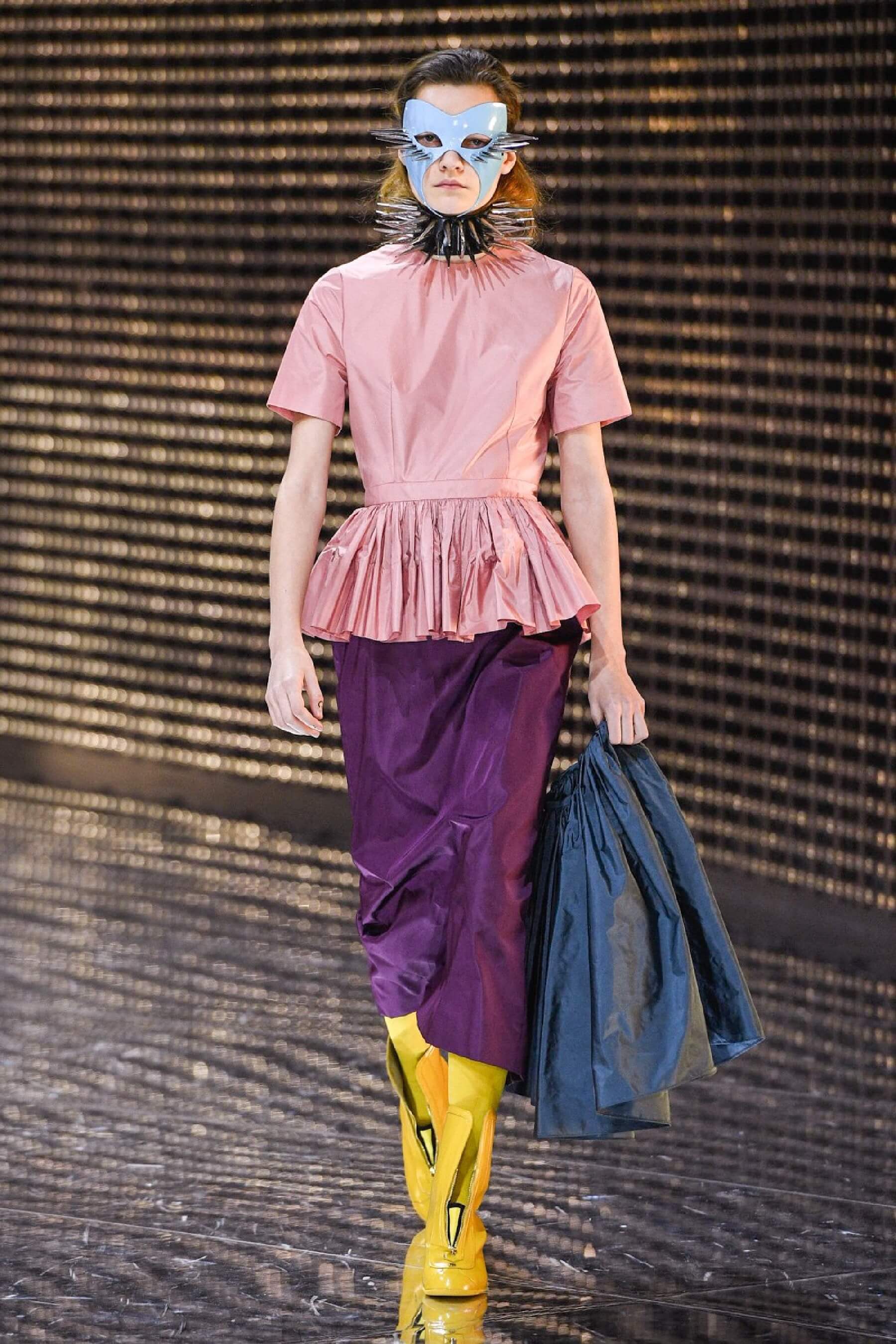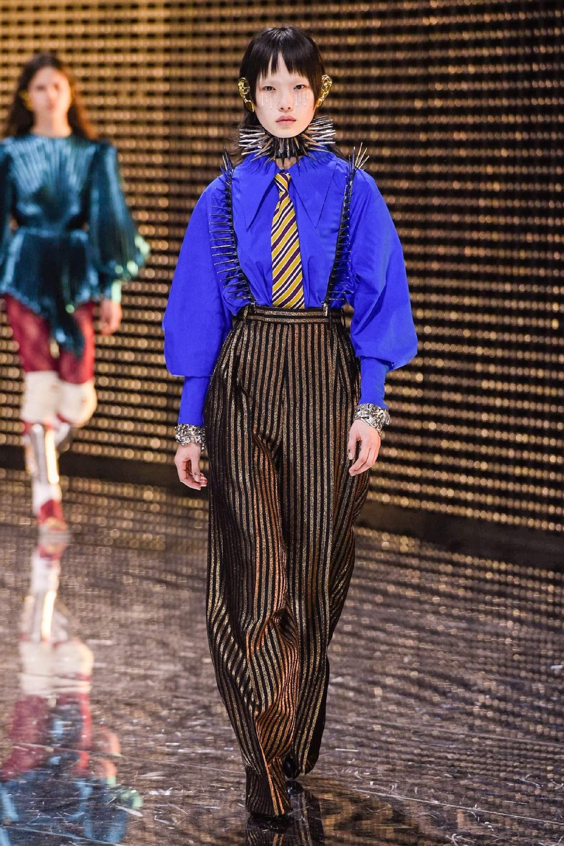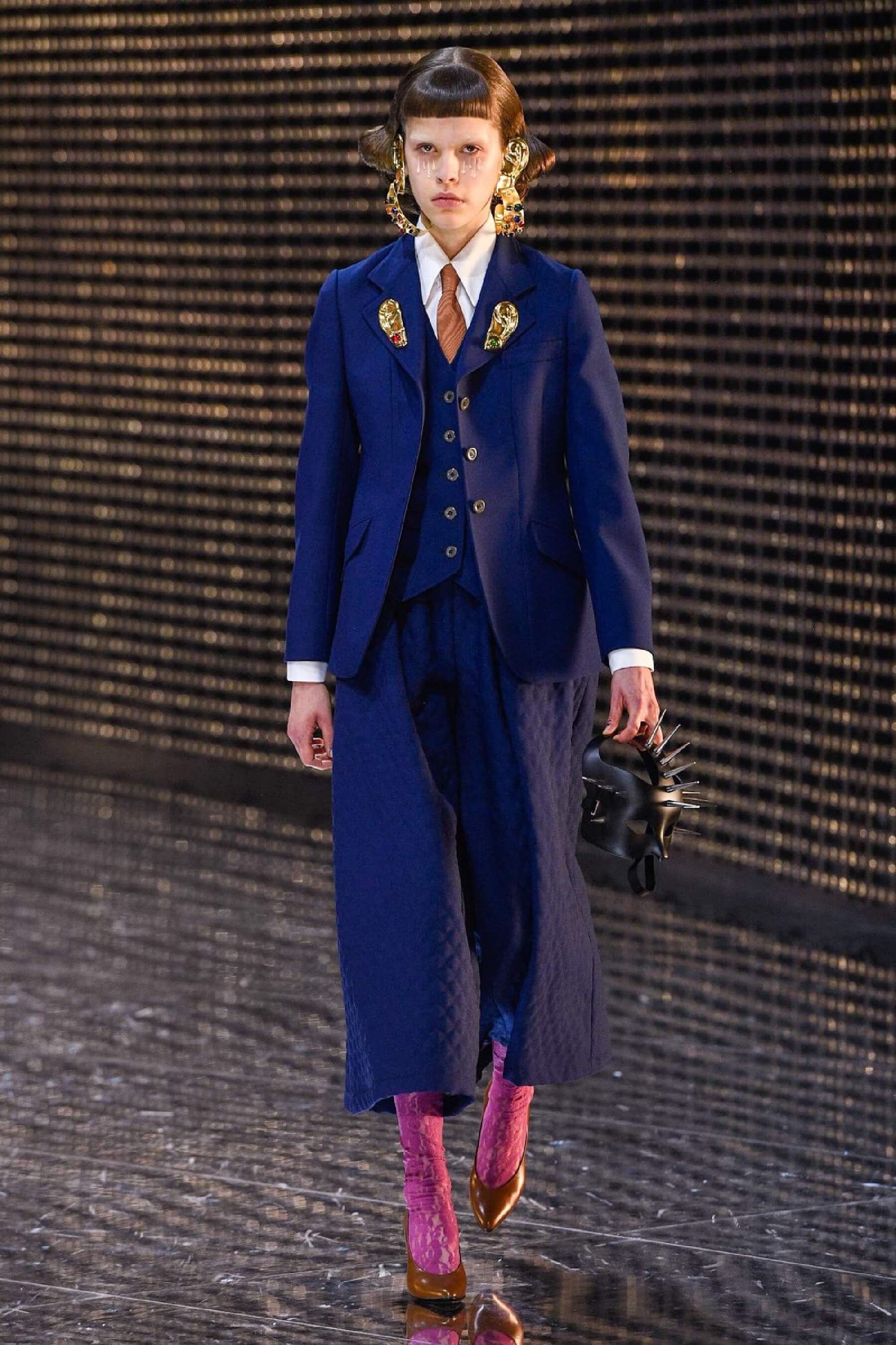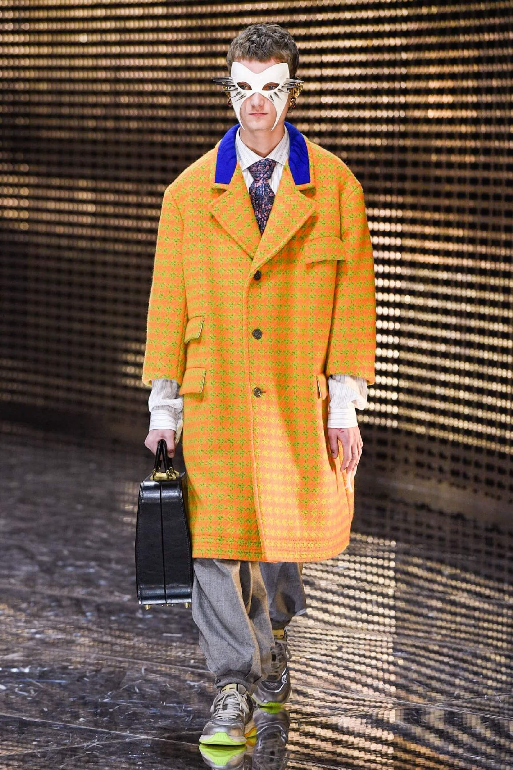 Свою новую (весьма скромную – 87 образов вместо привычных 120) коллекцию для Gucci Алессандро Микеле посвятил античной красоте, фетишизму и маскам, которые олицетворяют дуальность человеческой природы согласно философии Ханны Арендт, чьё мнение созвучно с восприятием самого дизайнера.