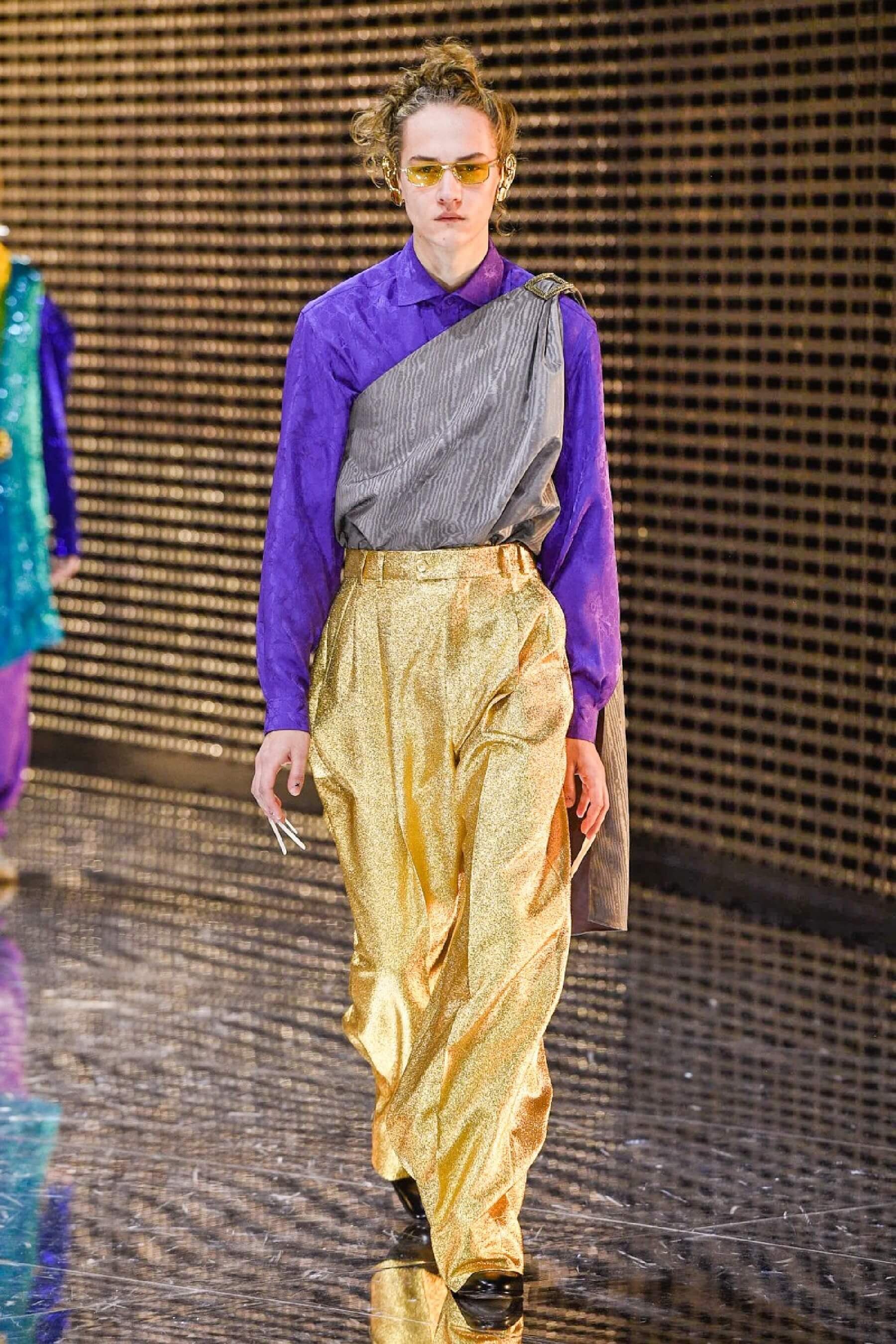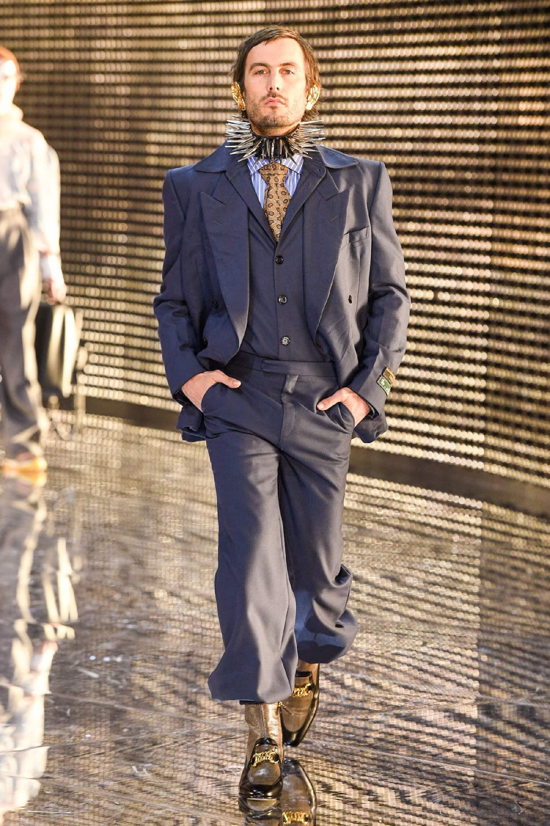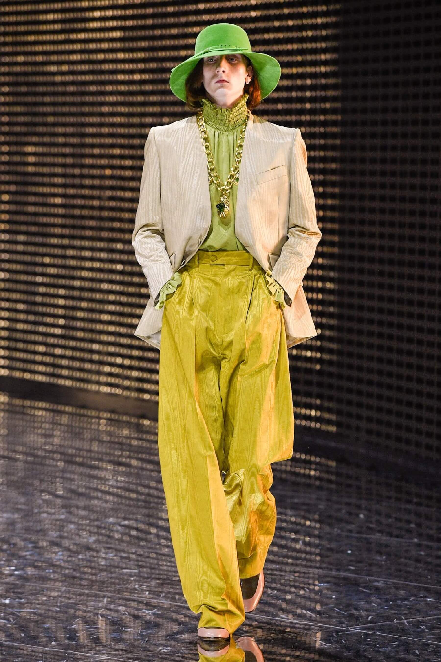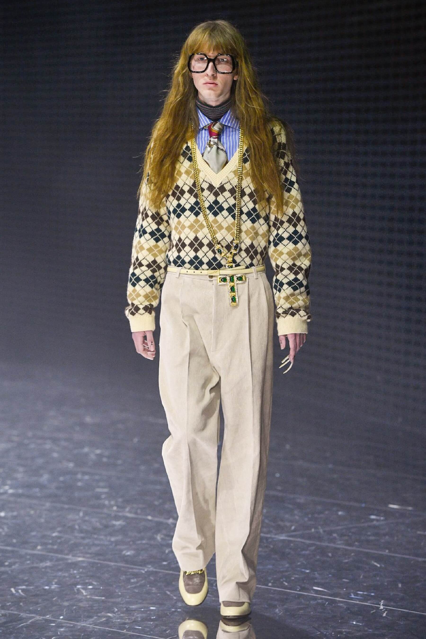 Свою новую (весьма скромную – 87 образов вместо привычных 120) коллекцию для Gucci Алессандро Микеле посвятил античной красоте, фетишизму и маскам, которые олицетворяют дуальность человеческой природы согласно философии Ханны Арендт, чьё мнение созвучно с восприятием самого дизайнера.