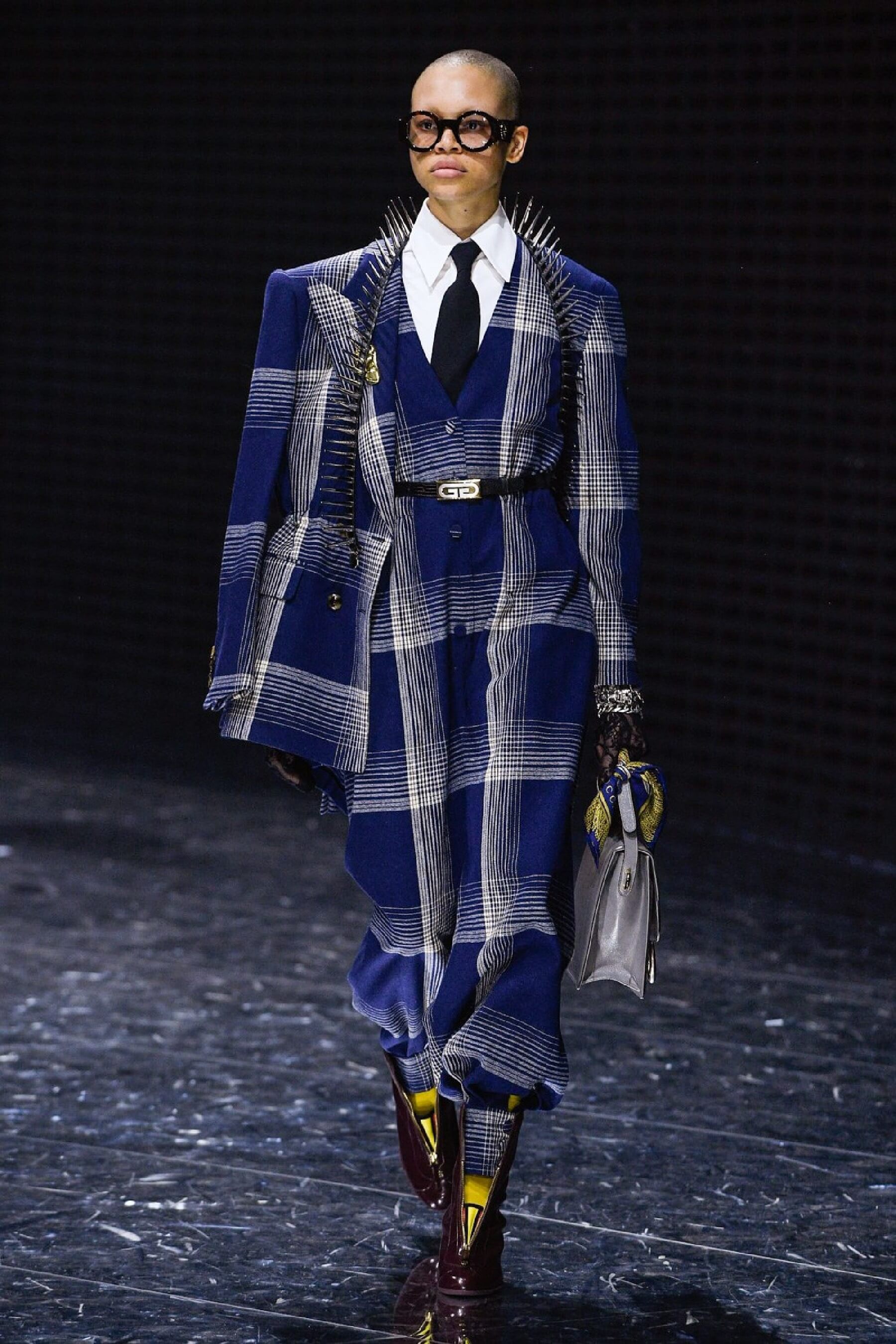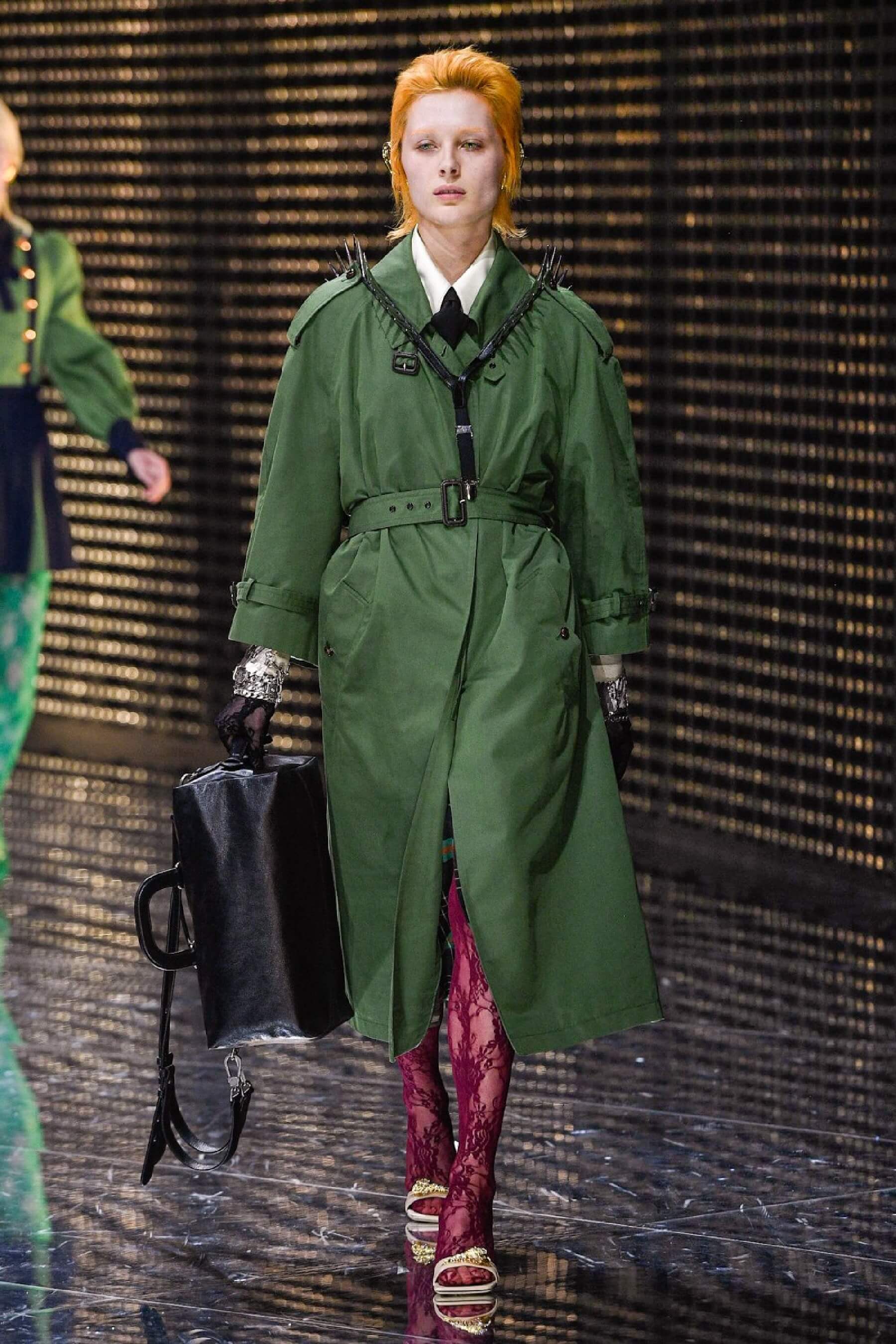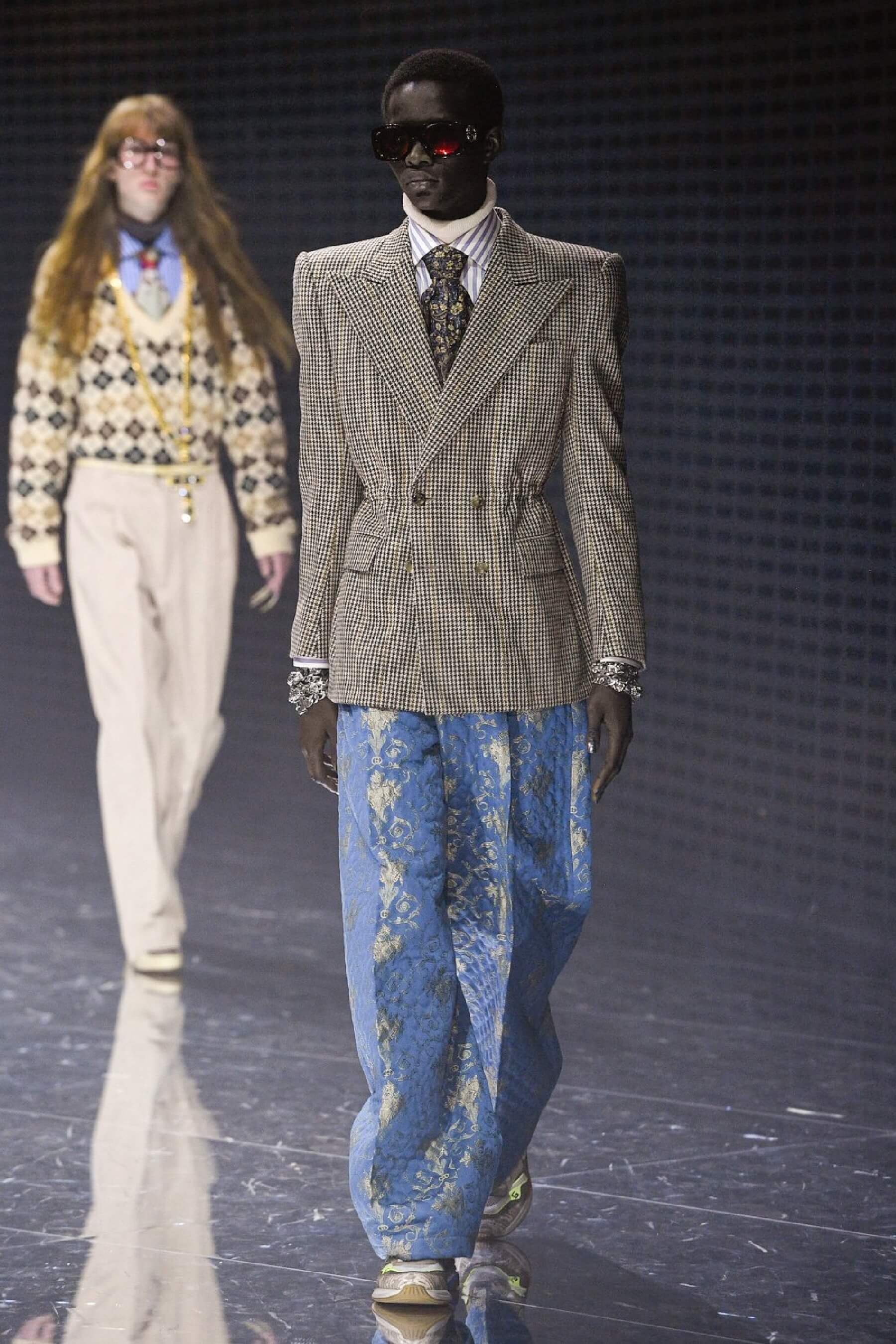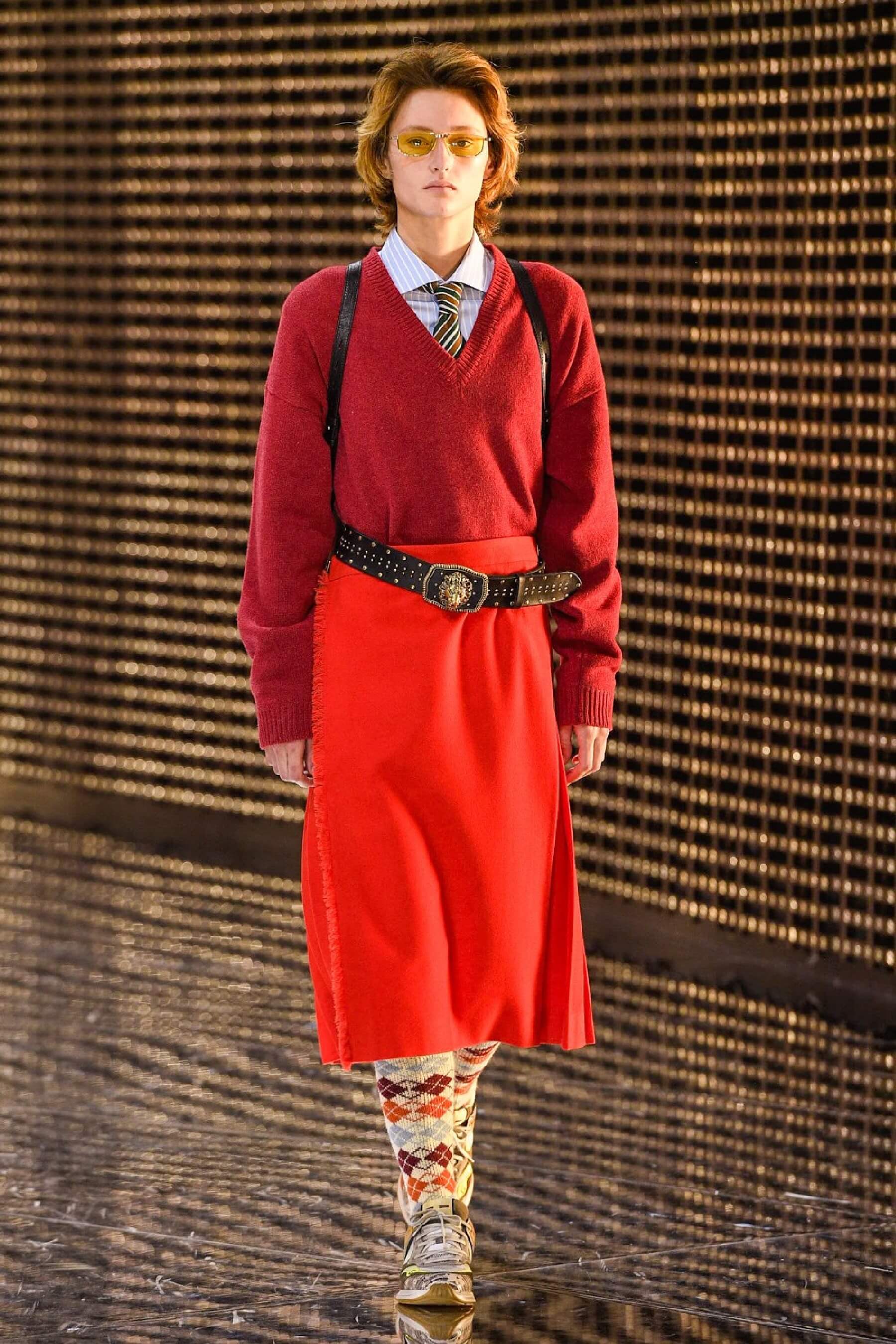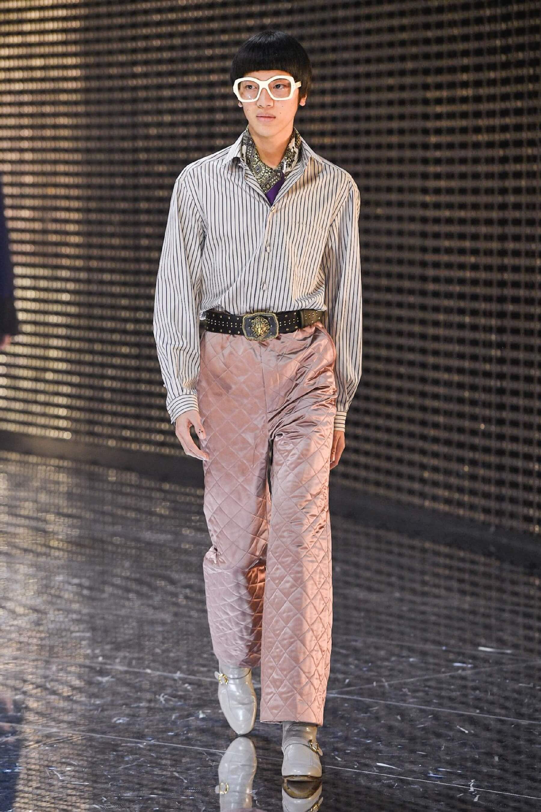 Свою новую (весьма скромную – 87 образов вместо привычных 120) коллекцию для Gucci Алессандро Микеле посвятил античной красоте, фетишизму и маскам, которые олицетворяют дуальность человеческой природы согласно философии Ханны Арендт, чьё мнение созвучно с восприятием самого дизайнера.