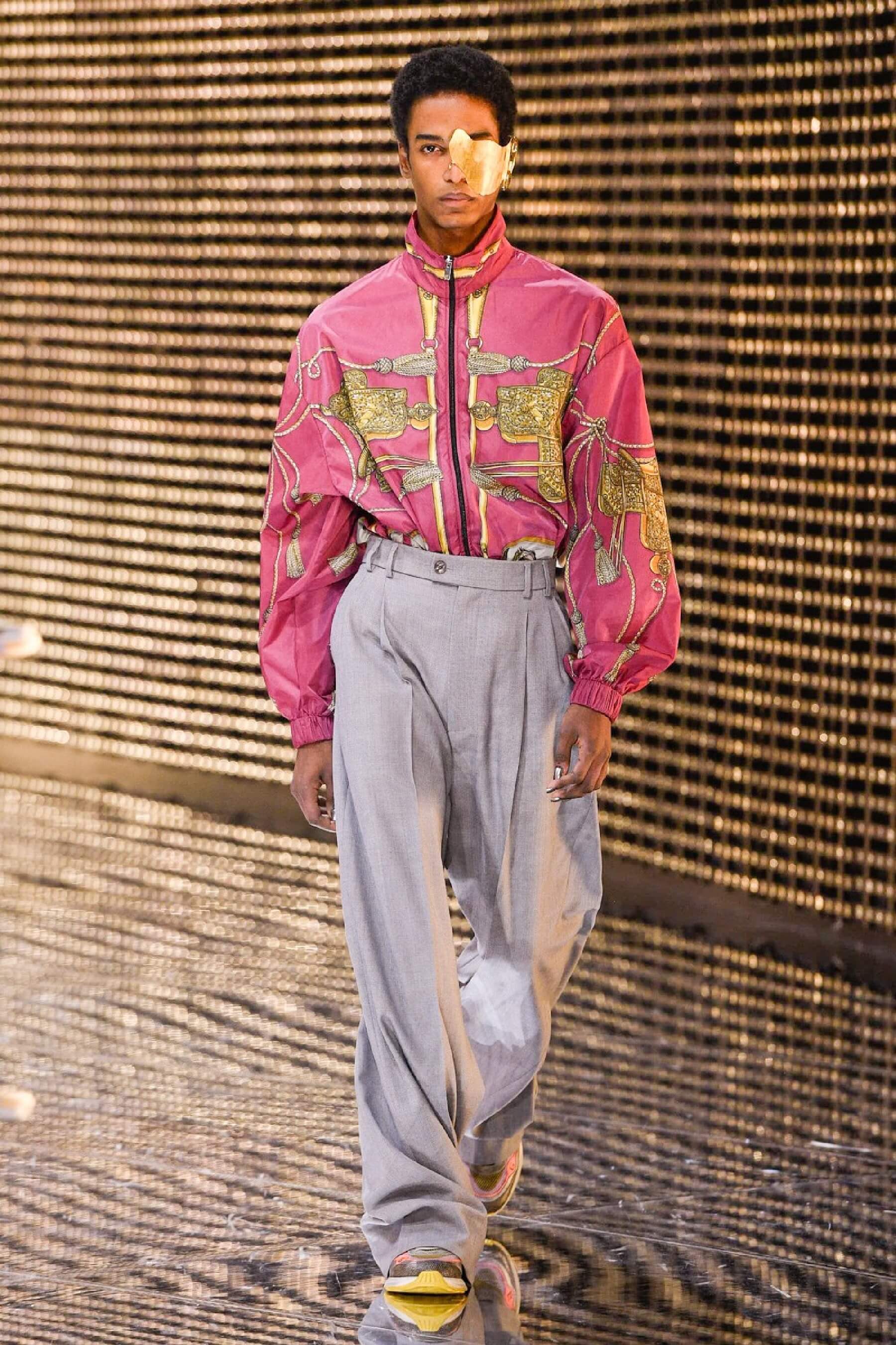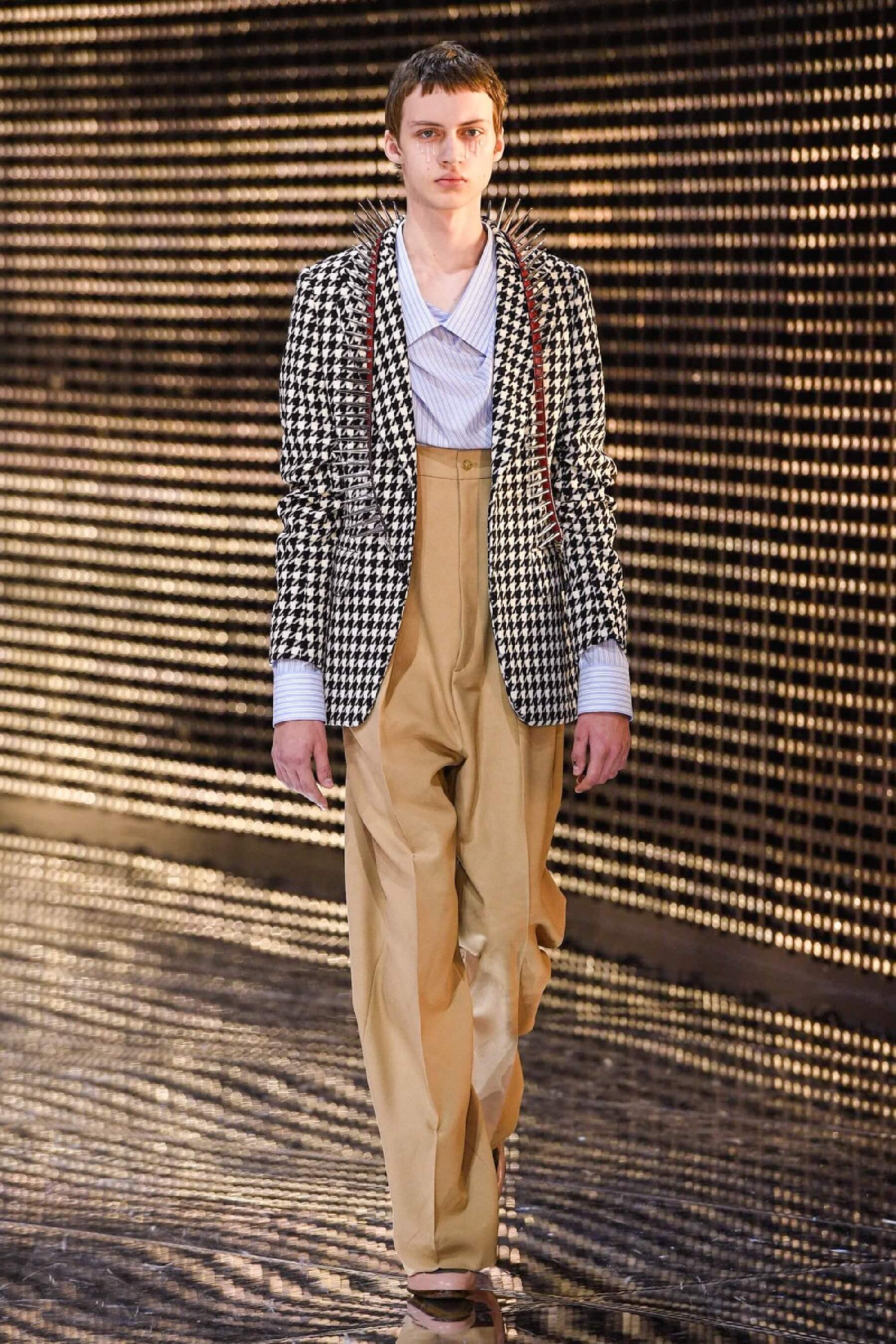 "Бабушкины" свитера с наивными рисунками, вязаные гольфы, излюбленные хищные принты, платья и мужские рубашки в цветах дополнили бушлаты, кители и брючные костюмы с декоративной производственной разметкой. Викторианские блузы, дезабилье, как у невест Дракулы, и силуэтные костюмы в контрастную красную клетку иронично и эффектно разбавили кроссовки, которые модели несли в руках, как футбольные бутсы, фетишистские аксессуары с длинными шипами и объёмные сумки-шоперы. Головы некоторых моделей украшали панамы с козырьками из цветного пластика на манер творений Руди Гернрайха, Андре Куррежа или Пьера Кардена в 60-х.