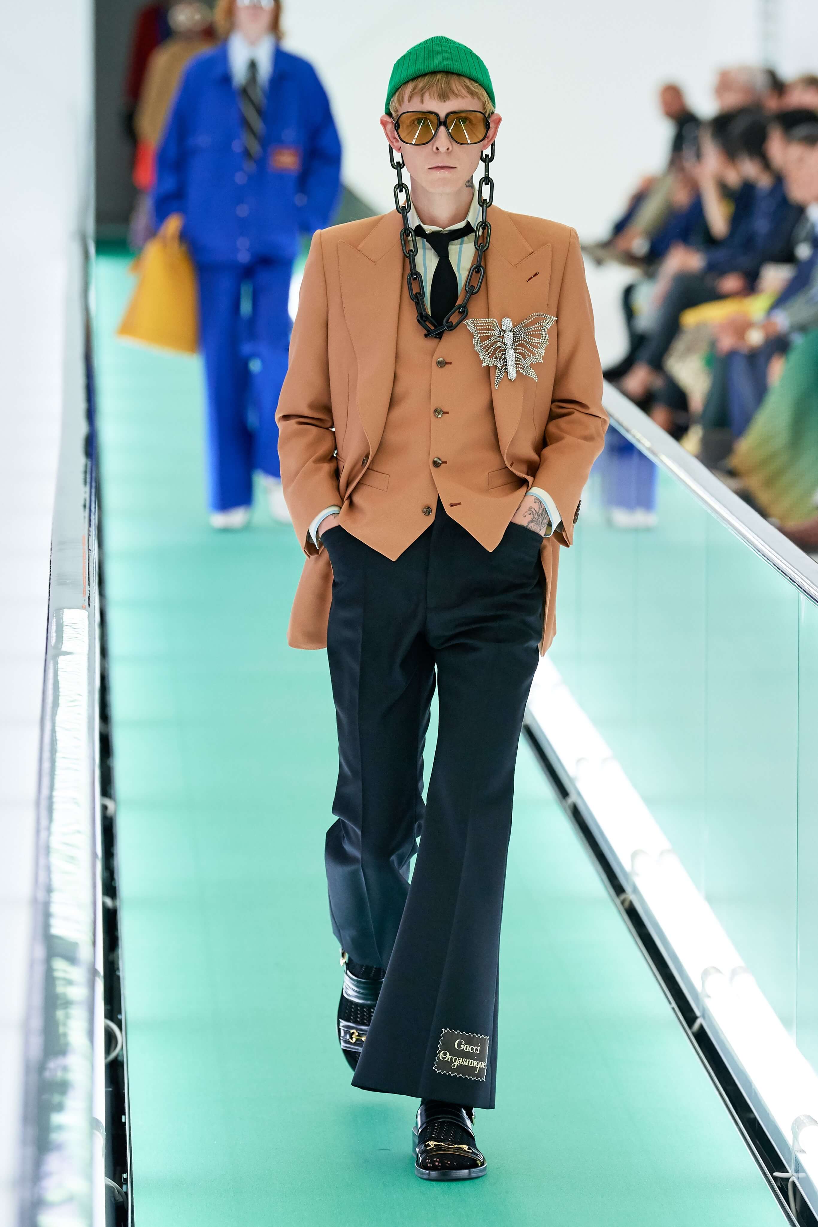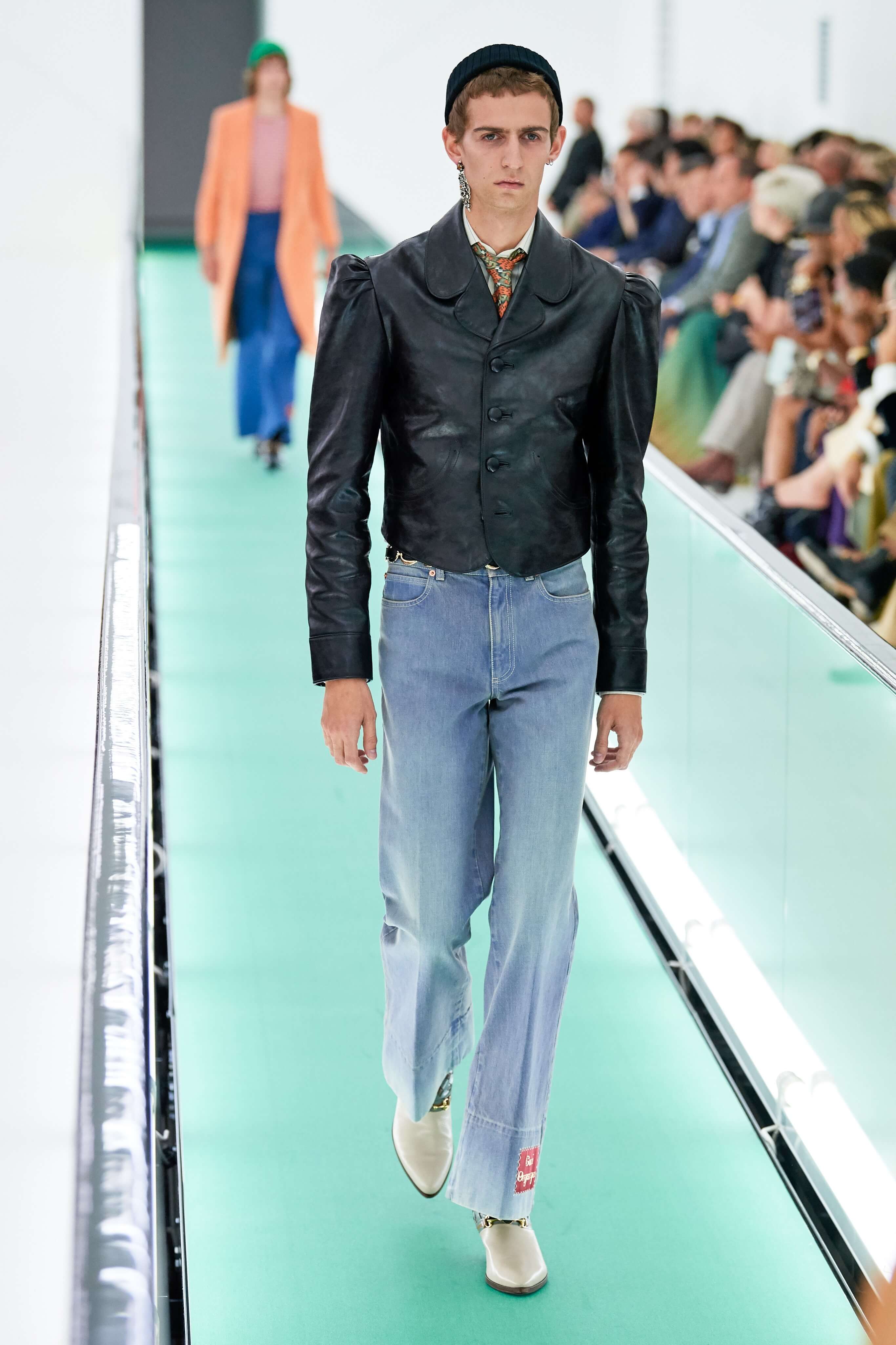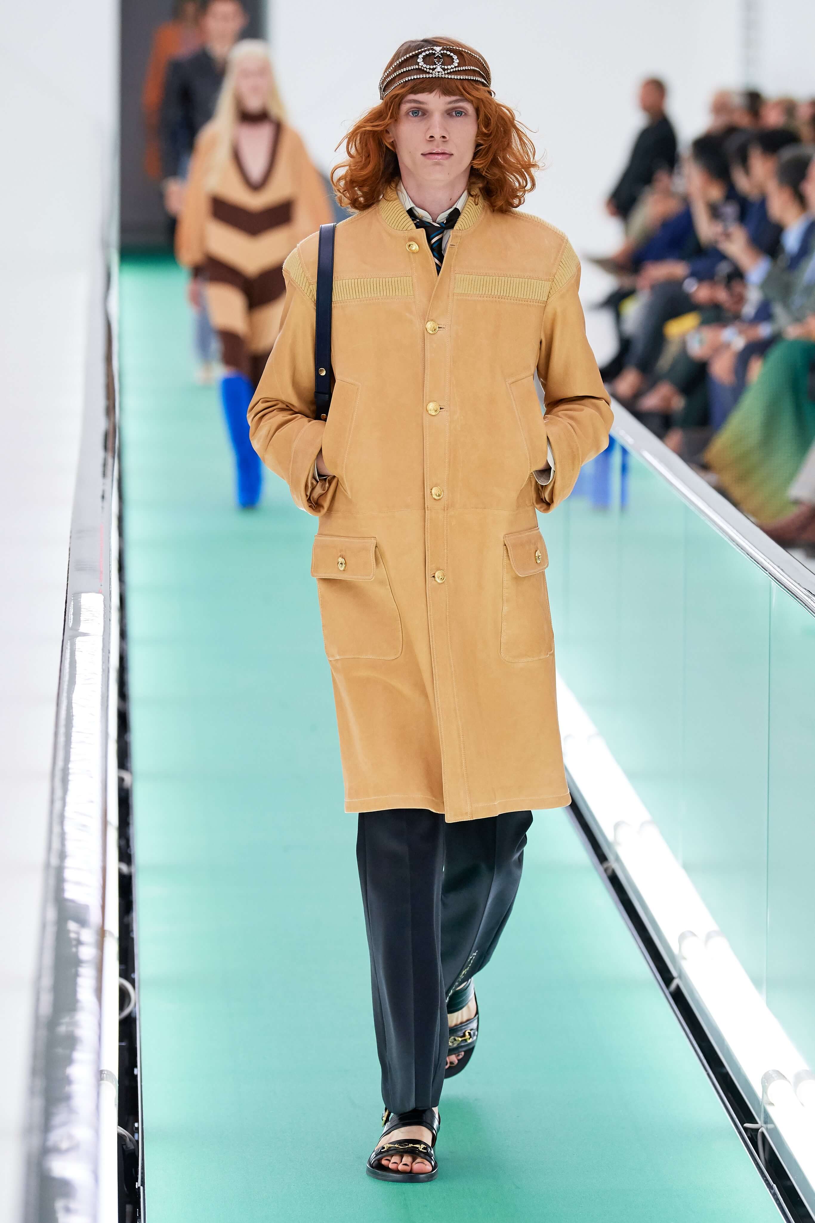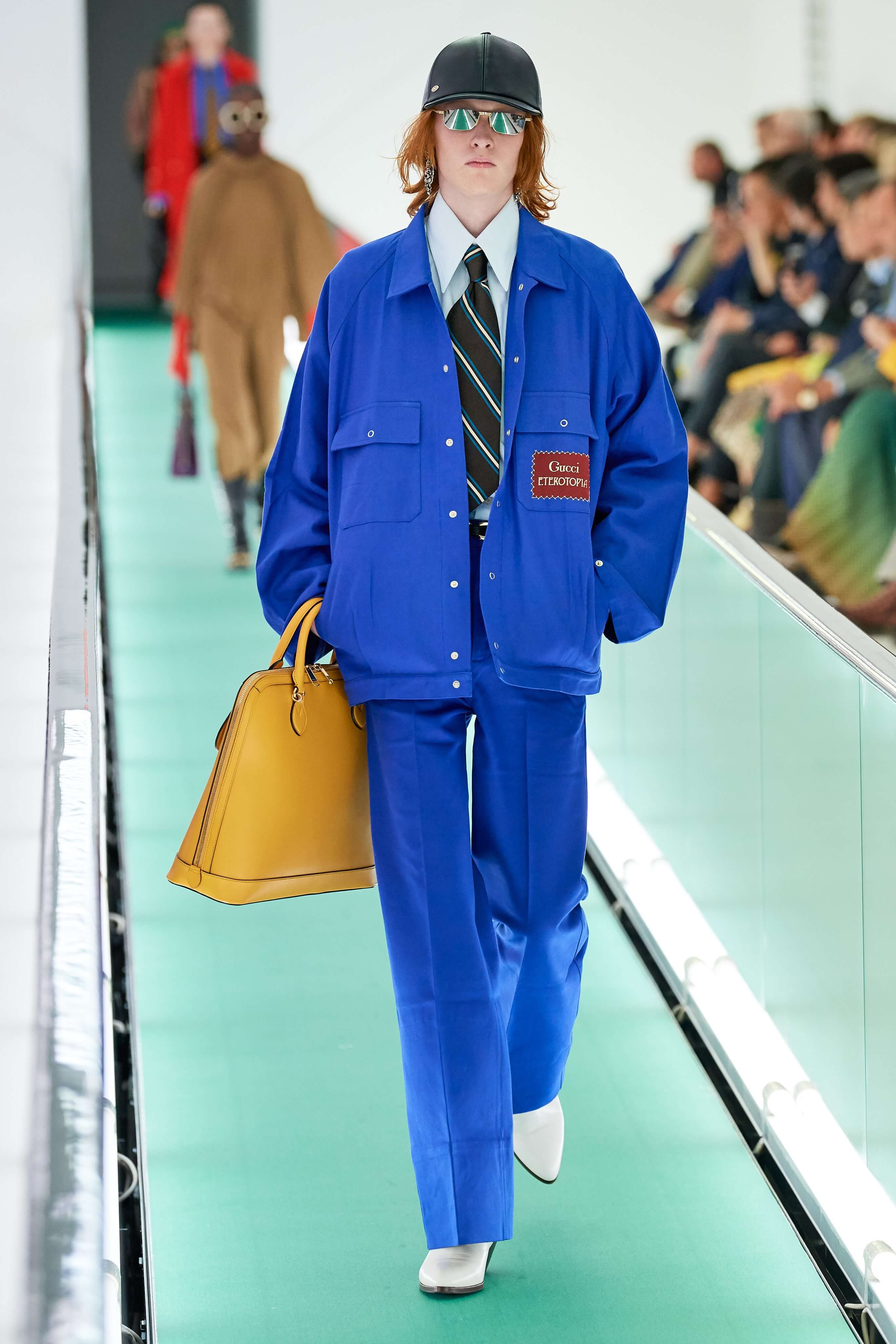 Мы уже писали о том, как развивался жанр антиутопии и как его канонические образы нашли воплощение в моде. Алессандро Микеле решил обратиться к теме в своей новой коллекции, превратив показ в интригующее шоу. В первой части модели проплывали на светящейся ленте-траволаторе в утилитарных, нарочито одинаковых одеждах, напоминающих не то лабораторные спецовки и смирительные костюмы, не то первичную одежду для армии клонов. Если рассмотреть, правда, становятся заметны детали на нарочито грубых робах, рубашках с гиперболизированными шнуровками, плащах-палатках и комбинезонах, которые мы уже мысленно видим во всех стритстайл-хрониках. Поначалу гости Gucci-хаба, наблюдавшие за происходящим, даже немного растерялись. Однако по окончании жутковатого первого показа погас свет и вскоре началась динамичная вторая часть шоу.