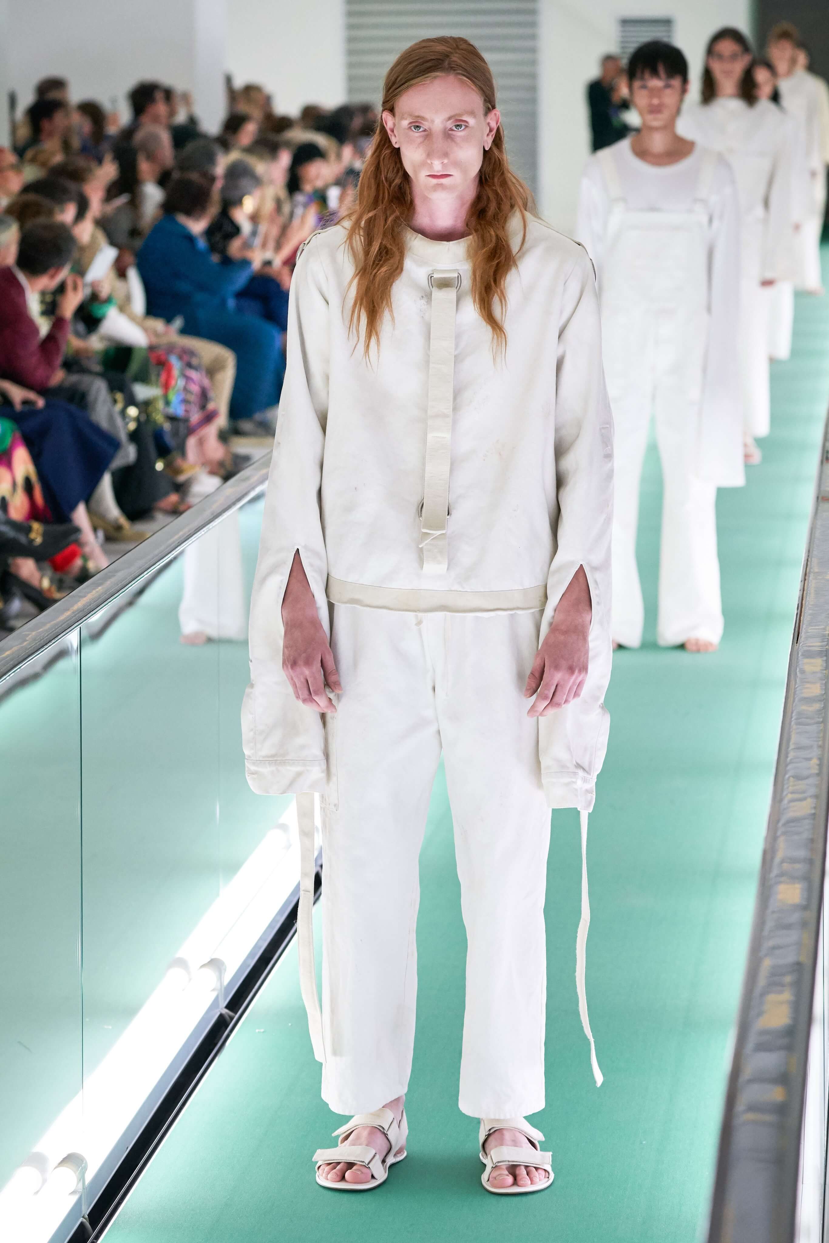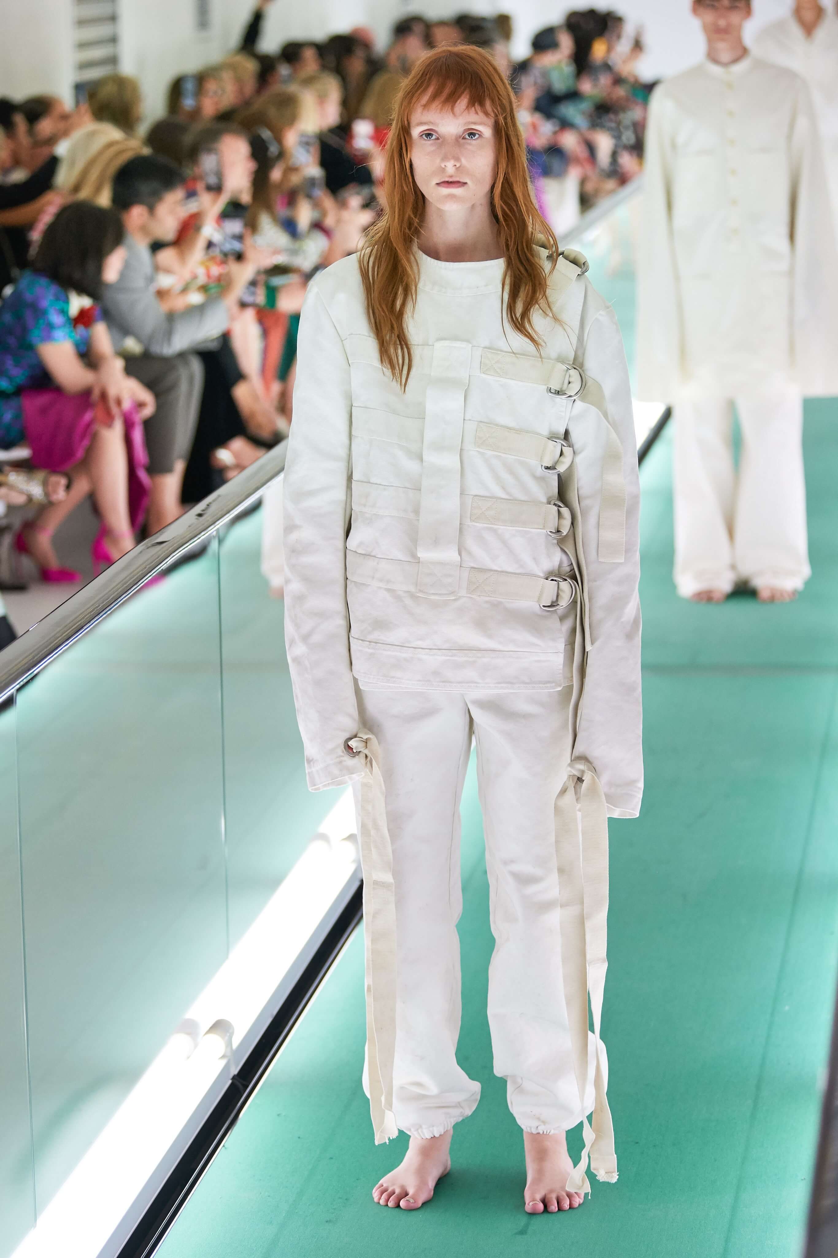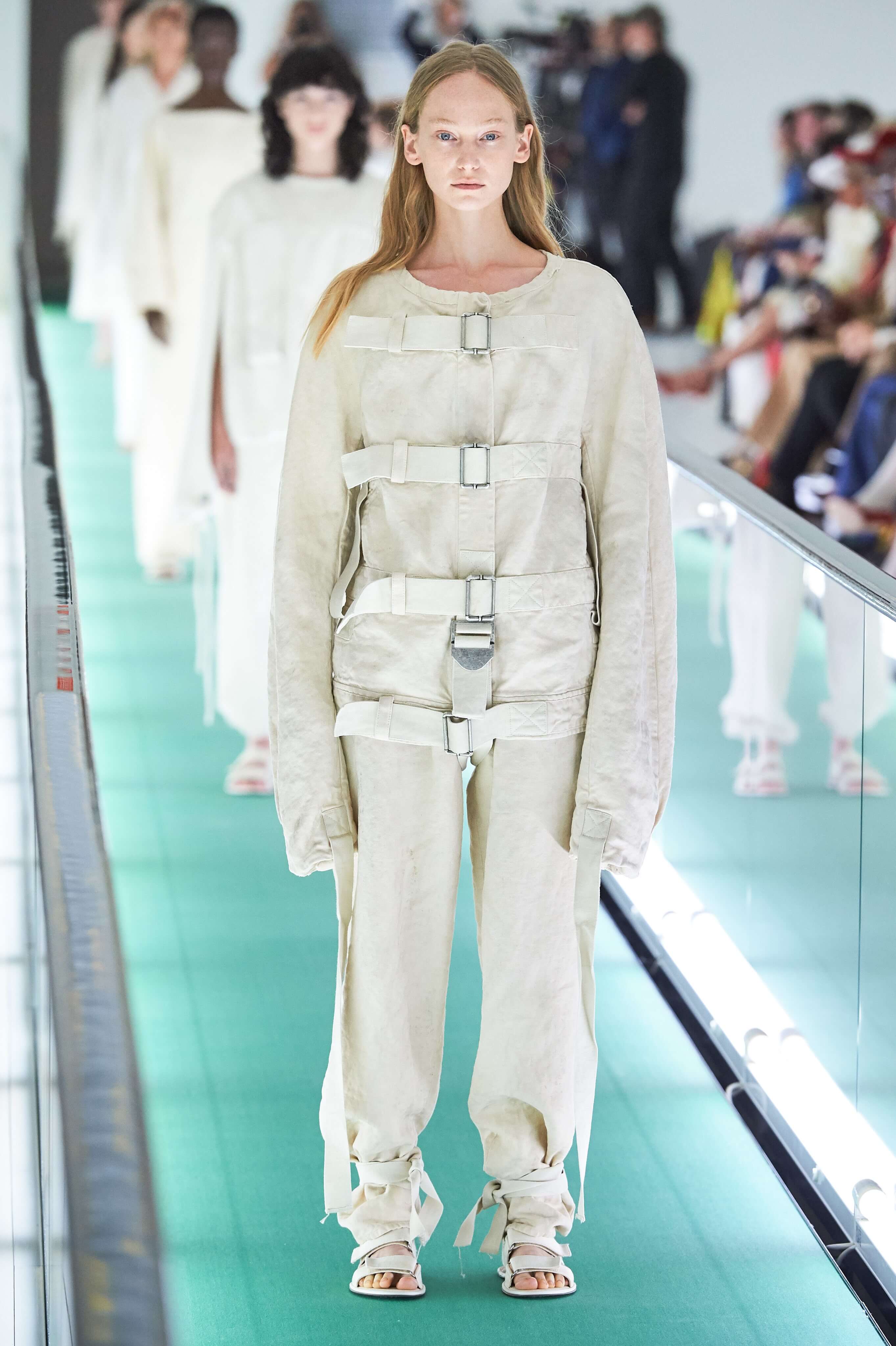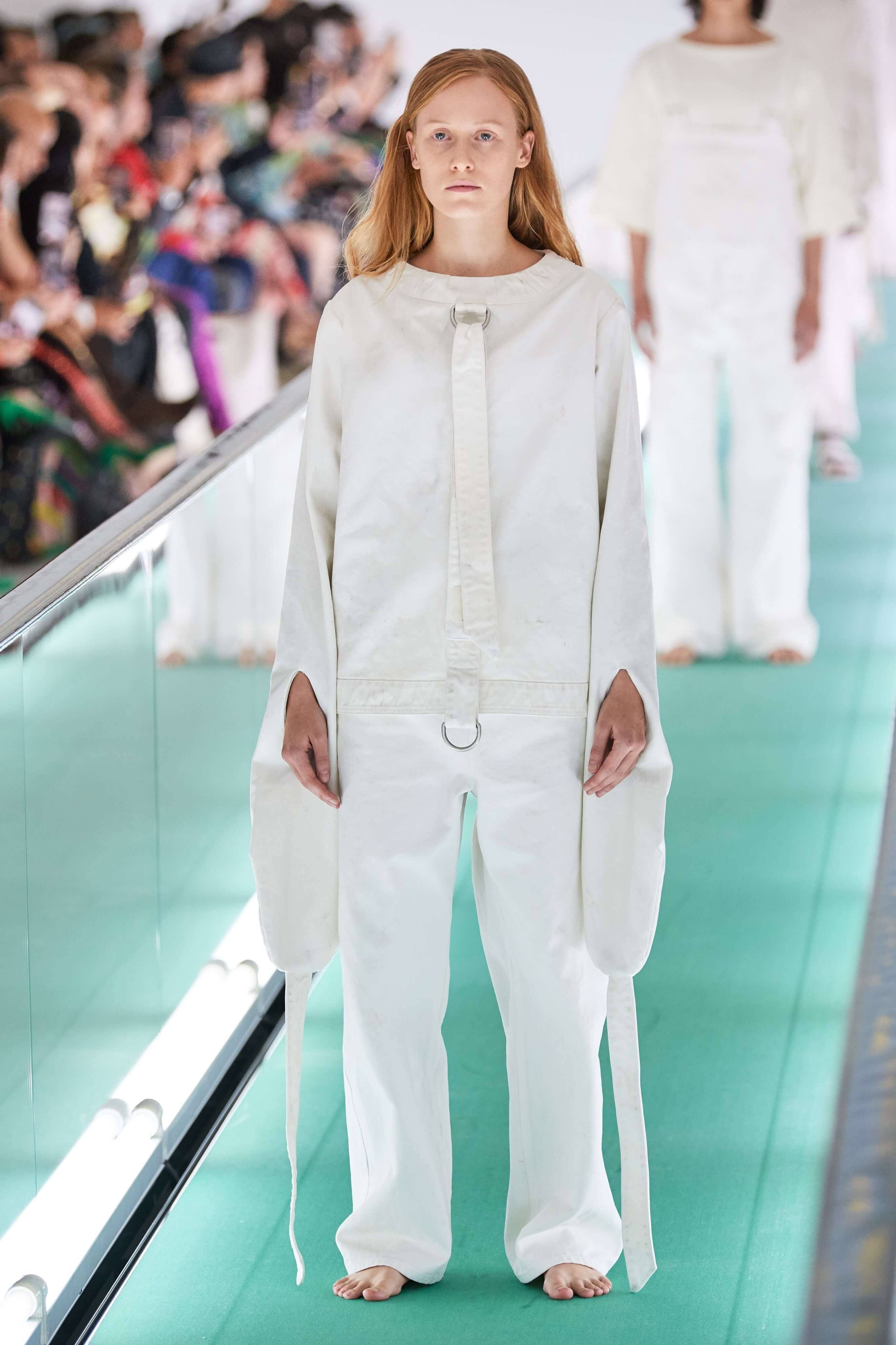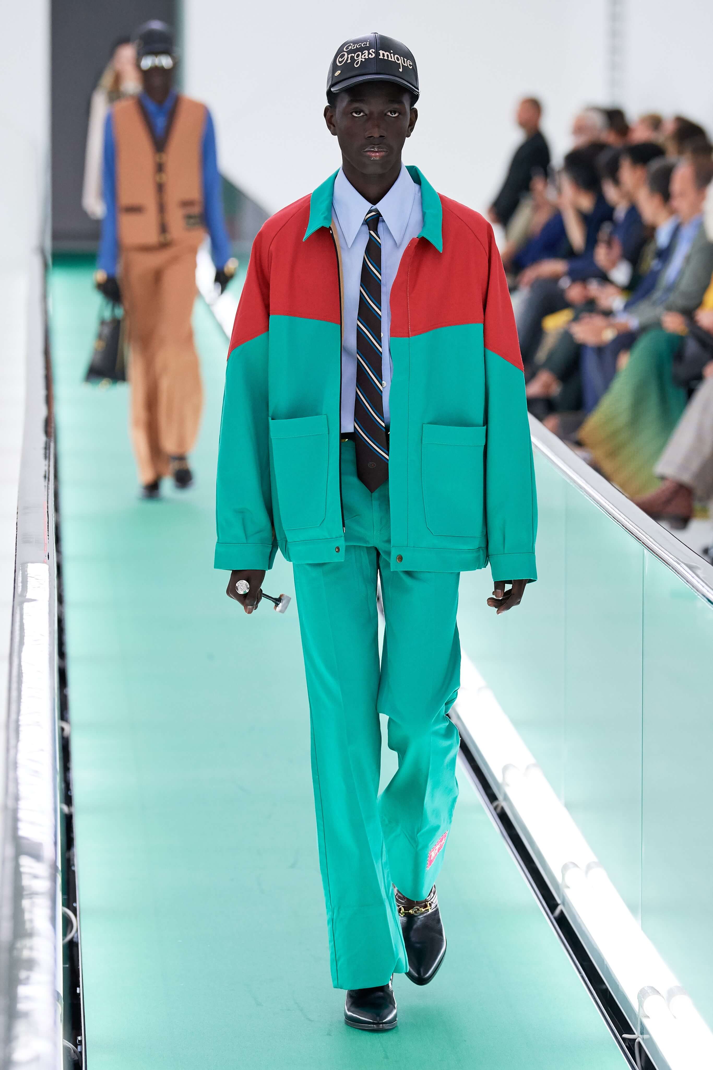 Мы уже писали о том, как развивался жанр антиутопии и как его канонические образы нашли воплощение в моде. Алессандро Микеле решил обратиться к теме в своей новой коллекции, превратив показ в интригующее шоу. В первой части модели проплывали на светящейся ленте-траволаторе в утилитарных, нарочито одинаковых одеждах, напоминающих не то лабораторные спецовки и смирительные костюмы, не то первичную одежду для армии клонов. Если рассмотреть, правда, становятся заметны детали на нарочито грубых робах, рубашках с гиперболизированными шнуровками, плащах-палатках и комбинезонах, которые мы уже мысленно видим во всех стритстайл-хрониках. Поначалу гости Gucci-хаба, наблюдавшие за происходящим, даже немного растерялись. Однако по окончании жутковатого первого показа погас свет и вскоре началась динамичная вторая часть шоу.