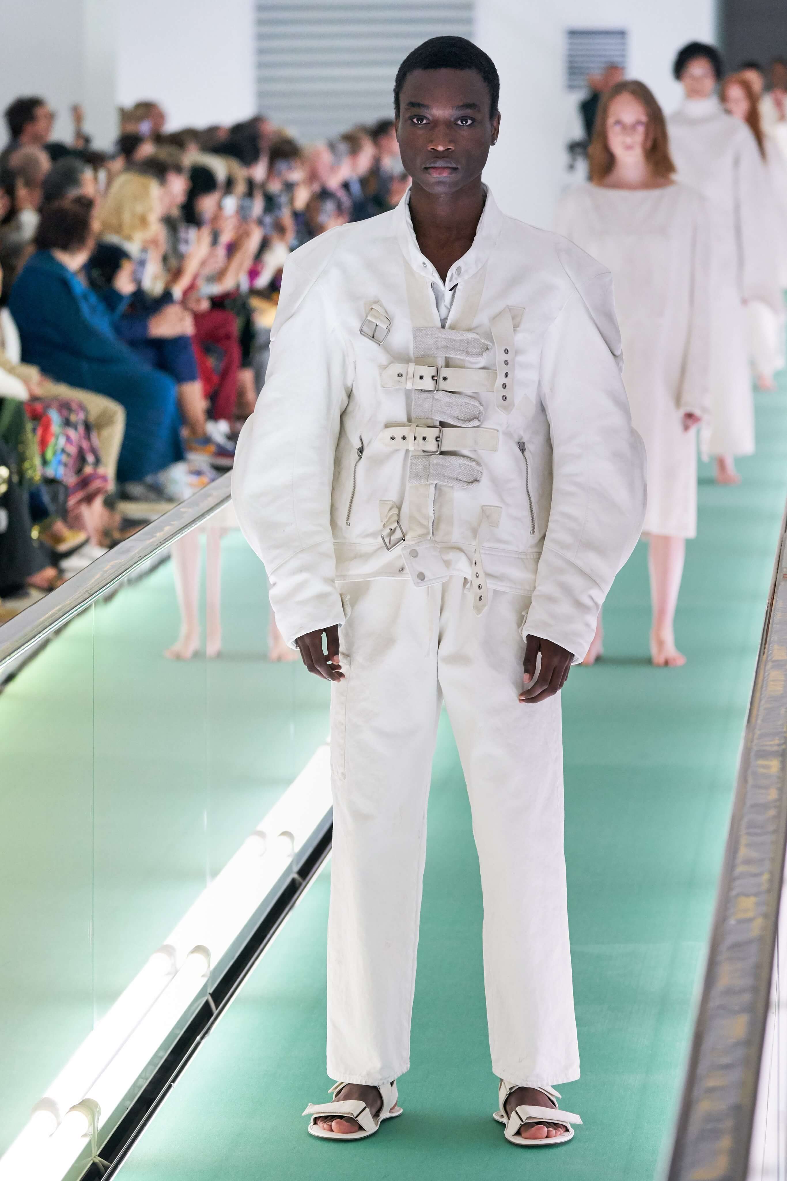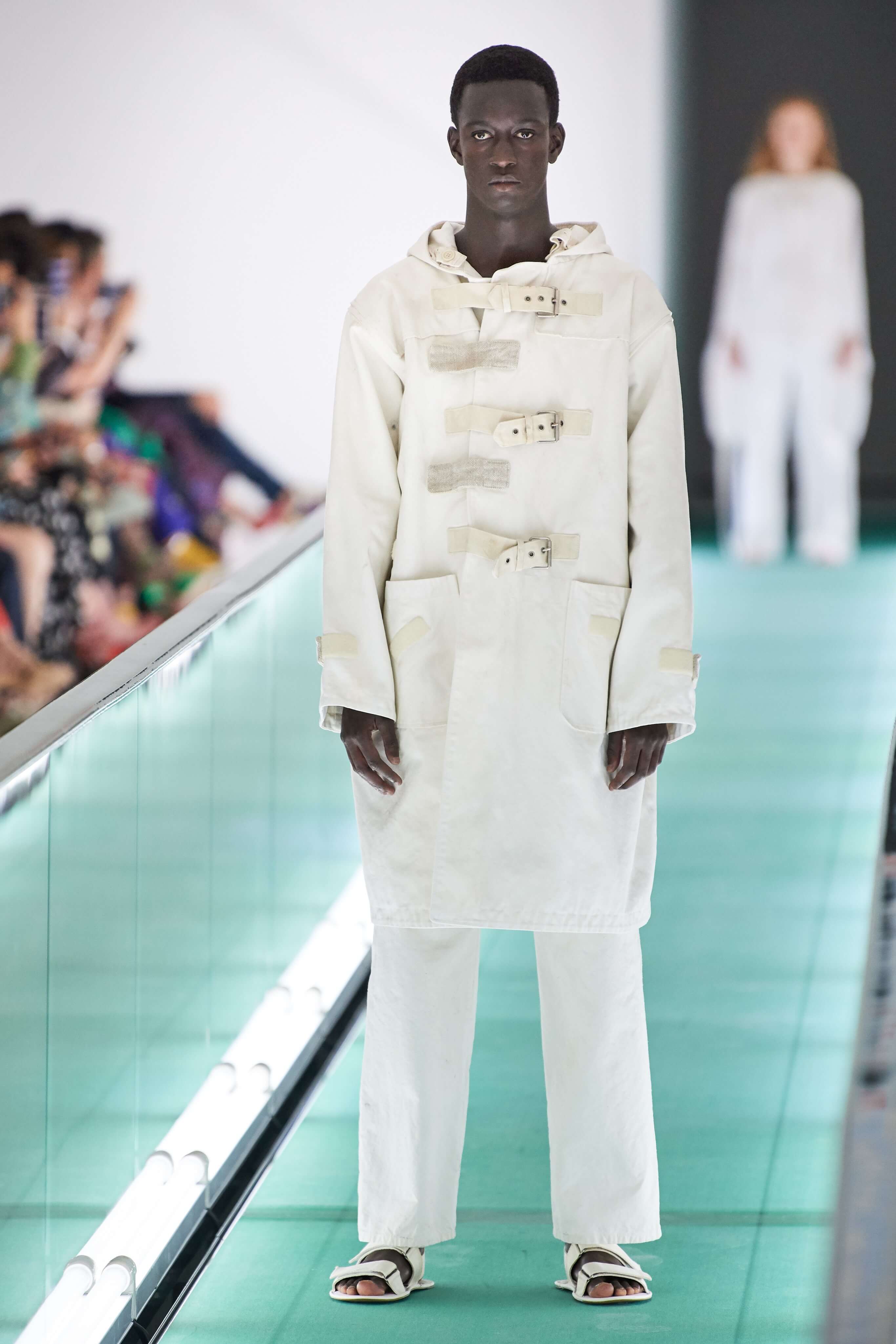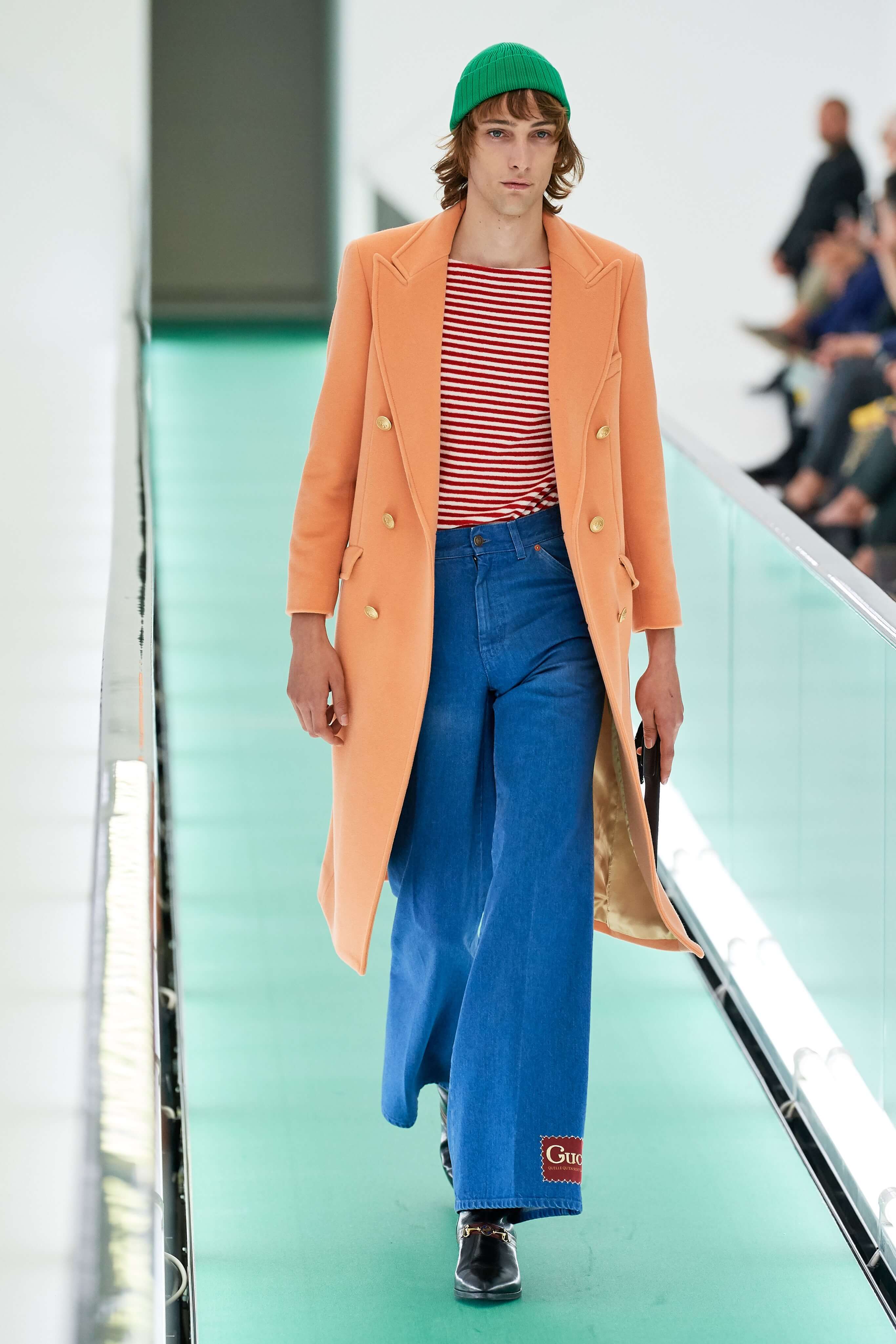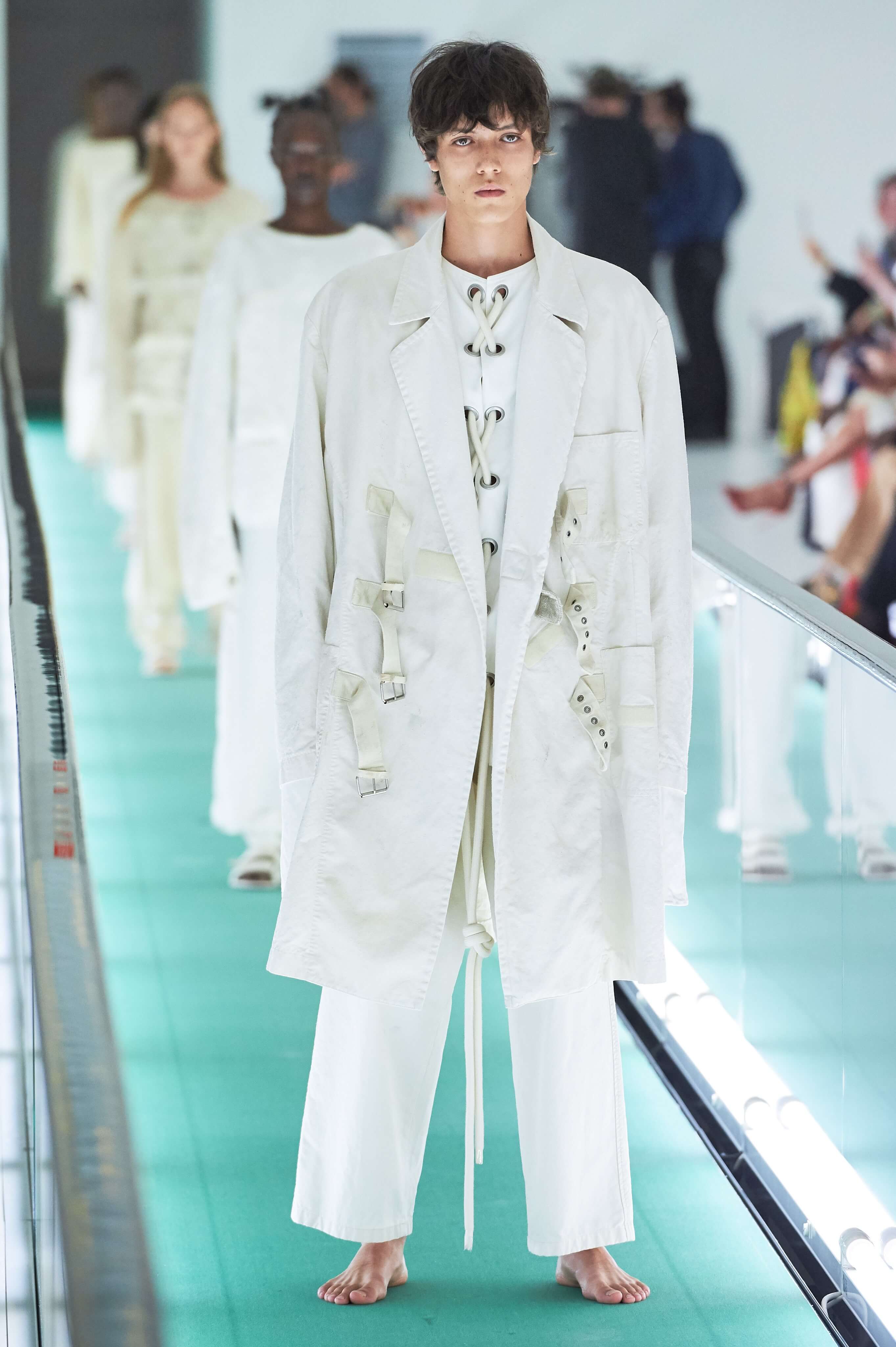 Мы уже писали о том, как развивался жанр антиутопии и как его канонические образы нашли воплощение в моде. Алессандро Микеле решил обратиться к теме в своей новой коллекции, превратив показ в интригующее шоу. В первой части модели проплывали на светящейся ленте-траволаторе в утилитарных, нарочито одинаковых одеждах, напоминающих не то лабораторные спецовки и смирительные костюмы, не то первичную одежду для армии клонов. Если рассмотреть, правда, становятся заметны детали на нарочито грубых робах, рубашках с гиперболизированными шнуровками, плащах-палатках и комбинезонах, которые мы уже мысленно видим во всех стритстайл-хрониках. Поначалу гости Gucci-хаба, наблюдавшие за происходящим, даже немного растерялись. Однако по окончании жутковатого первого показа погас свет и вскоре началась динамичная вторая часть шоу.