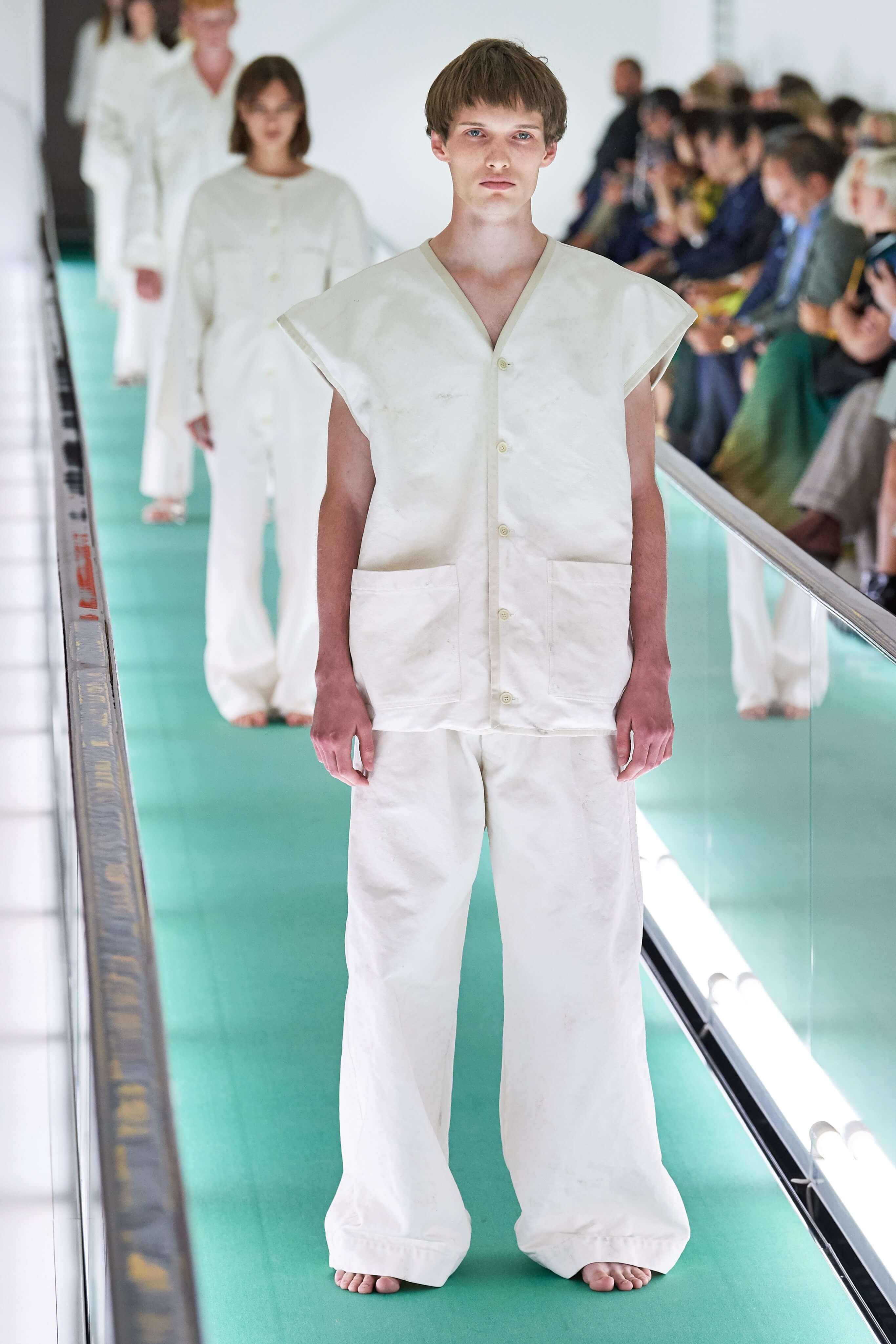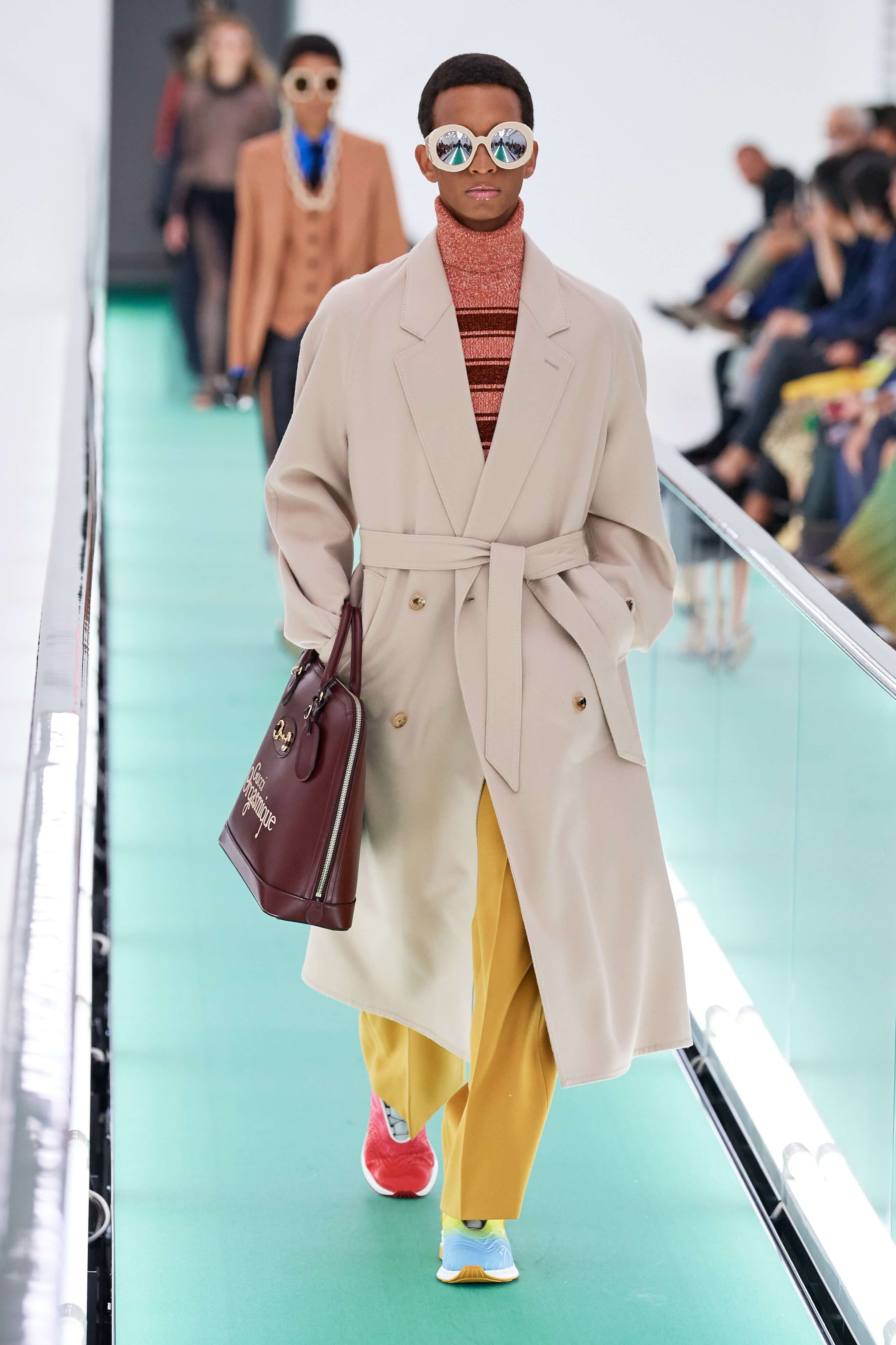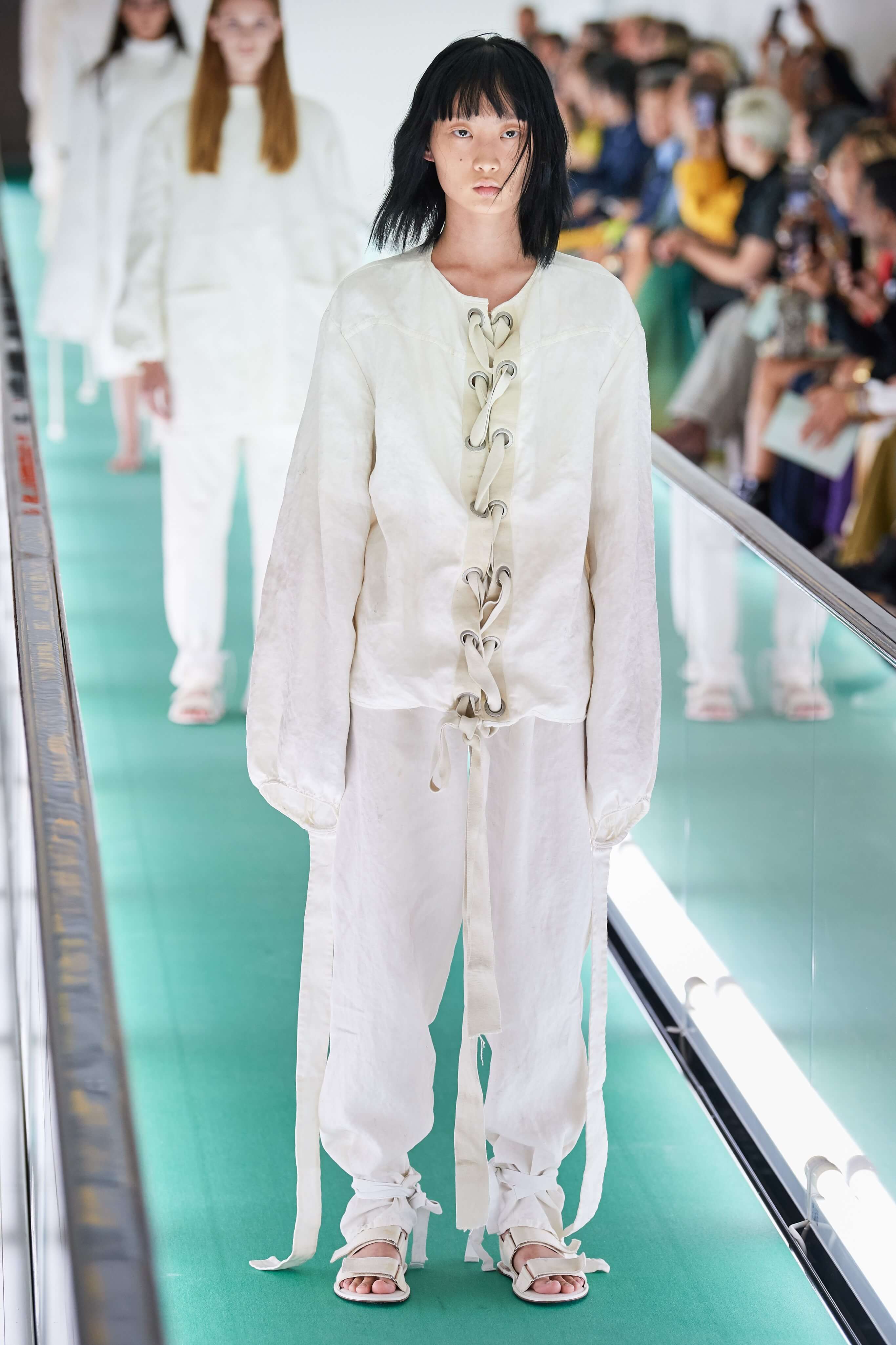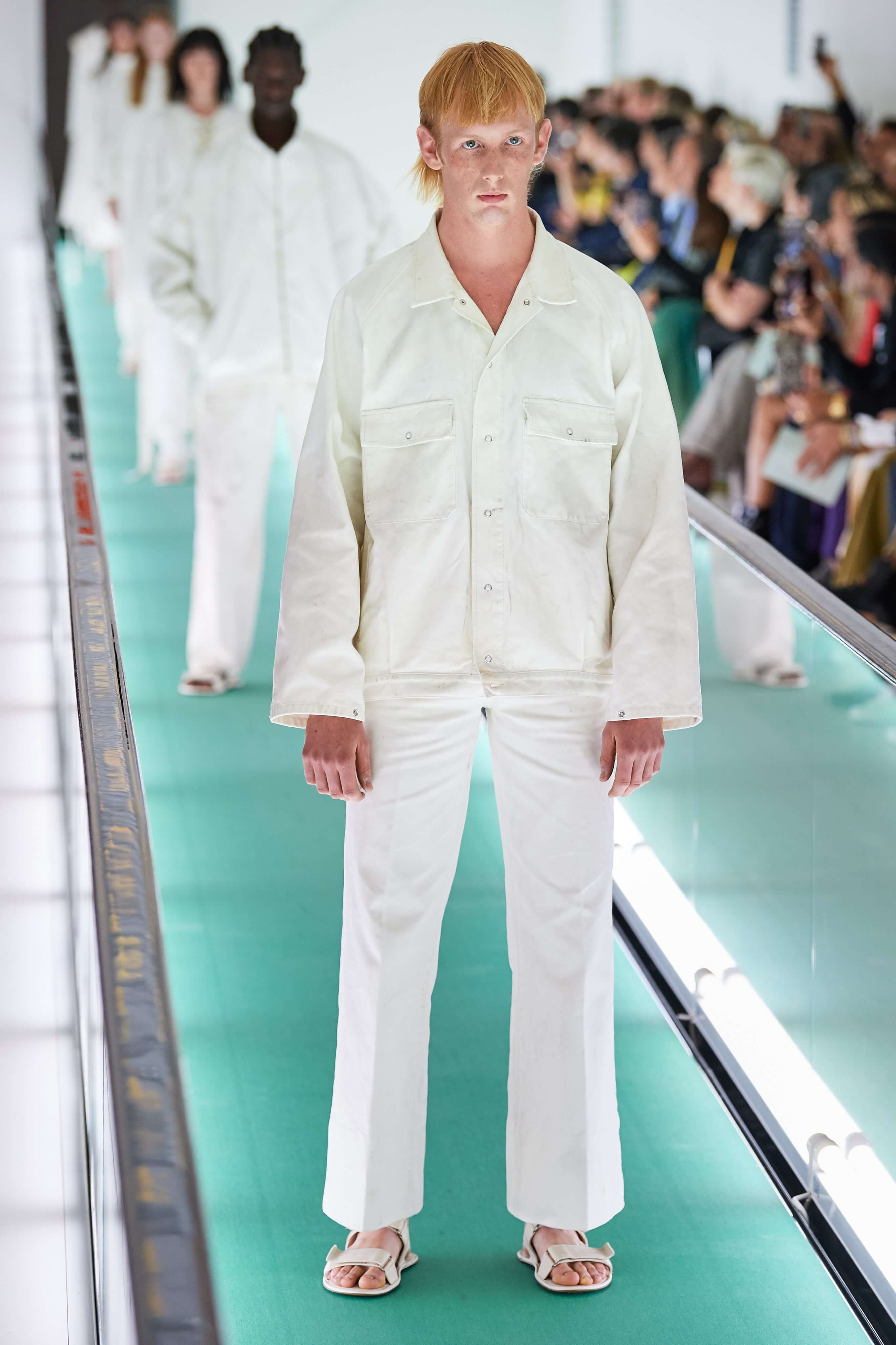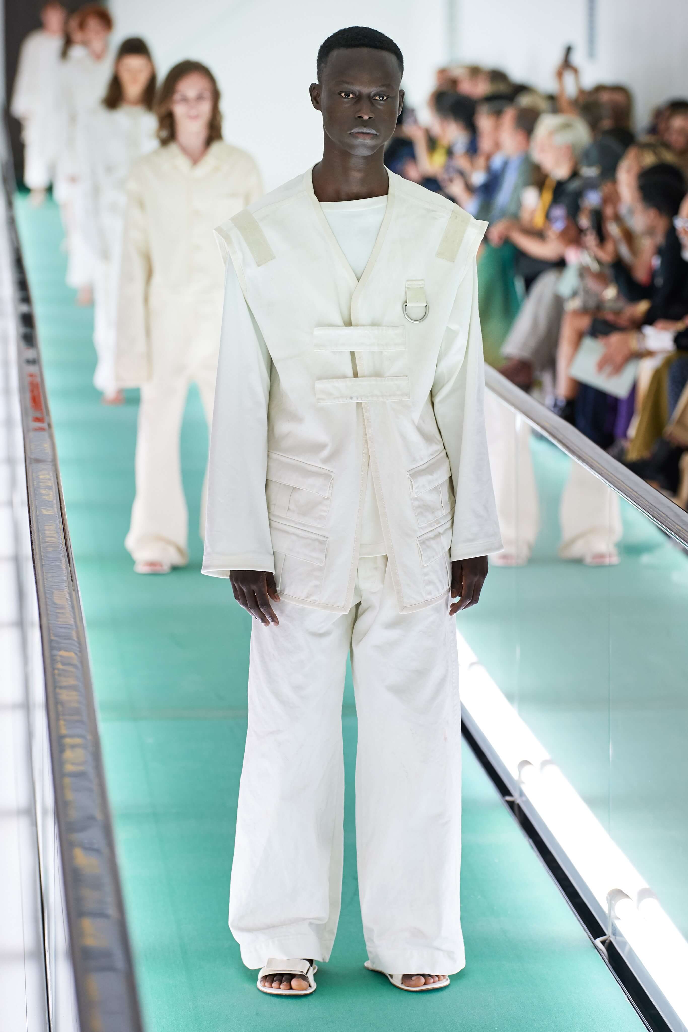Мы уже писали о том, как развивался жанр антиутопии и как его канонические образы нашли воплощение в моде. Алессандро Микеле решил обратиться к теме в своей новой коллекции, превратив показ в интригующее шоу. В первой части модели проплывали на светящейся ленте-траволаторе в утилитарных, нарочито одинаковых одеждах, напоминающих не то лабораторные спецовки и смирительные костюмы, не то первичную одежду для армии клонов. Если рассмотреть, правда, становятся заметны детали на нарочито грубых робах, рубашках с гиперболизированными шнуровками, плащах-палатках и комбинезонах, которые мы уже мысленно видим во всех стритстайл-хрониках. Поначалу гости Gucci-хаба, наблюдавшие за происходящим, даже немного растерялись. Однако по окончании жутковатого первого показа погас свет и вскоре началась динамичная вторая часть шоу.