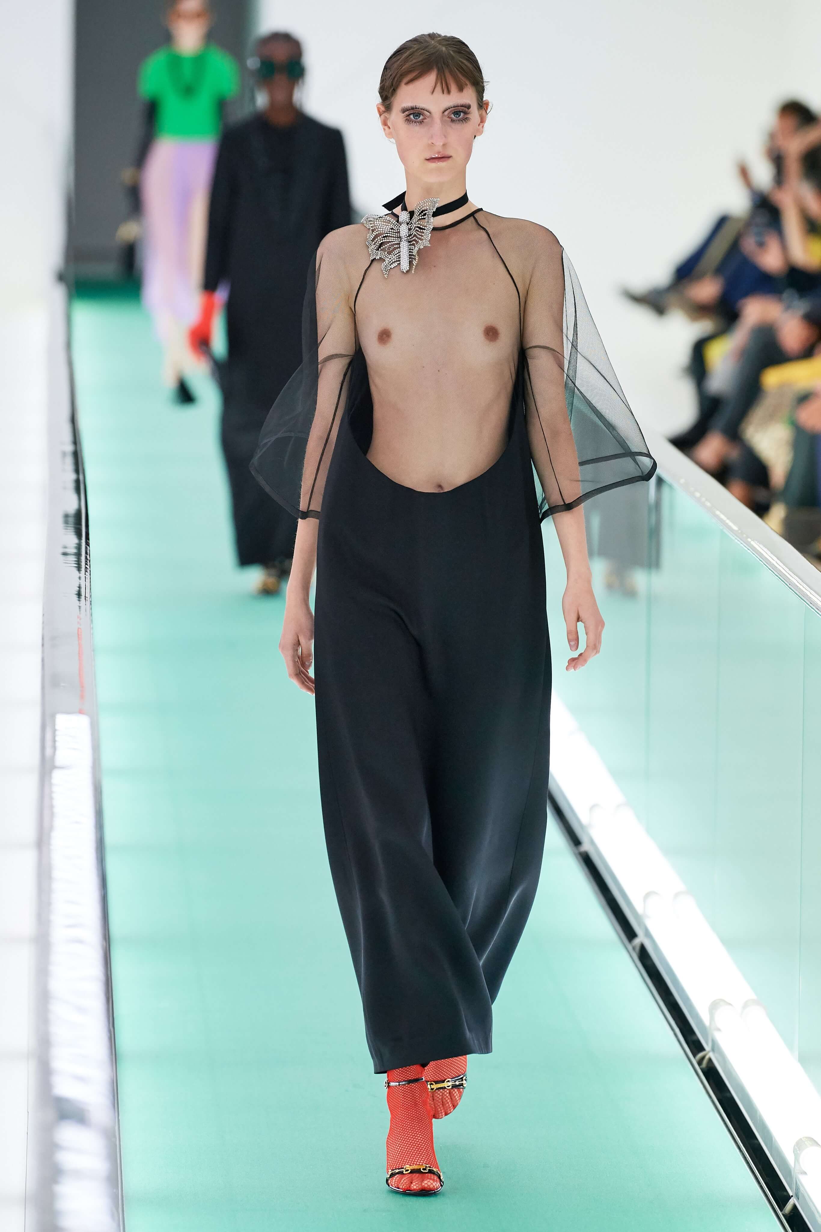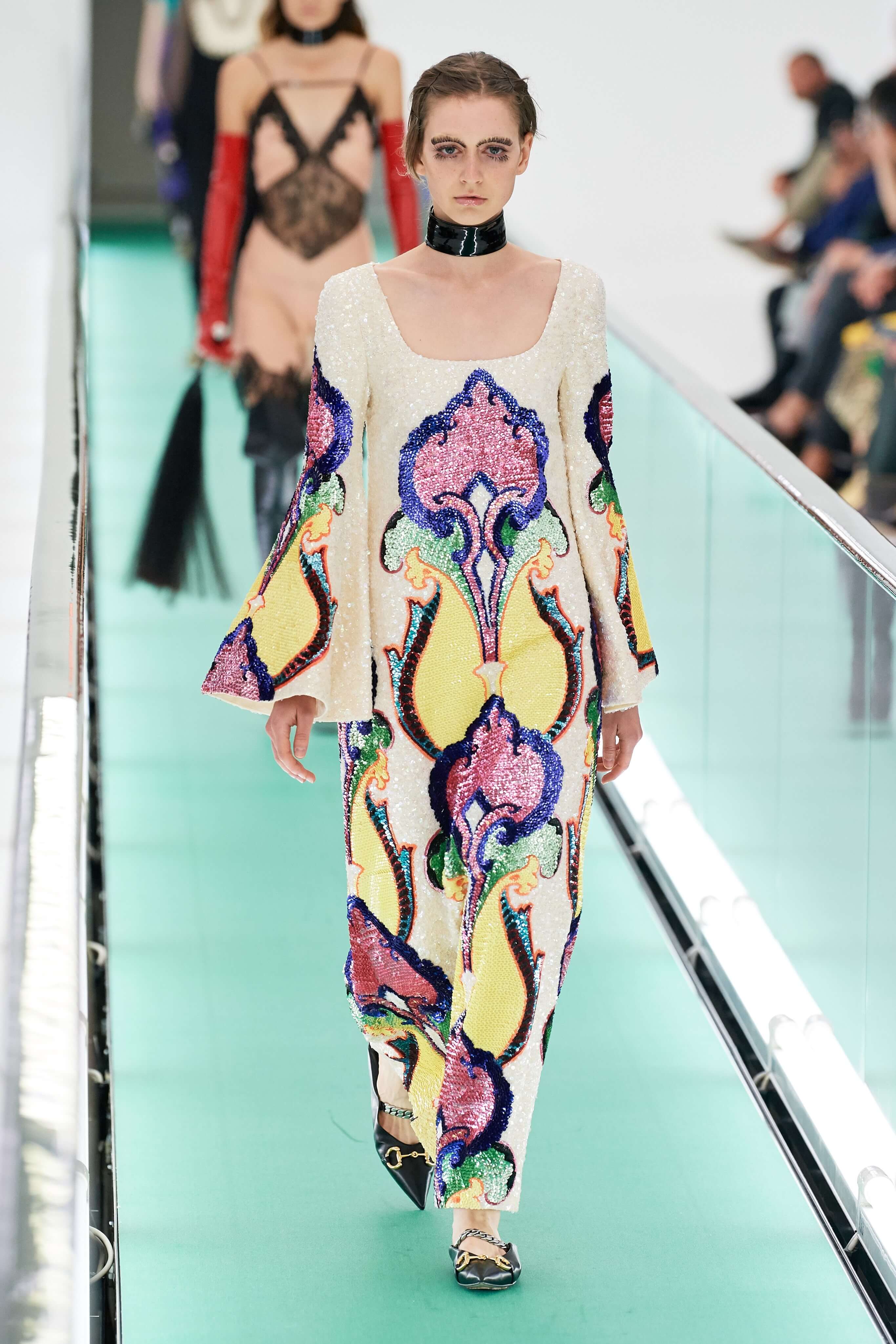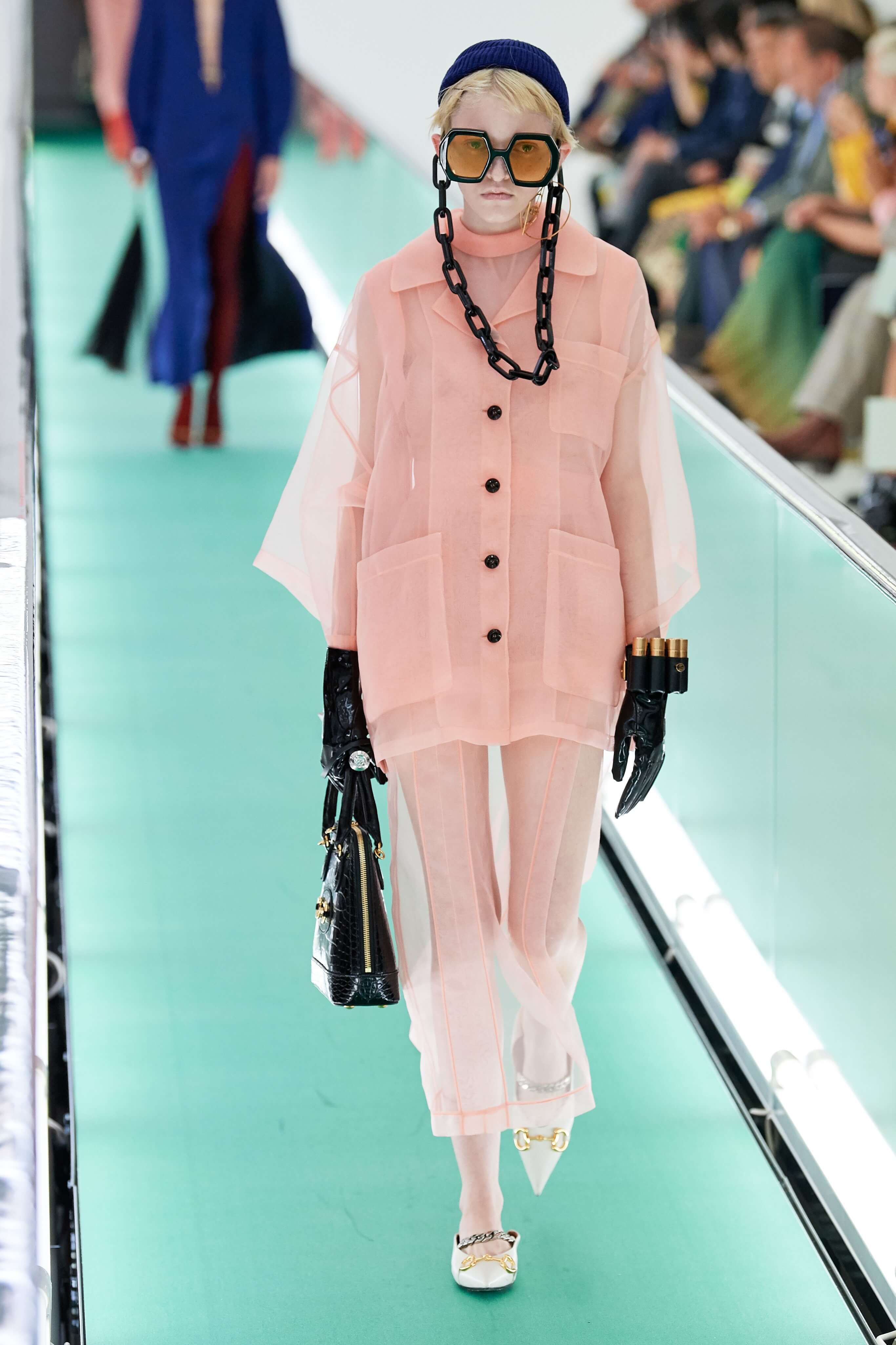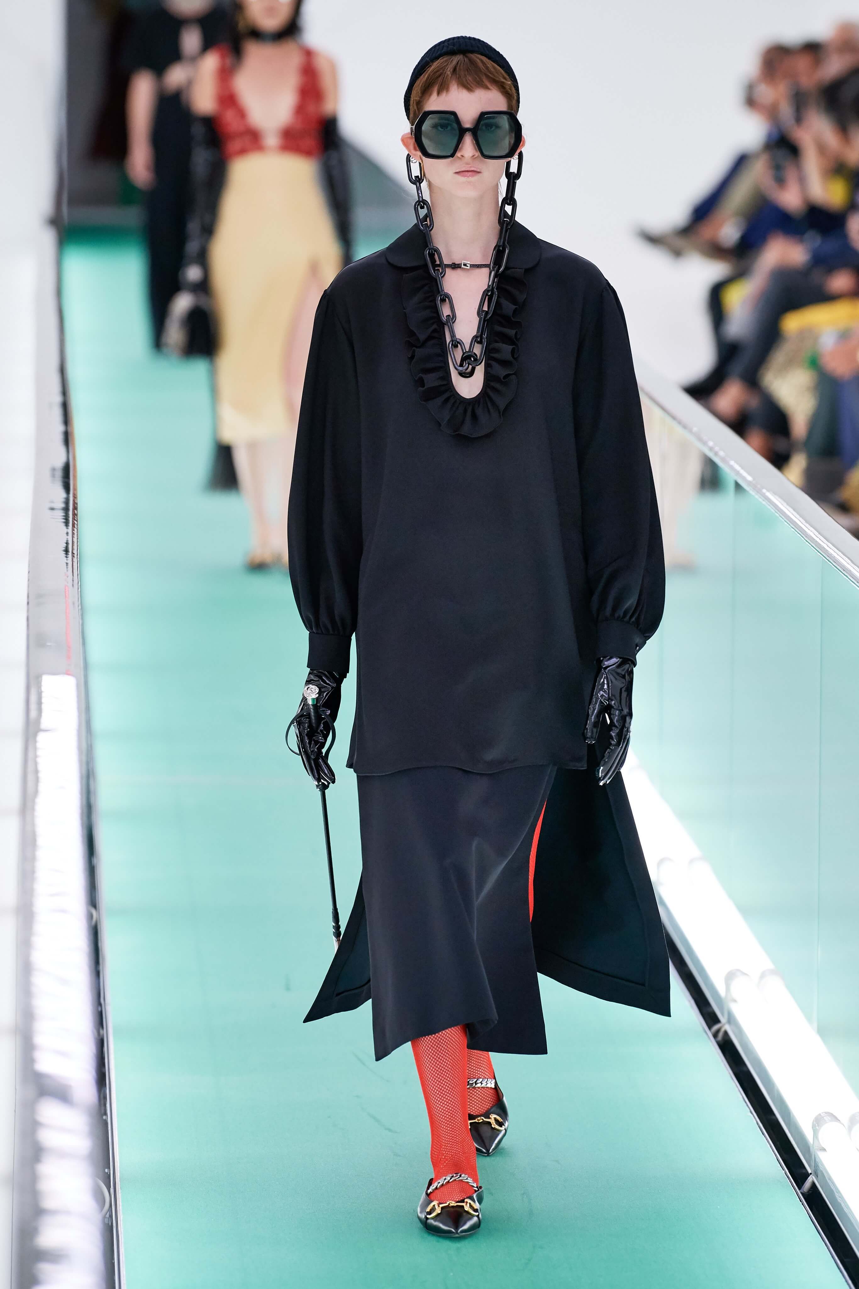 Однако на смену людям в белом на дорожку вышли модели в образах, провозглашающих свободную жизнь в обществе, лишенном предрассудков и навязанных постулатов. Здесь уже были и горячо любимые Микеле 70-е, и сексуальные готические платья, и будто срисованные с нарядов Древнего Египта сарафаны в пол, и нежные прозрачные кружева и костюмы из розовой органзы. Мужские рубашки с острыми воротничками, разноцветные перчатки, надетые поверх ярких лонгслив-топов, и цветные колготки дополняли солнцезащитные очки самых разных форм — те, что украшали массивные пластиковые цепи, так же как и нормативные белые платья, ждём в фотоотчетах модников. Как это и бывает у Алессандро Микеле, в коллекции нашлось место и для фетишистских образов с алыми кружевами и латексом, и для щегольских брючных костюмов и богатых платьев в стиле богемного шика.