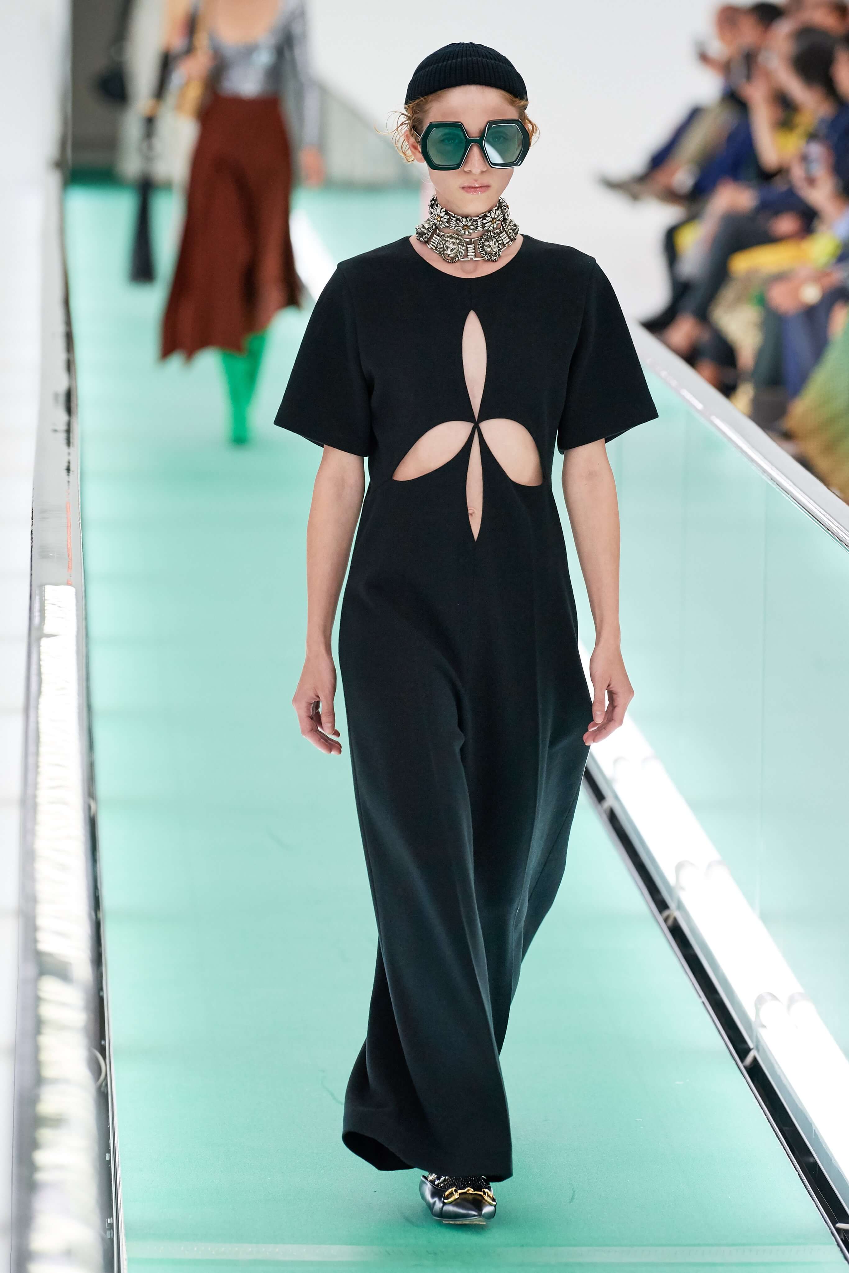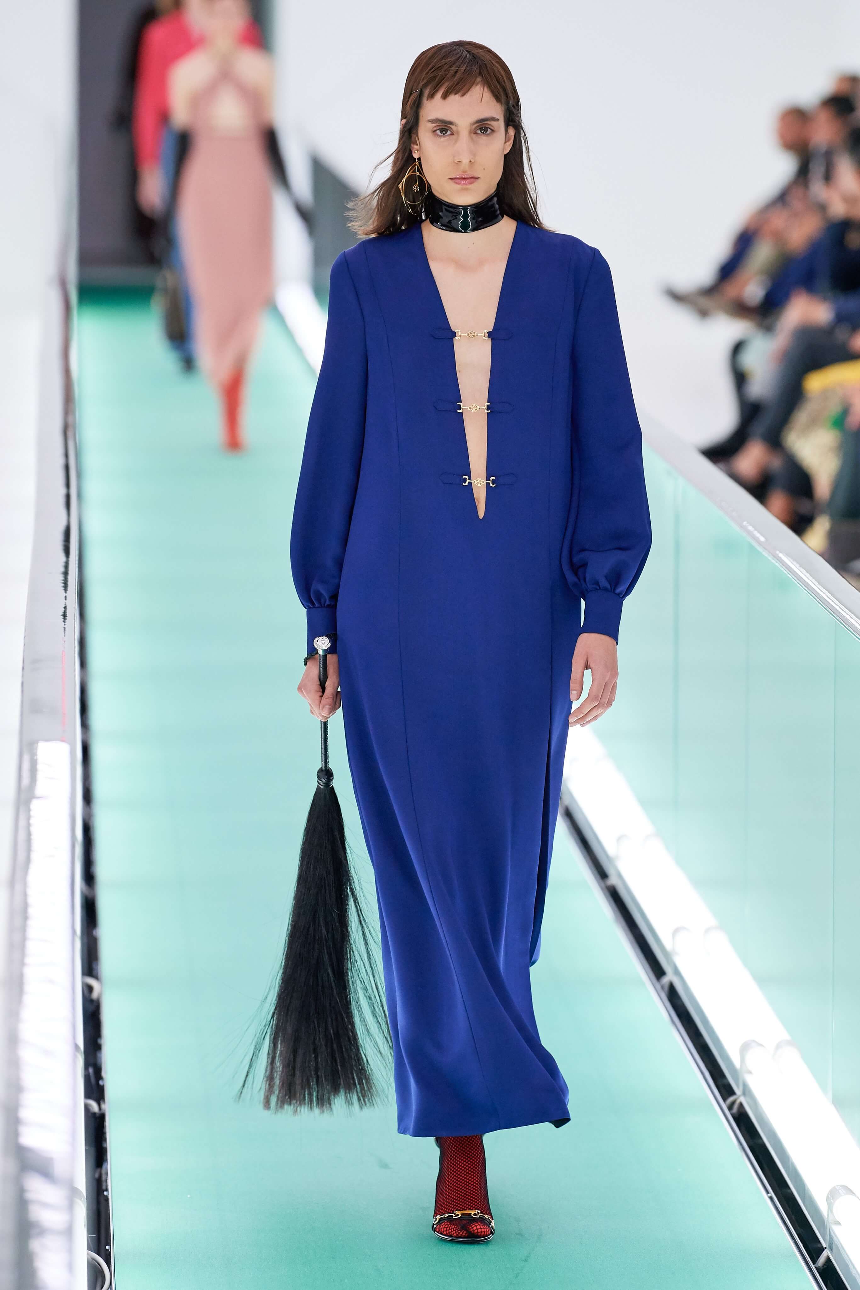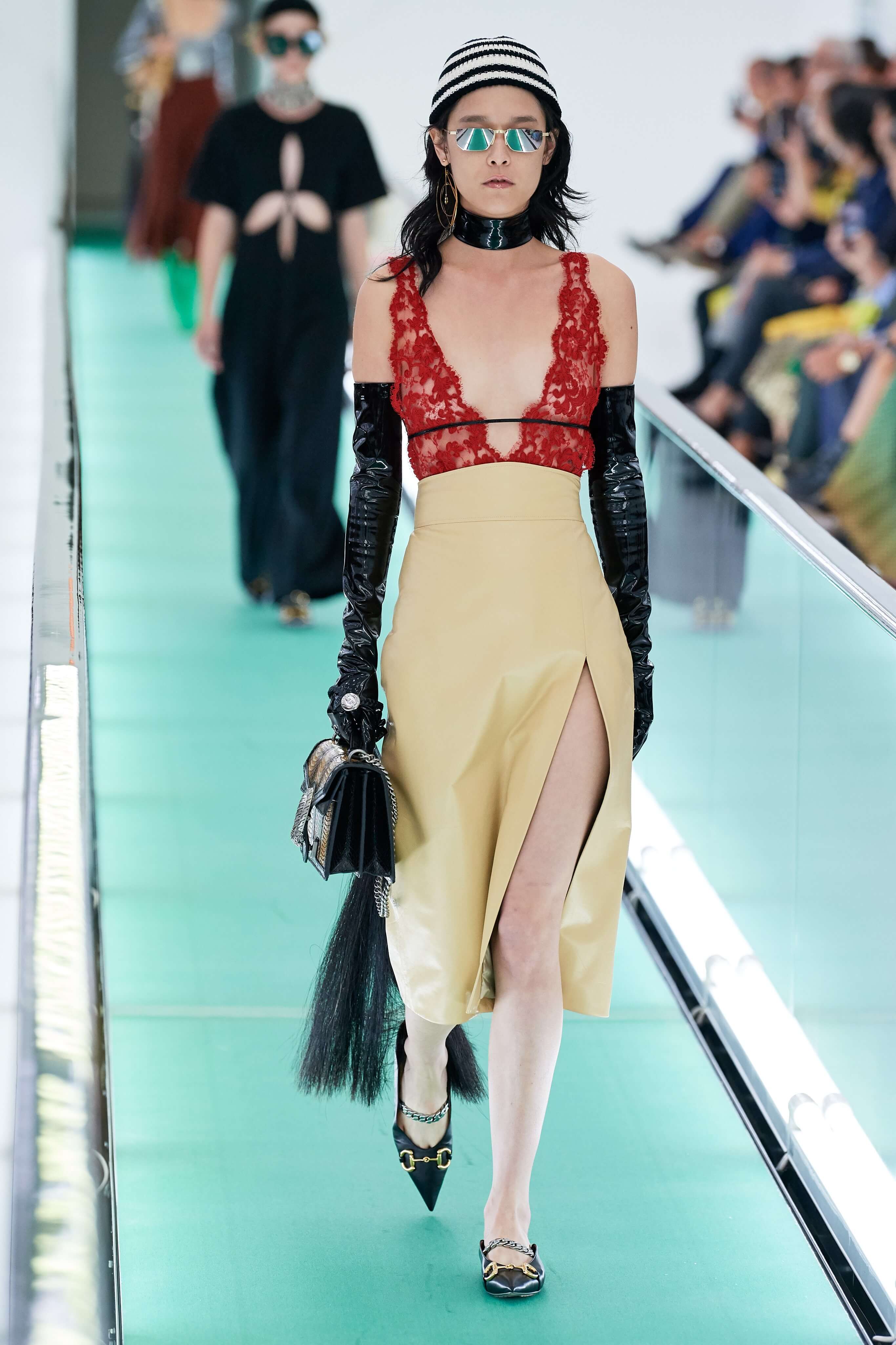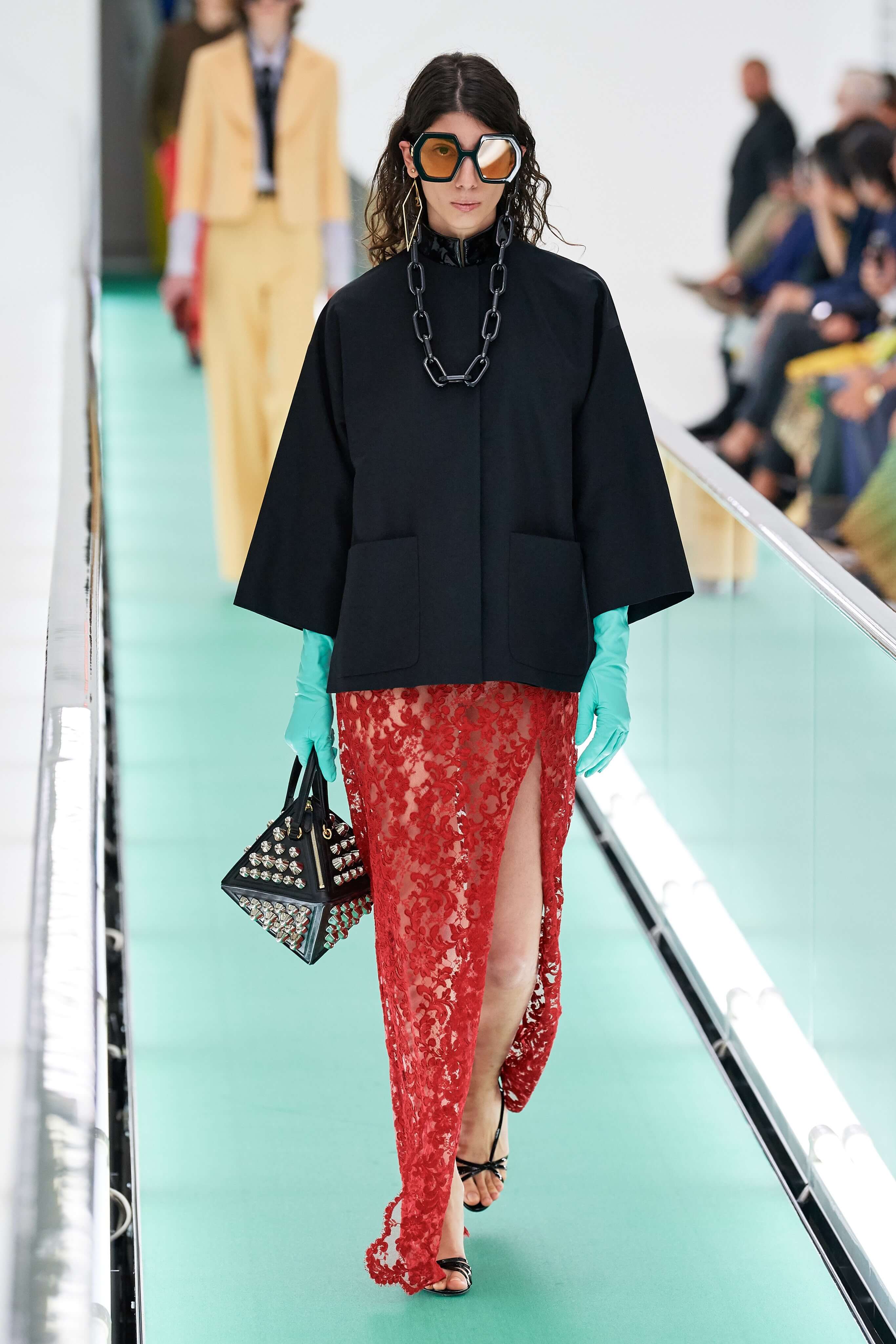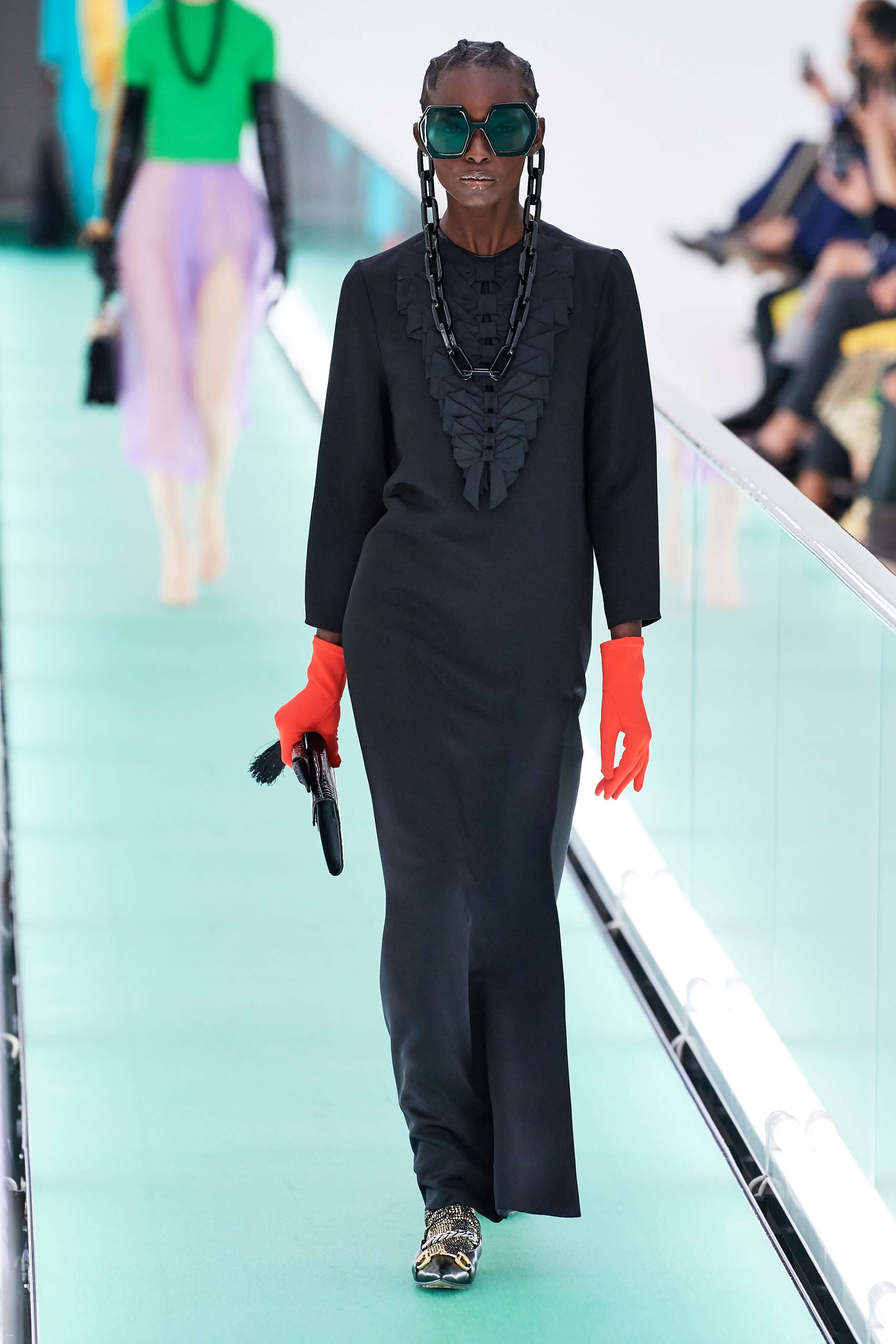 Однако на смену людям в белом на дорожку вышли модели в образах, провозглашающих свободную жизнь в обществе, лишенном предрассудков и навязанных постулатов. Здесь уже были и горячо любимые Микеле 70-е, и сексуальные готические платья, и будто срисованные с нарядов Древнего Египта сарафаны в пол, и нежные прозрачные кружева и костюмы из розовой органзы. Мужские рубашки с острыми воротничками, разноцветные перчатки, надетые поверх ярких лонгслив-топов, и цветные колготки дополняли солнцезащитные очки самых разных форм — те, что украшали массивные пластиковые цепи, так же как и нормативные белые платья, ждём в фотоотчетах модников. Как это и бывает у Алессандро Микеле, в коллекции нашлось место и для фетишистских образов с алыми кружевами и латексом, и для щегольских брючных костюмов и богатых платьев в стиле богемного шика.