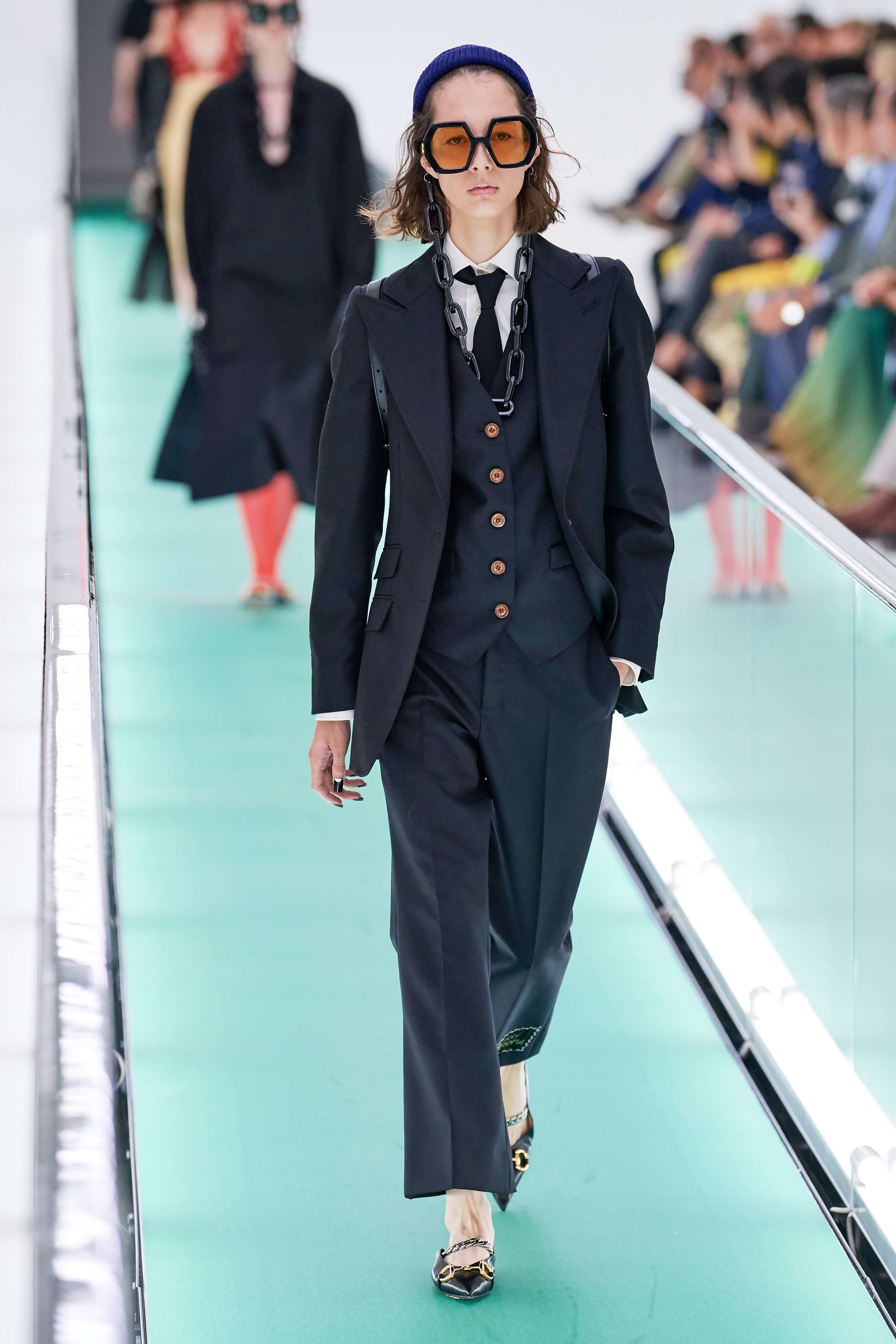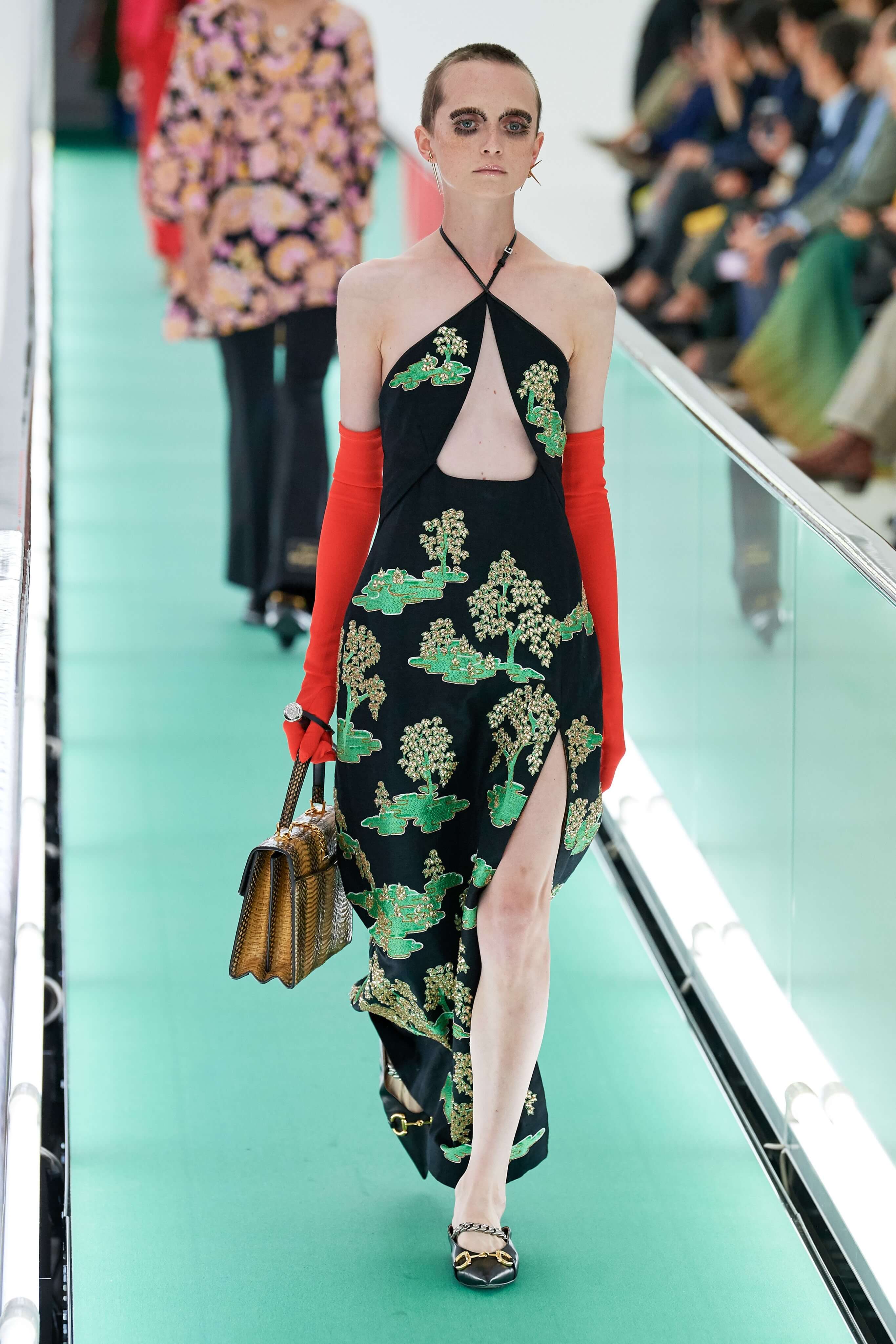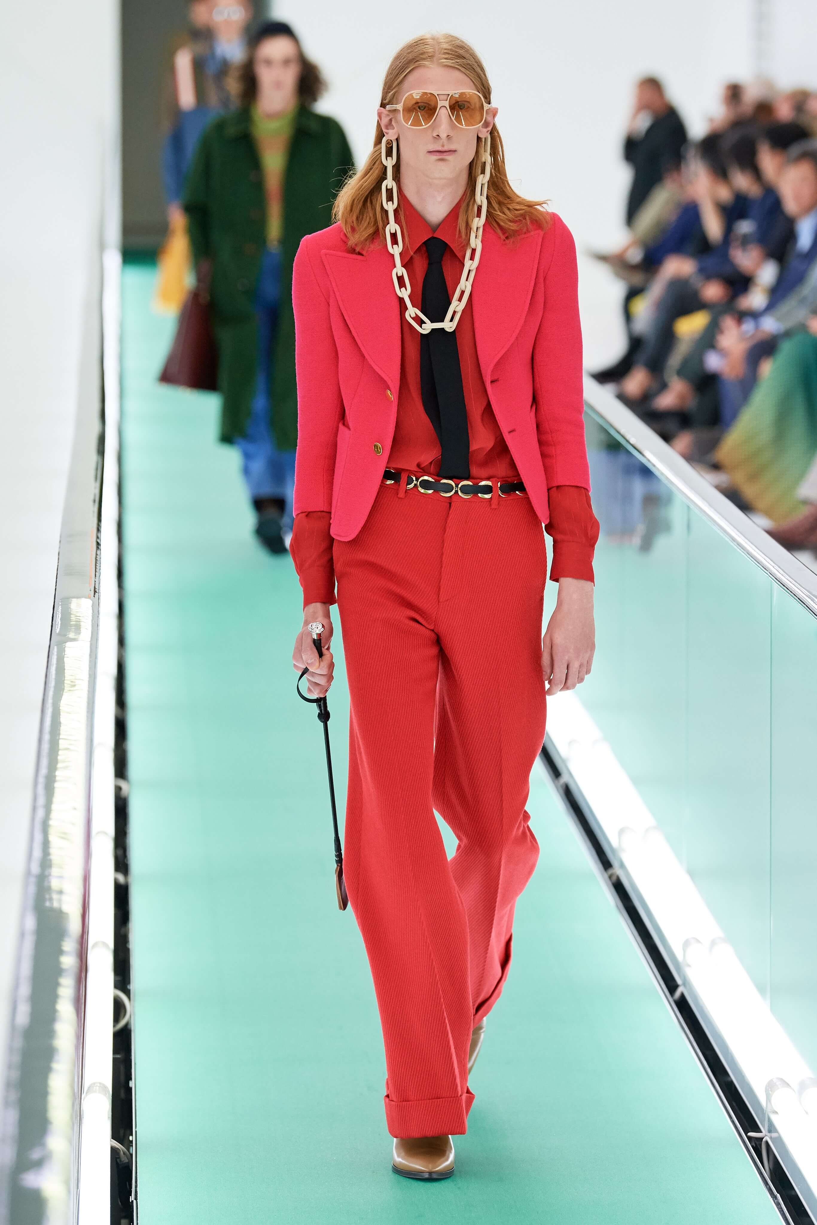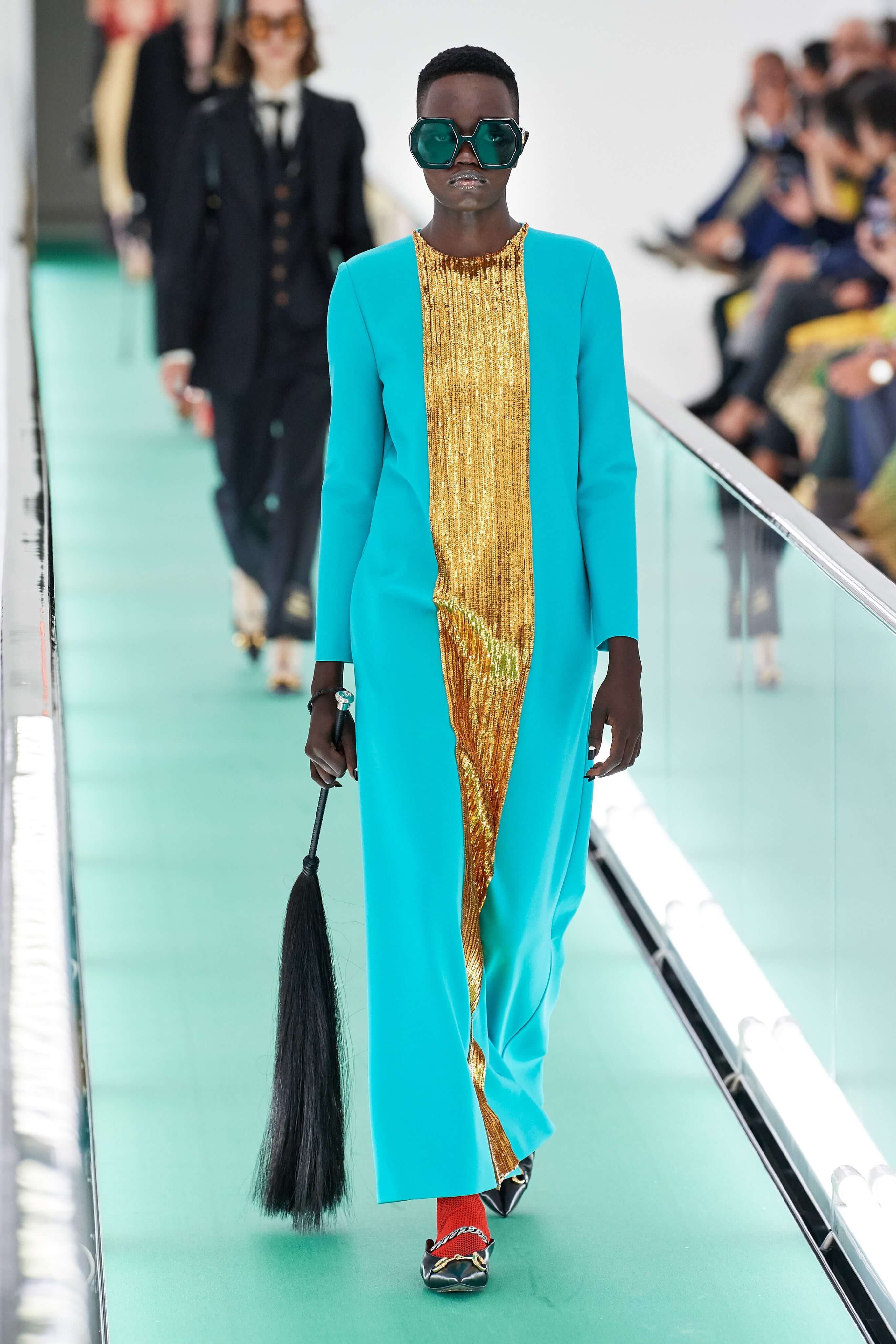 Однако на смену людям в белом на дорожку вышли модели в образах, провозглашающих свободную жизнь в обществе, лишенном предрассудков и навязанных постулатов. Здесь уже были и горячо любимые Микеле 70-е, и сексуальные готические платья, и будто срисованные с нарядов Древнего Египта сарафаны в пол, и нежные прозрачные кружева и костюмы из розовой органзы. Мужские рубашки с острыми воротничками, разноцветные перчатки, надетые поверх ярких лонгслив-топов, и цветные колготки дополняли солнцезащитные очки самых разных форм — те, что украшали массивные пластиковые цепи, так же как и нормативные белые платья, ждём в фотоотчетах модников. Как это и бывает у Алессандро Микеле, в коллекции нашлось место и для фетишистских образов с алыми кружевами и латексом, и для щегольских брючных костюмов и богатых платьев в стиле богемного шика.