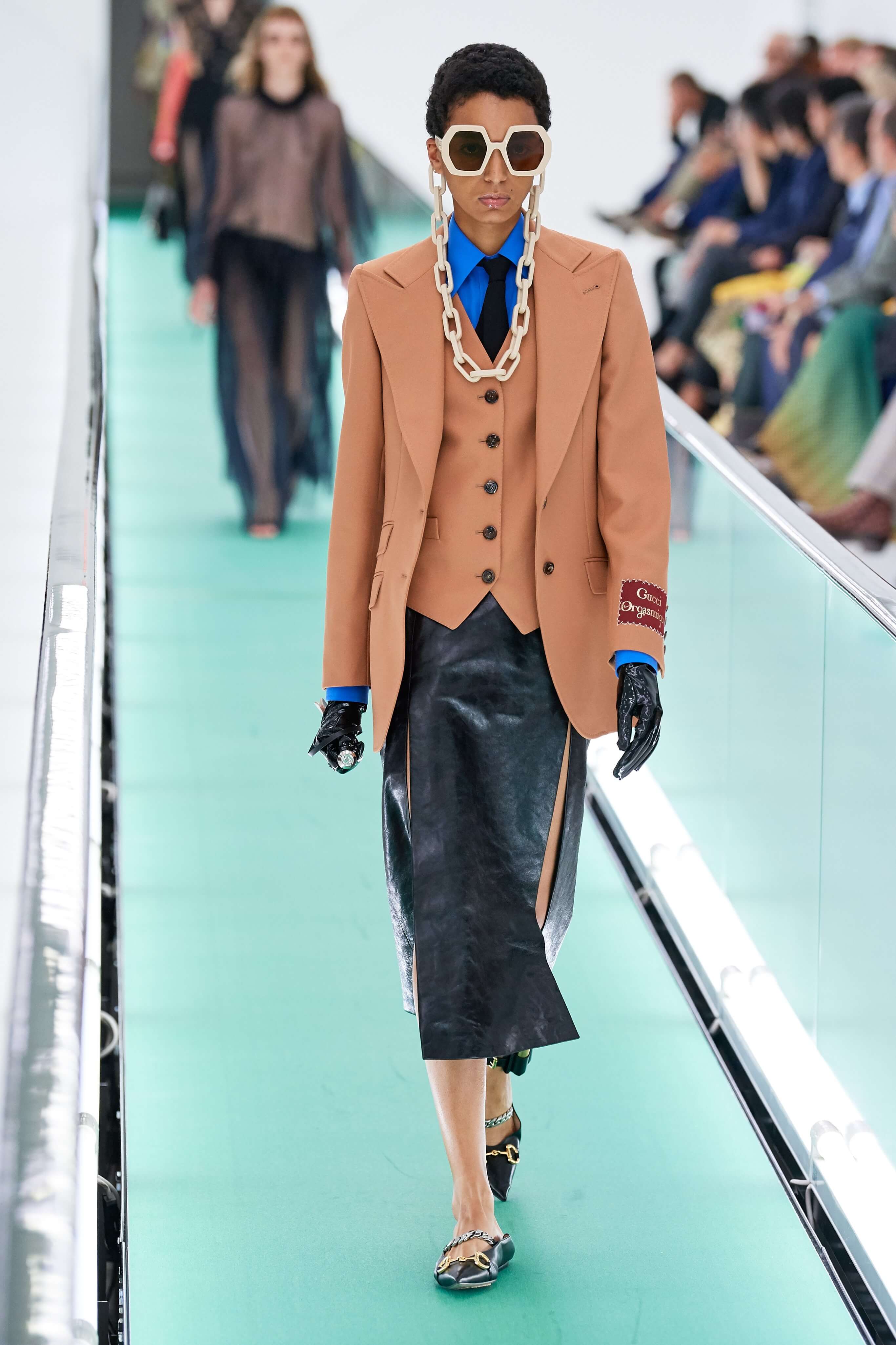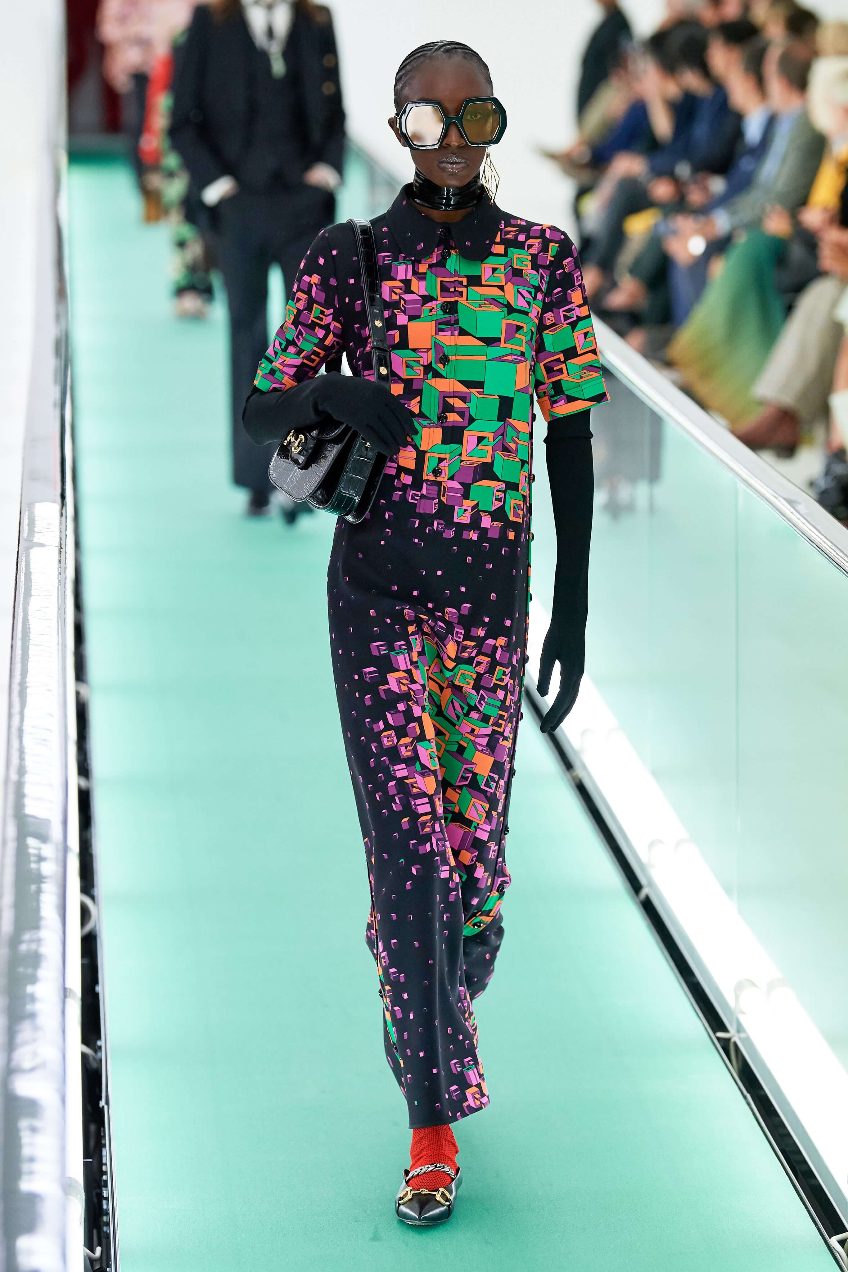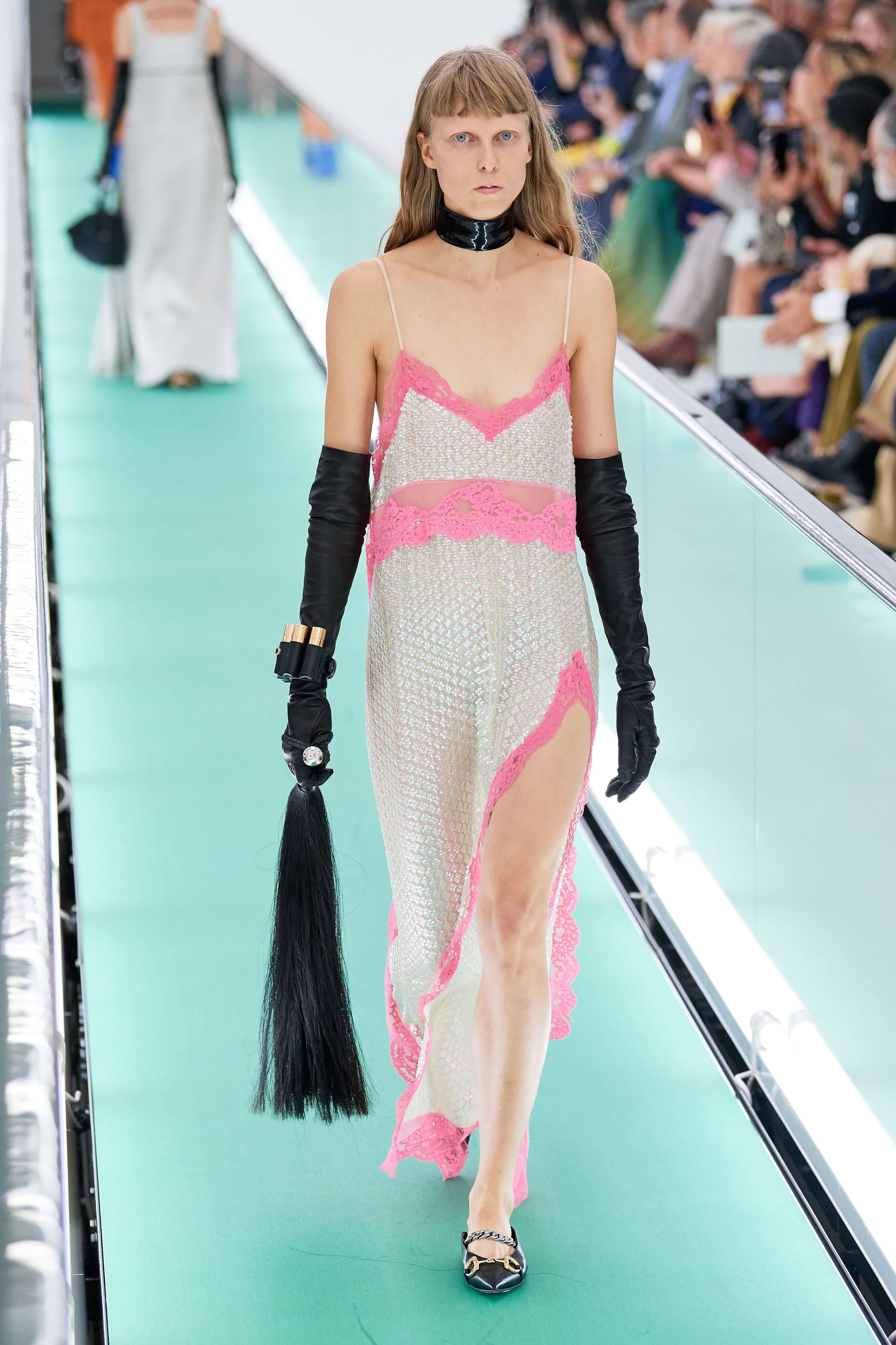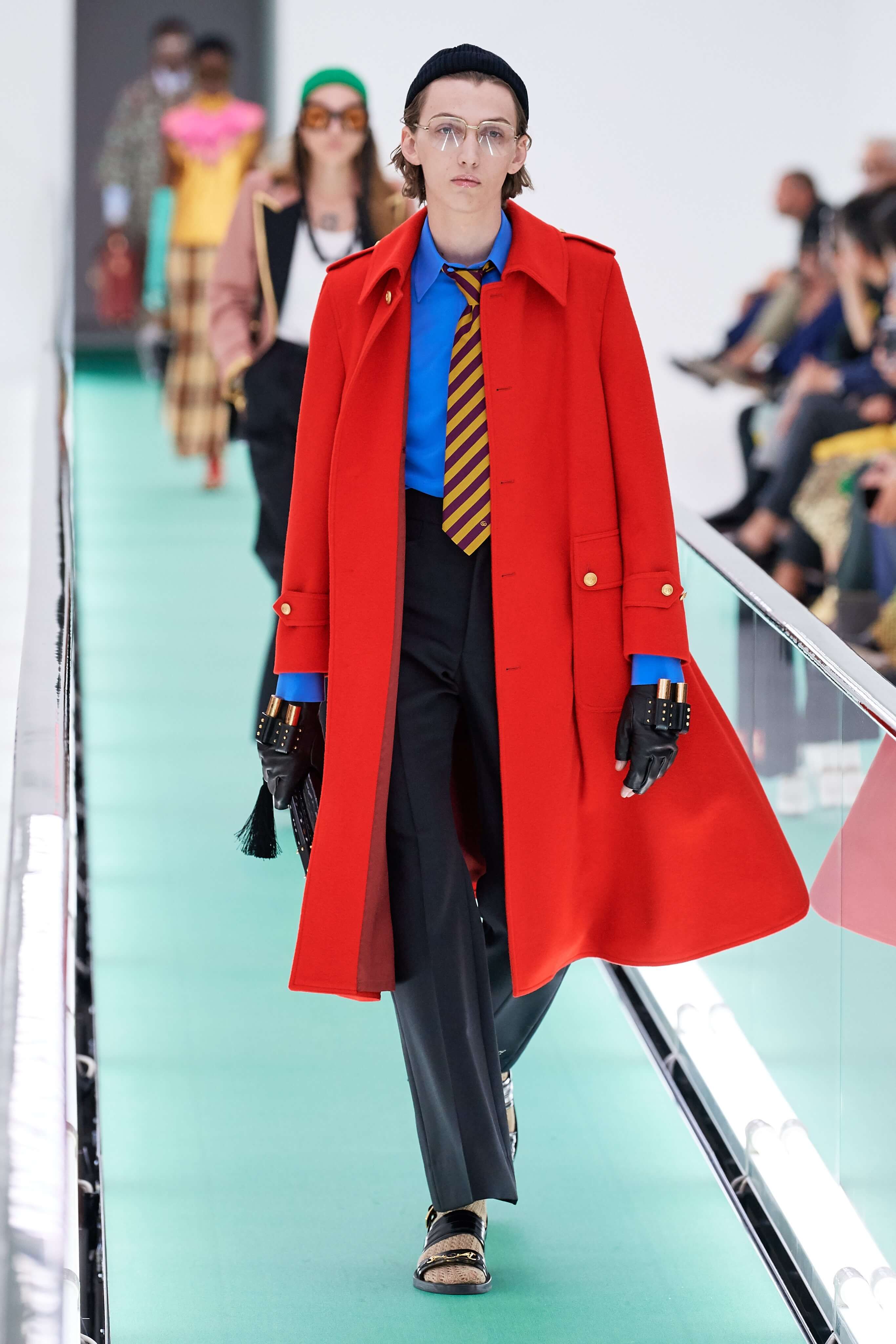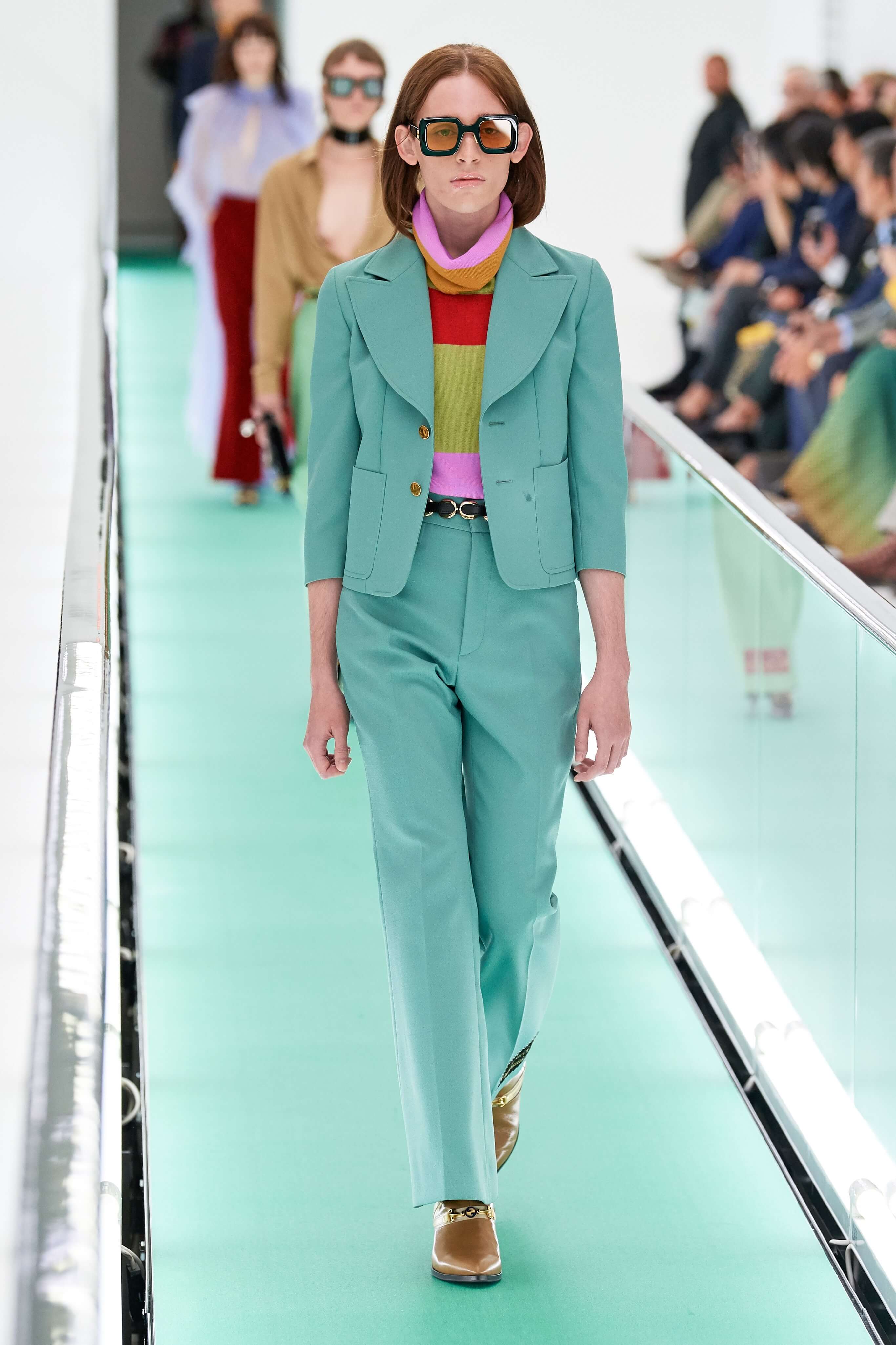 Однако на смену людям в белом на дорожку вышли модели в образах, провозглашающих свободную жизнь в обществе, лишенном предрассудков и навязанных постулатов. Здесь уже были и горячо любимые Микеле 70-е, и сексуальные готические платья, и будто срисованные с нарядов Древнего Египта сарафаны в пол, и нежные прозрачные кружева и костюмы из розовой органзы. Мужские рубашки с острыми воротничками, разноцветные перчатки, надетые поверх ярких лонгслив-топов, и цветные колготки дополняли солнцезащитные очки самых разных форм — те, что украшали массивные пластиковые цепи, так же как и нормативные белые платья, ждём в фотоотчетах модников. Как это и бывает у Алессандро Микеле, в коллекции нашлось место и для фетишистских образов с алыми кружевами и латексом, и для щегольских брючных костюмов и богатых платьев в стиле богемного шика.