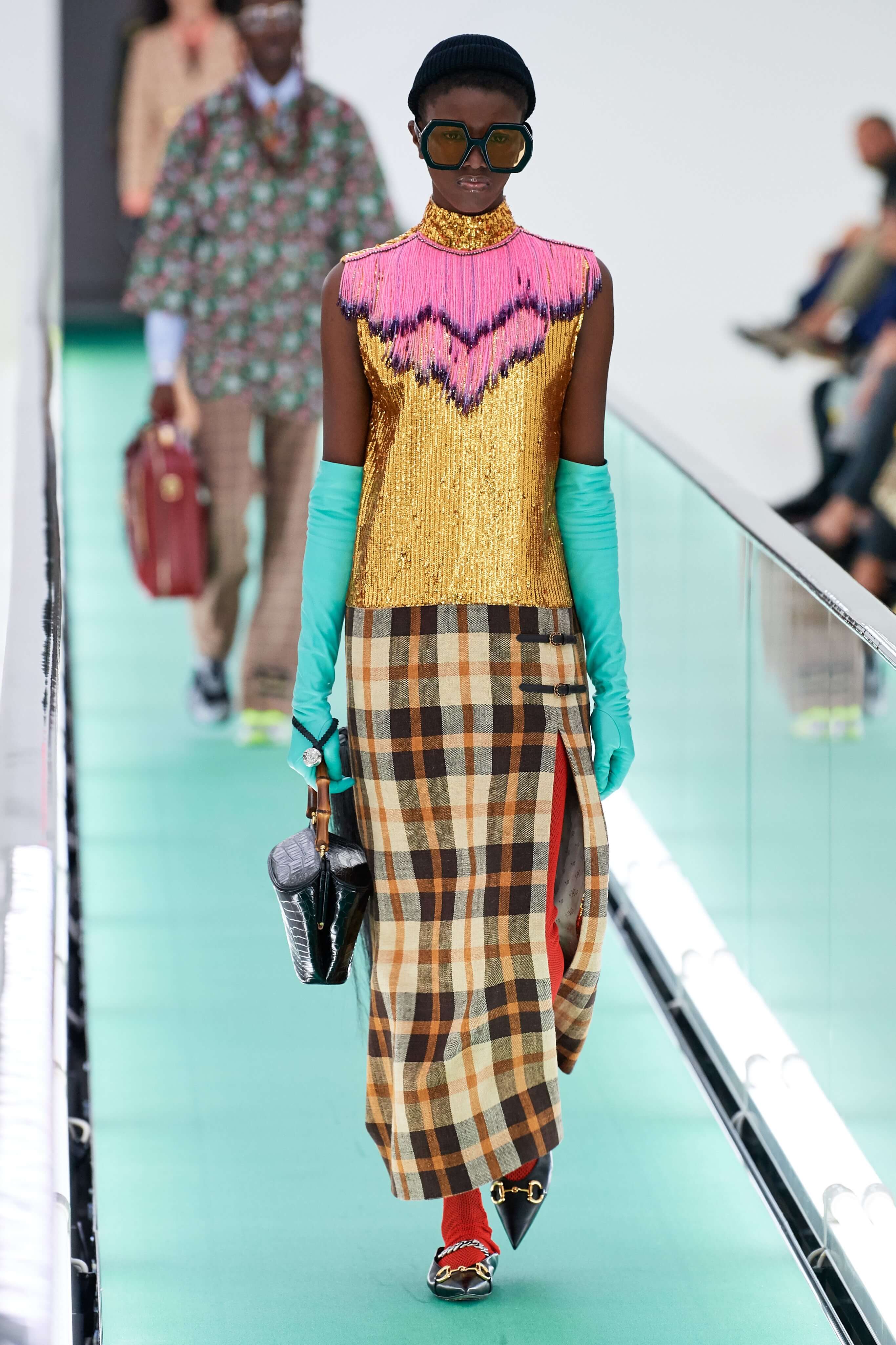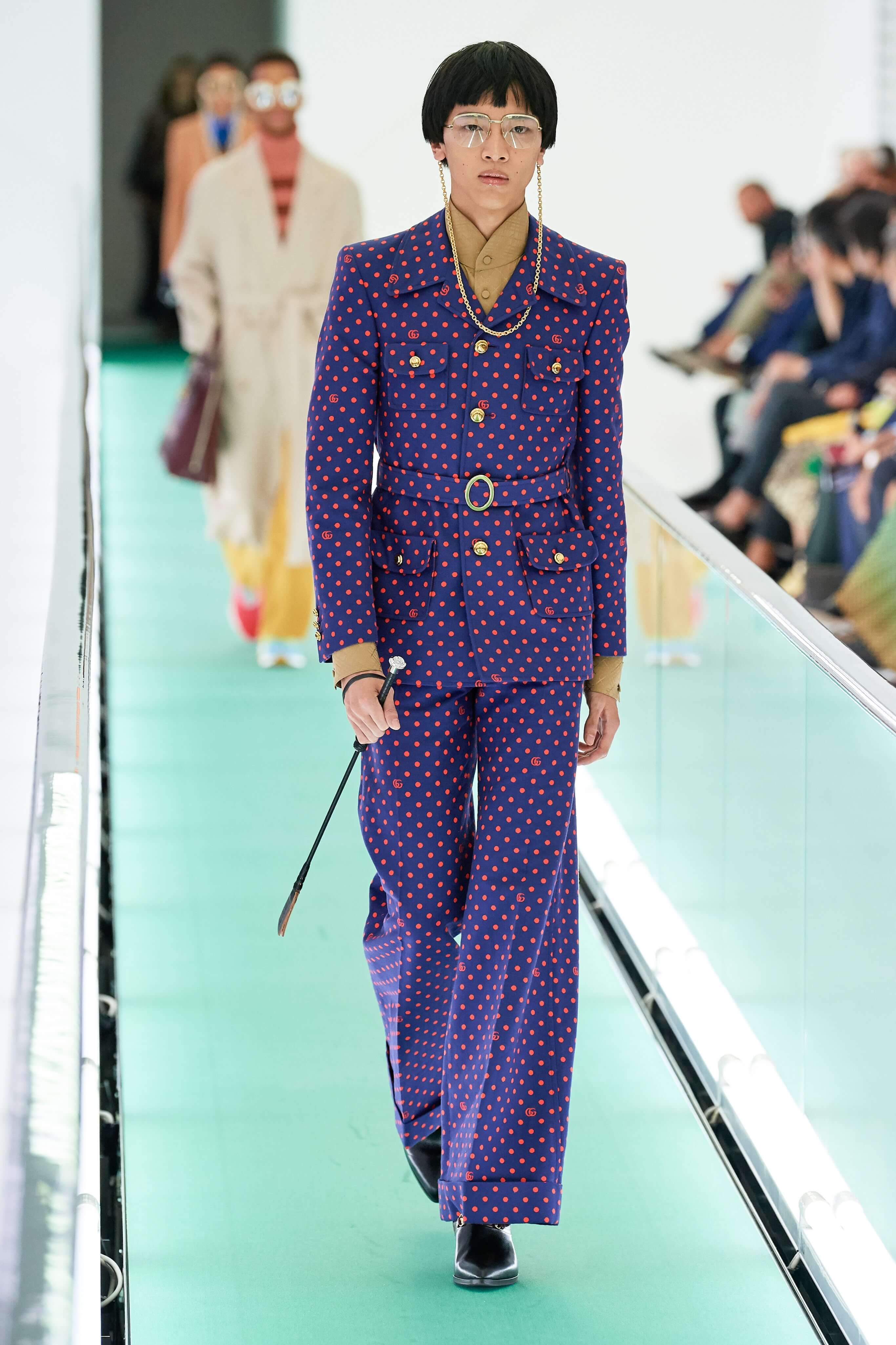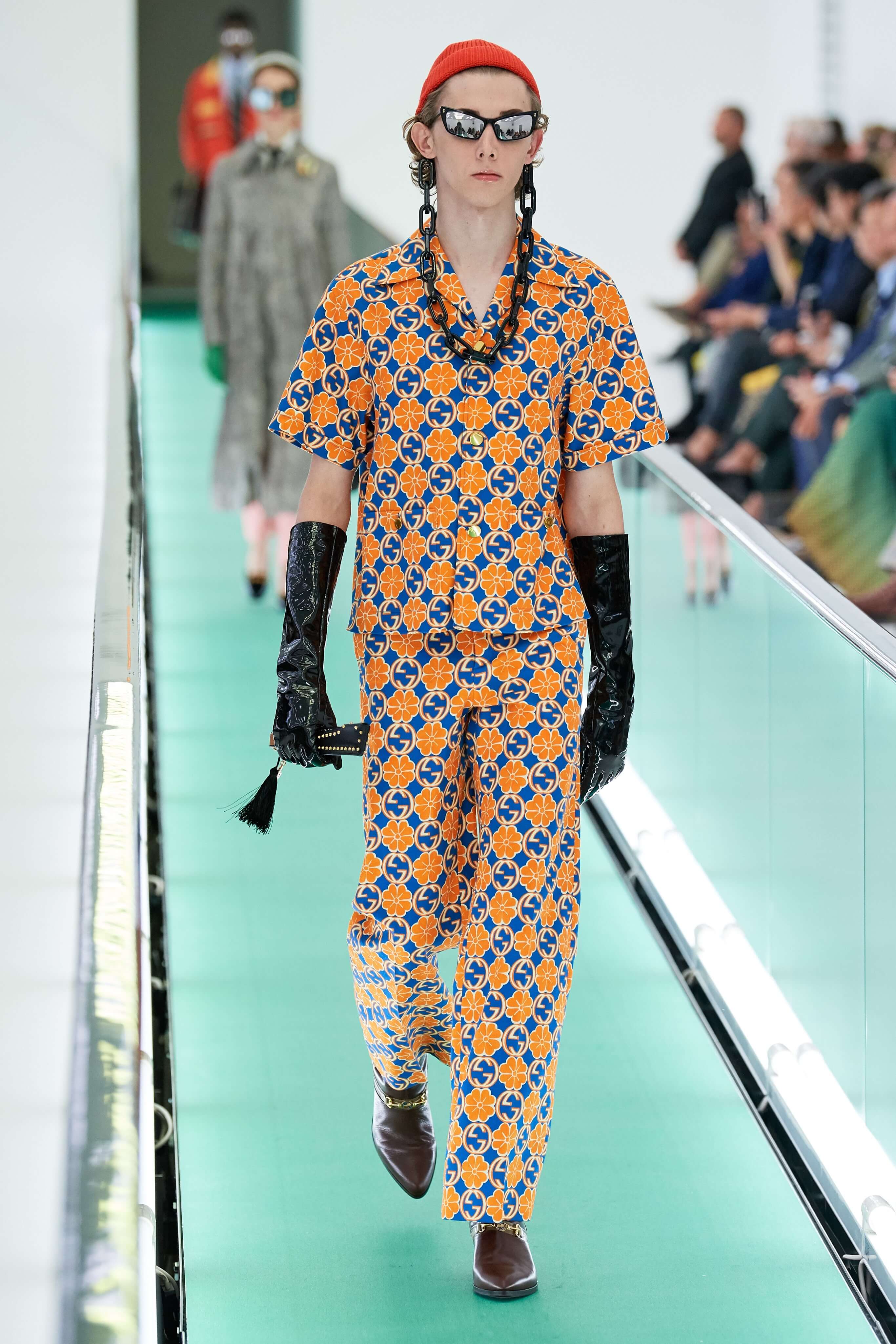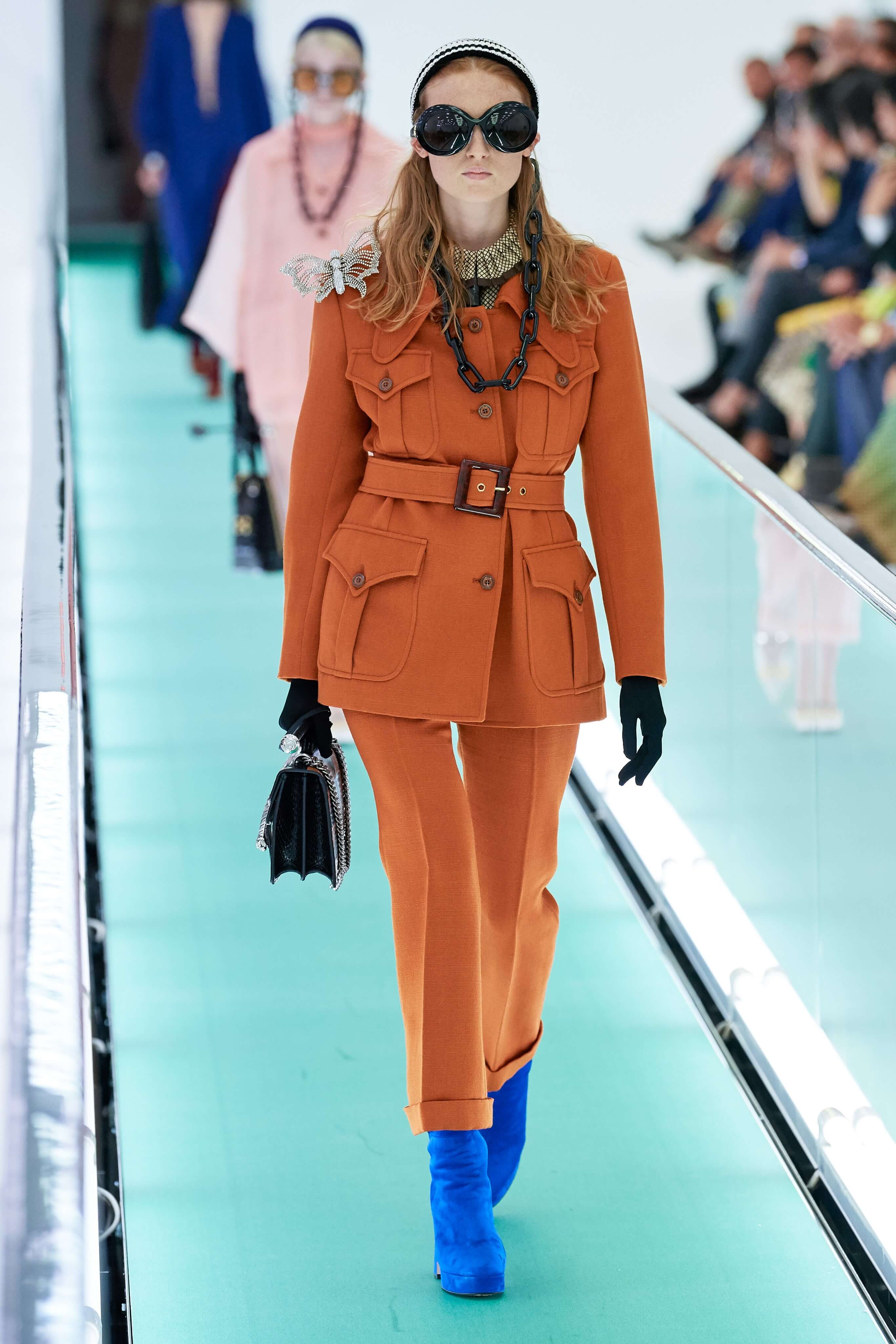 Однако на смену людям в белом на дорожку вышли модели в образах, провозглашающих свободную жизнь в обществе, лишенном предрассудков и навязанных постулатов. Здесь уже были и горячо любимые Микеле 70-е, и сексуальные готические платья, и будто срисованные с нарядов Древнего Египта сарафаны в пол, и нежные прозрачные кружева и костюмы из розовой органзы. Мужские рубашки с острыми воротничками, разноцветные перчатки, надетые поверх ярких лонгслив-топов, и цветные колготки дополняли солнцезащитные очки самых разных форм — те, что украшали массивные пластиковые цепи, так же как и нормативные белые платья, ждём в фотоотчетах модников. Как это и бывает у Алессандро Микеле, в коллекции нашлось место и для фетишистских образов с алыми кружевами и латексом, и для щегольских брючных костюмов и богатых платьев в стиле богемного шика.