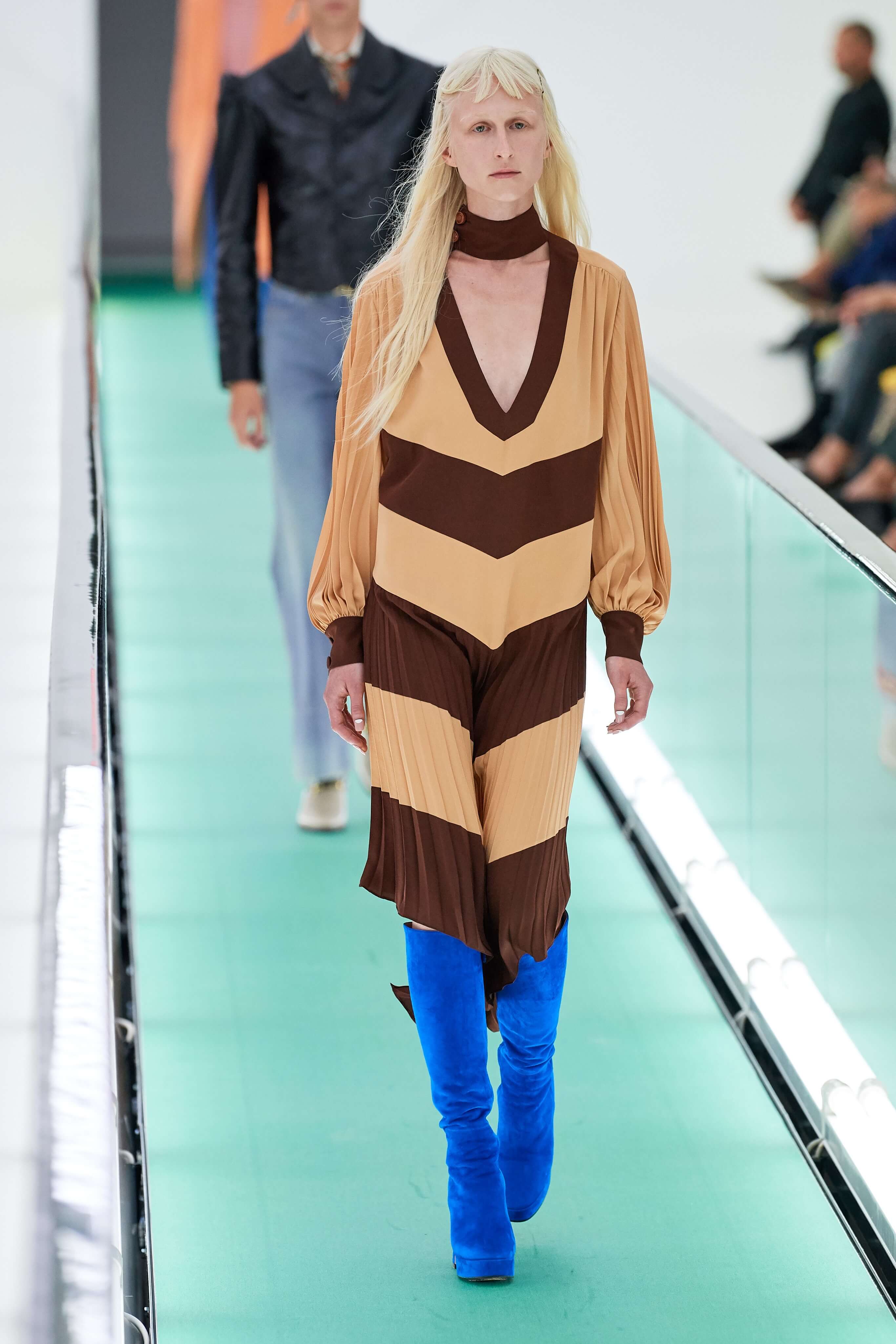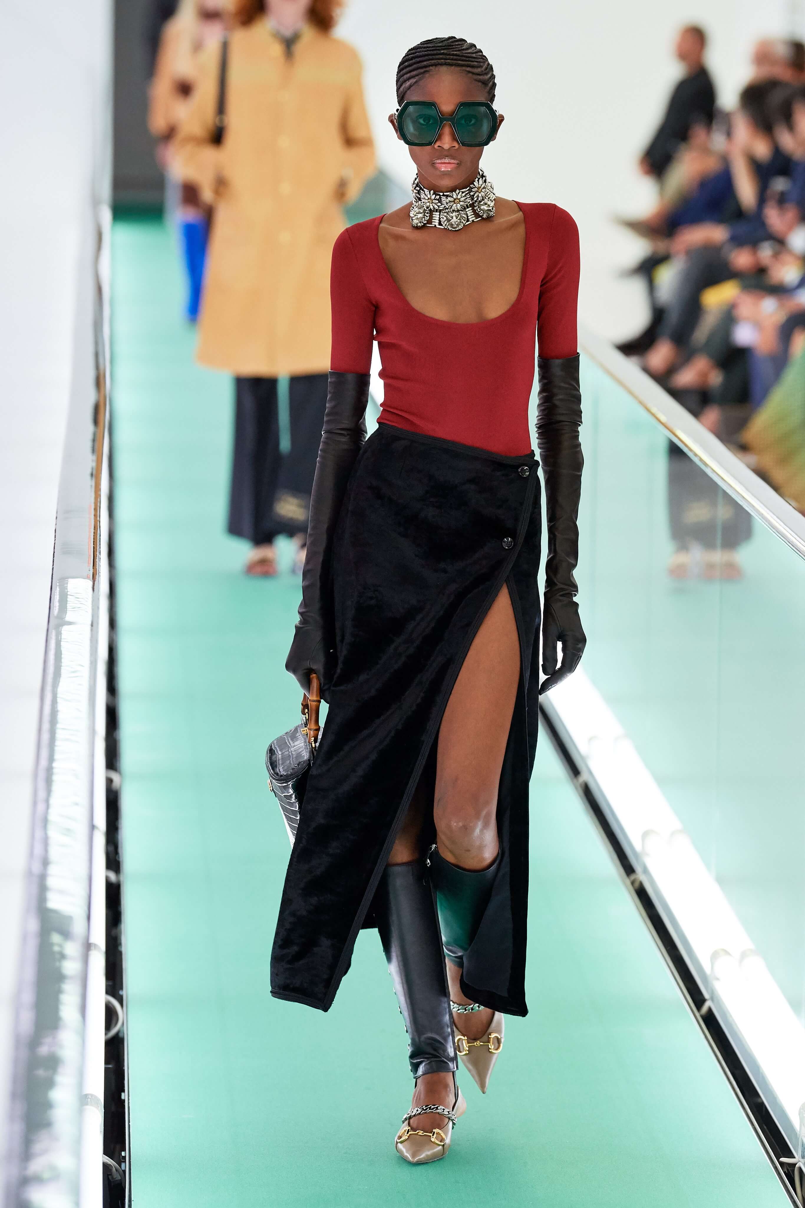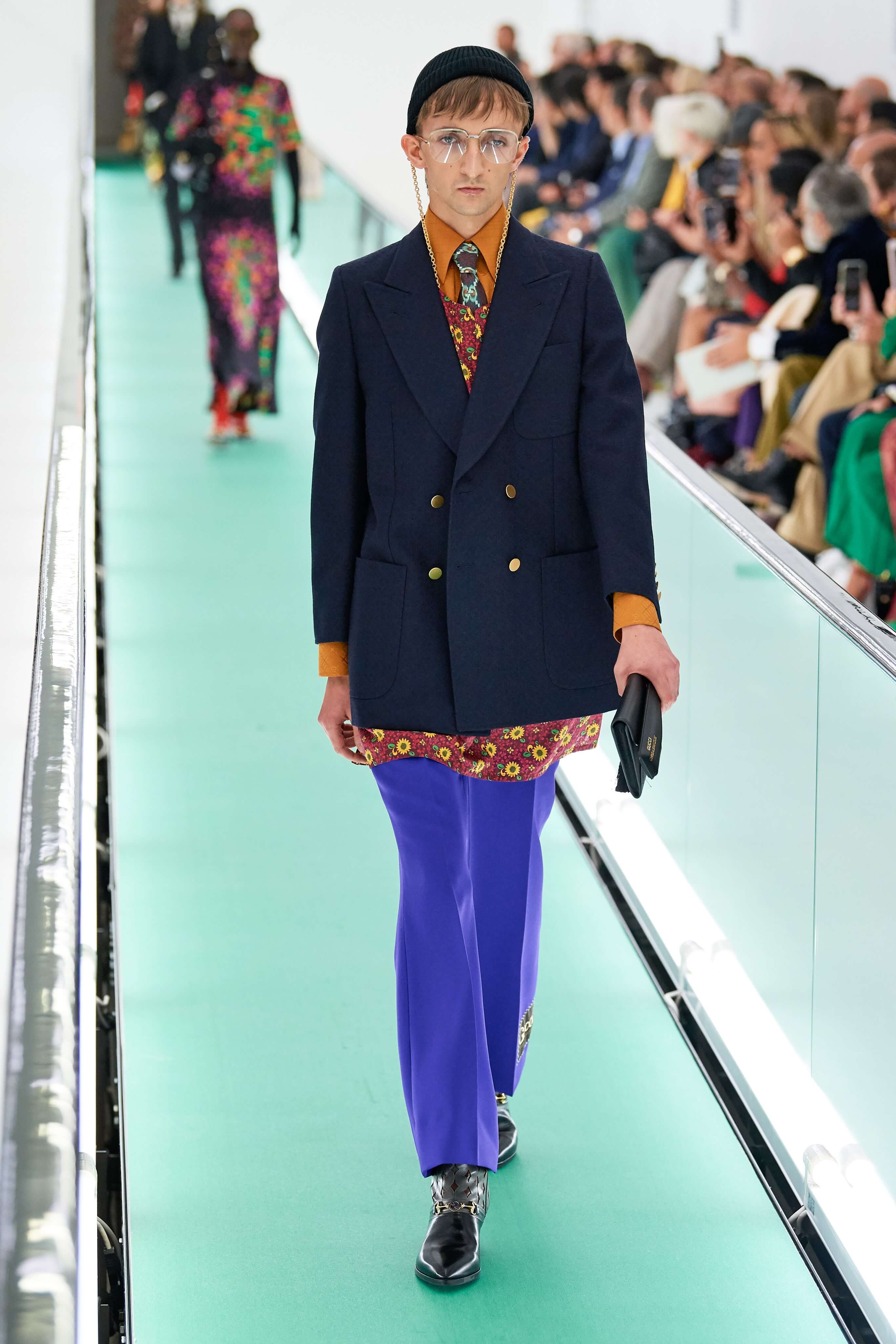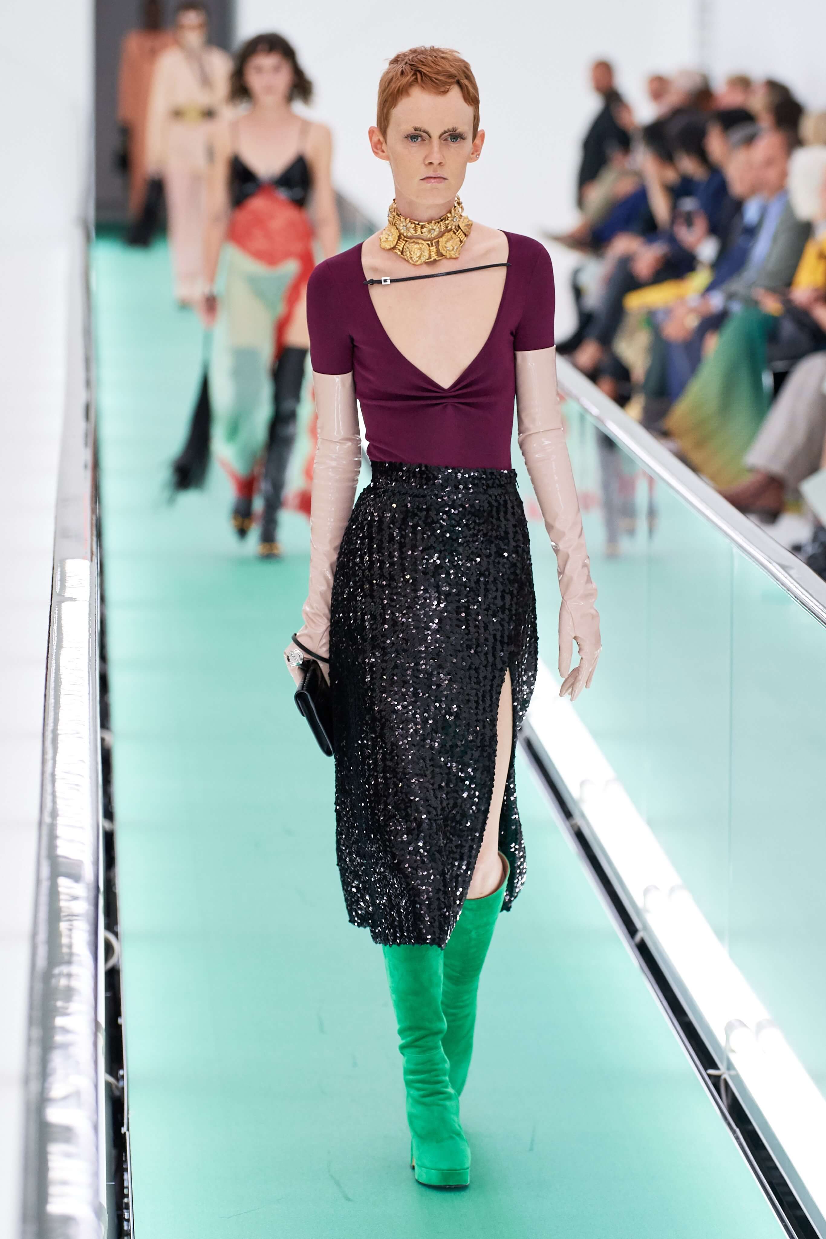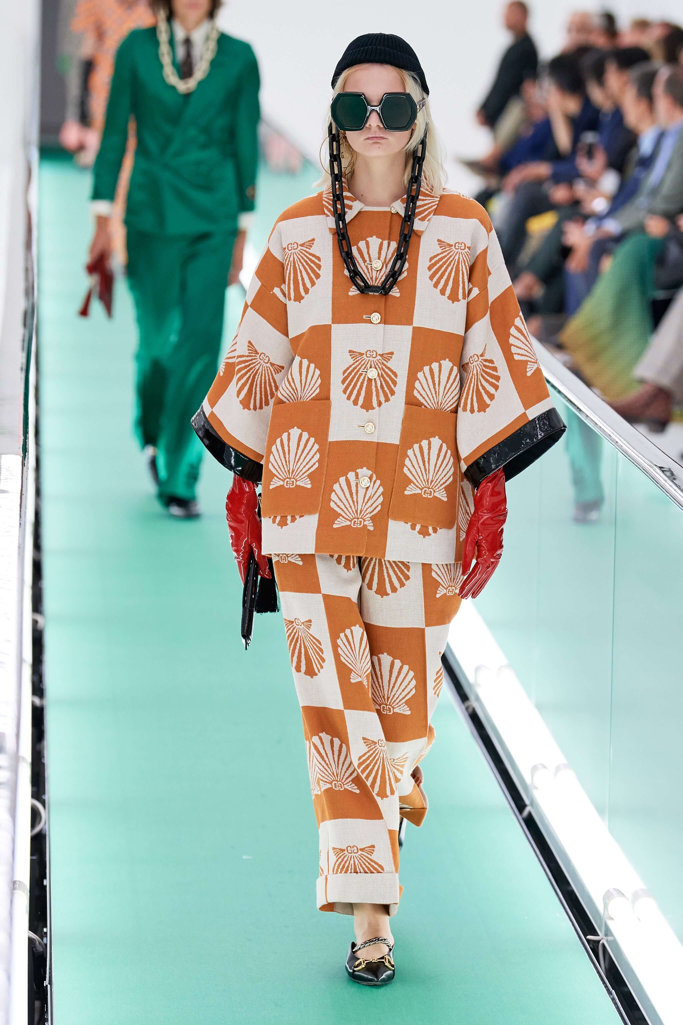Однако на смену людям в белом на дорожку вышли модели в образах, провозглашающих свободную жизнь в обществе, лишенном предрассудков и навязанных постулатов. Здесь уже были и горячо любимые Микеле 70-е, и сексуальные готические платья, и будто срисованные с нарядов Древнего Египта сарафаны в пол, и нежные прозрачные кружева и костюмы из розовой органзы. Мужские рубашки с острыми воротничками, разноцветные перчатки, надетые поверх ярких лонгслив-топов, и цветные колготки дополняли солнцезащитные очки самых разных форм — те, что украшали массивные пластиковые цепи, так же как и нормативные белые платья, ждём в фотоотчетах модников. Как это и бывает у Алессандро Микеле, в коллекции нашлось место и для фетишистских образов с алыми кружевами и латексом, и для щегольских брючных костюмов и богатых платьев в стиле богемного шика.