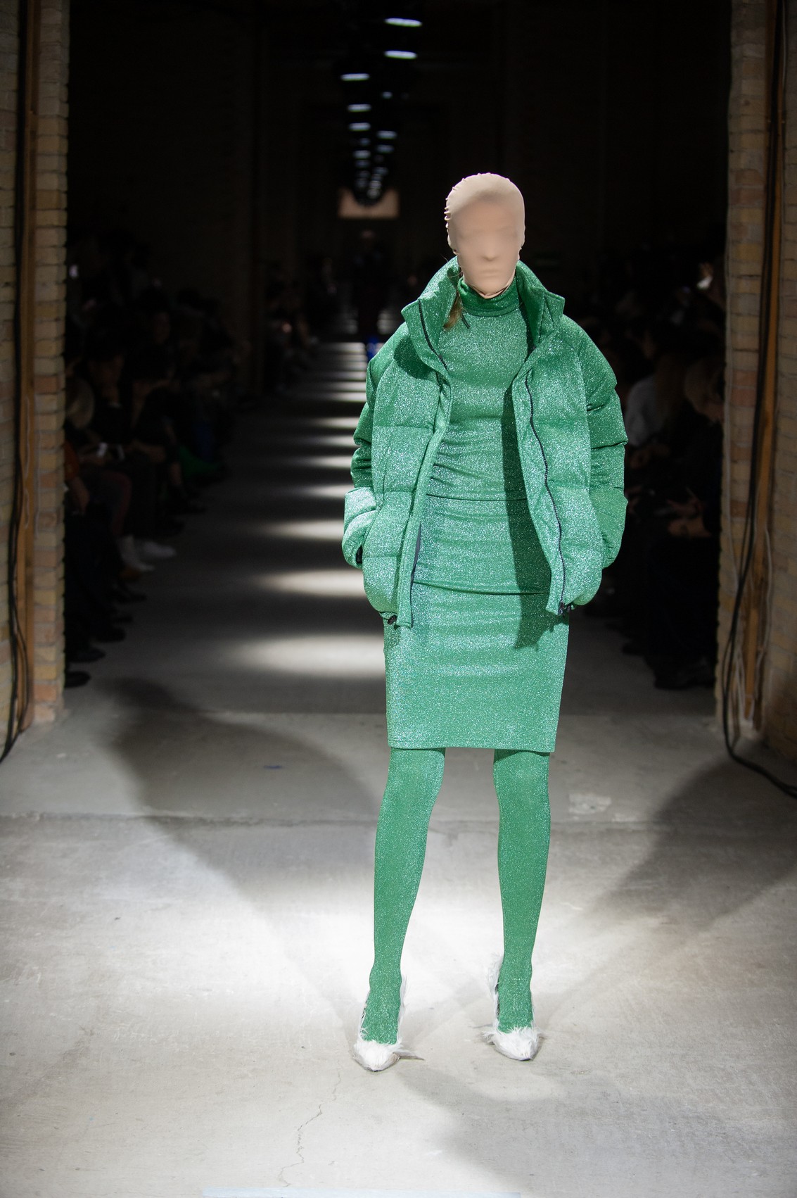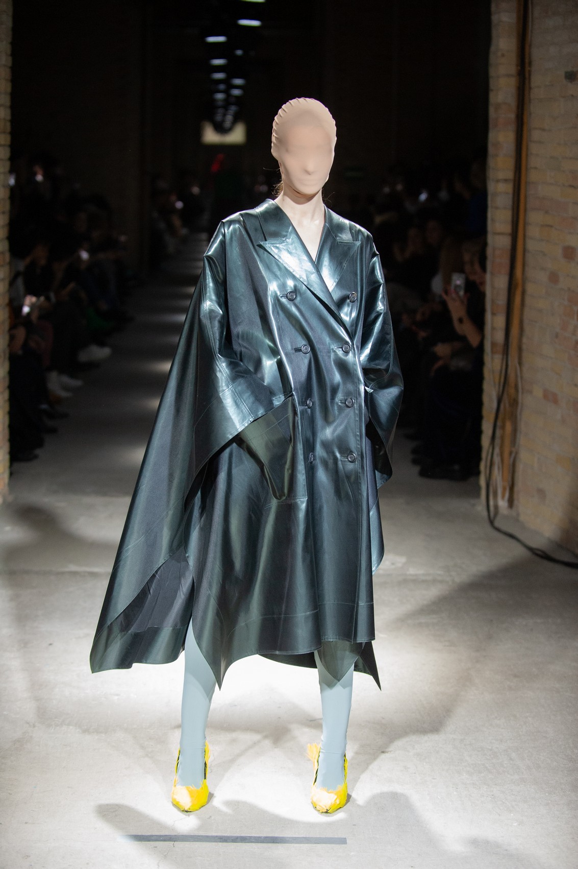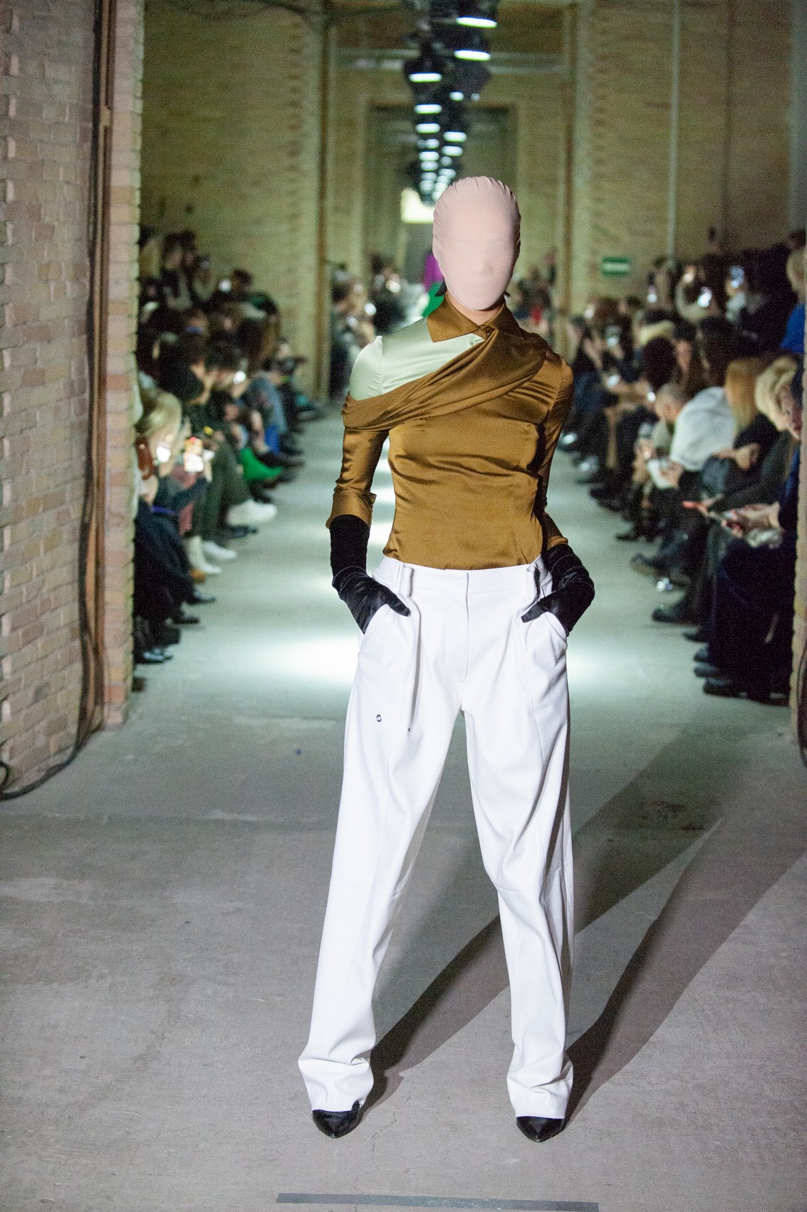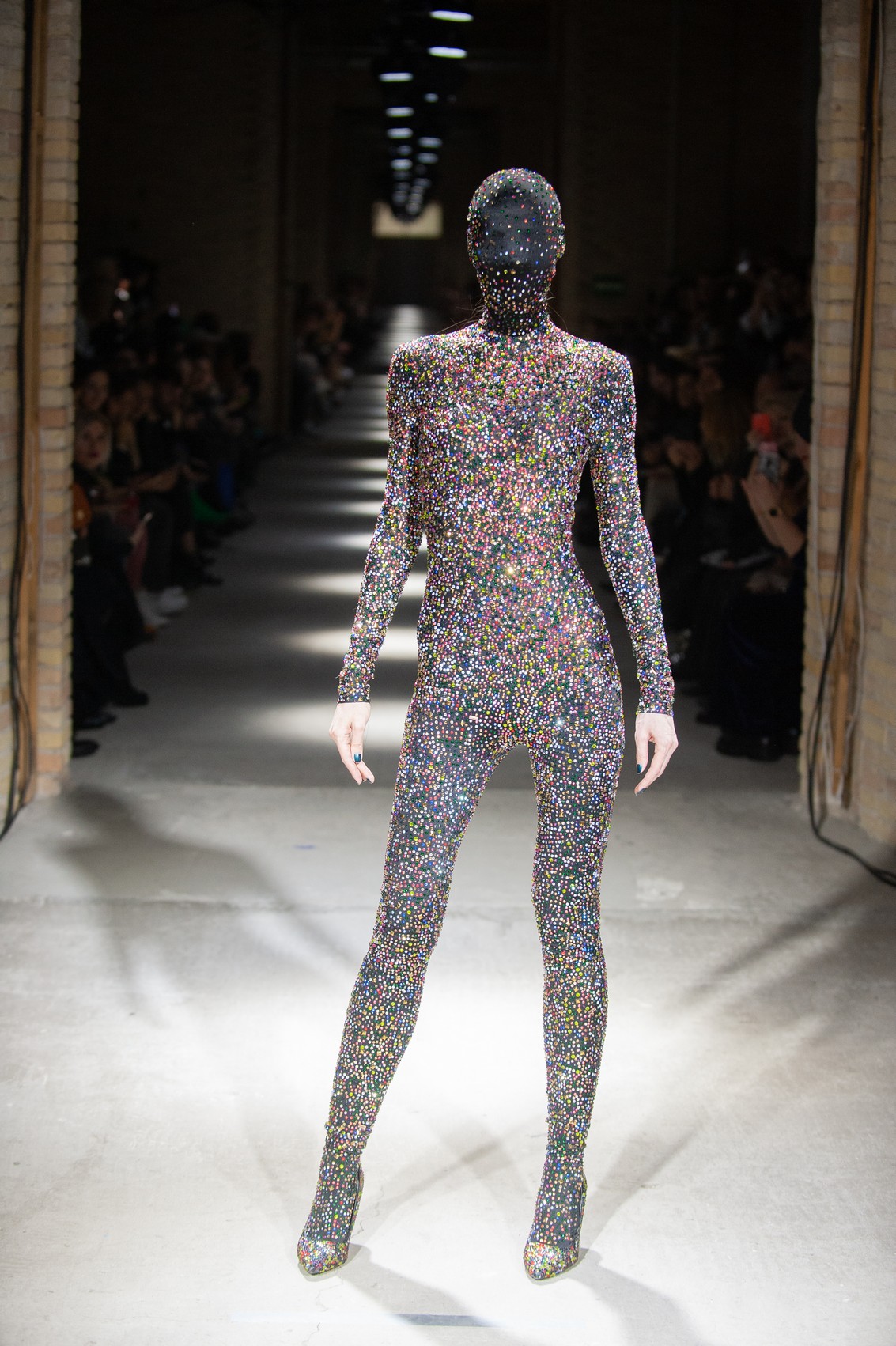 Модели в образах "безликих" шагали по подиуму в лодочках, покрытых перьями, плащах-кейпах и экошубах, а сюрпризом для поклонников бренда стал сверкающий монокостюм.