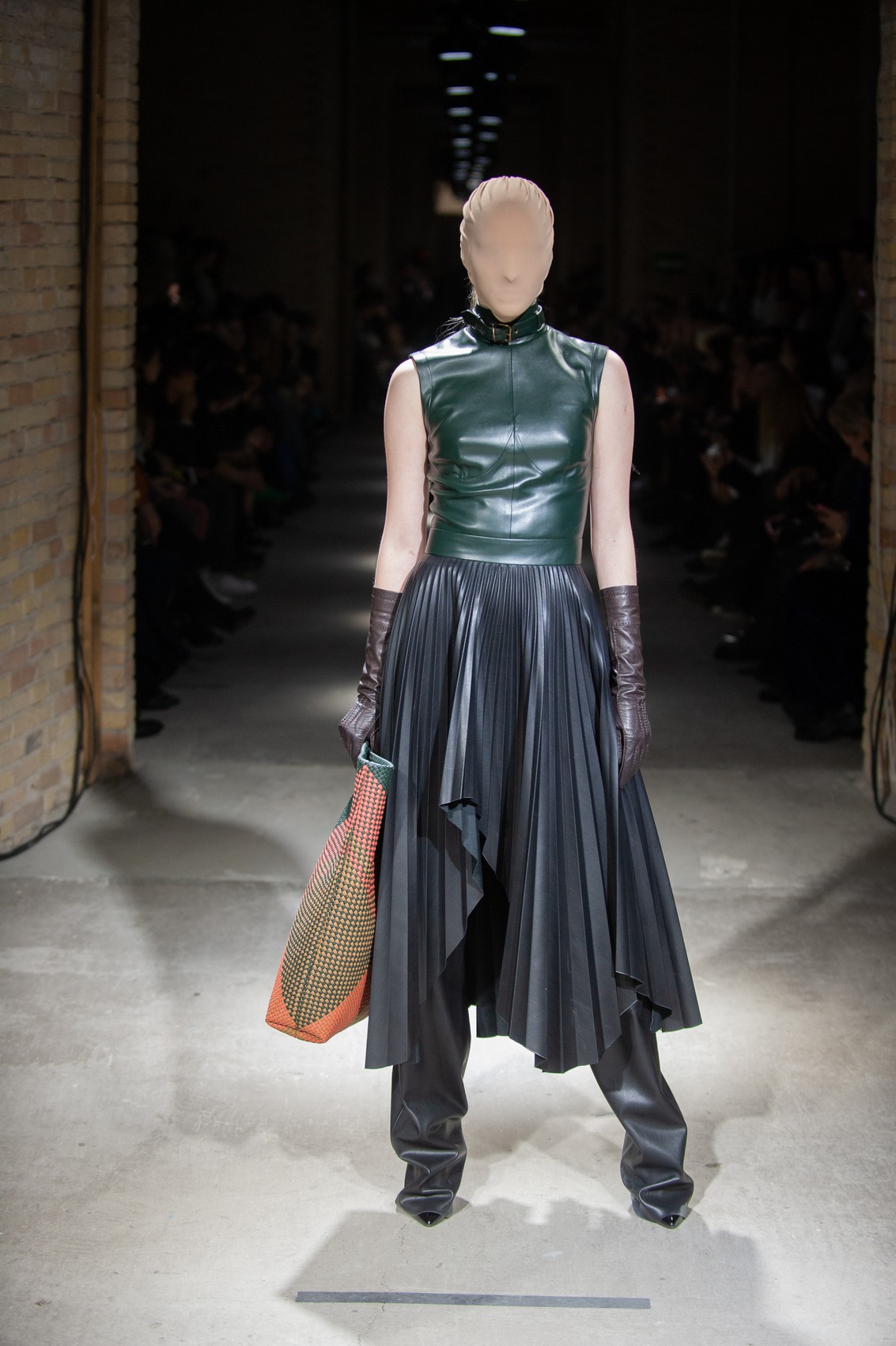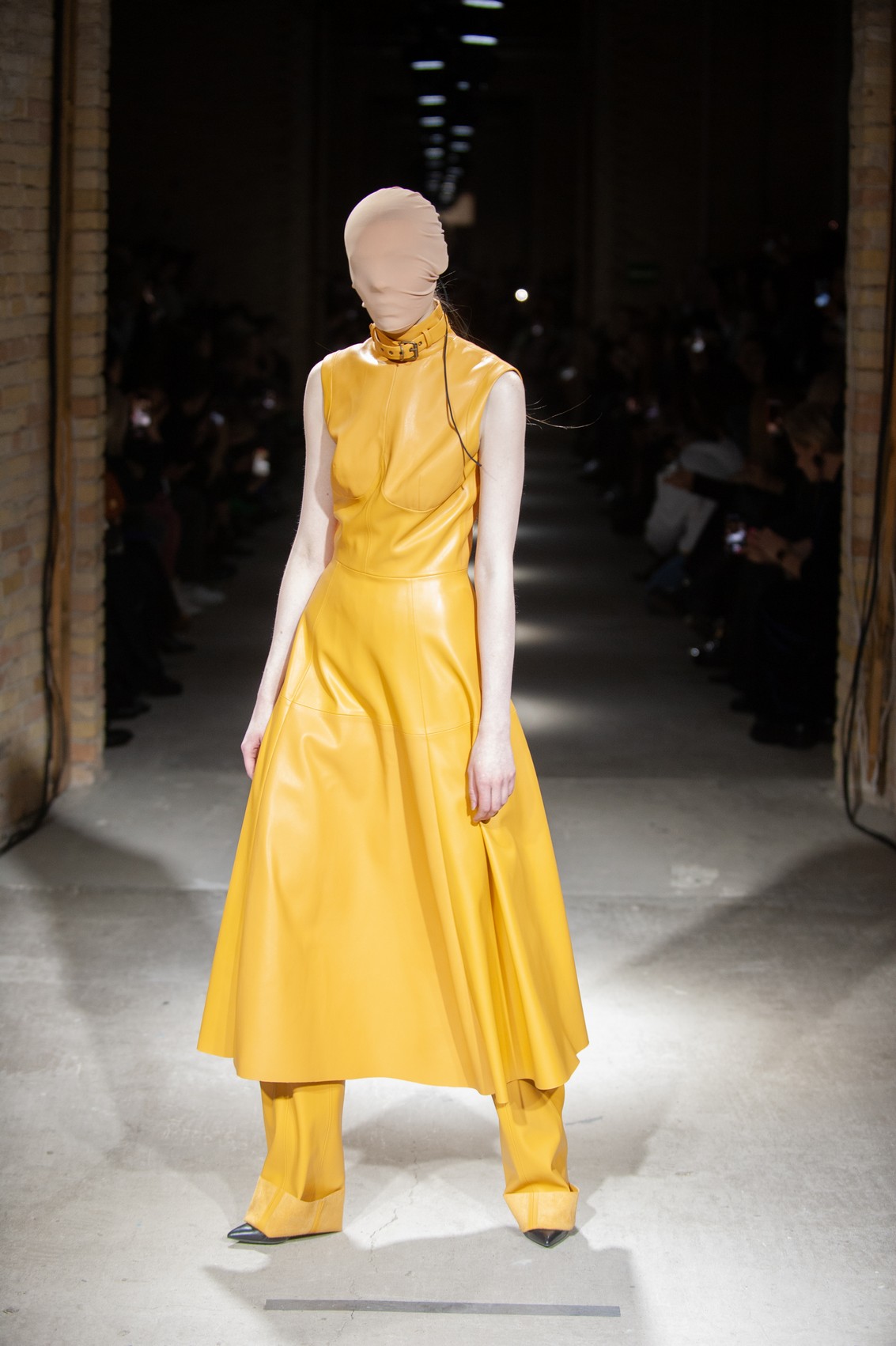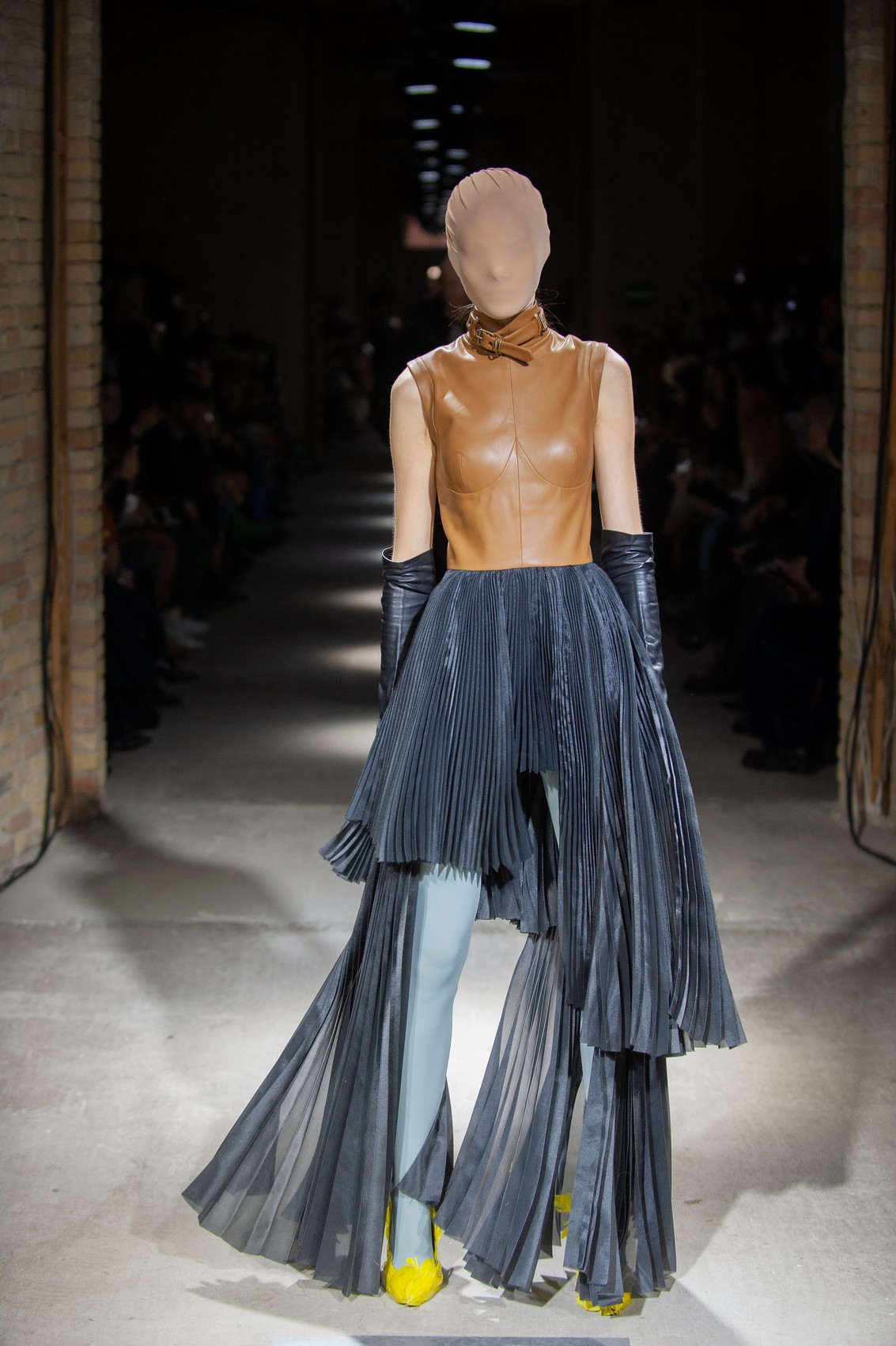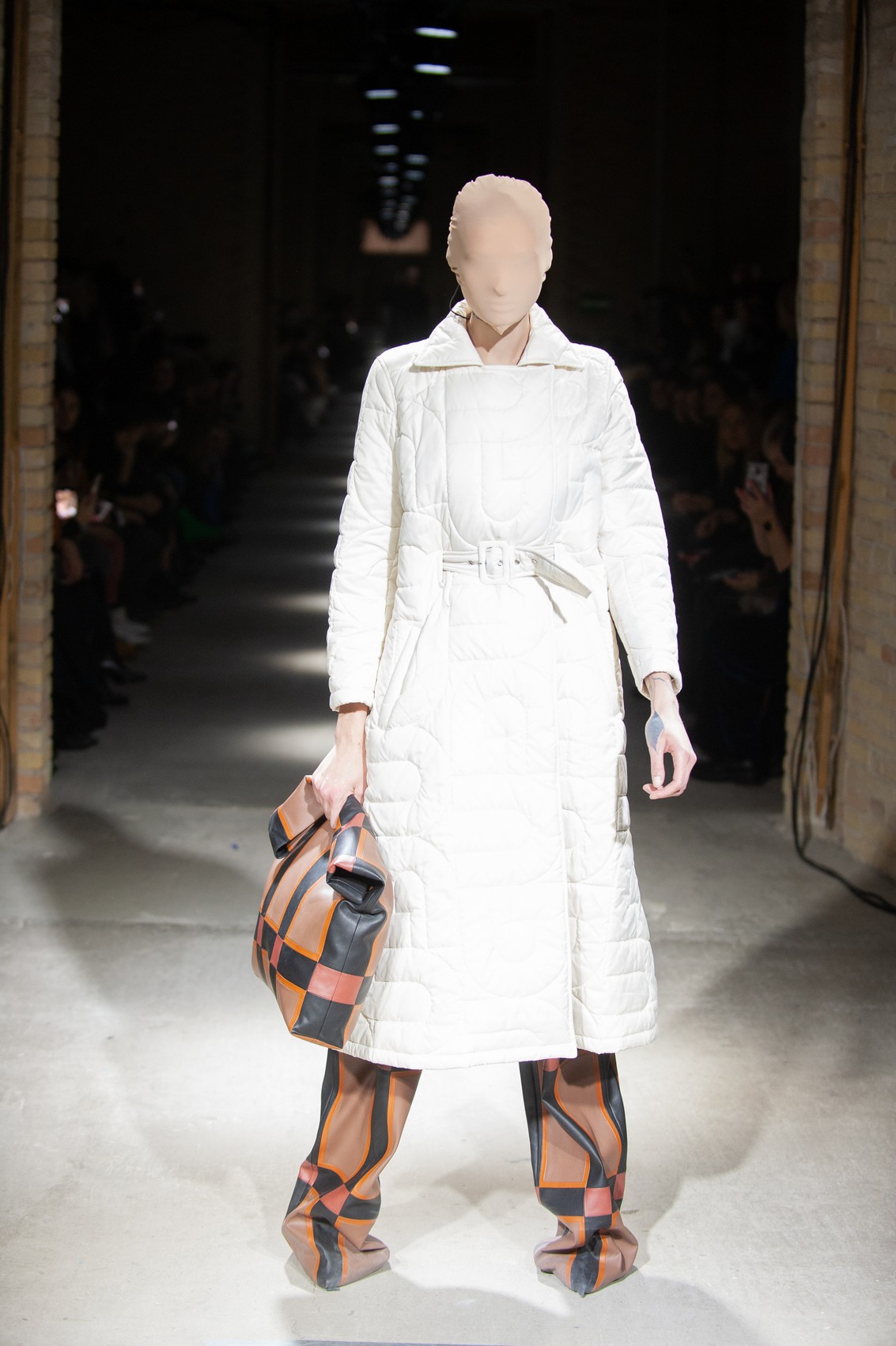Модели в образах "безликих" шагали по подиуму в лодочках, покрытых перьями, плащах-кейпах и экошубах, а сюрпризом для поклонников бренда стал сверкающий монокостюм.