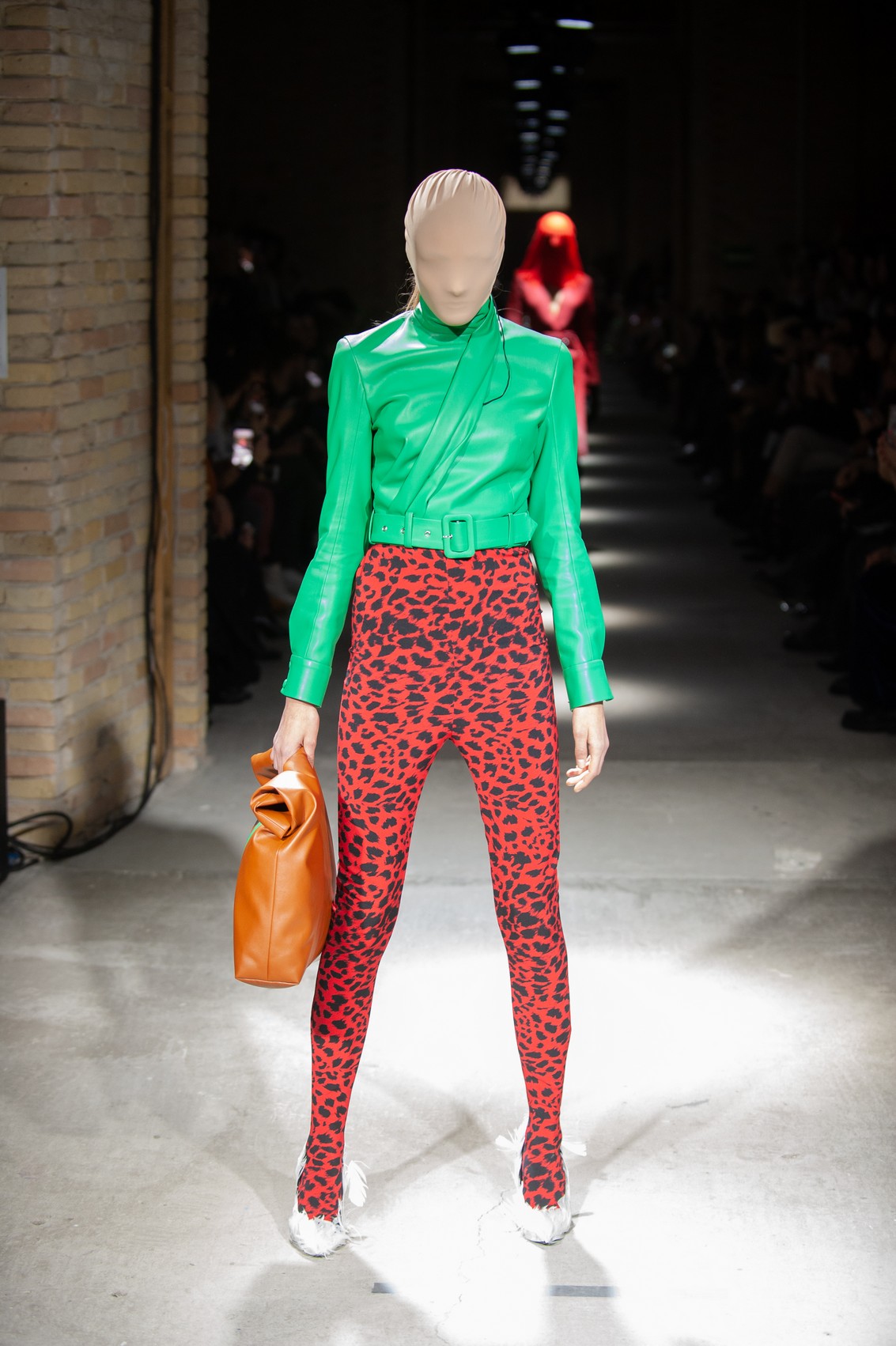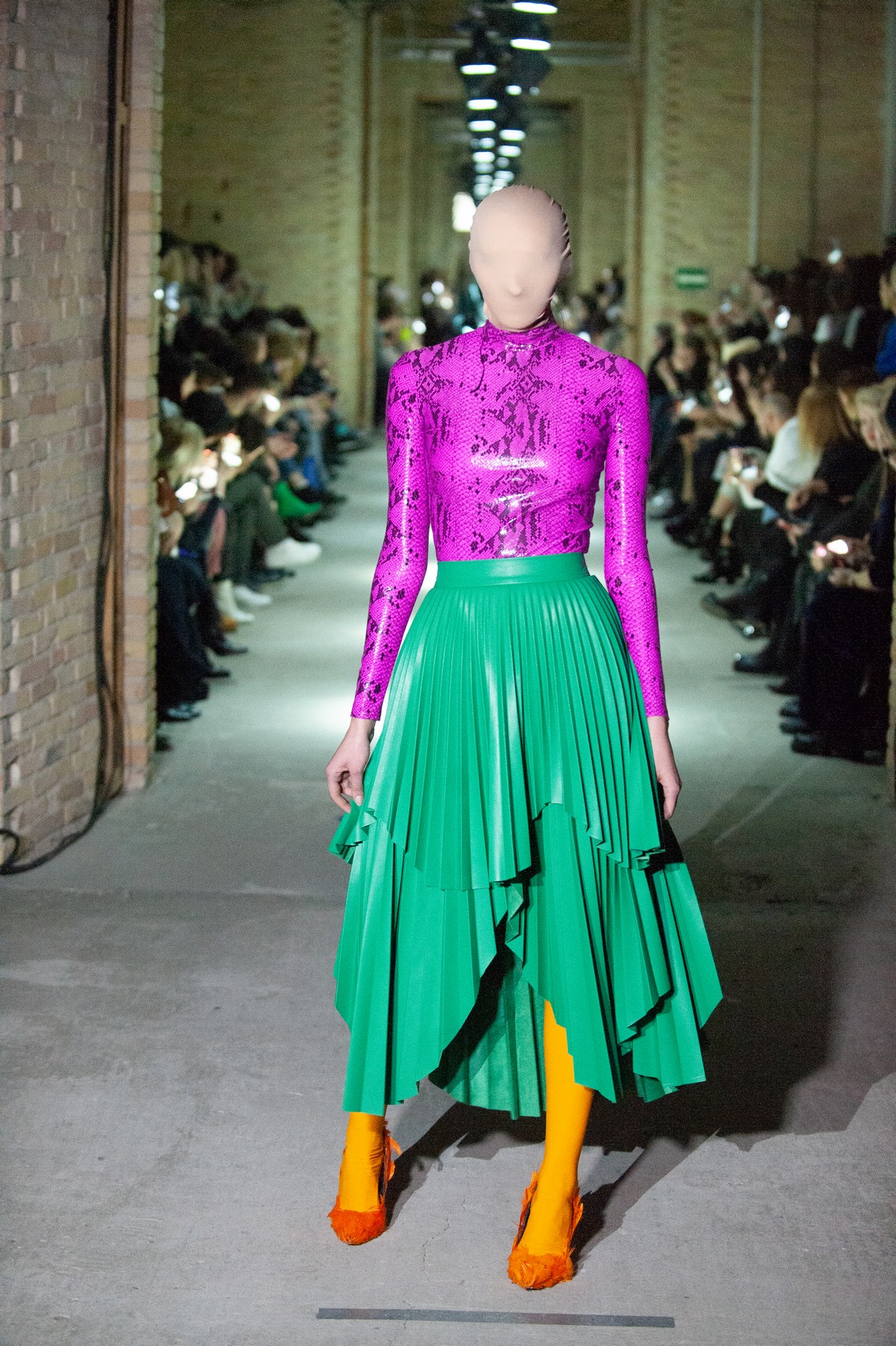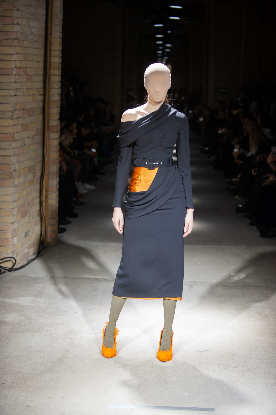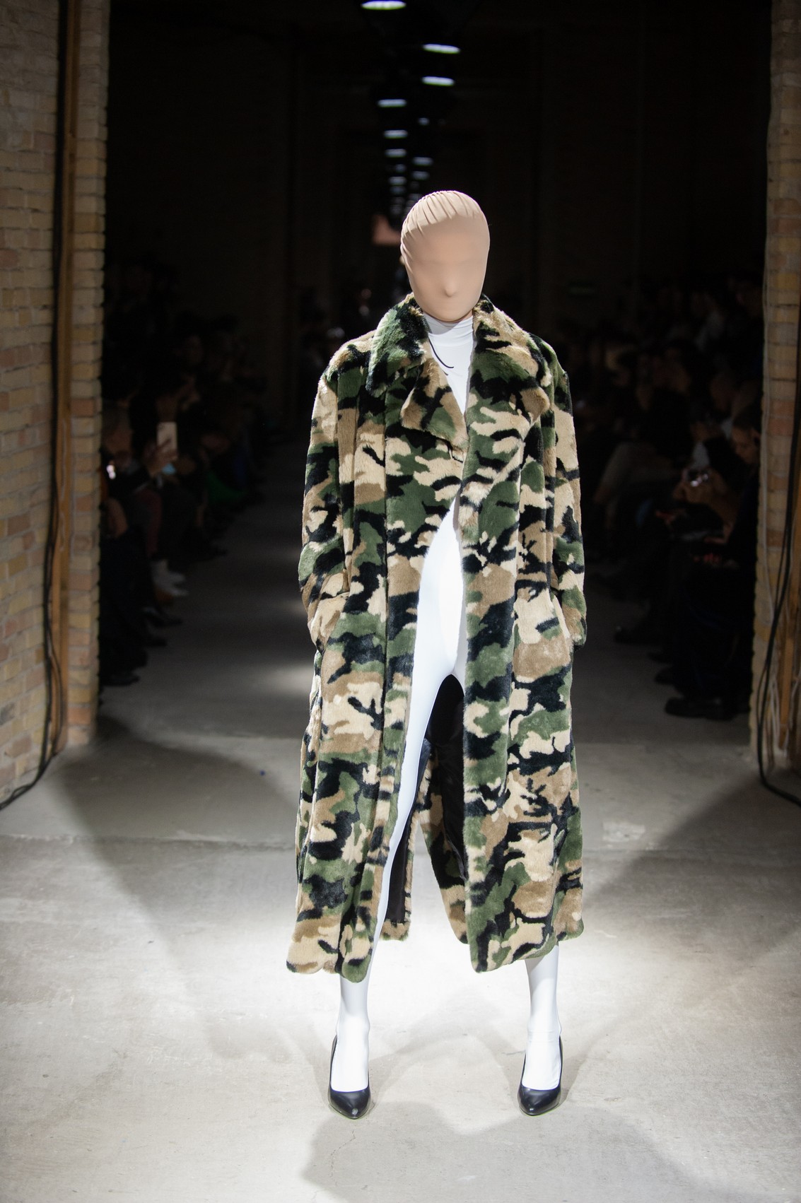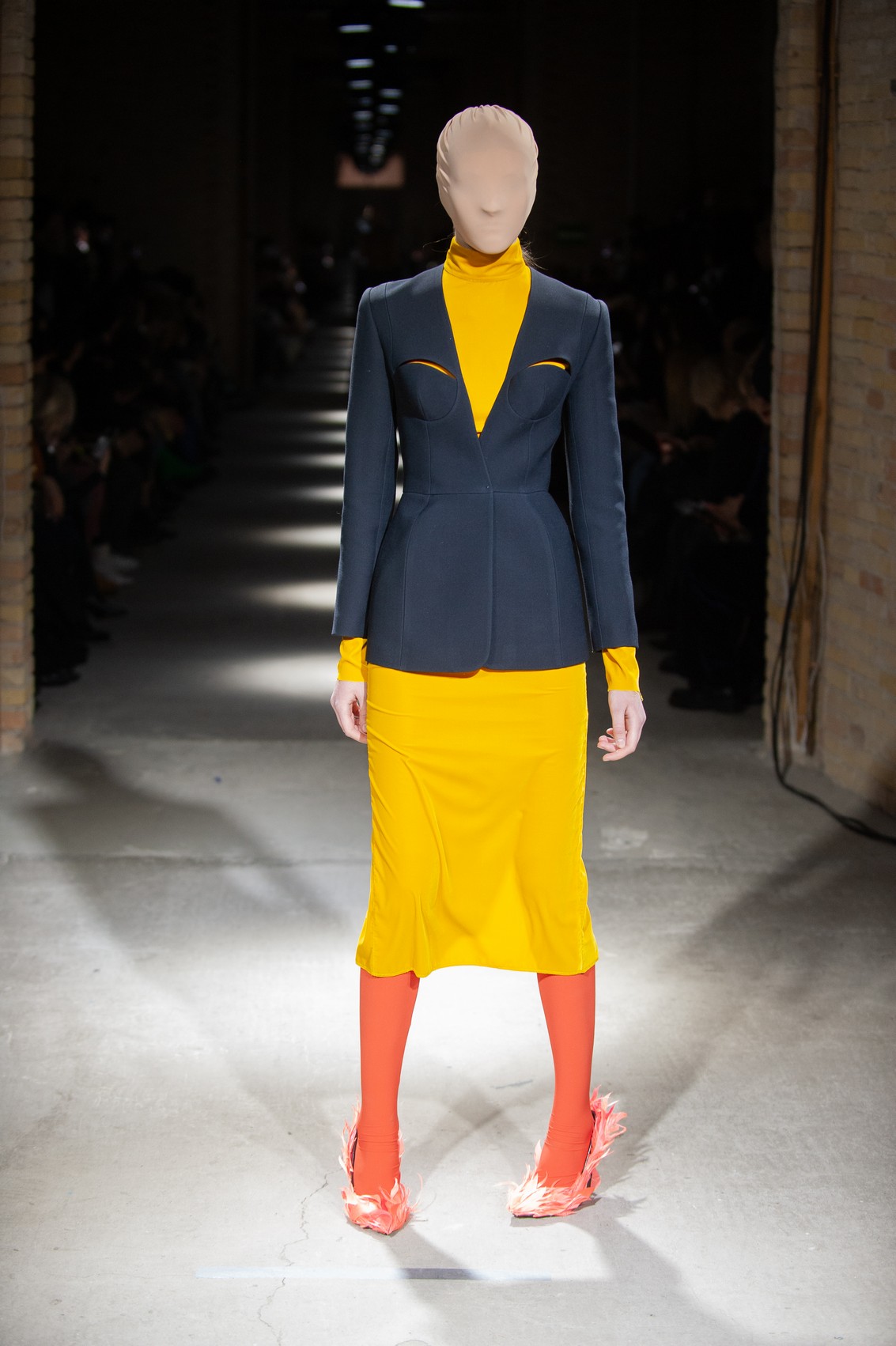 Модели в образах "безликих" шагали по подиуму в лодочках, покрытых перьями, плащах-кейпах и экошубах, а сюрпризом для поклонников бренда стал сверкающий монокостюм.