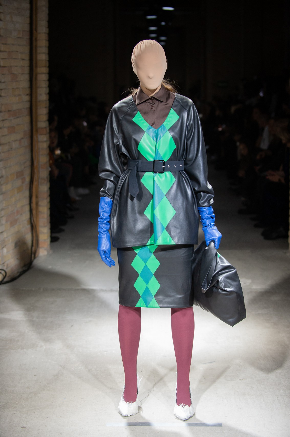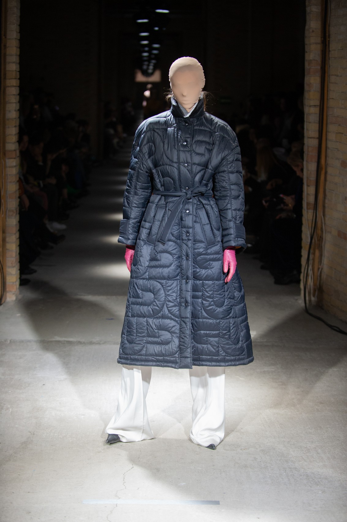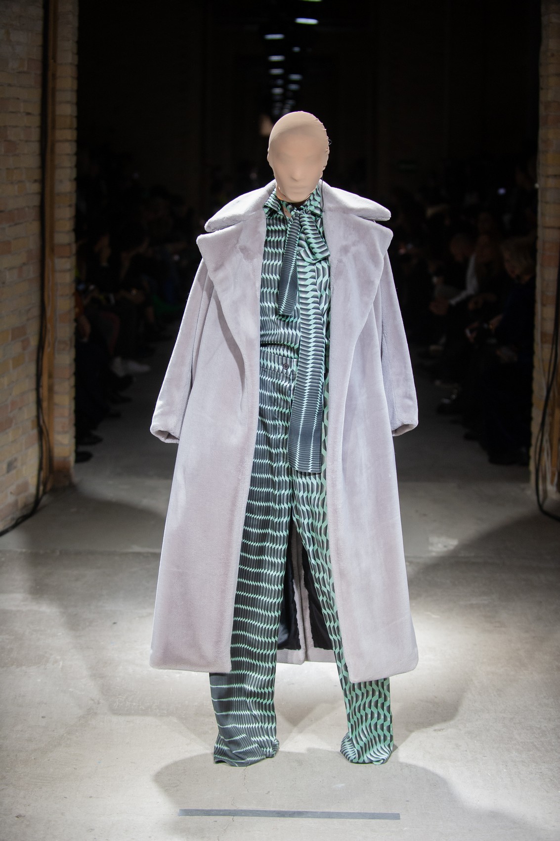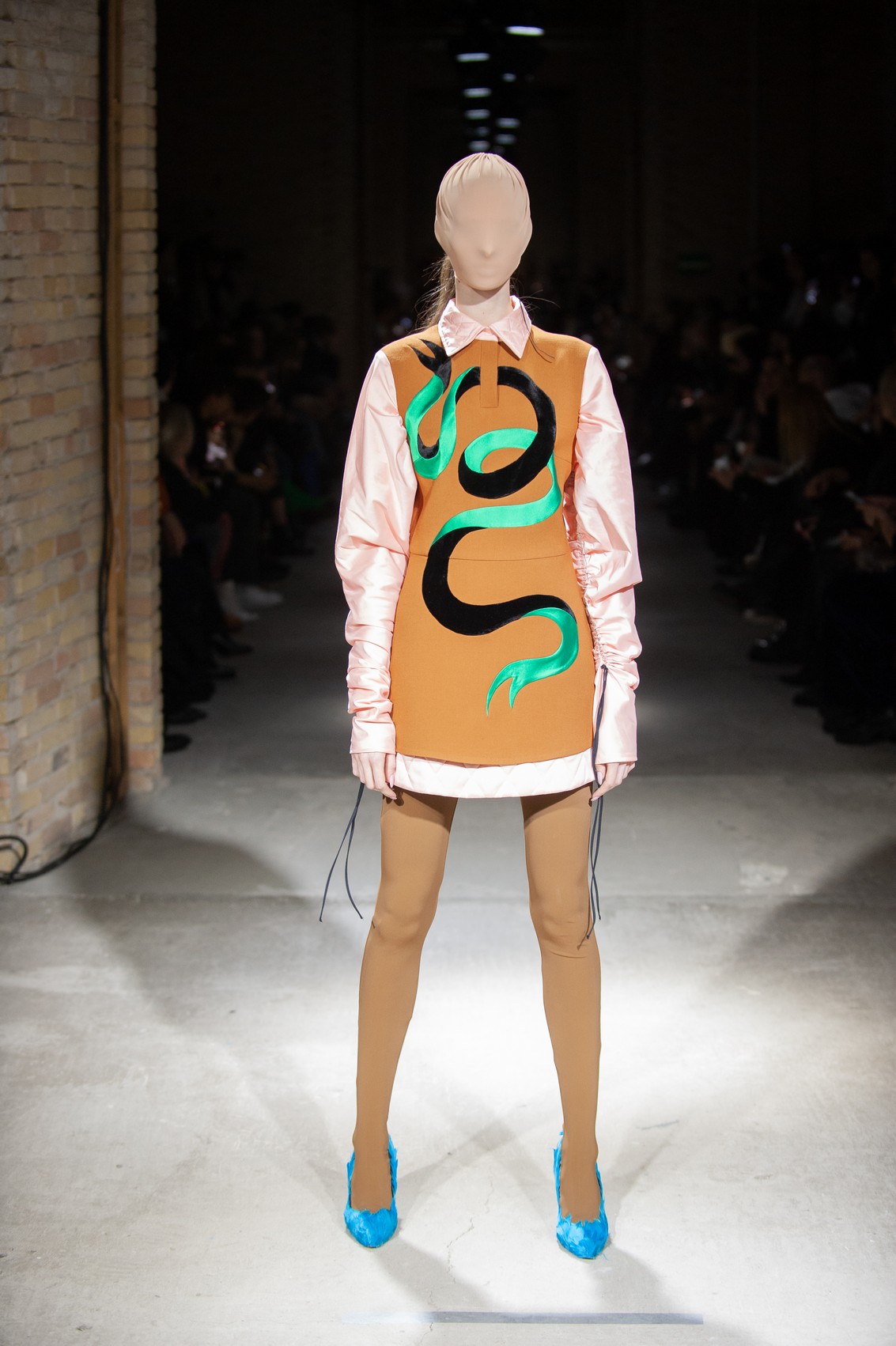 Модели в образах "безликих" шагали по подиуму в лодочках, покрытых перьями, плащах-кейпах и экошубах, а сюрпризом для поклонников бренда стал сверкающий монокостюм.