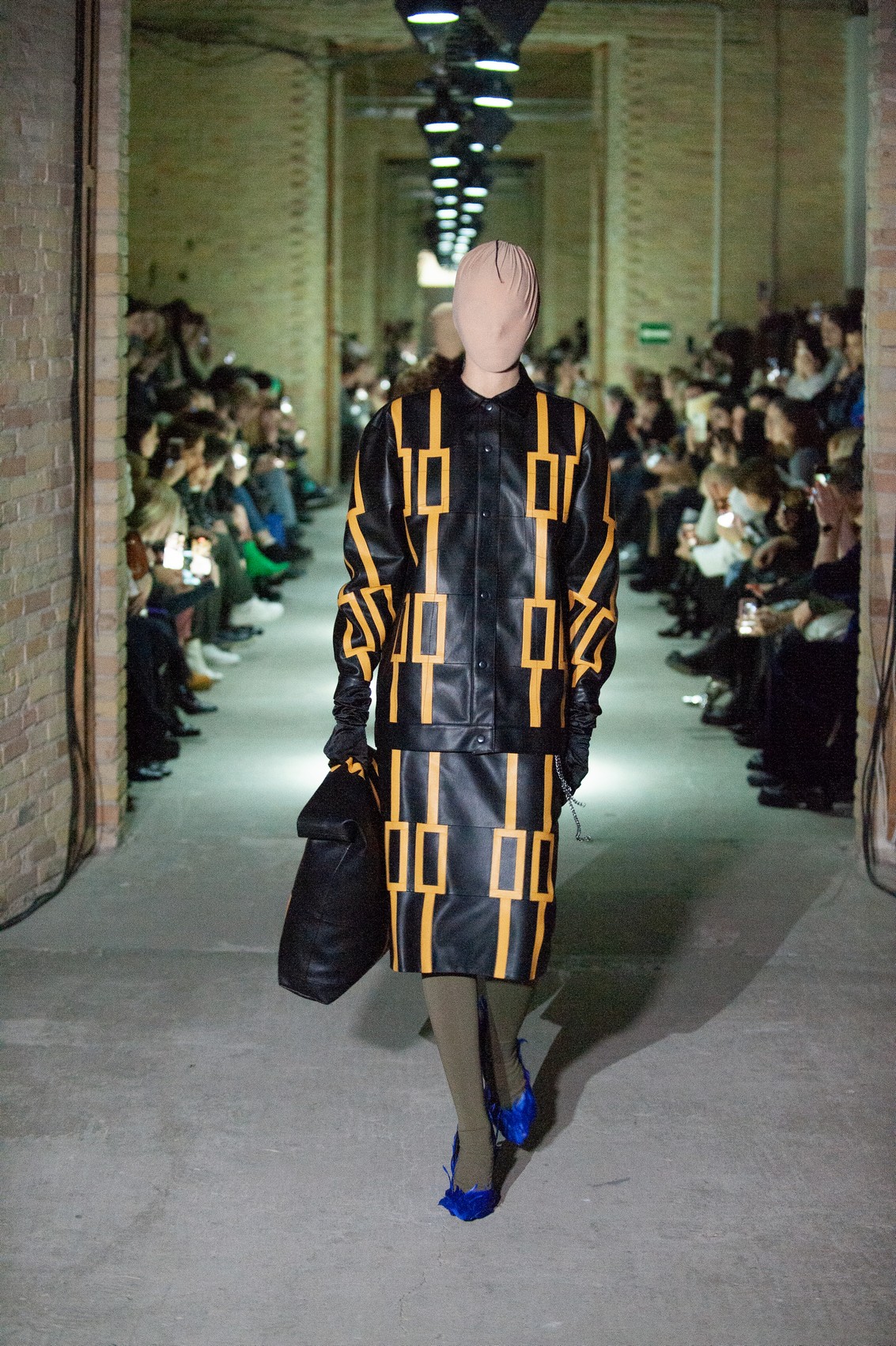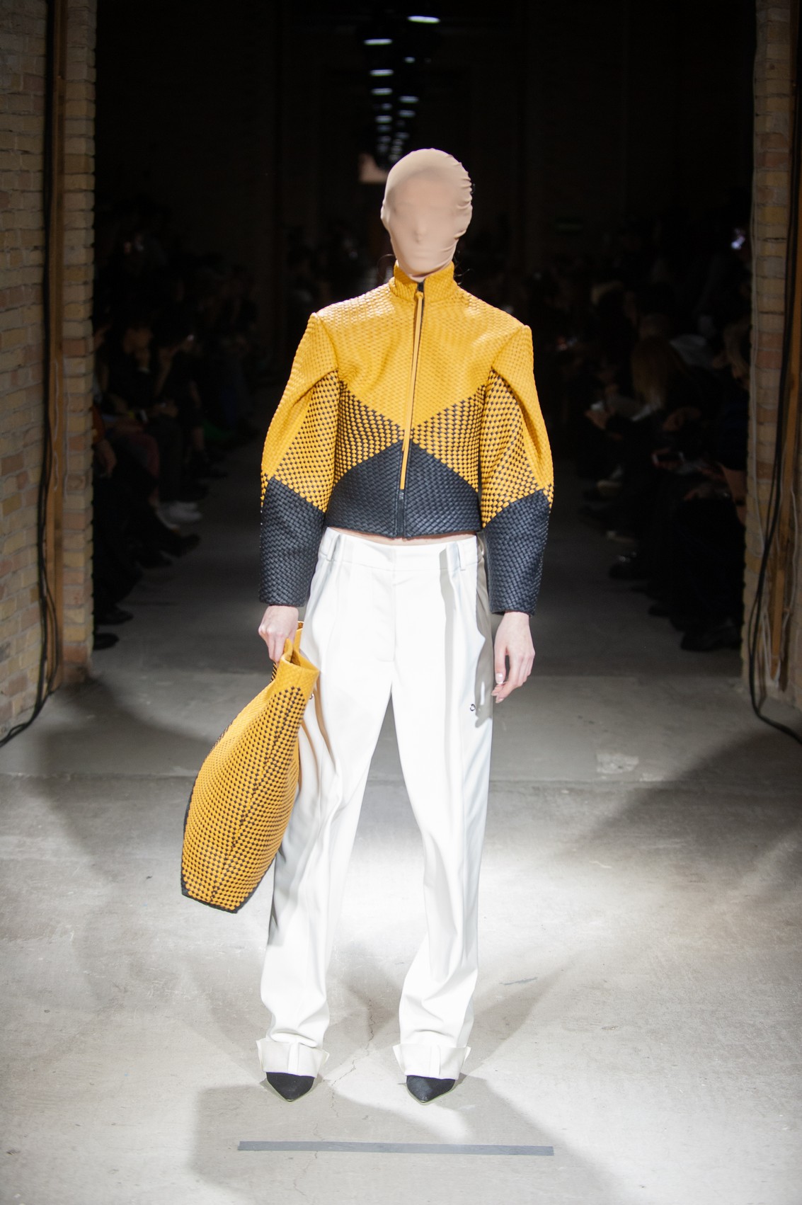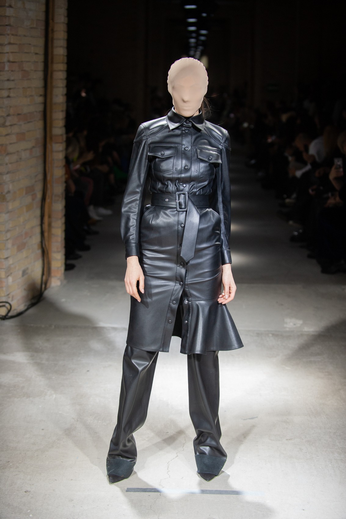 В первый день украинской Недели моды прошел показ бренда Gudu. Знаковые образы-тени дизайнера Лаши Мдинарадзе из осенне-зимней коллекции выдержаны в духе 70-80-х годов: кожаные платья и куртки-фраки с плиссированными оборками, милитаристские жакеты с накладными карманами, платья поверх брюк клеш и огромные плетеные сумки.
