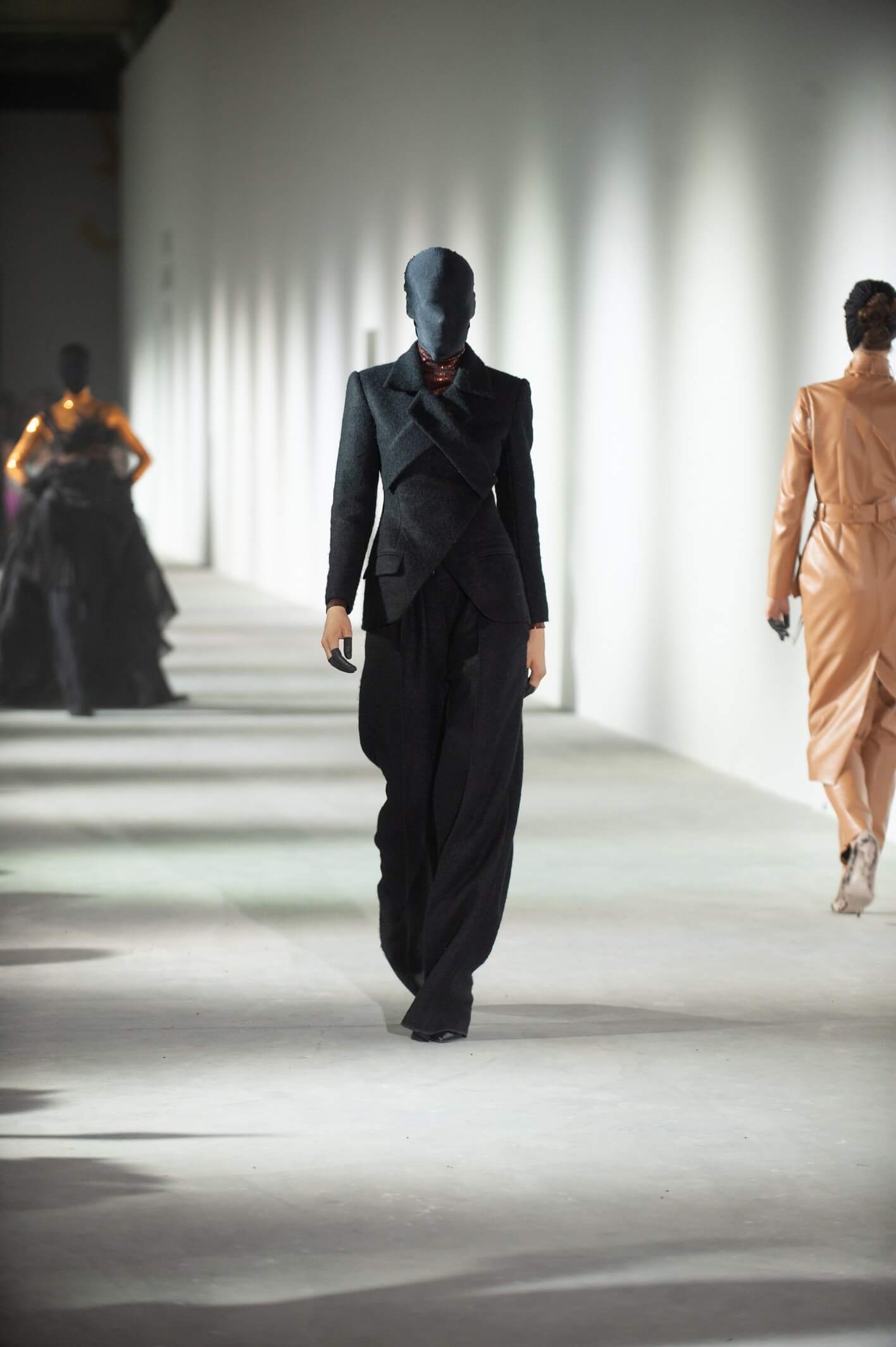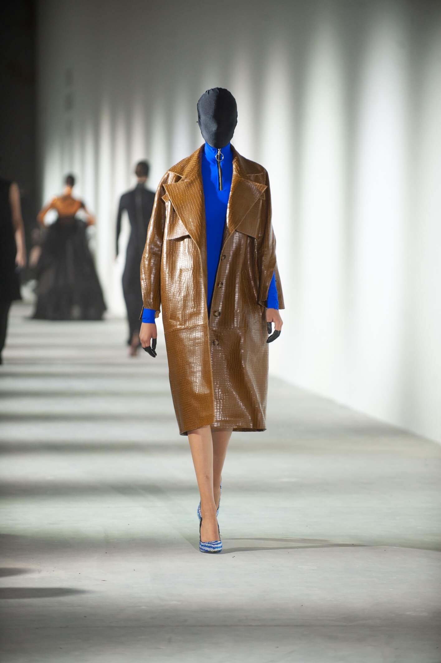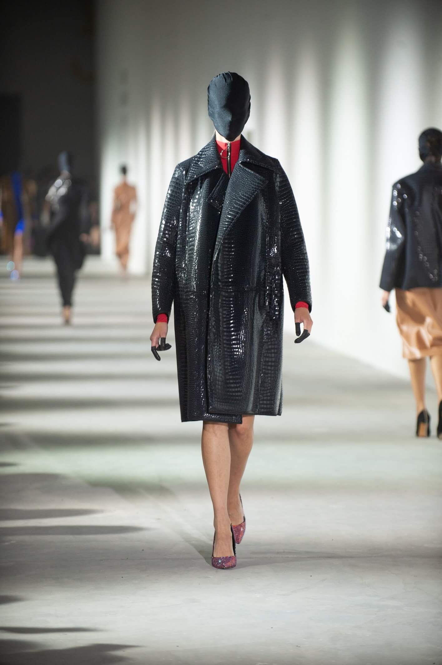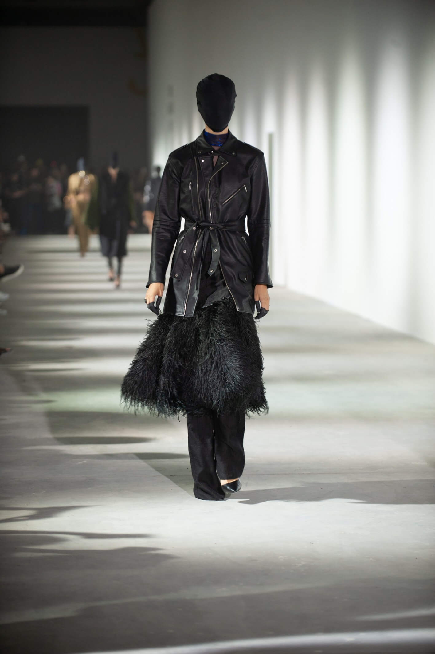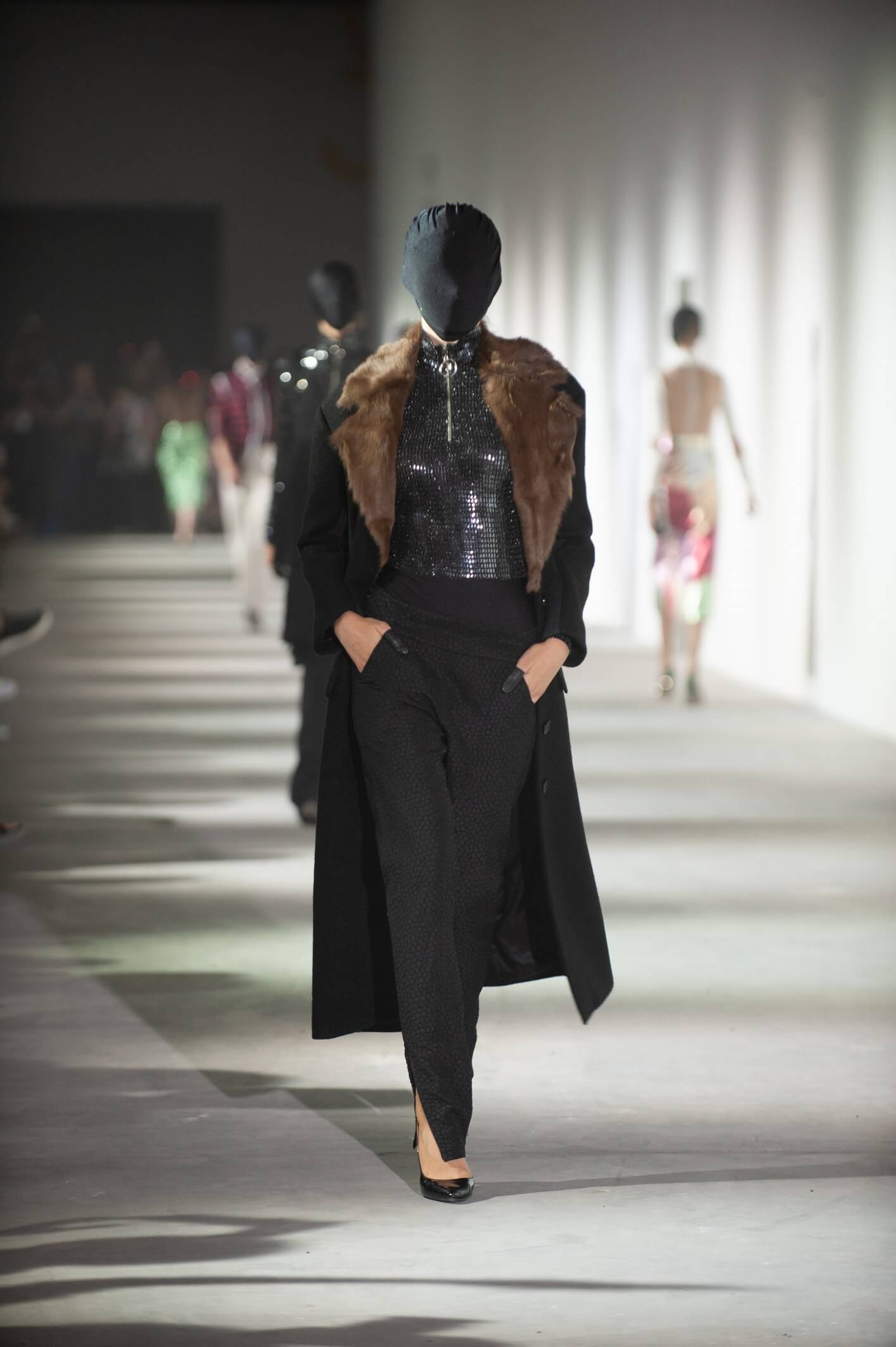Грузинский дизайнер Лаша Мдинарадзе вот уже почти 5 лет проповедует эстетику модного сюрреализма. Настоящим символом бренда Gudu стала антропоморфная фигура модели с полностью закрытым лицом - как-будто фантазия об оживающих в ночных витринах манекенах. Потусторонние персонажи, будто тени сновали по подиуму и в этот раз. На загадочных созданиях-моделях были юбки-миди из плиссированной блестящей эко-кожи, лаковые тренчи с контрастным декором из перьев, объёмные твидовые жакеты в духе Джеки Кеннеди и силуэтные костюмы, ставшие знаковыми для коллекций дизайнера.