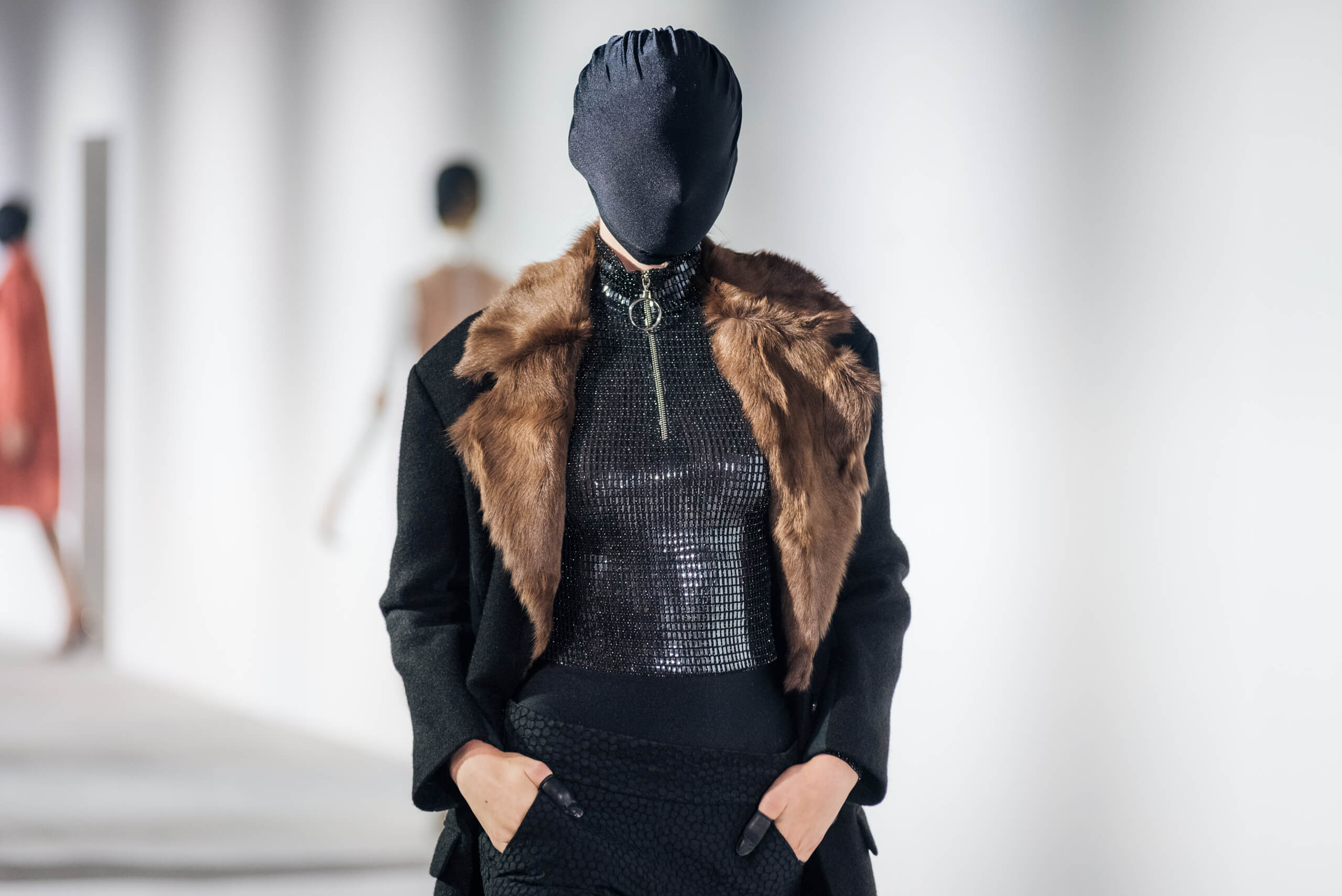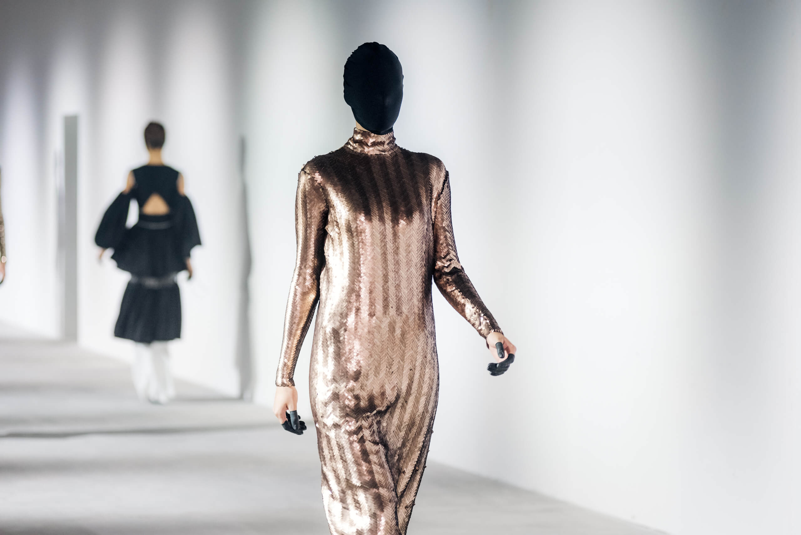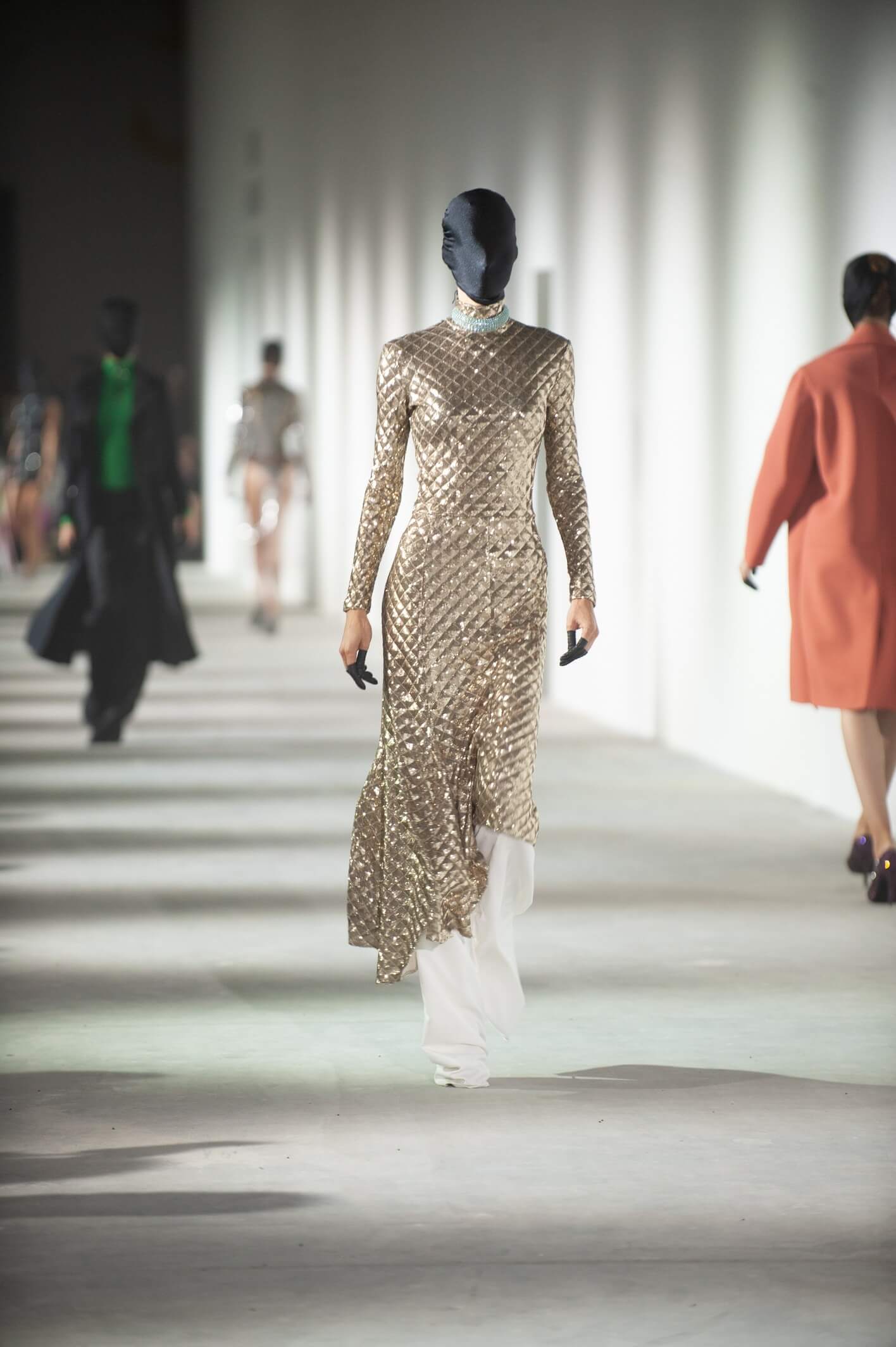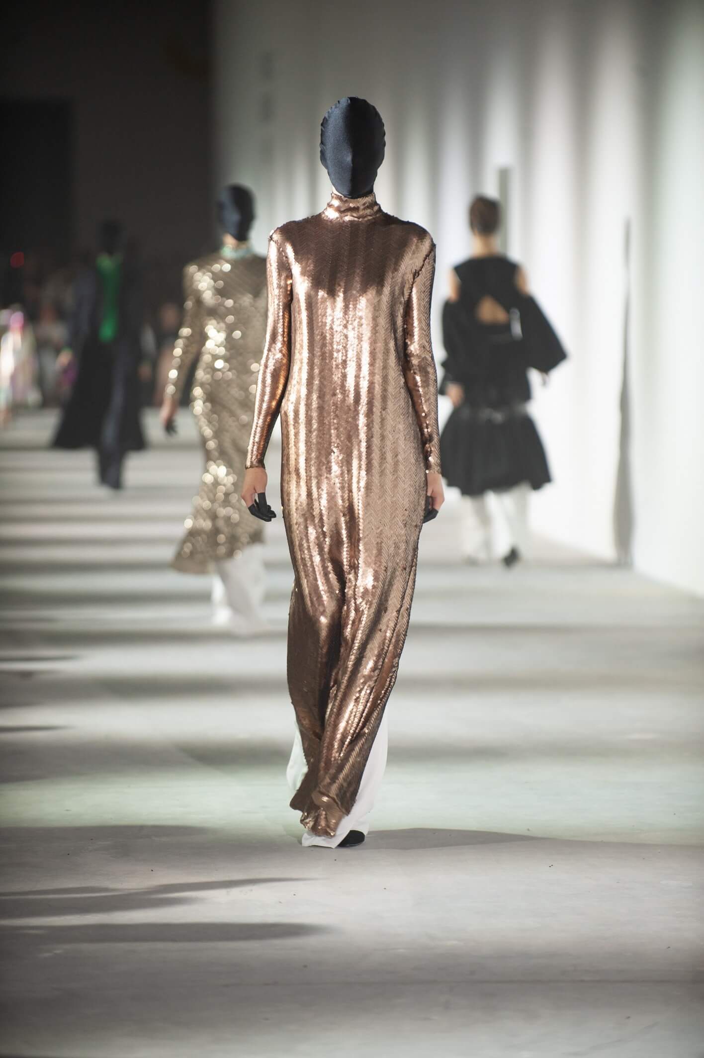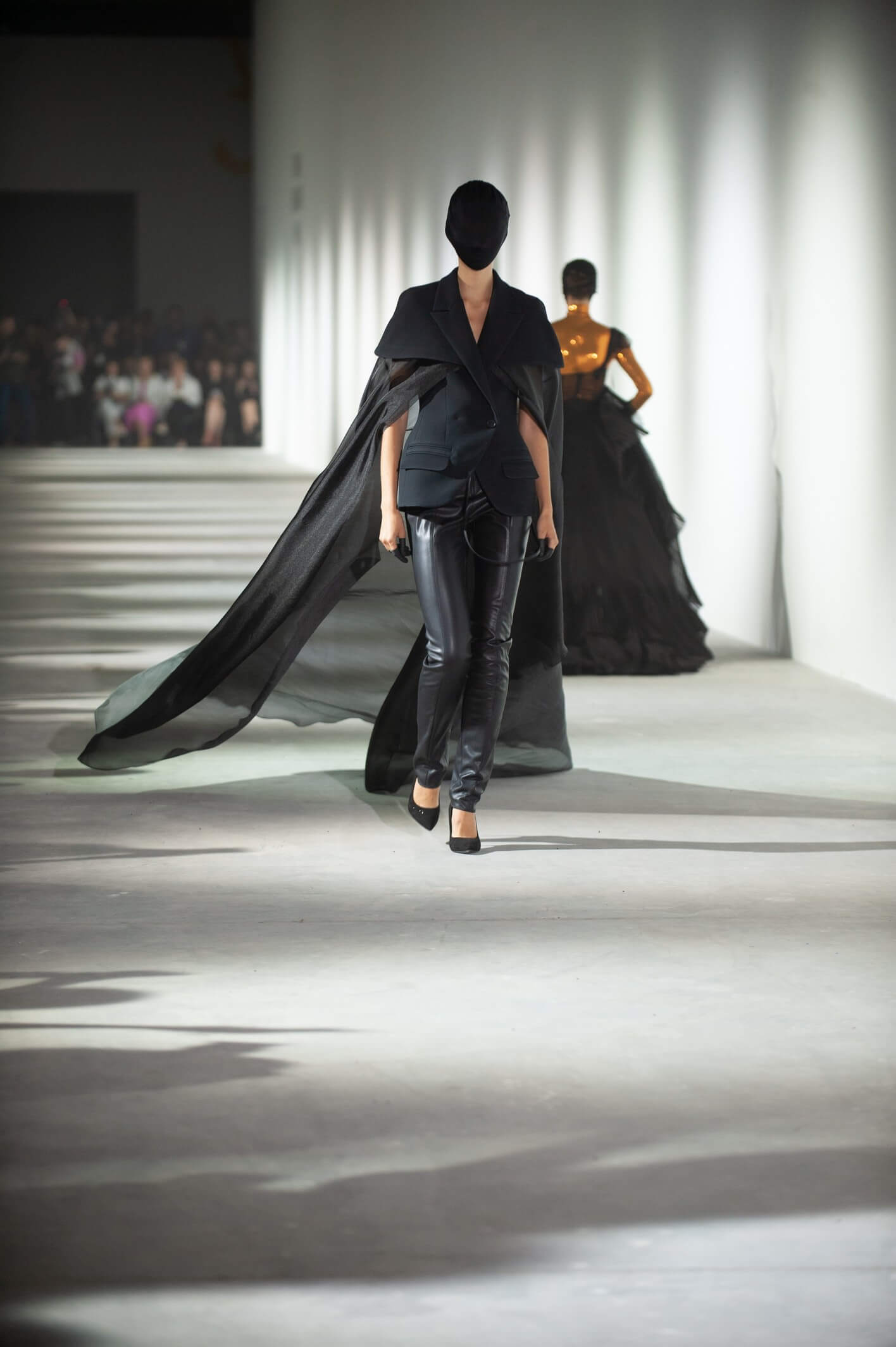 Грузинский дизайнер Лаша Мдинарадзе вот уже почти 5 лет проповедует эстетику модного сюрреализма. Настоящим символом бренда Gudu стала антропоморфная фигура модели с полностью закрытым лицом - как-будто фантазия об оживающих в ночных витринах манекенах. Потусторонние персонажи, будто тени сновали по подиуму и в этот раз. На загадочных созданиях-моделях были юбки-миди из плиссированной блестящей эко-кожи, лаковые тренчи с контрастным декором из перьев, объёмные твидовые жакеты в духе Джеки Кеннеди и силуэтные костюмы, ставшие знаковыми для коллекций дизайнера.