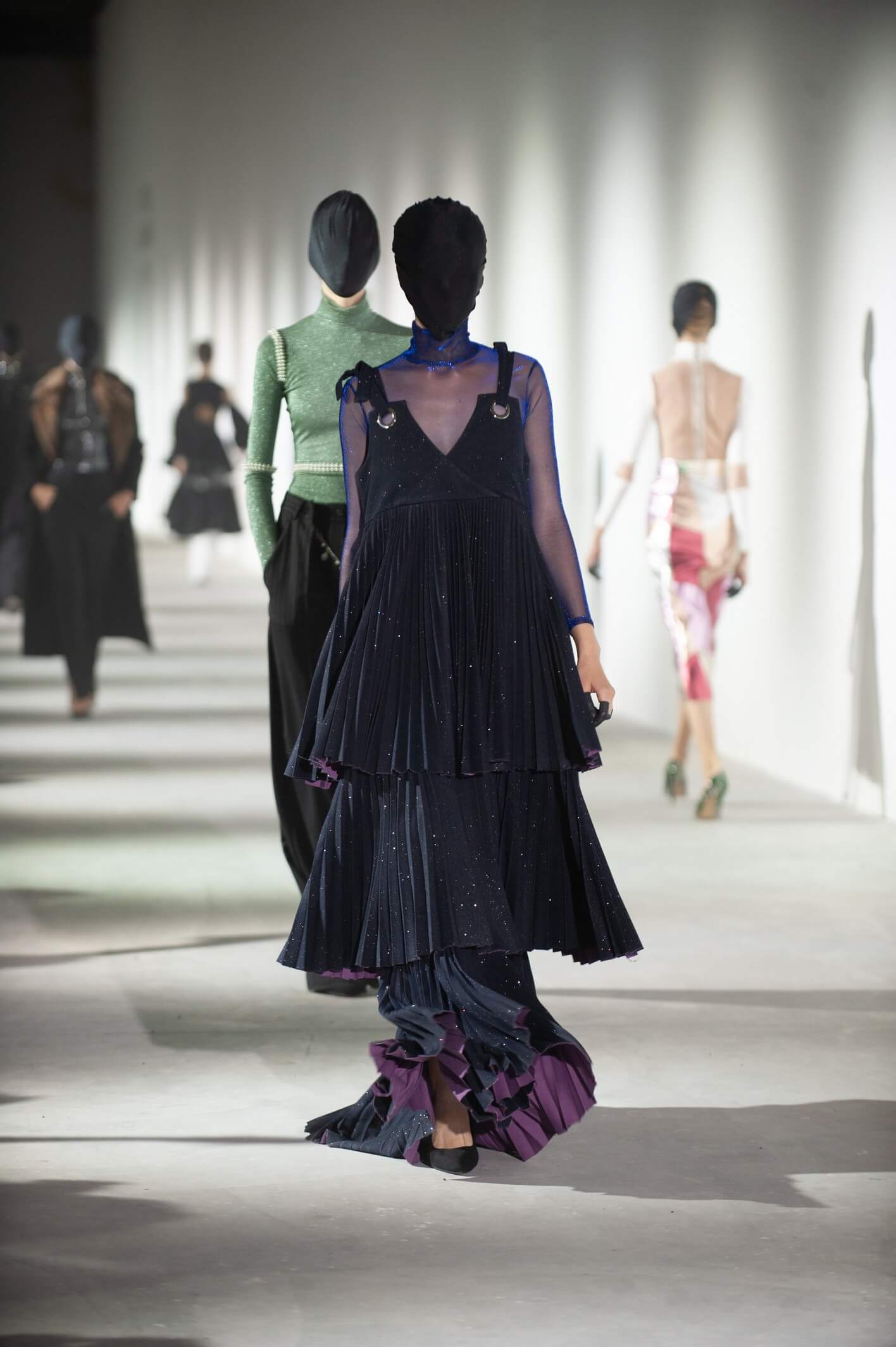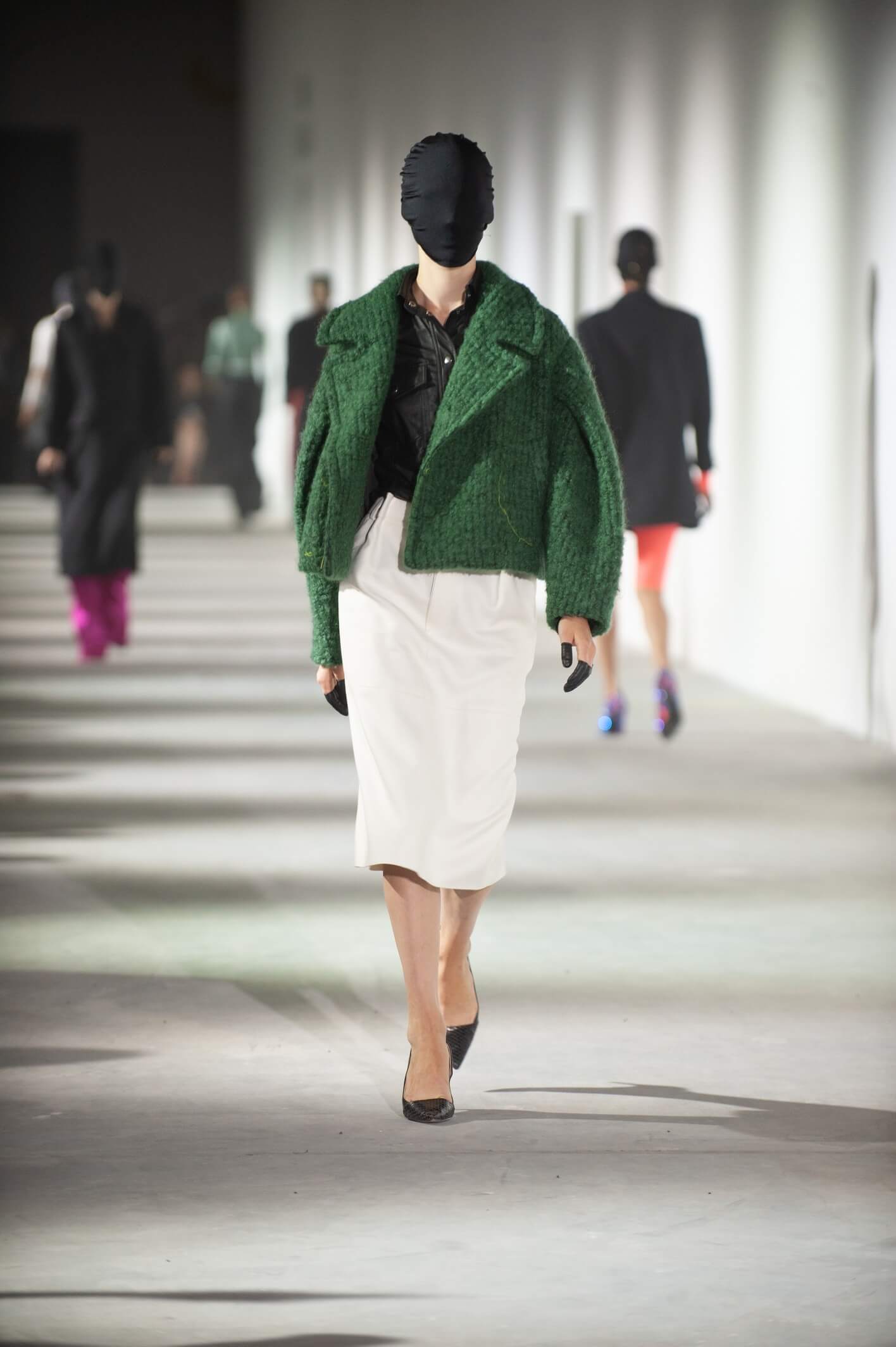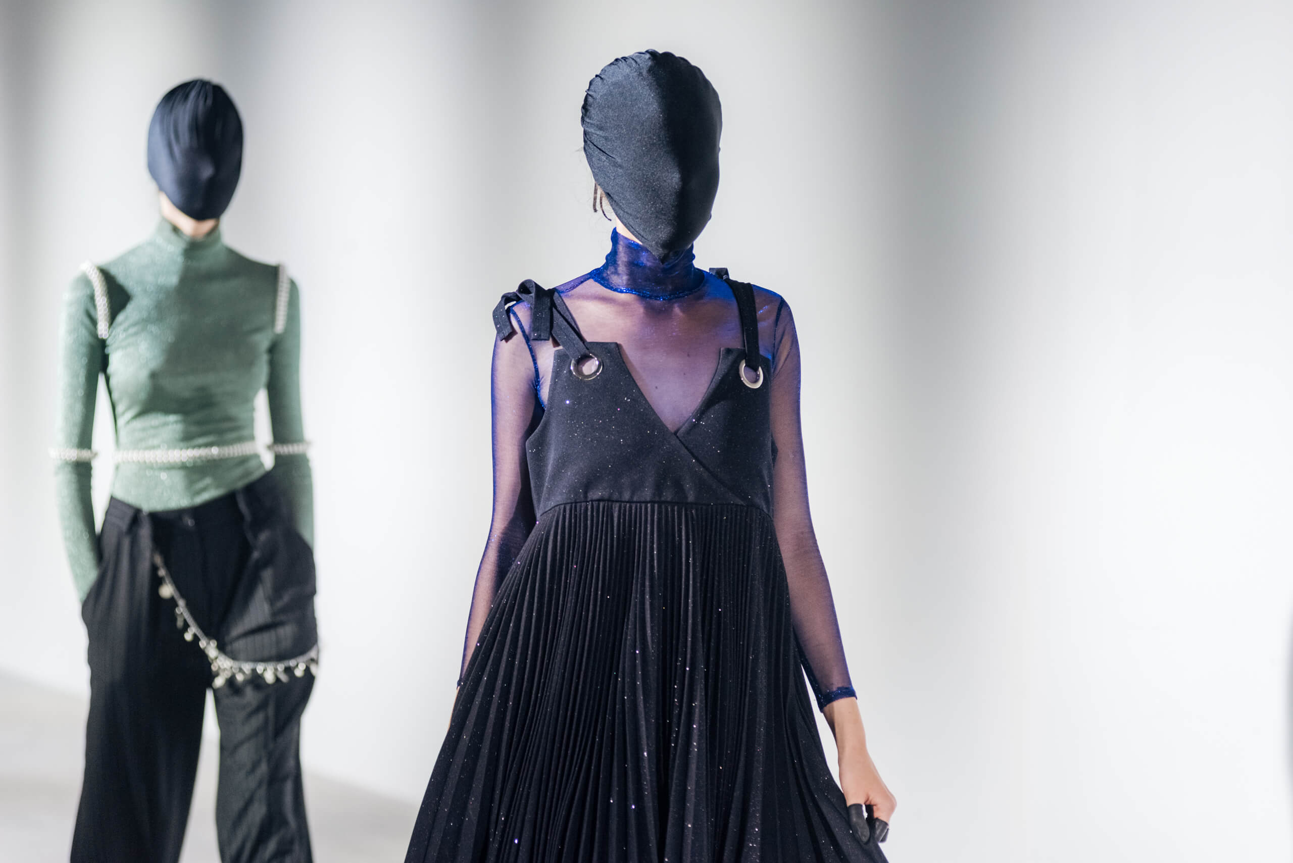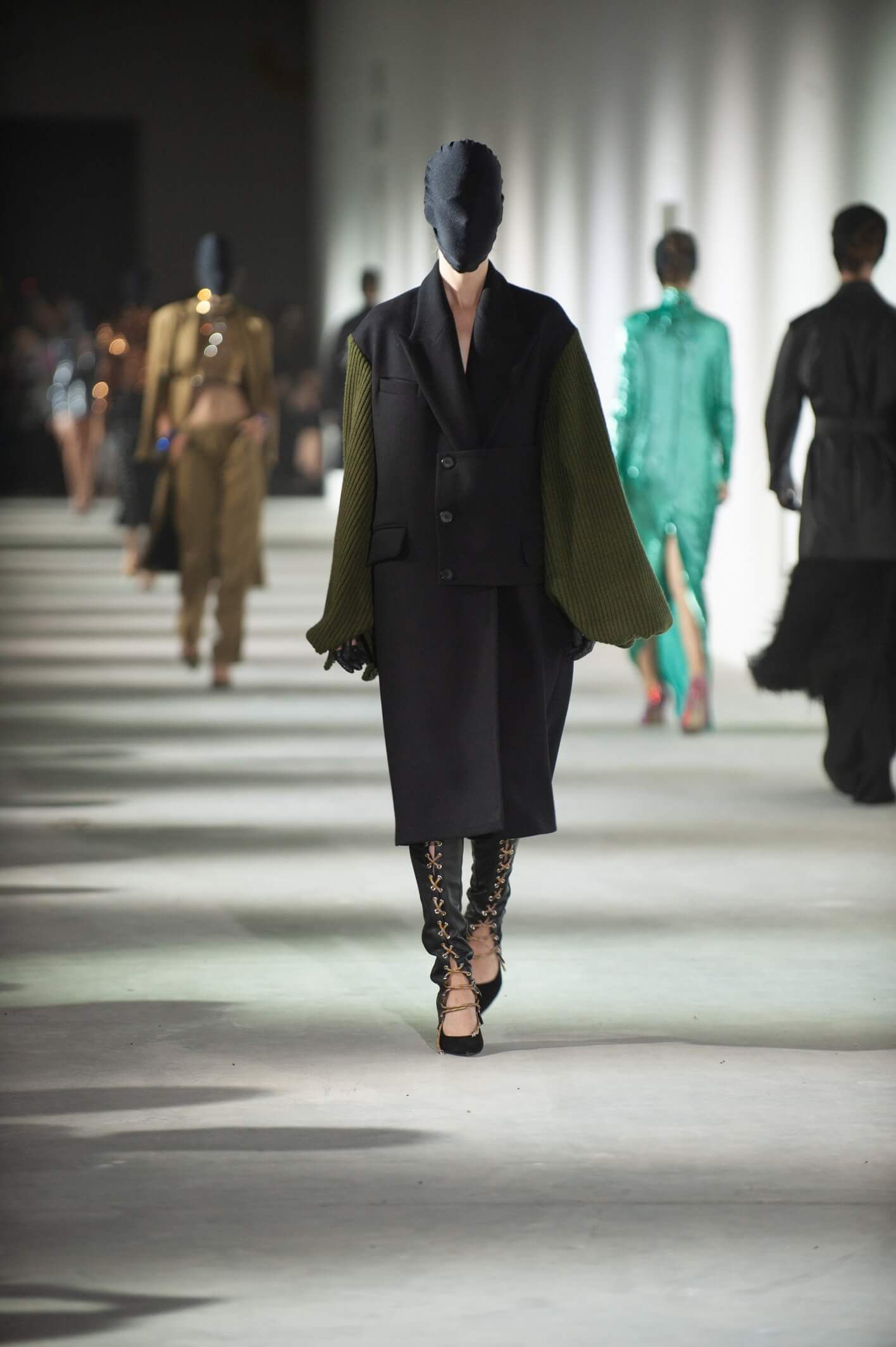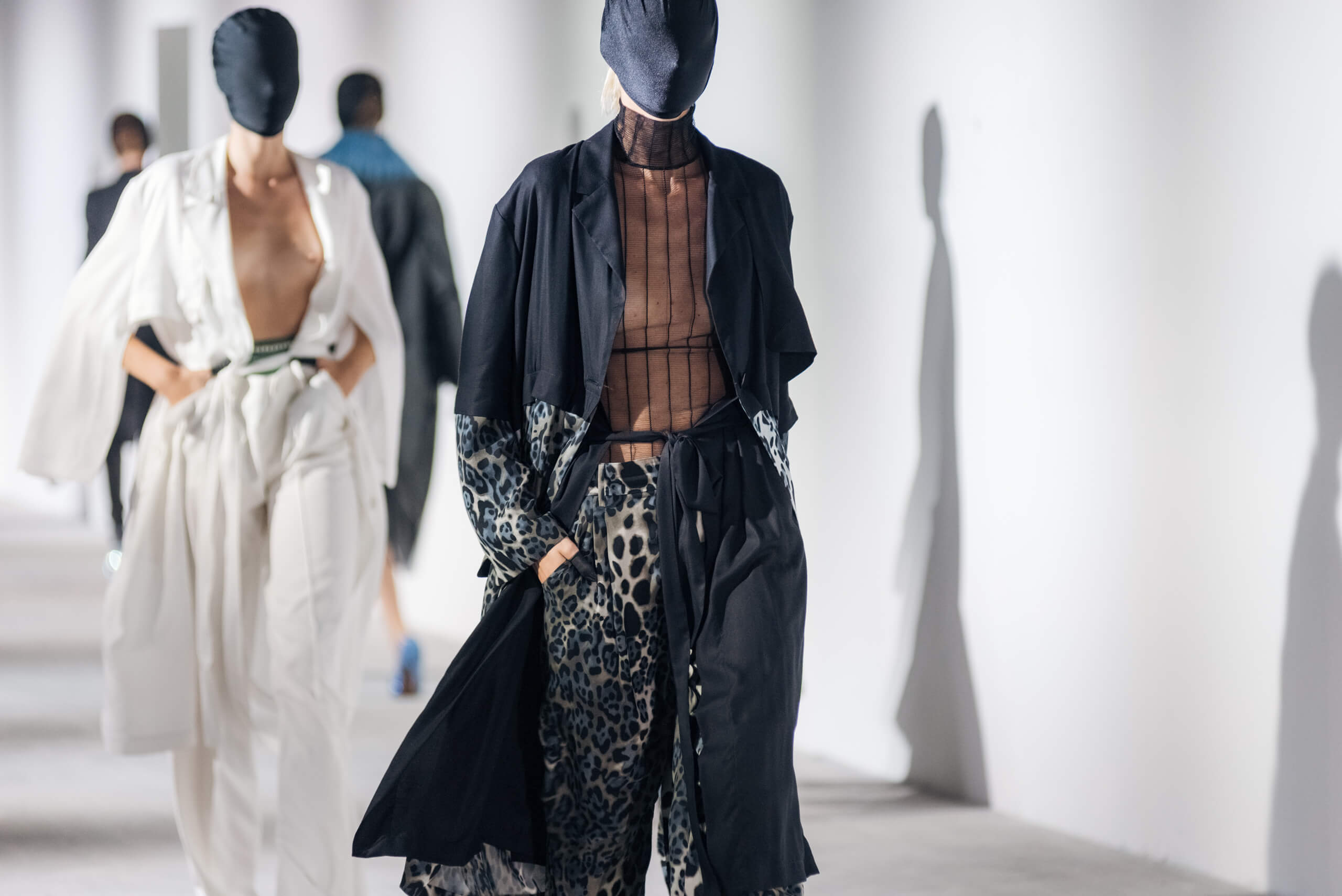 Грузинский дизайнер Лаша Мдинарадзе вот уже почти 5 лет проповедует эстетику модного сюрреализма. Настоящим символом бренда Gudu стала антропоморфная фигура модели с полностью закрытым лицом - как-будто фантазия об оживающих в ночных витринах манекенах. Потусторонние персонажи, будто тени сновали по подиуму и в этот раз. На загадочных созданиях-моделях были юбки-миди из плиссированной блестящей эко-кожи, лаковые тренчи с контрастным декором из перьев, объёмные твидовые жакеты в духе Джеки Кеннеди и силуэтные костюмы, ставшие знаковыми для коллекций дизайнера.