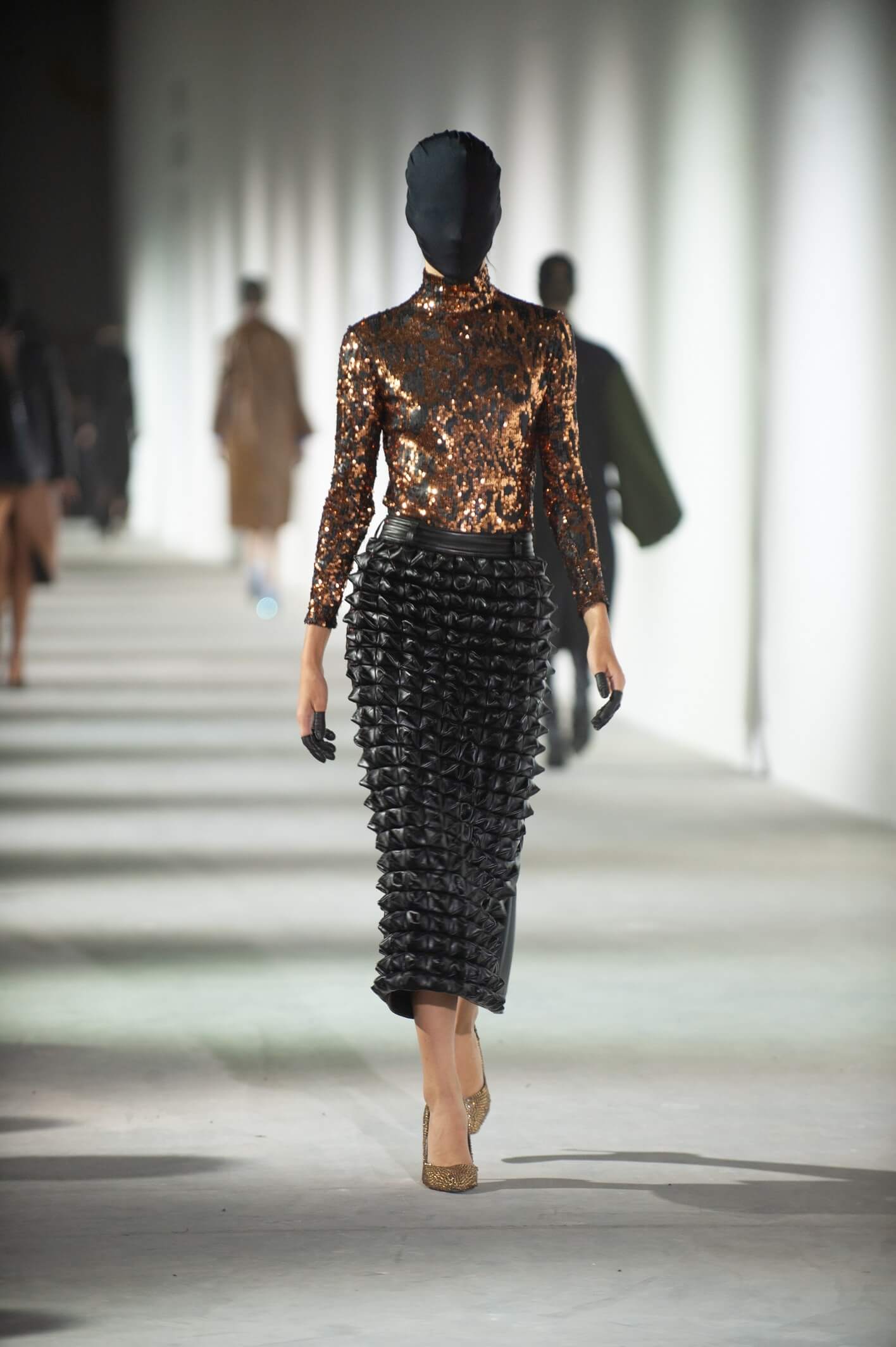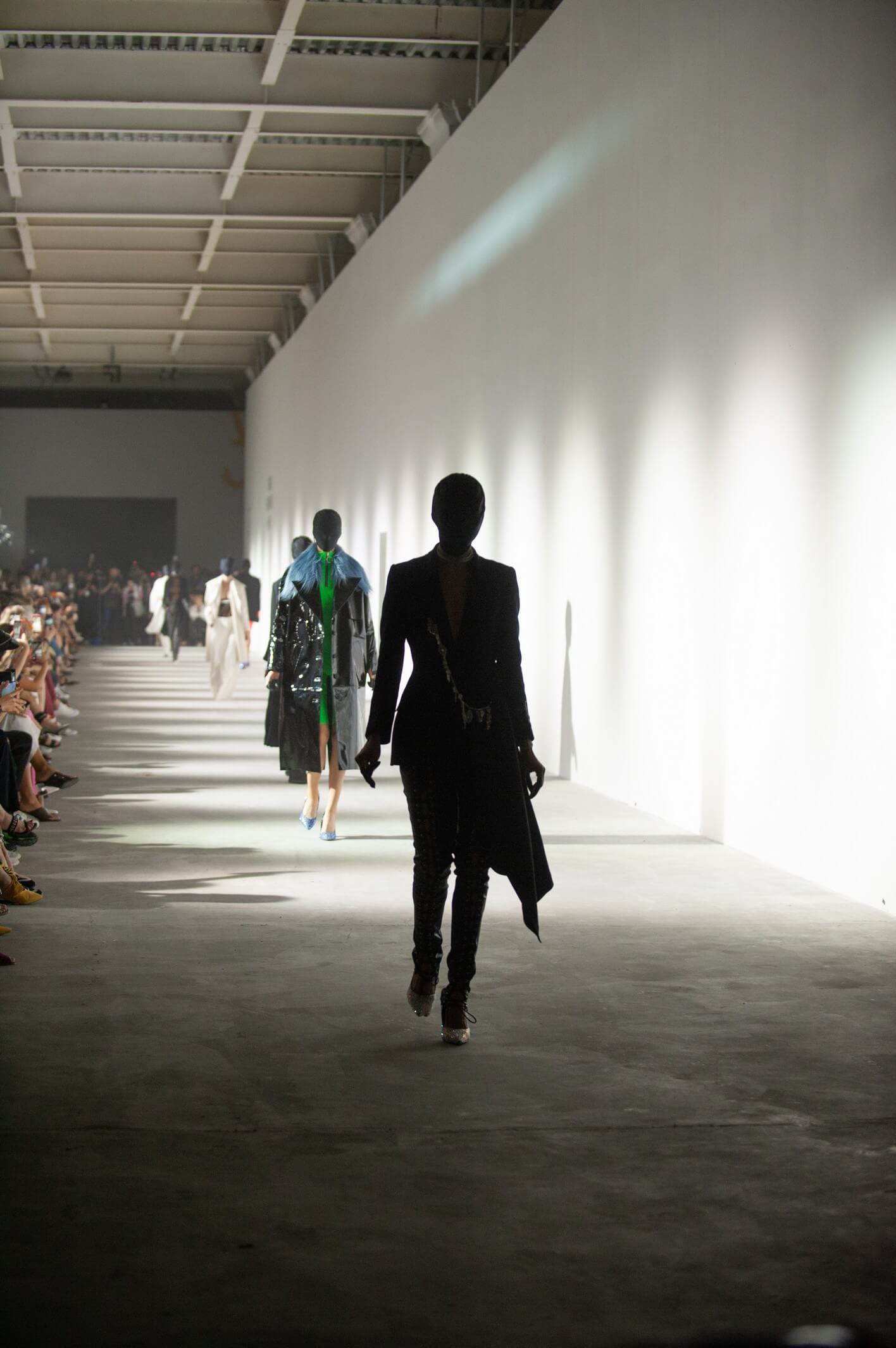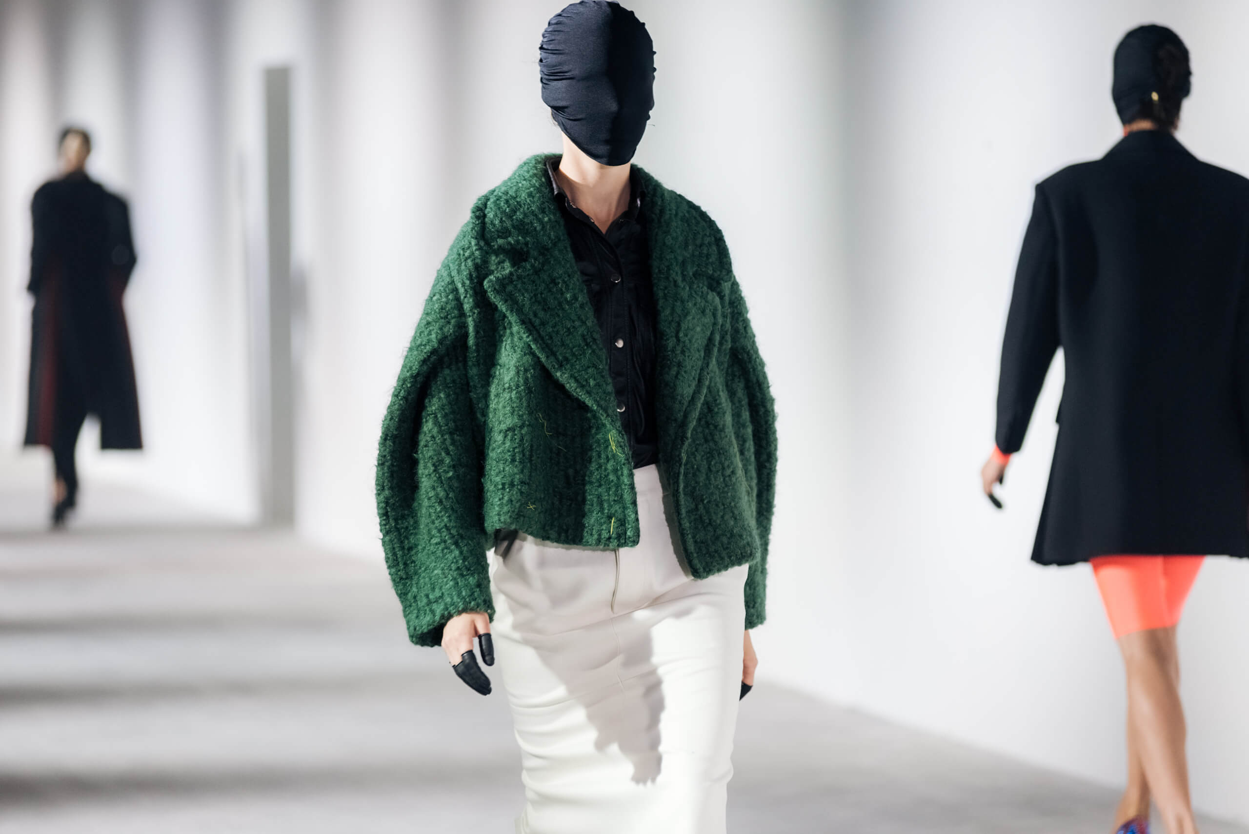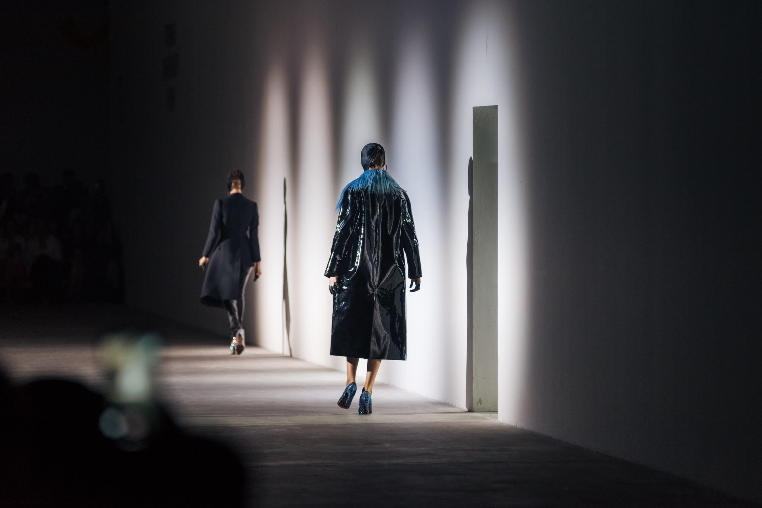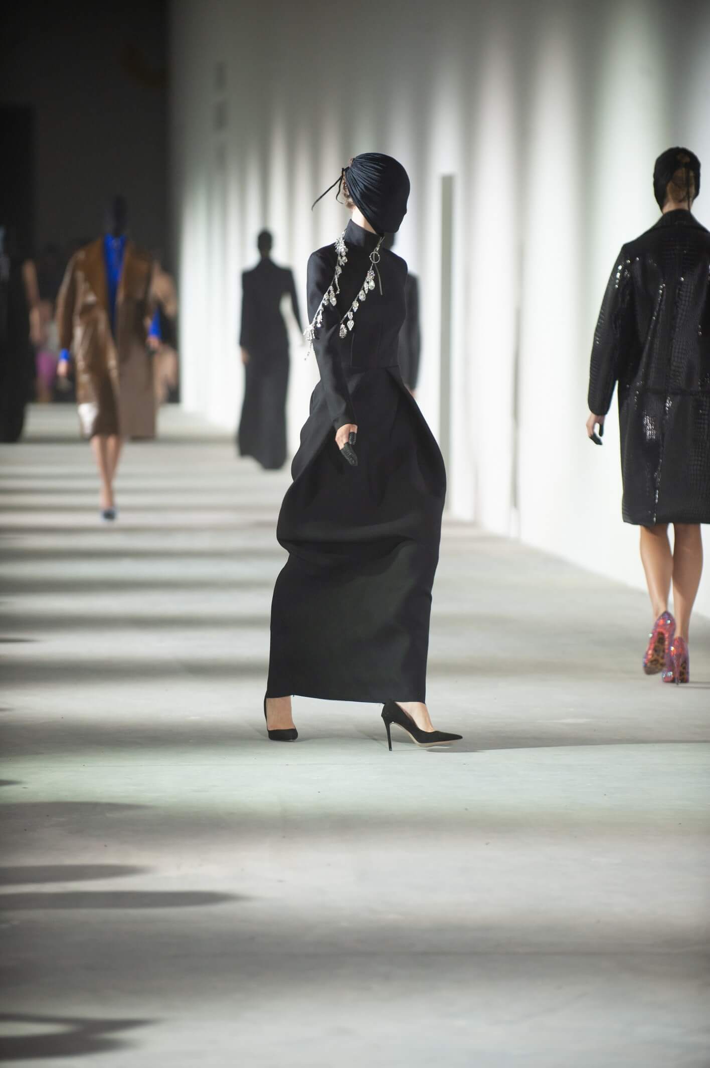 Грузинский дизайнер Лаша Мдинарадзе вот уже почти 5 лет проповедует эстетику модного сюрреализма. Настоящим символом бренда Gudu стала антропоморфная фигура модели с полностью закрытым лицом - как-будто фантазия об оживающих в ночных витринах манекенах. Потусторонние персонажи, будто тени сновали по подиуму и в этот раз. На загадочных созданиях-моделях были юбки-миди из плиссированной блестящей эко-кожи, лаковые тренчи с контрастным декором из перьев, объёмные твидовые жакеты в духе Джеки Кеннеди и силуэтные костюмы, ставшие знаковыми для коллекций дизайнера.