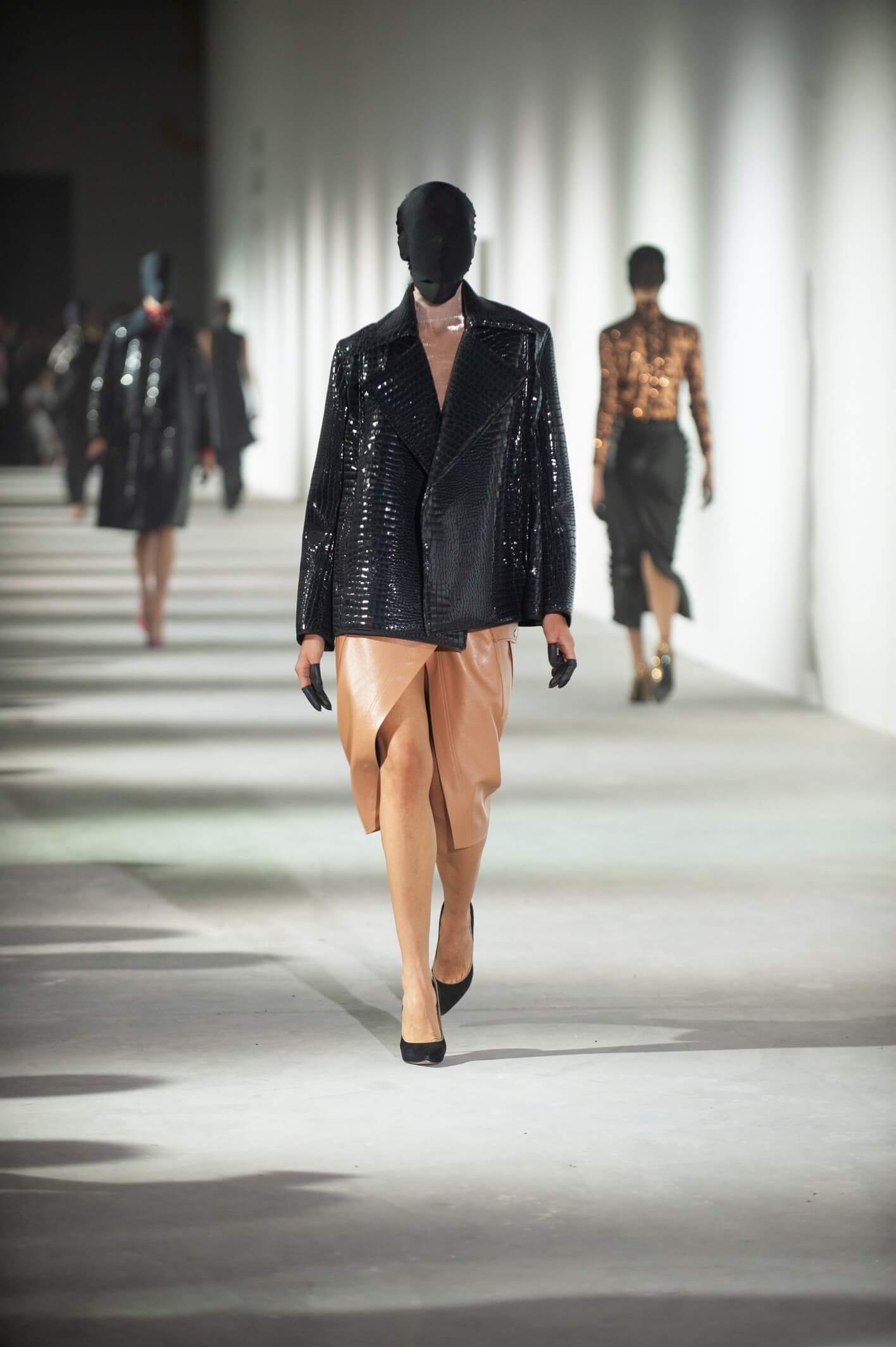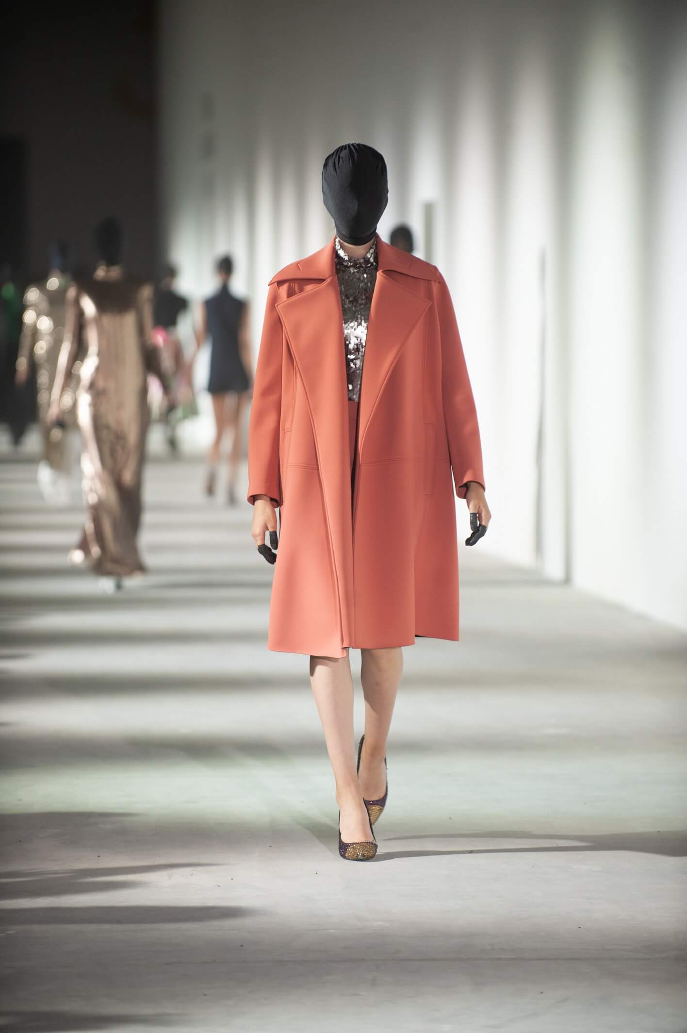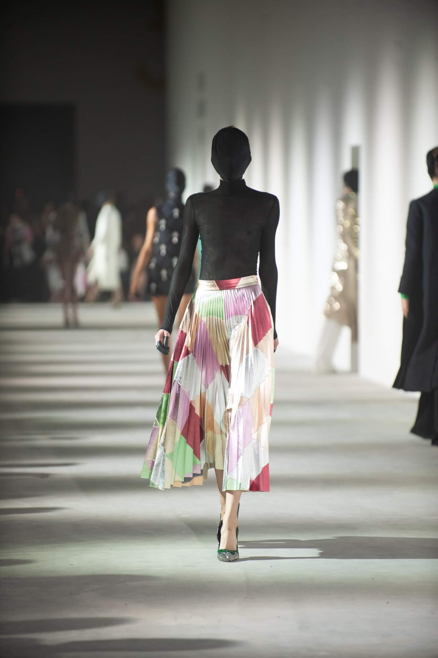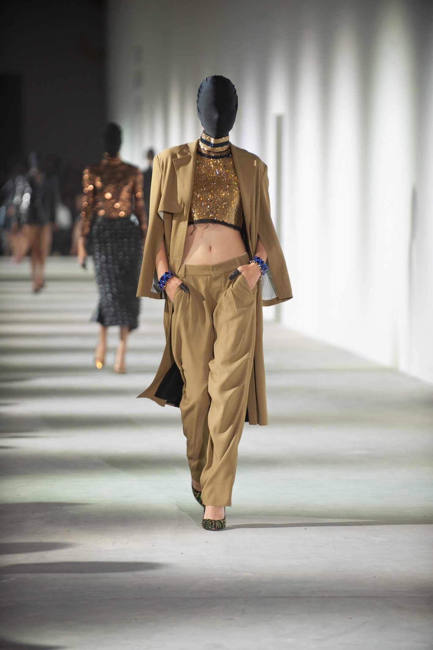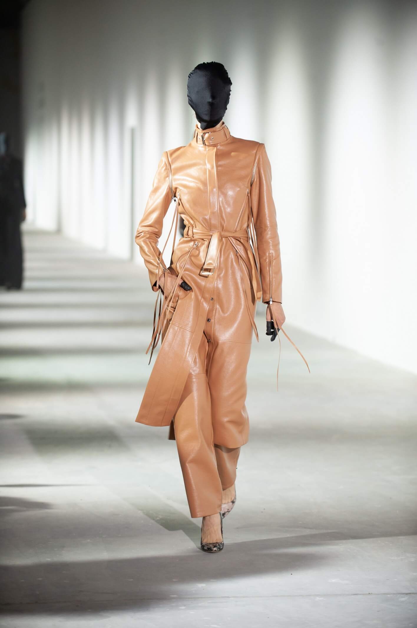 Грузинский дизайнер Лаша Мдинарадзе вот уже почти 5 лет проповедует эстетику модного сюрреализма. Настоящим символом бренда Gudu стала антропоморфная фигура модели с полностью закрытым лицом - как-будто фантазия об оживающих в ночных витринах манекенах. Потусторонние персонажи, будто тени сновали по подиуму и в этот раз. На загадочных созданиях-моделях были юбки-миди из плиссированной блестящей эко-кожи, лаковые тренчи с контрастным декором из перьев, объёмные твидовые жакеты в духе Джеки Кеннеди и силуэтные костюмы, ставшие знаковыми для коллекций дизайнера.