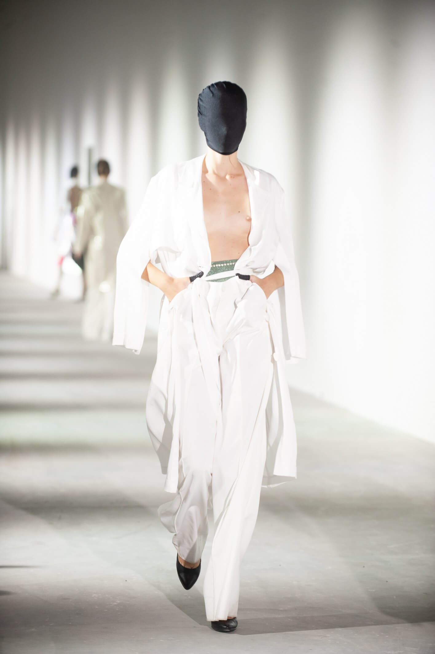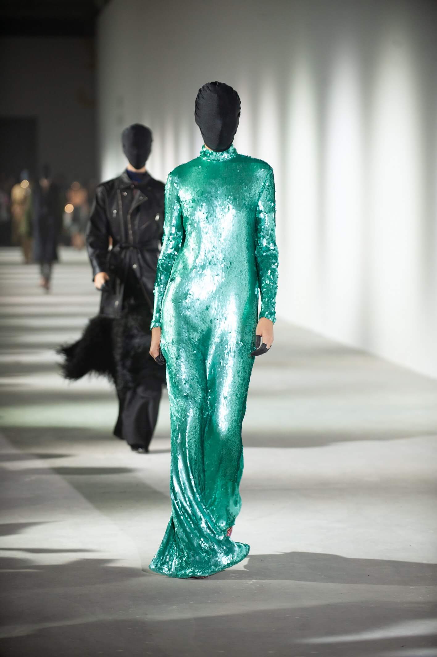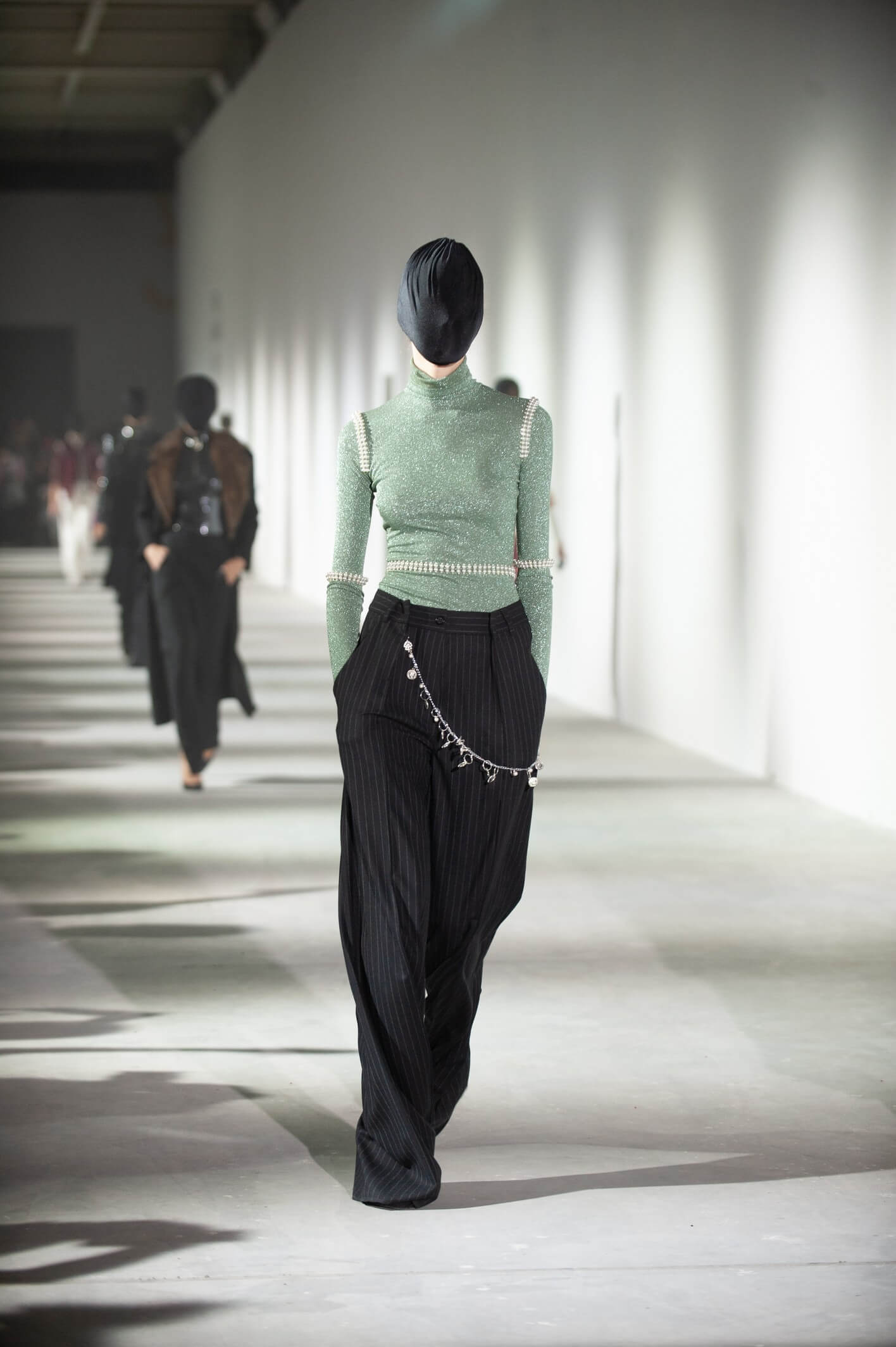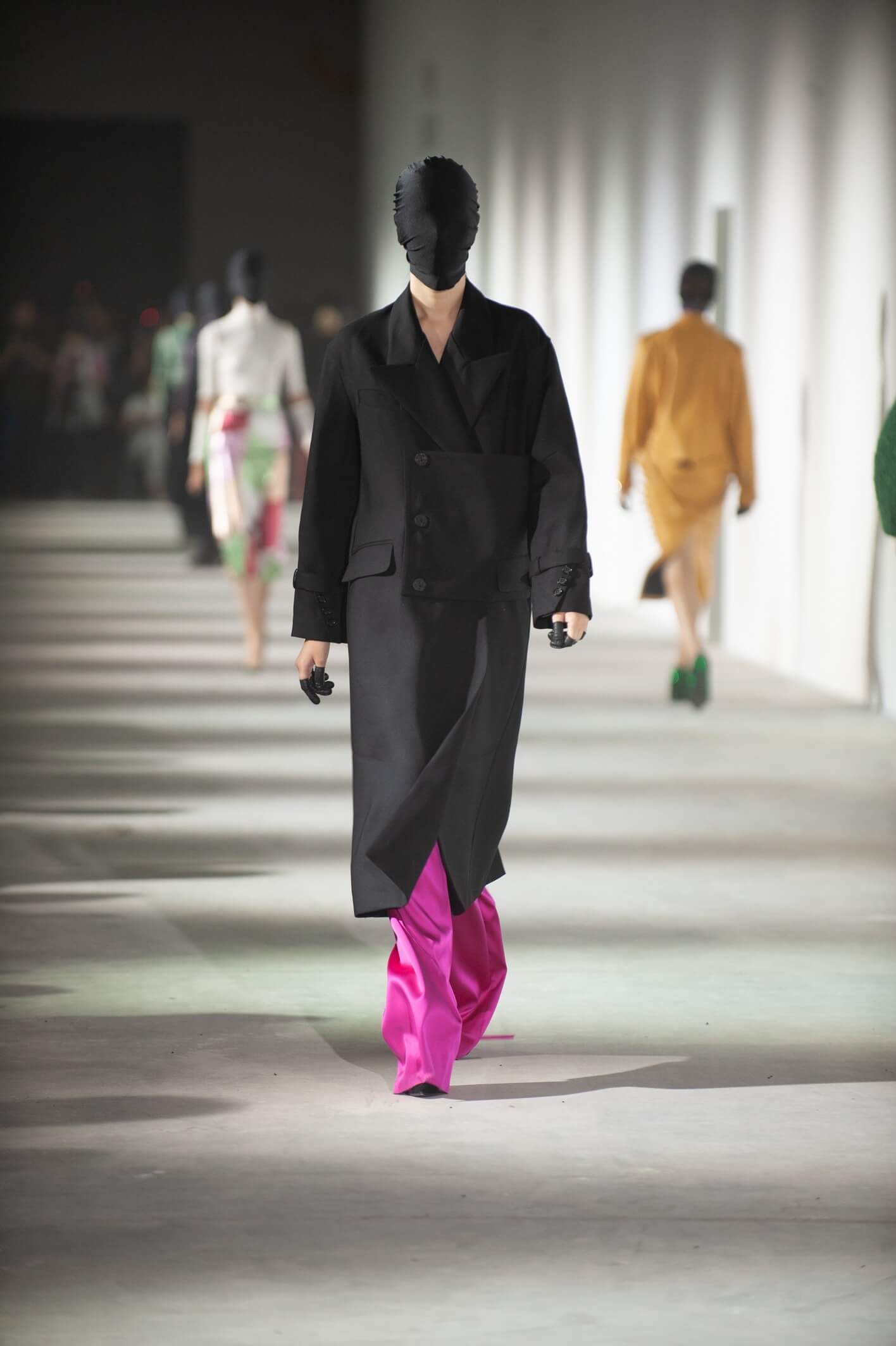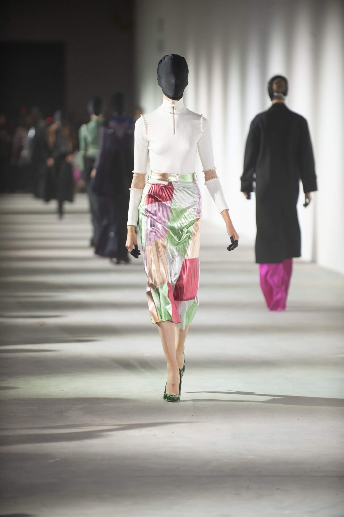 Грузинский дизайнер Лаша Мдинарадзе вот уже почти 5 лет проповедует эстетику модного сюрреализма. Настоящим символом бренда Gudu стала антропоморфная фигура модели с полностью закрытым лицом - как-будто фантазия об оживающих в ночных витринах манекенах. Потусторонние персонажи, будто тени сновали по подиуму и в этот раз. На загадочных созданиях-моделях были юбки-миди из плиссированной блестящей эко-кожи, лаковые тренчи с контрастным декором из перьев, объёмные твидовые жакеты в духе Джеки Кеннеди и силуэтные костюмы, ставшие знаковыми для коллекций дизайнера.