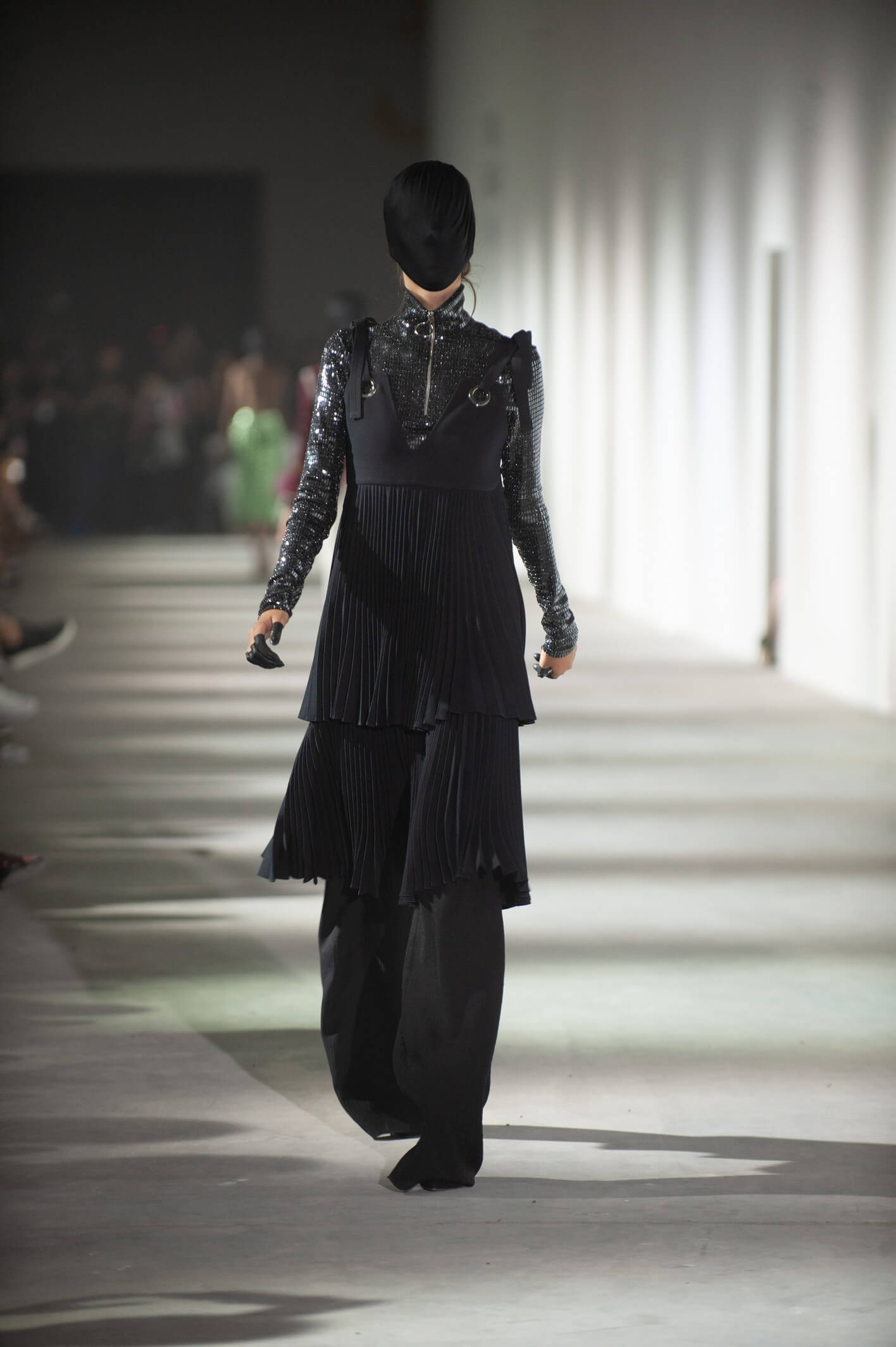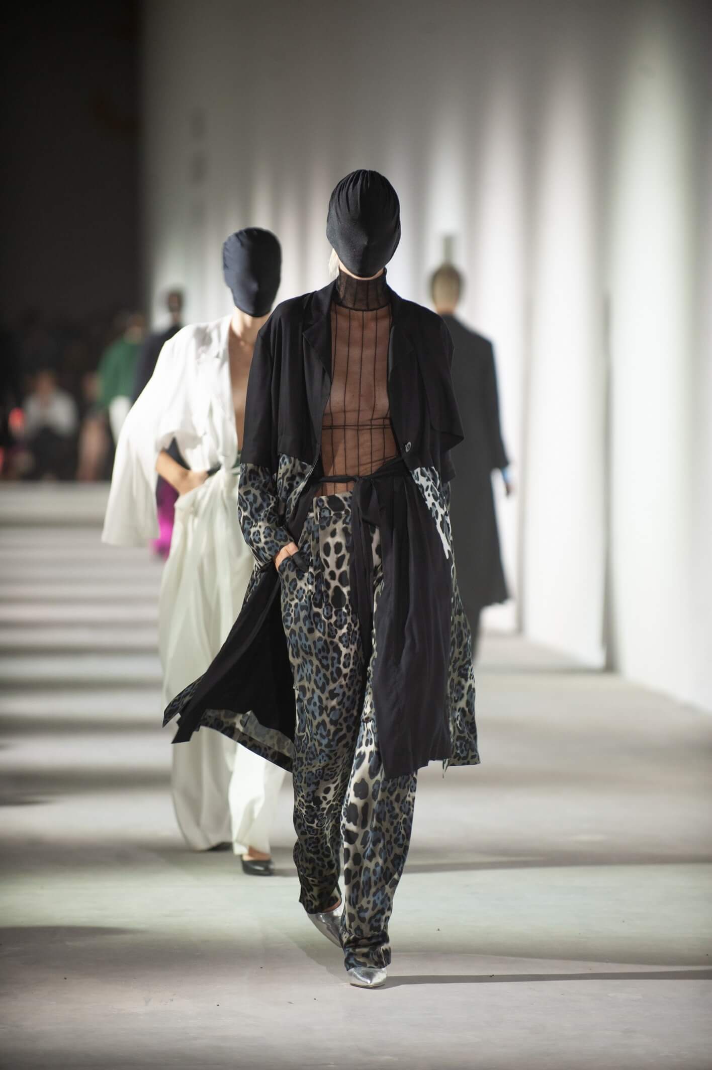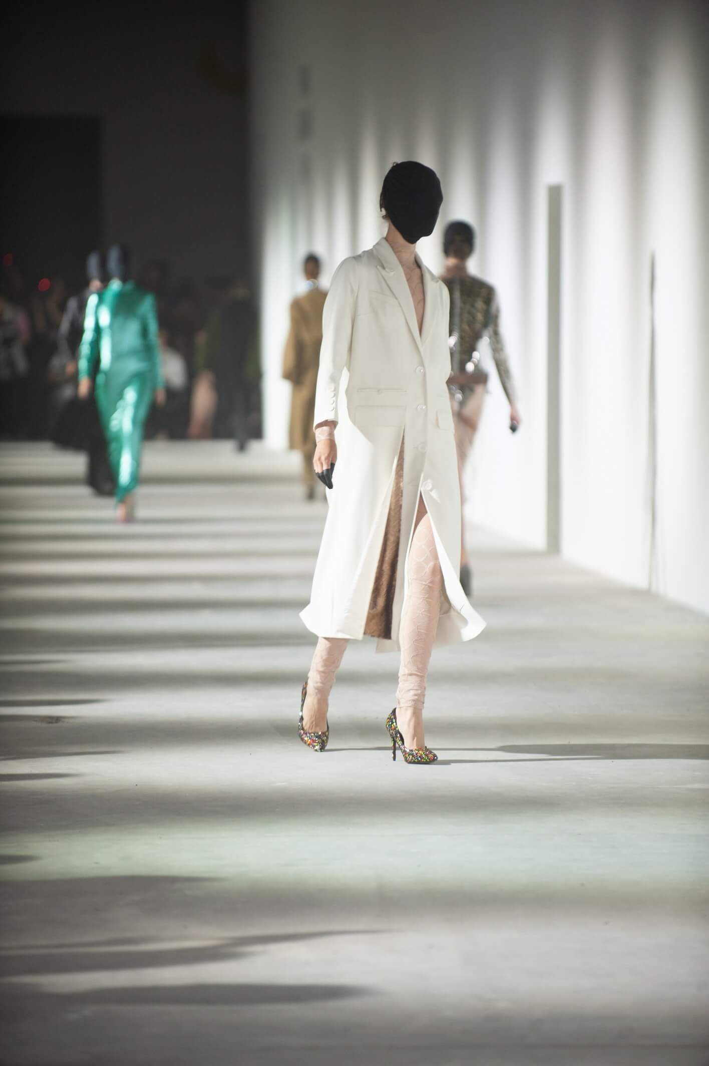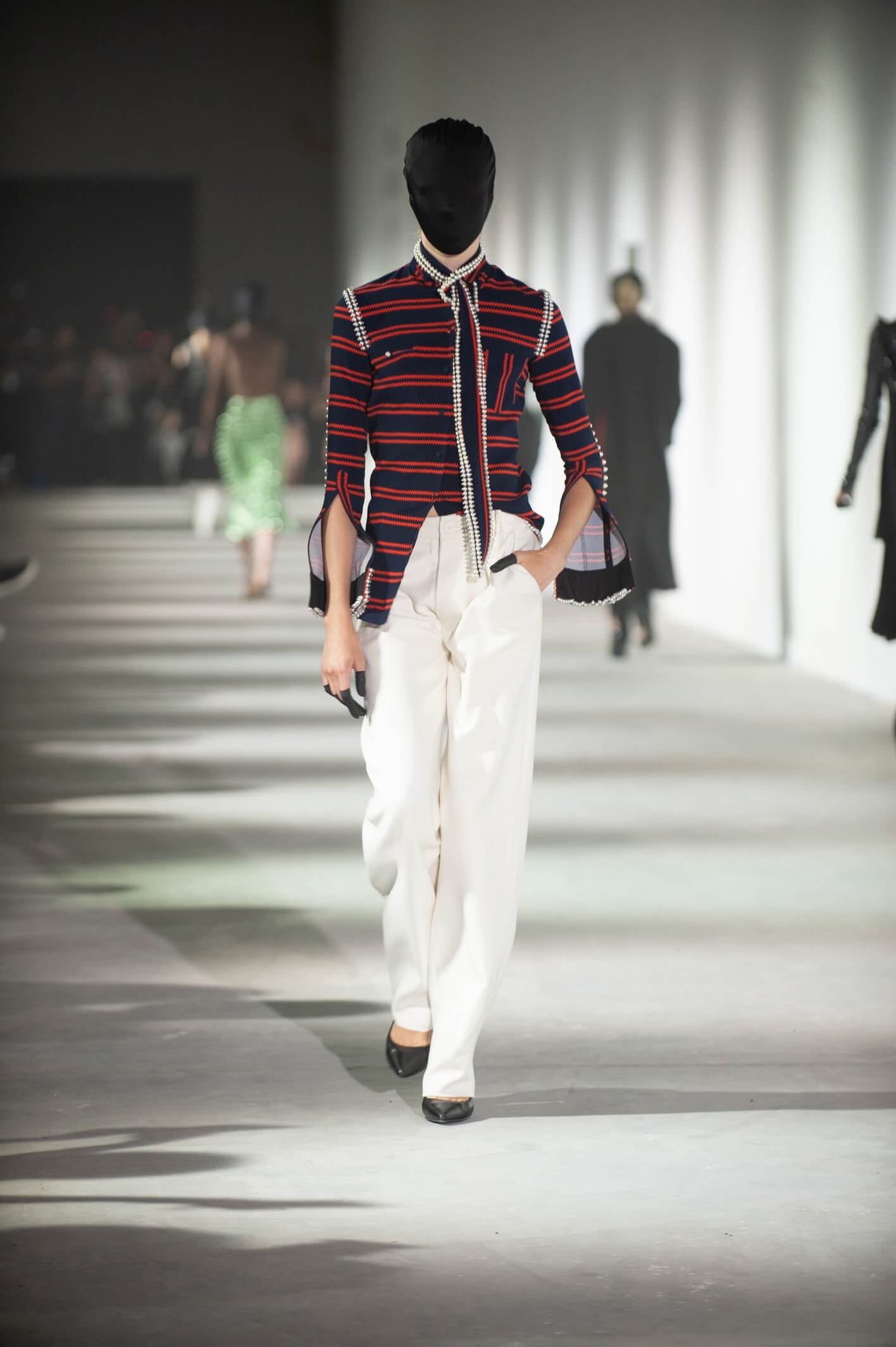 Грузинский дизайнер Лаша Мдинарадзе вот уже почти 5 лет проповедует эстетику модного сюрреализма. Настоящим символом бренда Gudu стала антропоморфная фигура модели с полностью закрытым лицом - как-будто фантазия об оживающих в ночных витринах манекенах. Потусторонние персонажи, будто тени сновали по подиуму и в этот раз. На загадочных созданиях-моделях были юбки-миди из плиссированной блестящей эко-кожи, лаковые тренчи с контрастным декором из перьев, объёмные твидовые жакеты в духе Джеки Кеннеди и силуэтные костюмы, ставшие знаковыми для коллекций дизайнера.