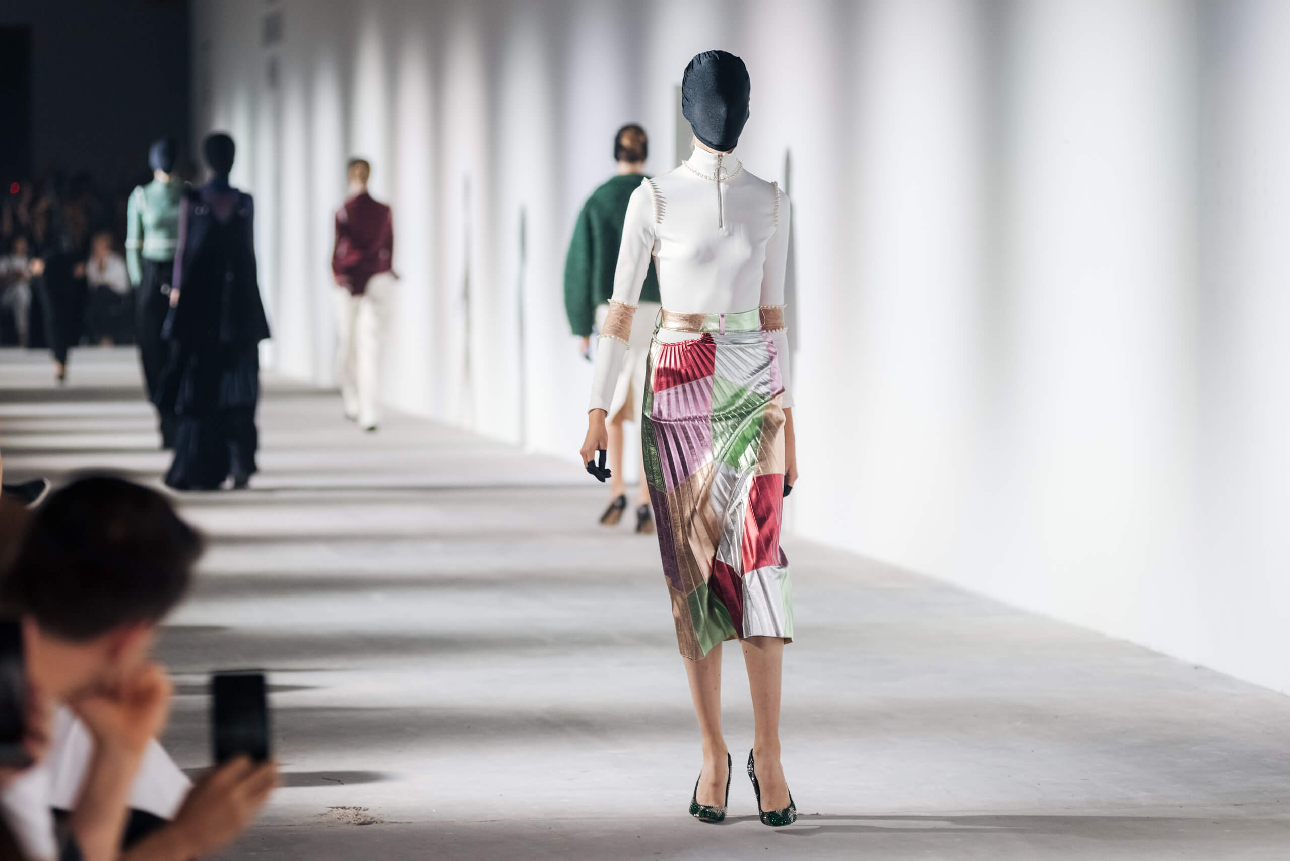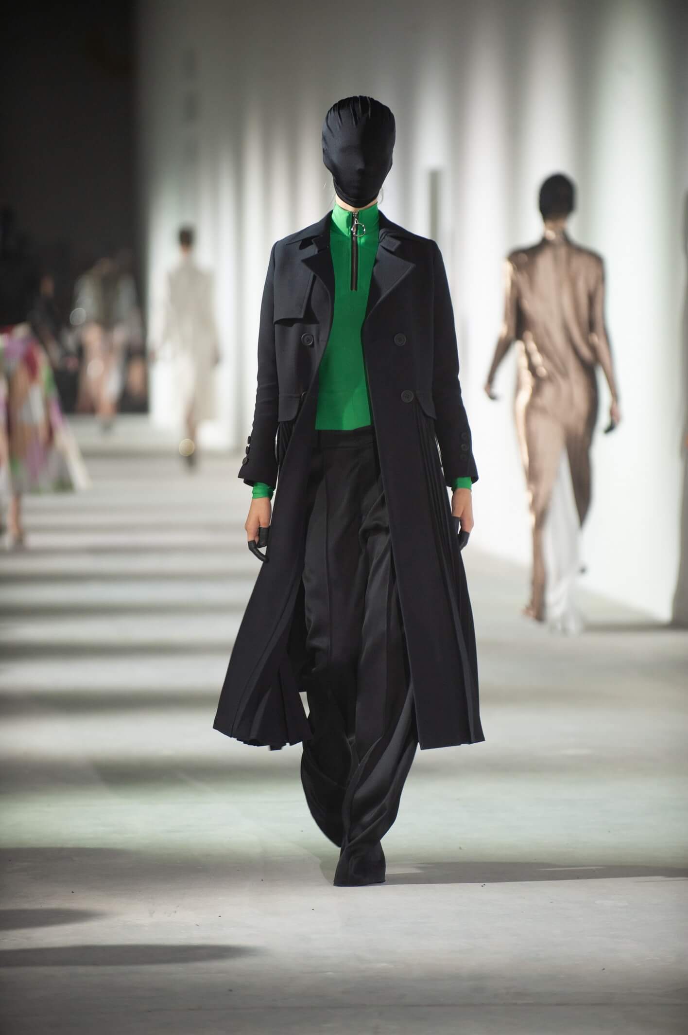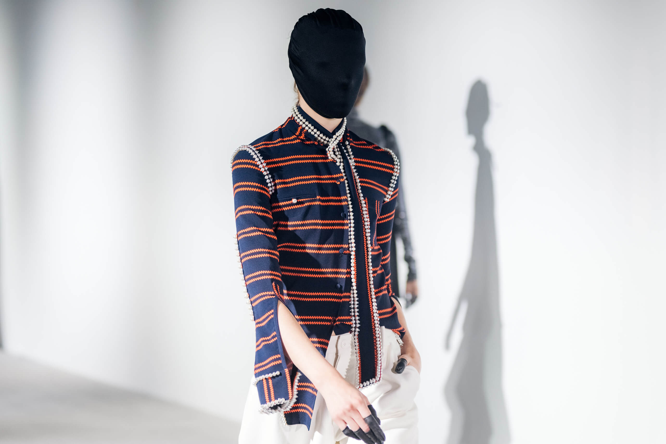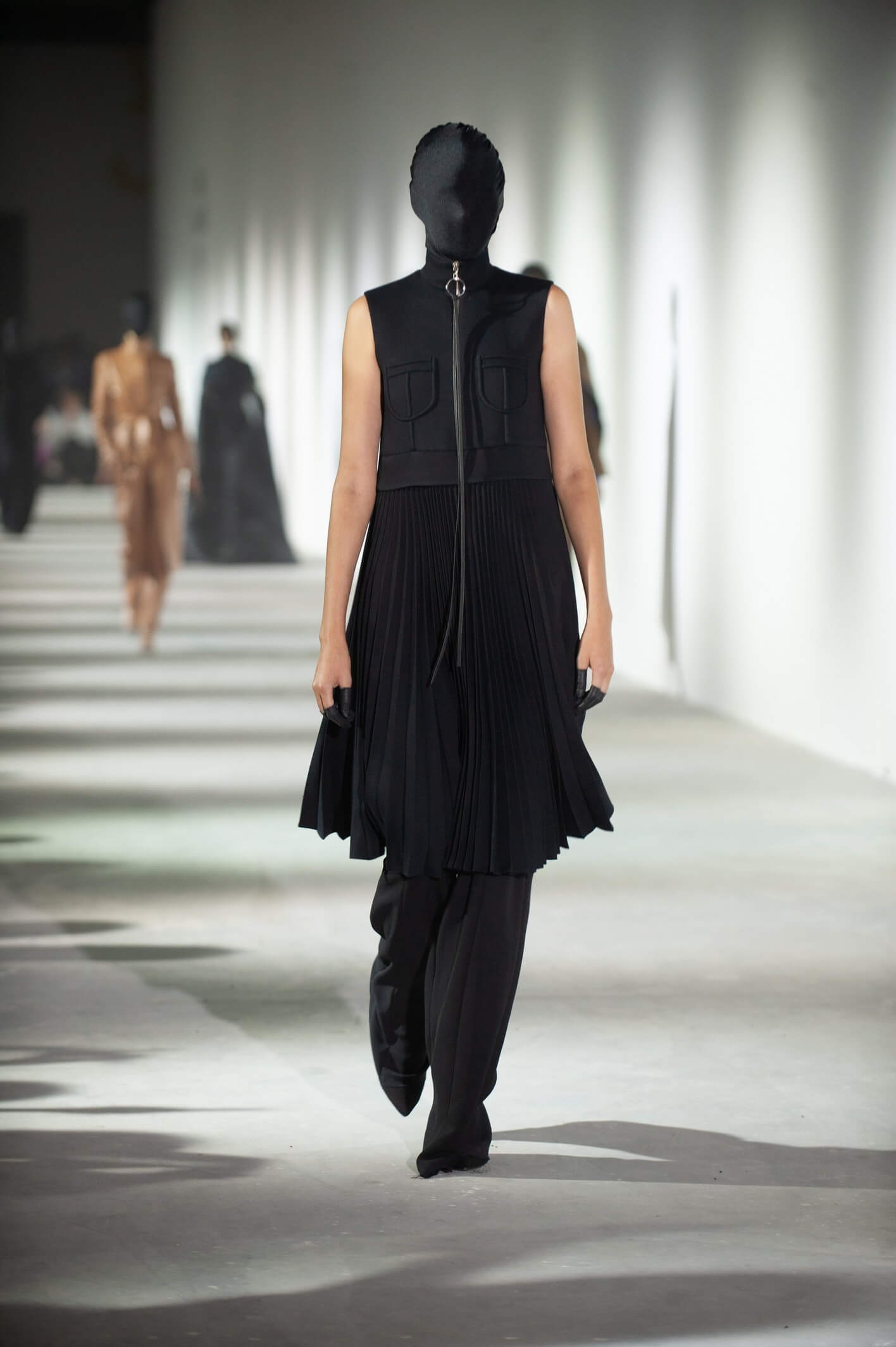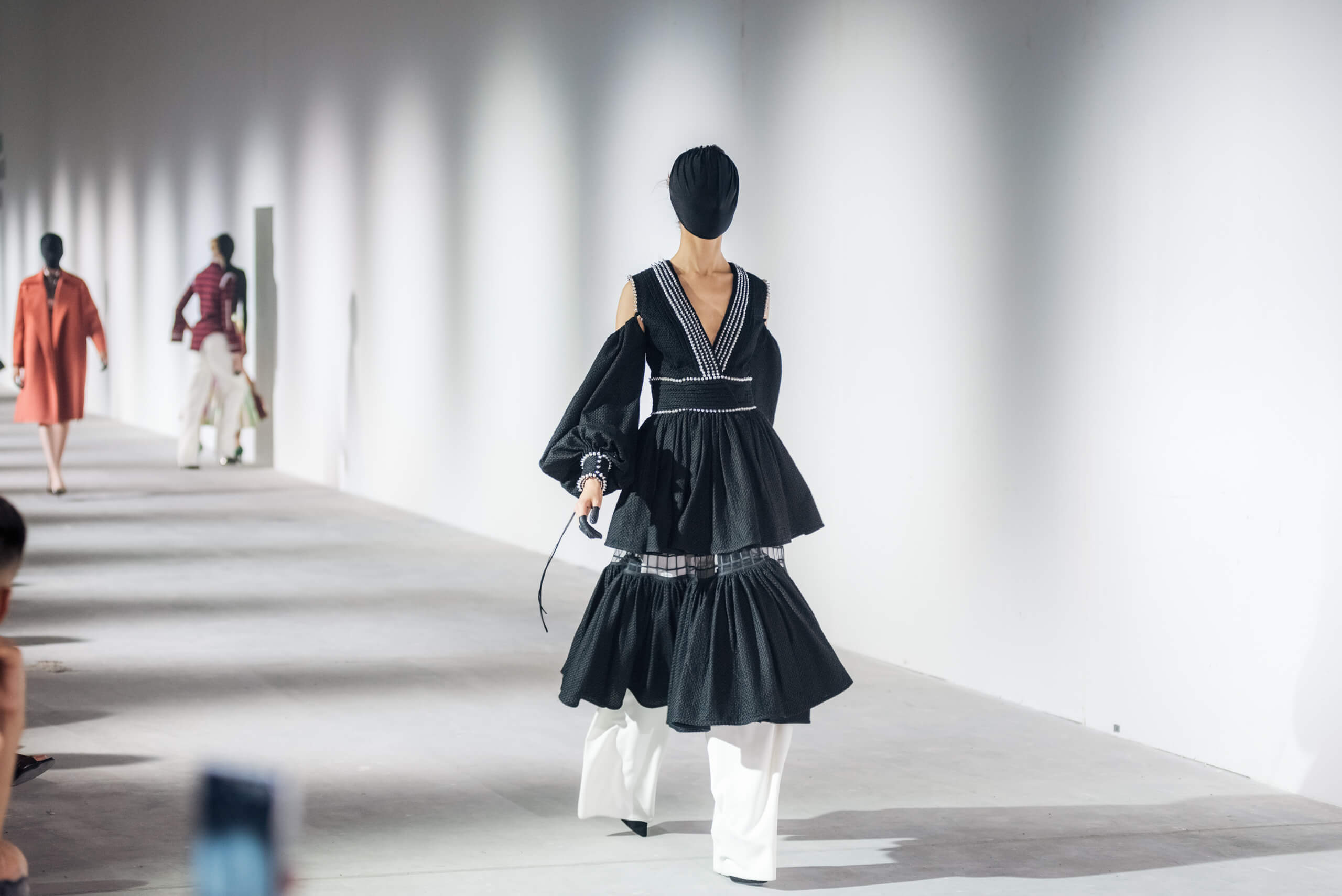 Грузинский дизайнер Лаша Мдинарадзе вот уже почти 5 лет проповедует эстетику модного сюрреализма. Настоящим символом бренда Gudu стала антропоморфная фигура модели с полностью закрытым лицом - как-будто фантазия об оживающих в ночных витринах манекенах. Потусторонние персонажи, будто тени сновали по подиуму и в этот раз. На загадочных созданиях-моделях были юбки-миди из плиссированной блестящей эко-кожи, лаковые тренчи с контрастным декором из перьев, объёмные твидовые жакеты в духе Джеки Кеннеди и силуэтные костюмы, ставшие знаковыми для коллекций дизайнера.
