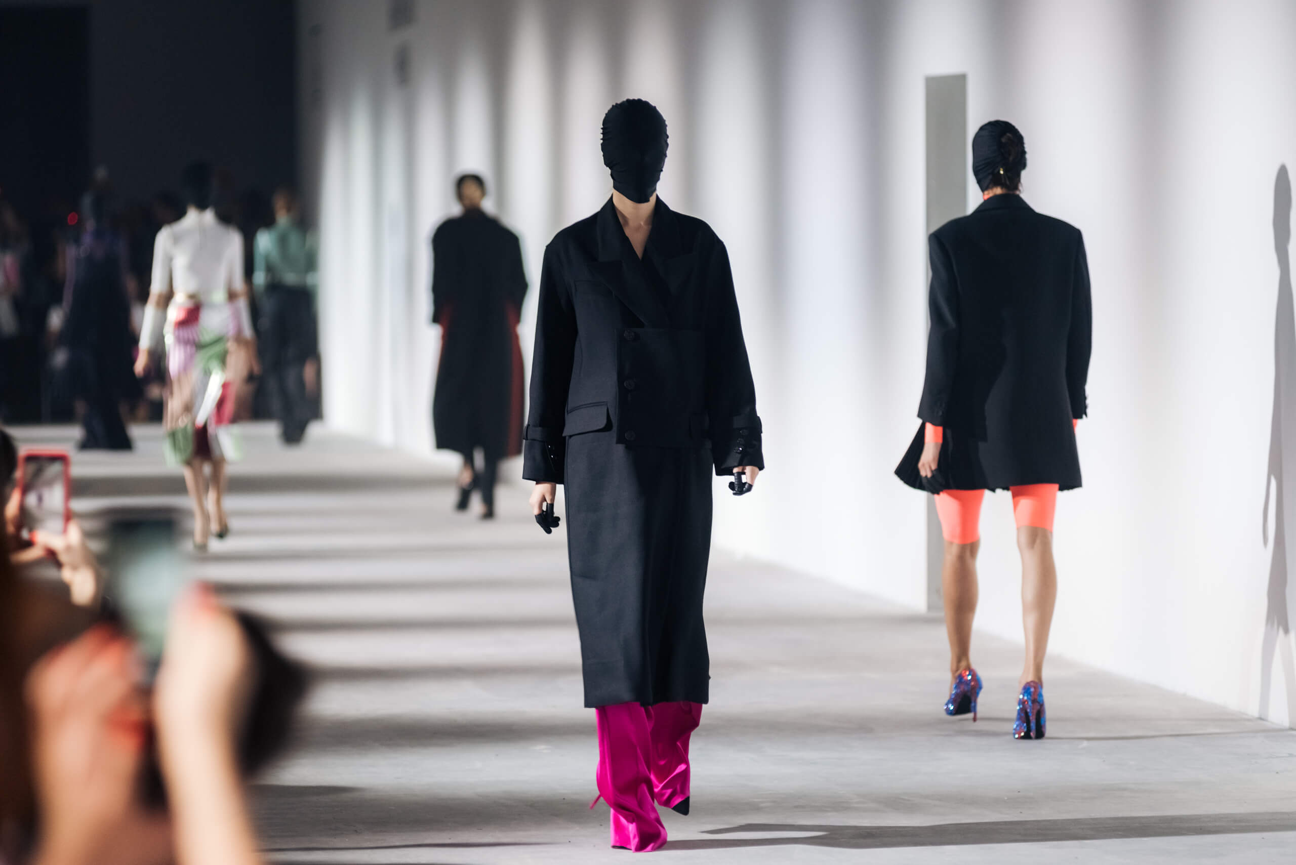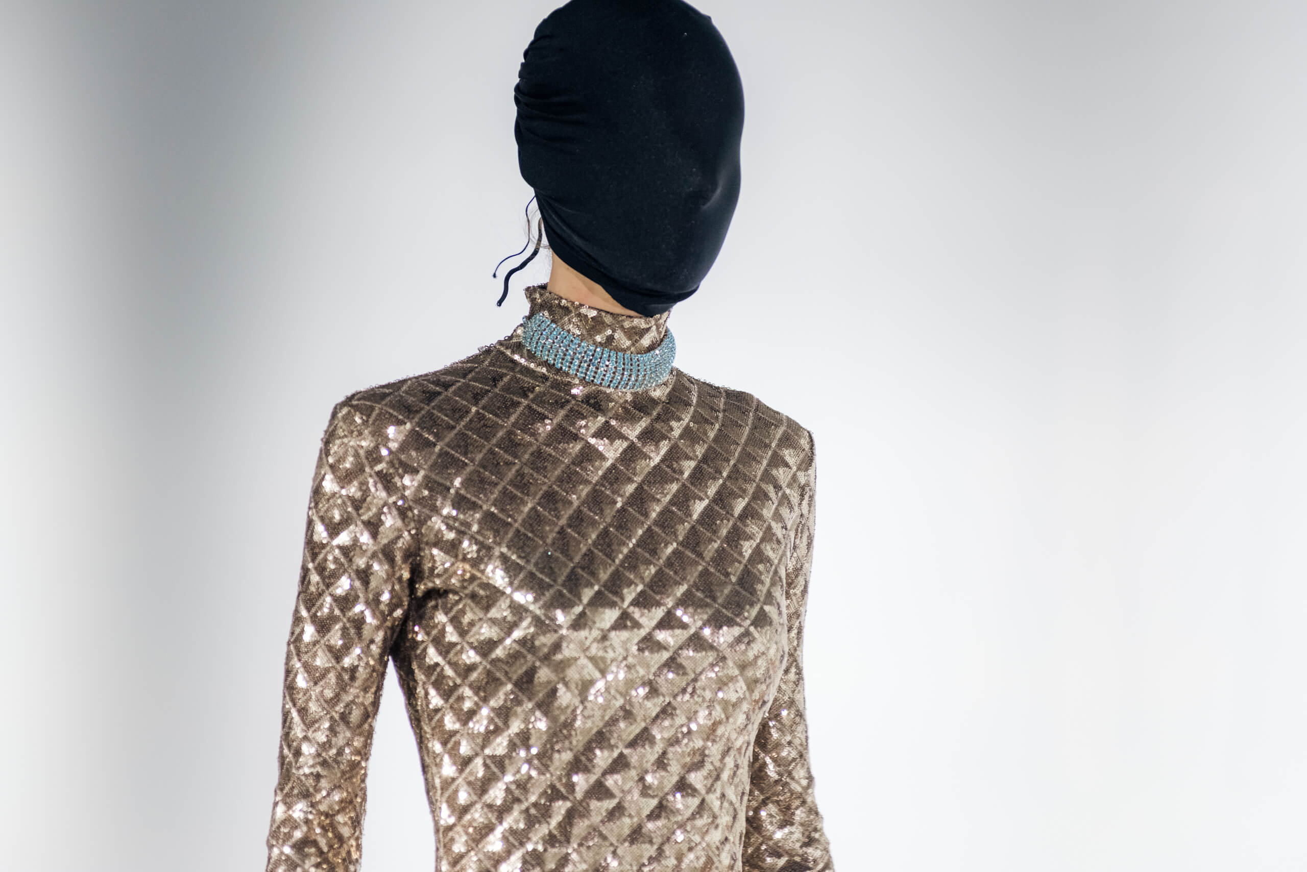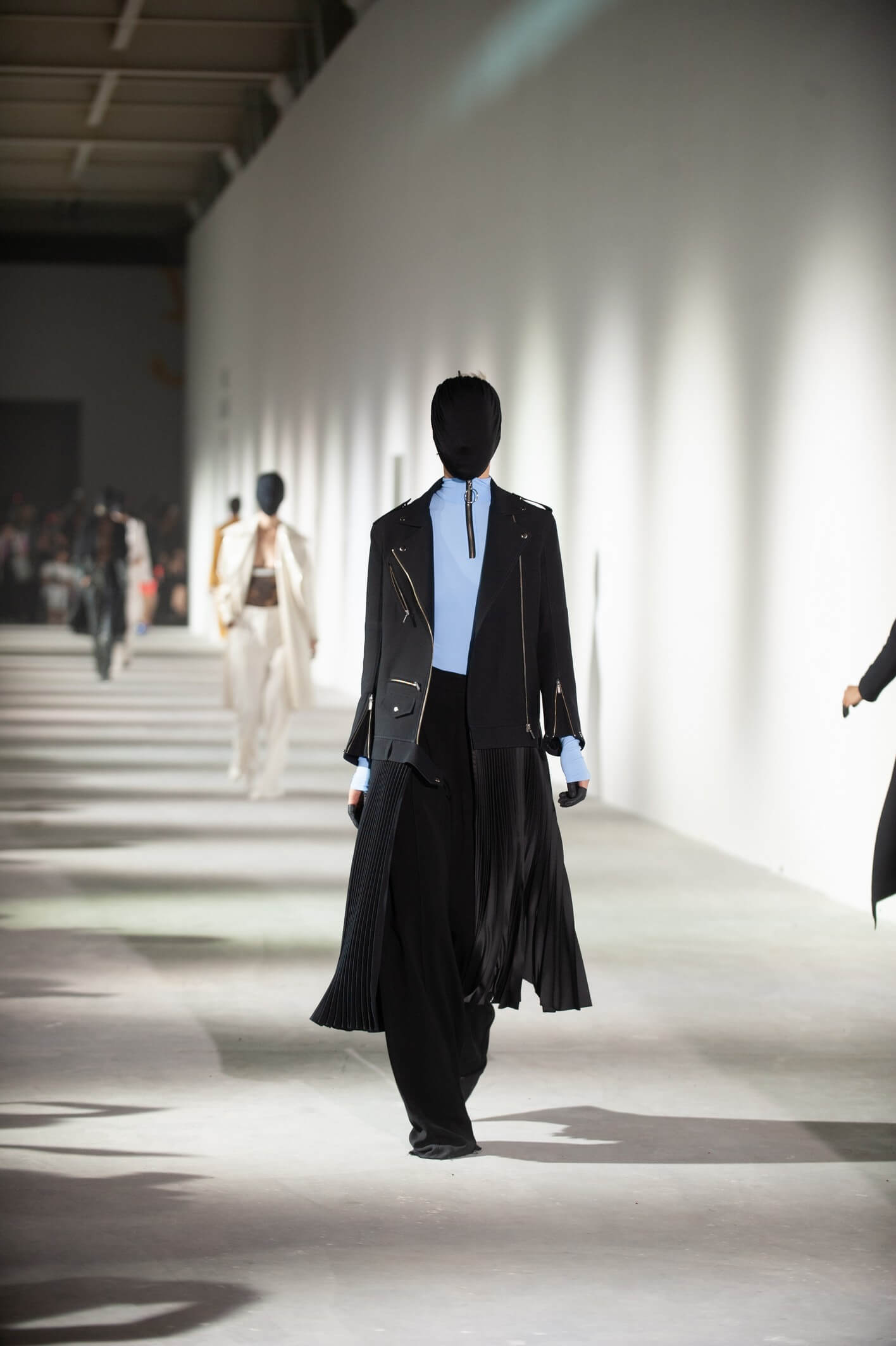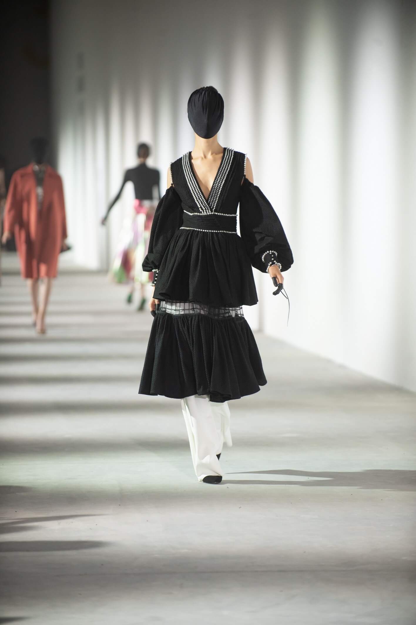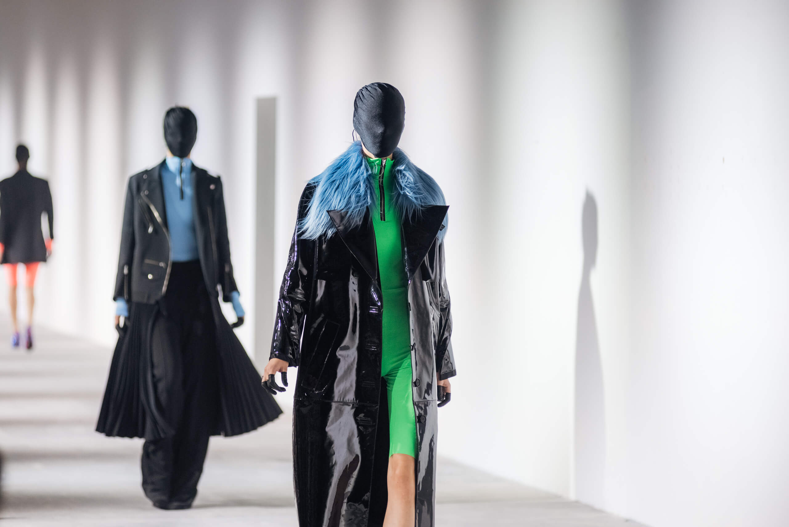 Грузинский дизайнер Лаша Мдинарадзе вот уже почти 5 лет проповедует эстетику модного сюрреализма. Настоящим символом бренда Gudu стала антропоморфная фигура модели с полностью закрытым лицом - как-будто фантазия об оживающих в ночных витринах манекенах. Потусторонние персонажи, будто тени сновали по подиуму и в этот раз. На загадочных созданиях-моделях были юбки-миди из плиссированной блестящей эко-кожи, лаковые тренчи с контрастным декором из перьев, объёмные твидовые жакеты в духе Джеки Кеннеди и силуэтные костюмы, ставшие знаковыми для коллекций дизайнера.