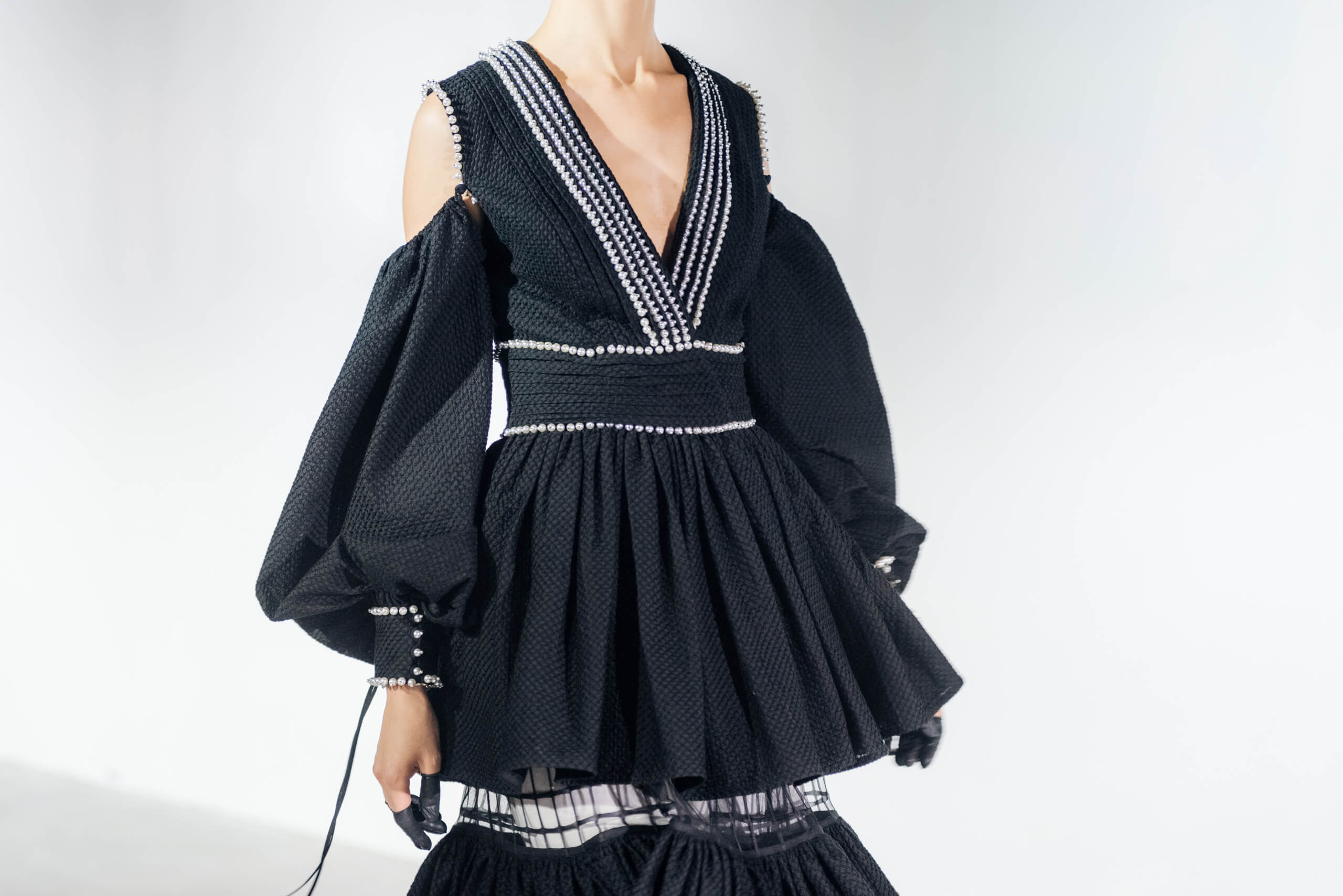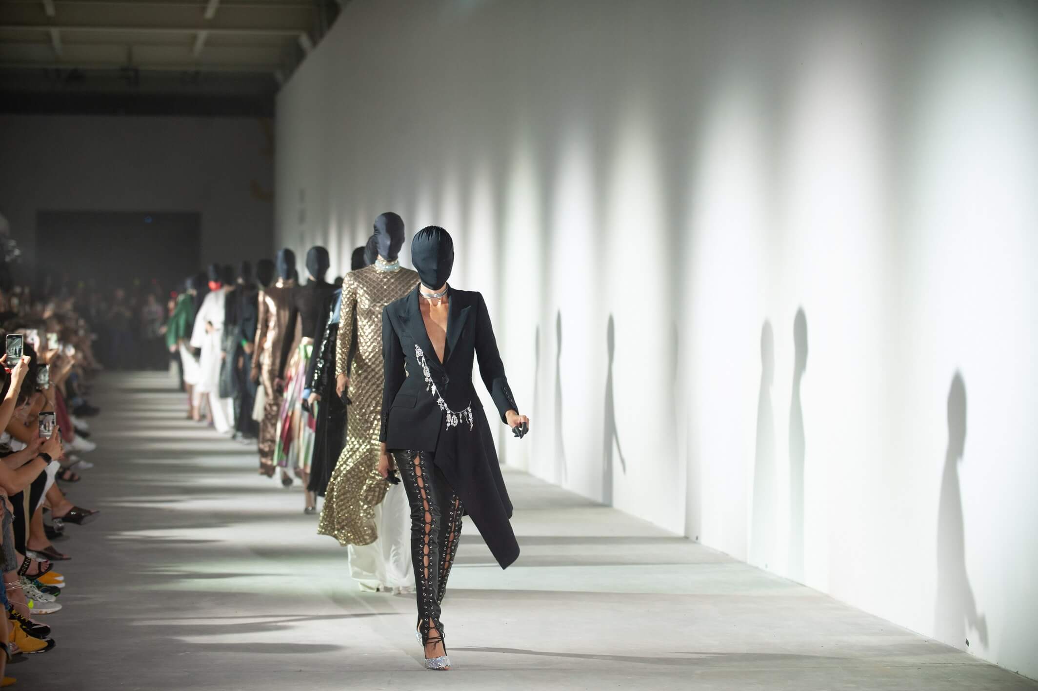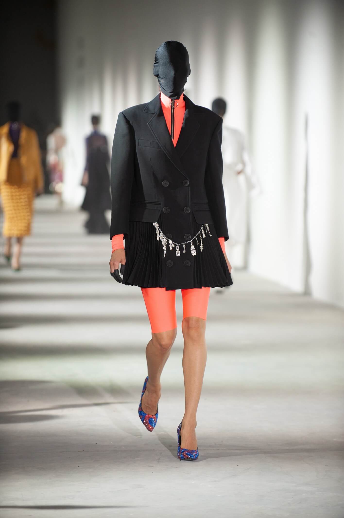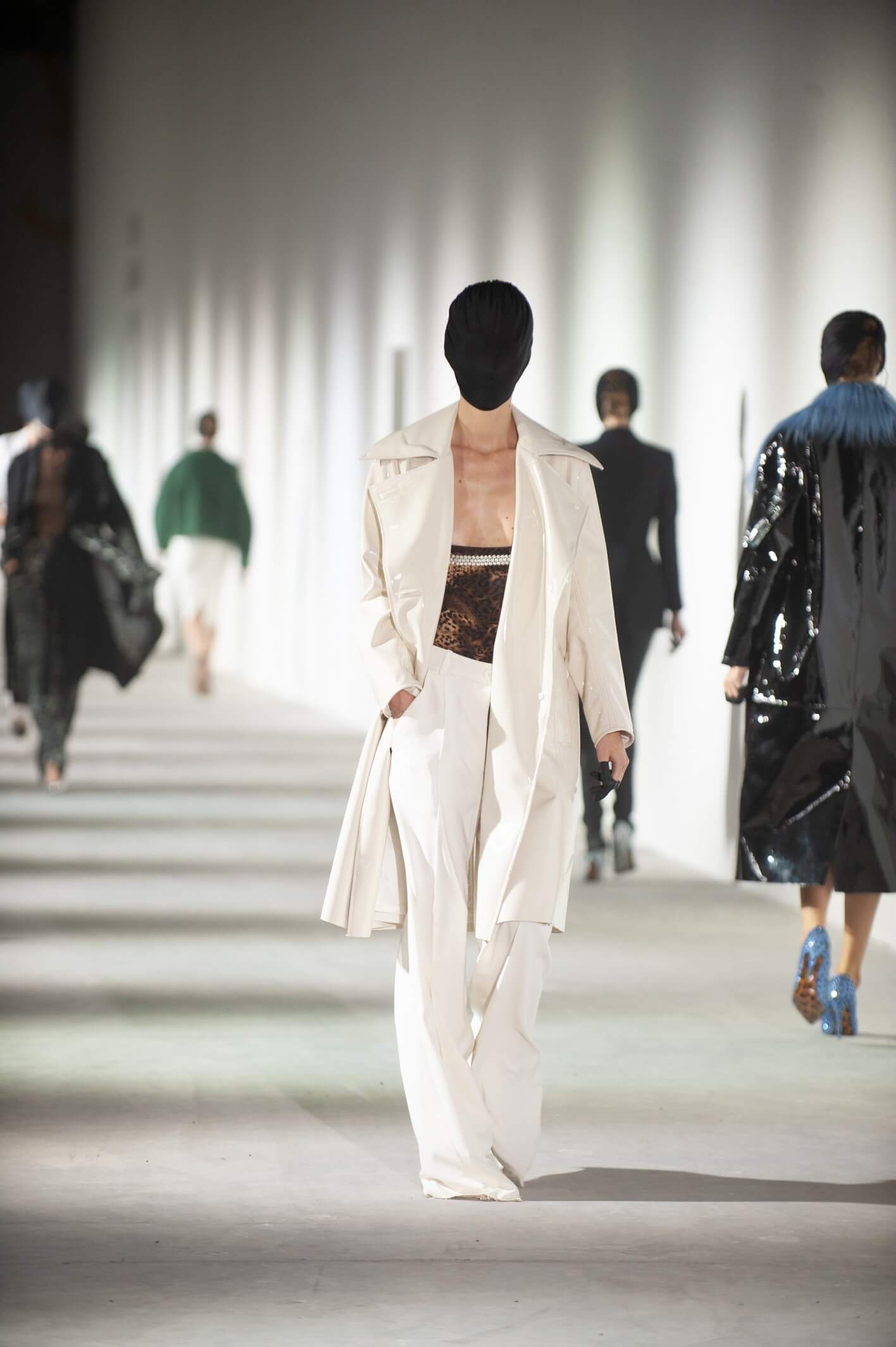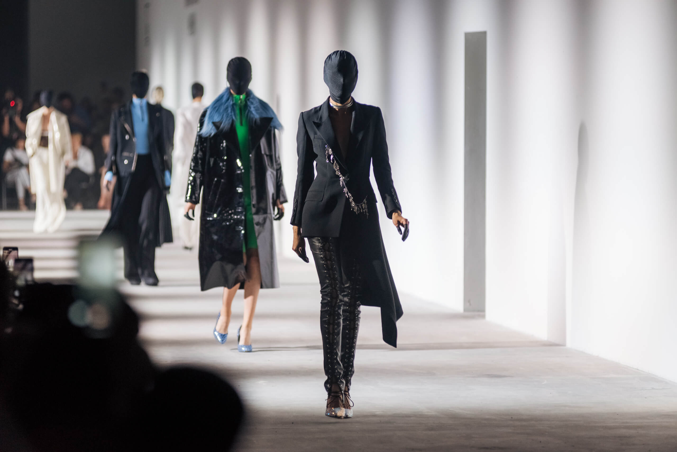 Грузинский дизайнер Лаша Мдинарадзе вот уже почти 5 лет проповедует эстетику модного сюрреализма. Настоящим символом бренда Gudu стала антропоморфная фигура модели с полностью закрытым лицом - как-будто фантазия об оживающих в ночных витринах манекенах. Потусторонние персонажи, будто тени сновали по подиуму и в этот раз. На загадочных созданиях-моделях были юбки-миди из плиссированной блестящей эко-кожи, лаковые тренчи с контрастным декором из перьев, объёмные твидовые жакеты в духе Джеки Кеннеди и силуэтные костюмы, ставшие знаковыми для коллекций дизайнера.