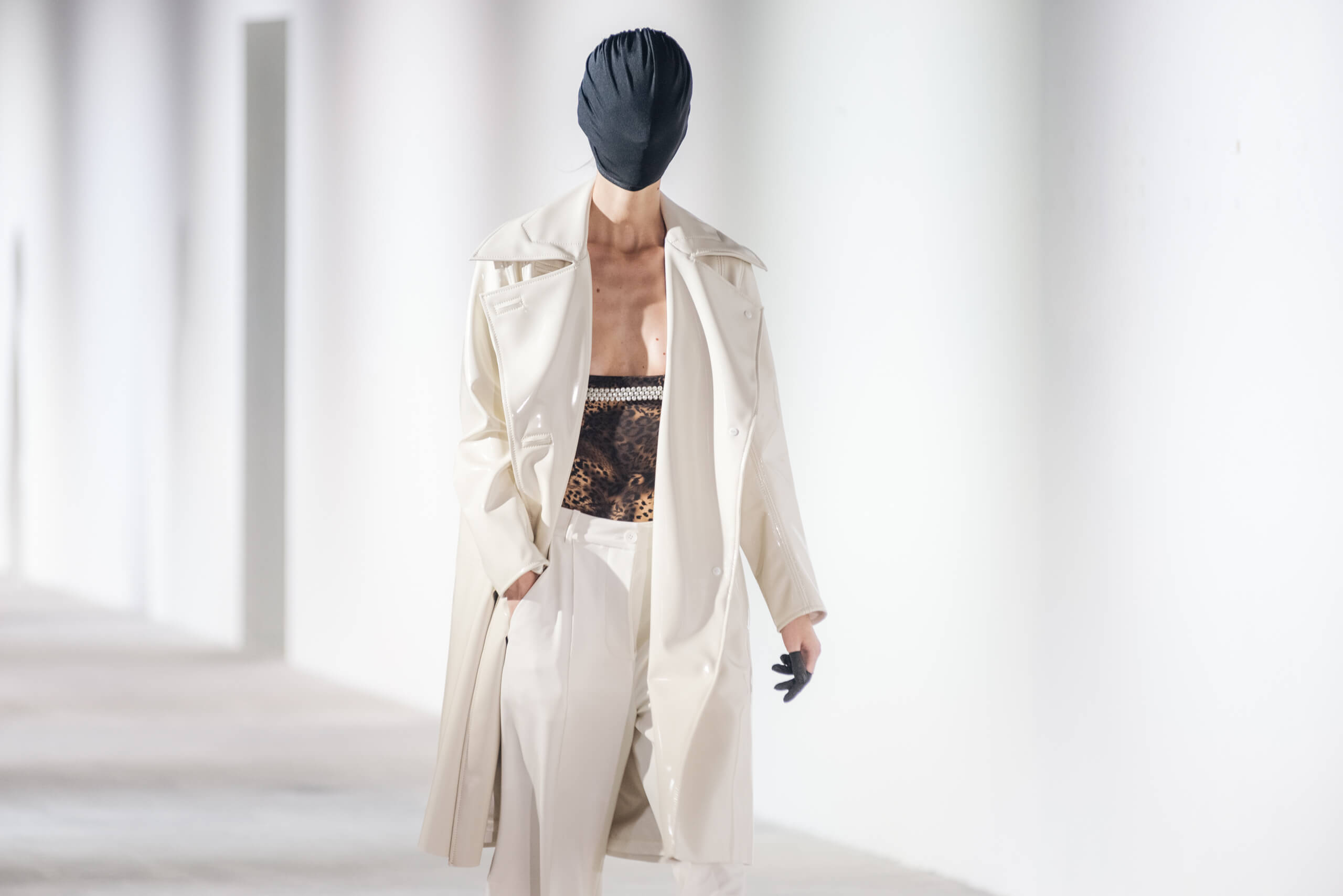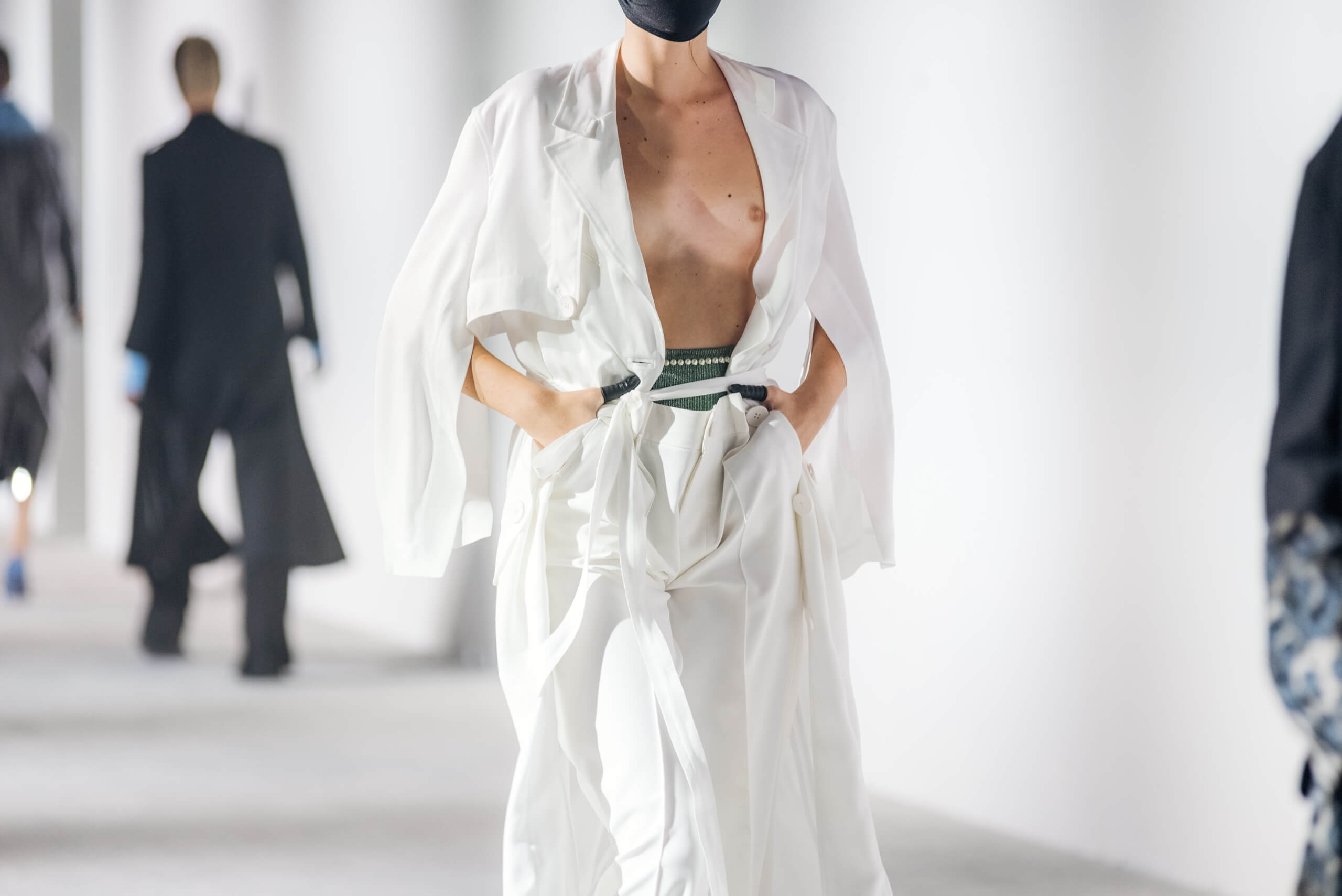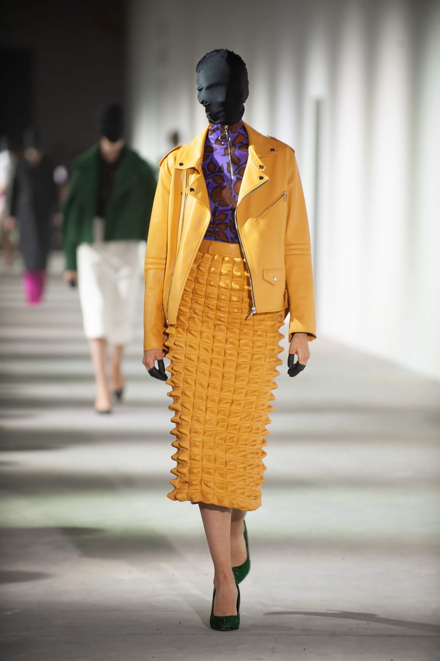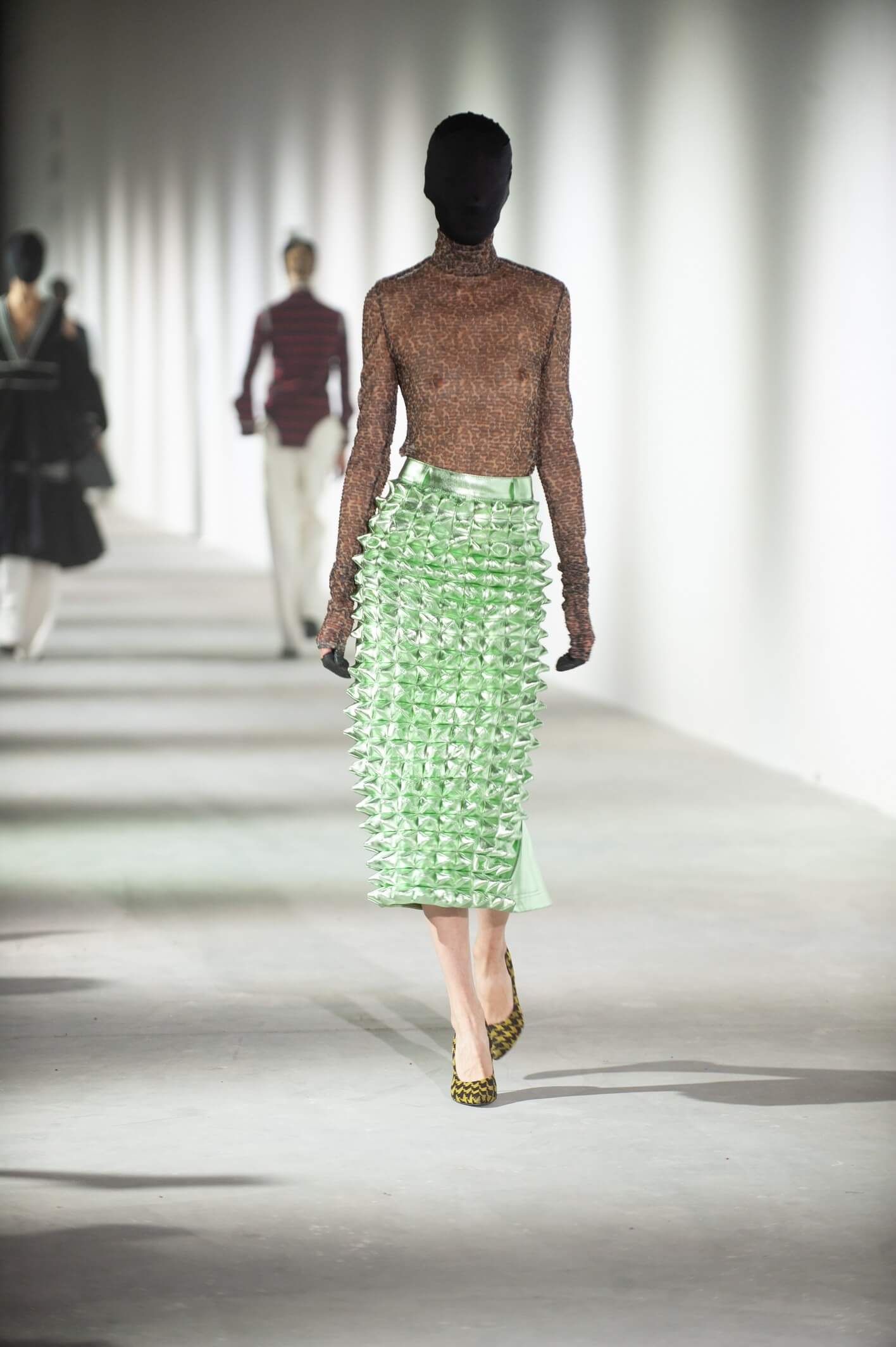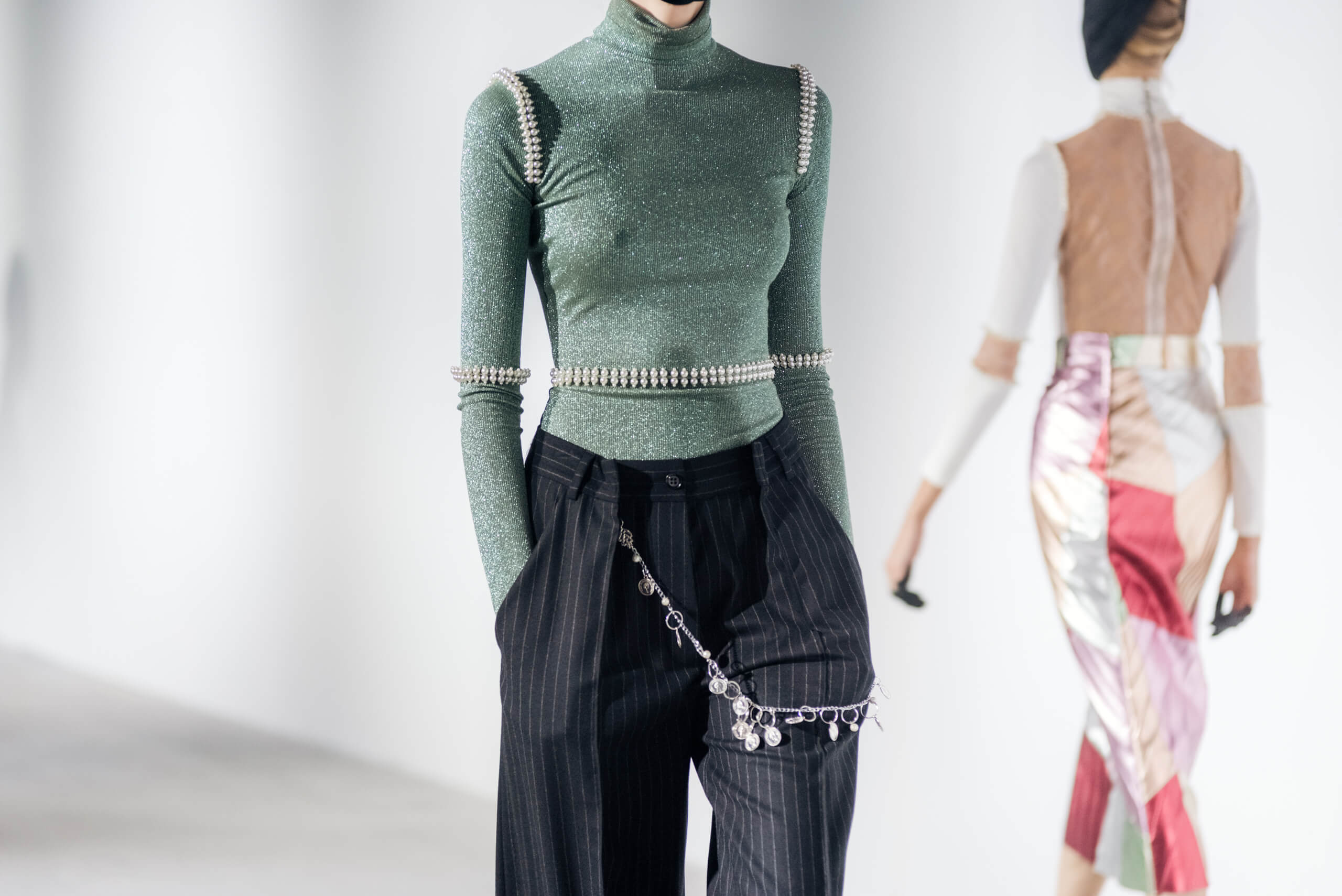 Грузинский дизайнер Лаша Мдинарадзе вот уже почти 5 лет проповедует эстетику модного сюрреализма. Настоящим символом бренда Gudu стала антропоморфная фигура модели с полностью закрытым лицом - как-будто фантазия об оживающих в ночных витринах манекенах. Потусторонние персонажи, будто тени сновали по подиуму и в этот раз. На загадочных созданиях-моделях были юбки-миди из плиссированной блестящей эко-кожи, лаковые тренчи с контрастным декором из перьев, объёмные твидовые жакеты в духе Джеки Кеннеди и силуэтные костюмы, ставшие знаковыми для коллекций дизайнера.