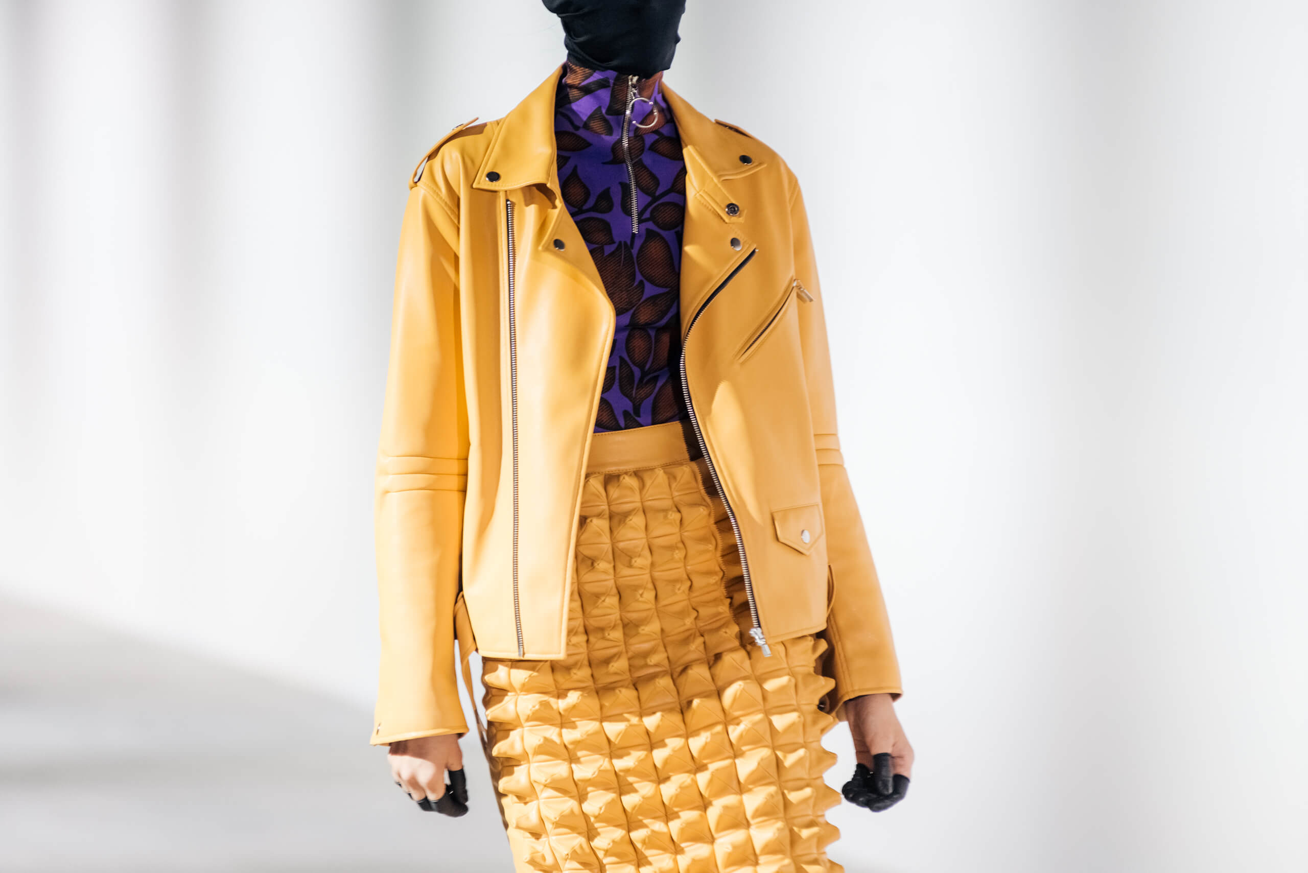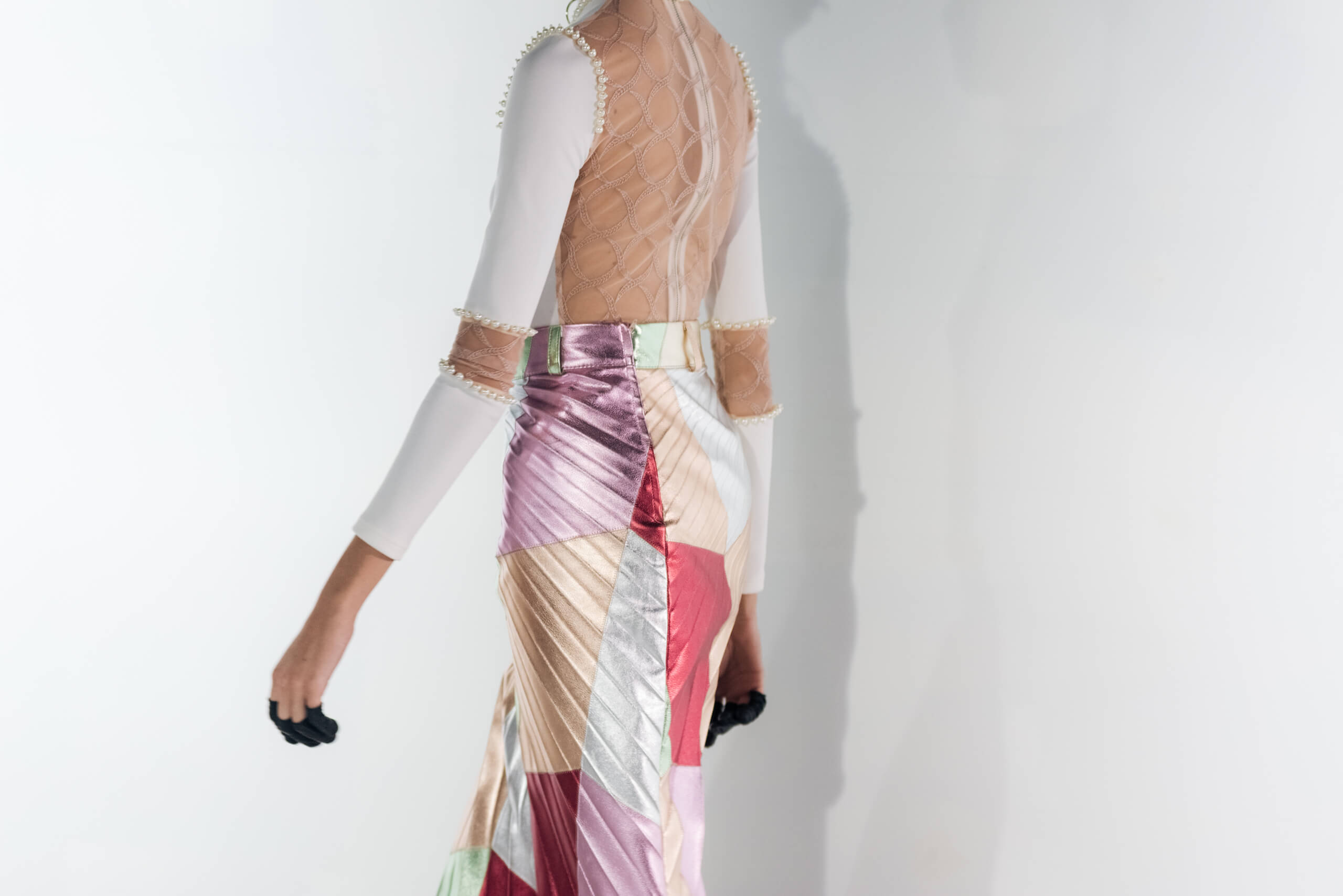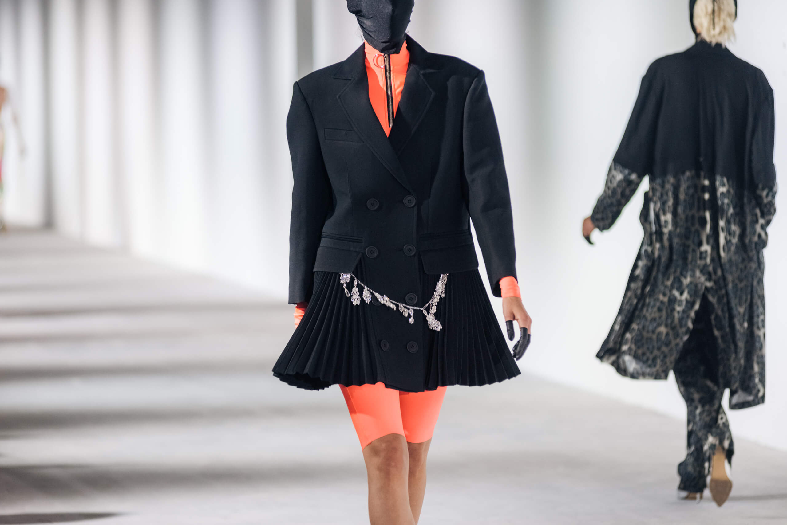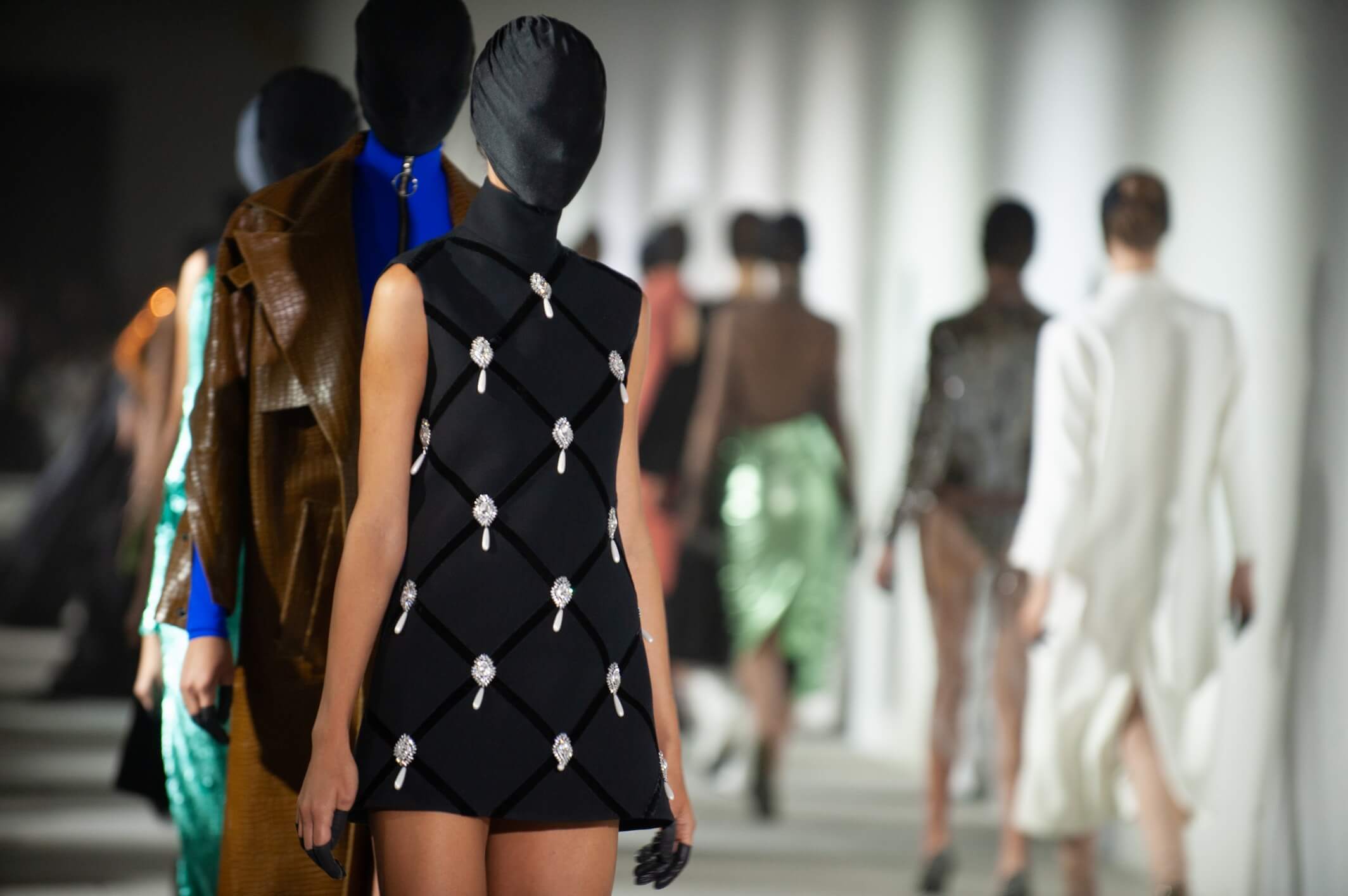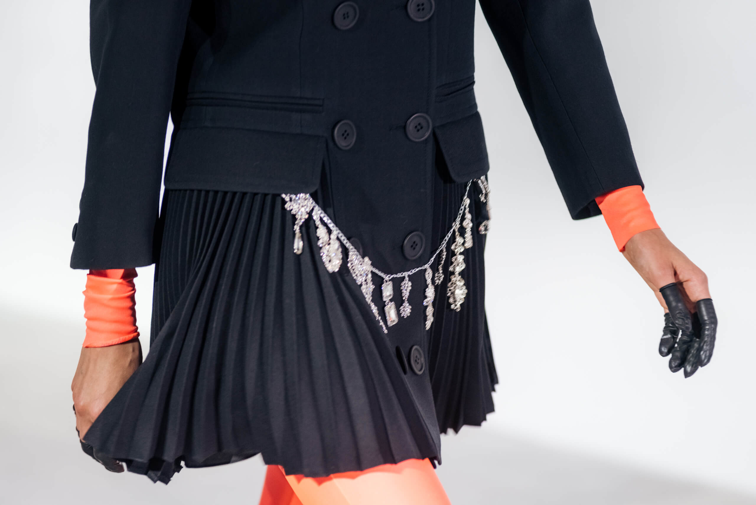 Грузинский дизайнер Лаша Мдинарадзе вот уже почти 5 лет проповедует эстетику модного сюрреализма. Настоящим символом бренда Gudu стала антропоморфная фигура модели с полностью закрытым лицом - как-будто фантазия об оживающих в ночных витринах манекенах. Потусторонние персонажи, будто тени сновали по подиуму и в этот раз. На загадочных созданиях-моделях были юбки-миди из плиссированной блестящей эко-кожи, лаковые тренчи с контрастным декором из перьев, объёмные твидовые жакеты в духе Джеки Кеннеди и силуэтные костюмы, ставшие знаковыми для коллекций дизайнера.