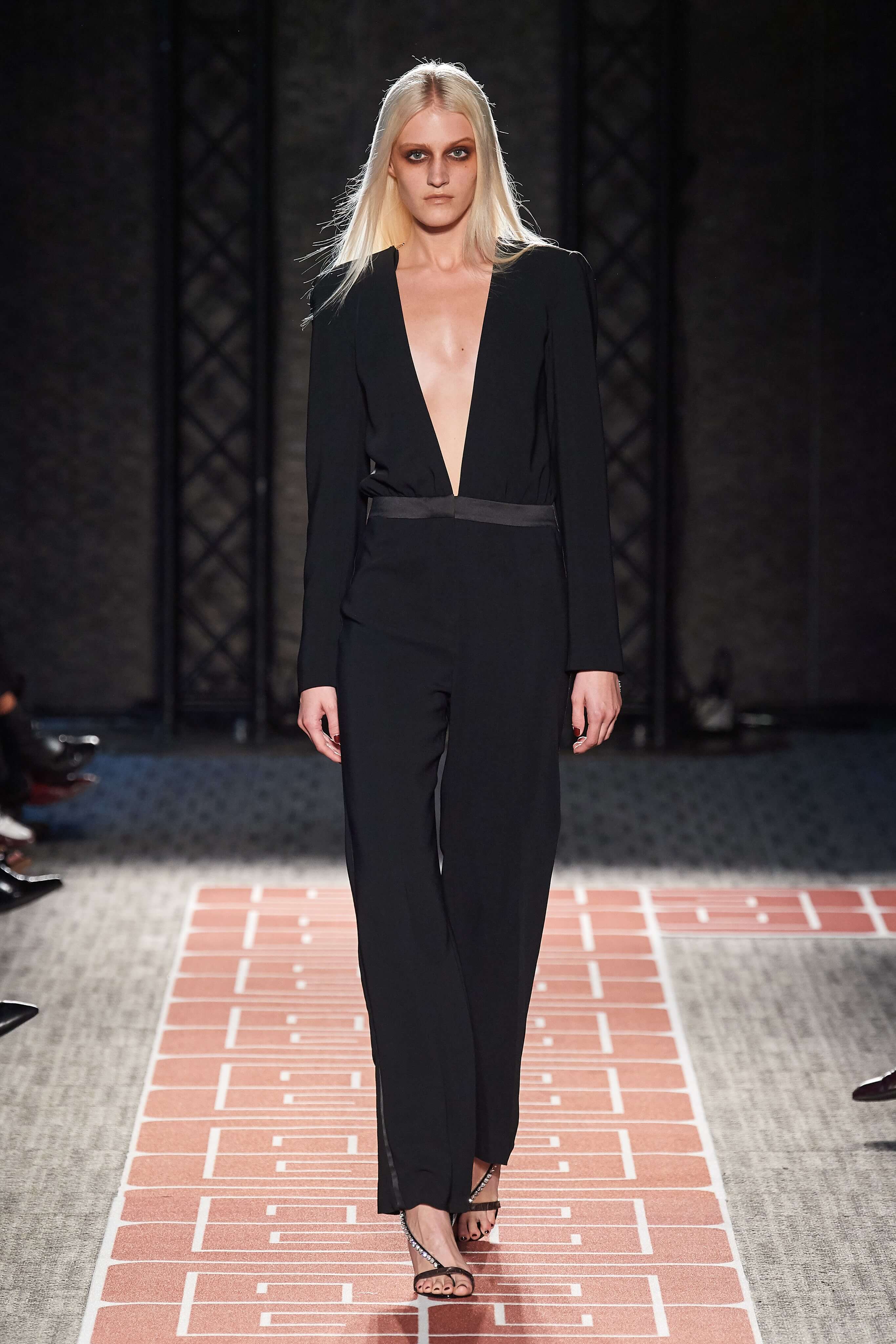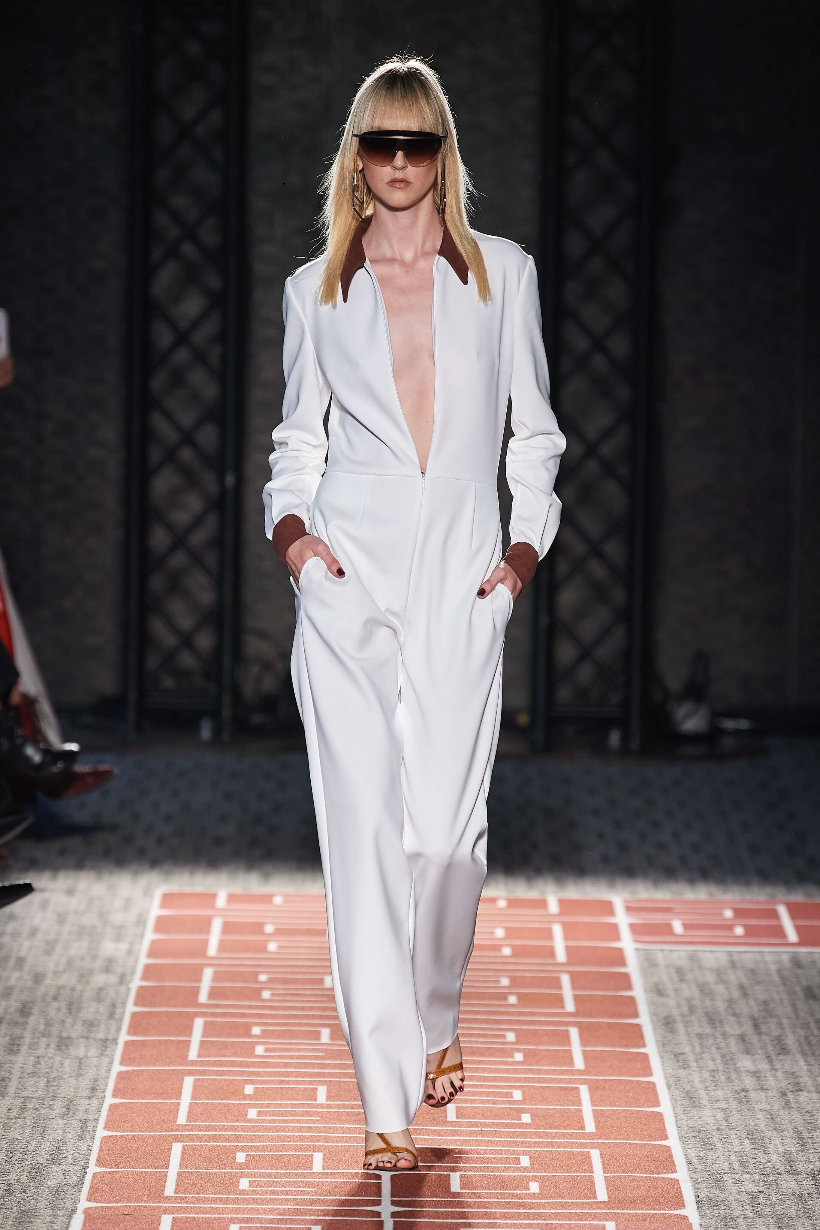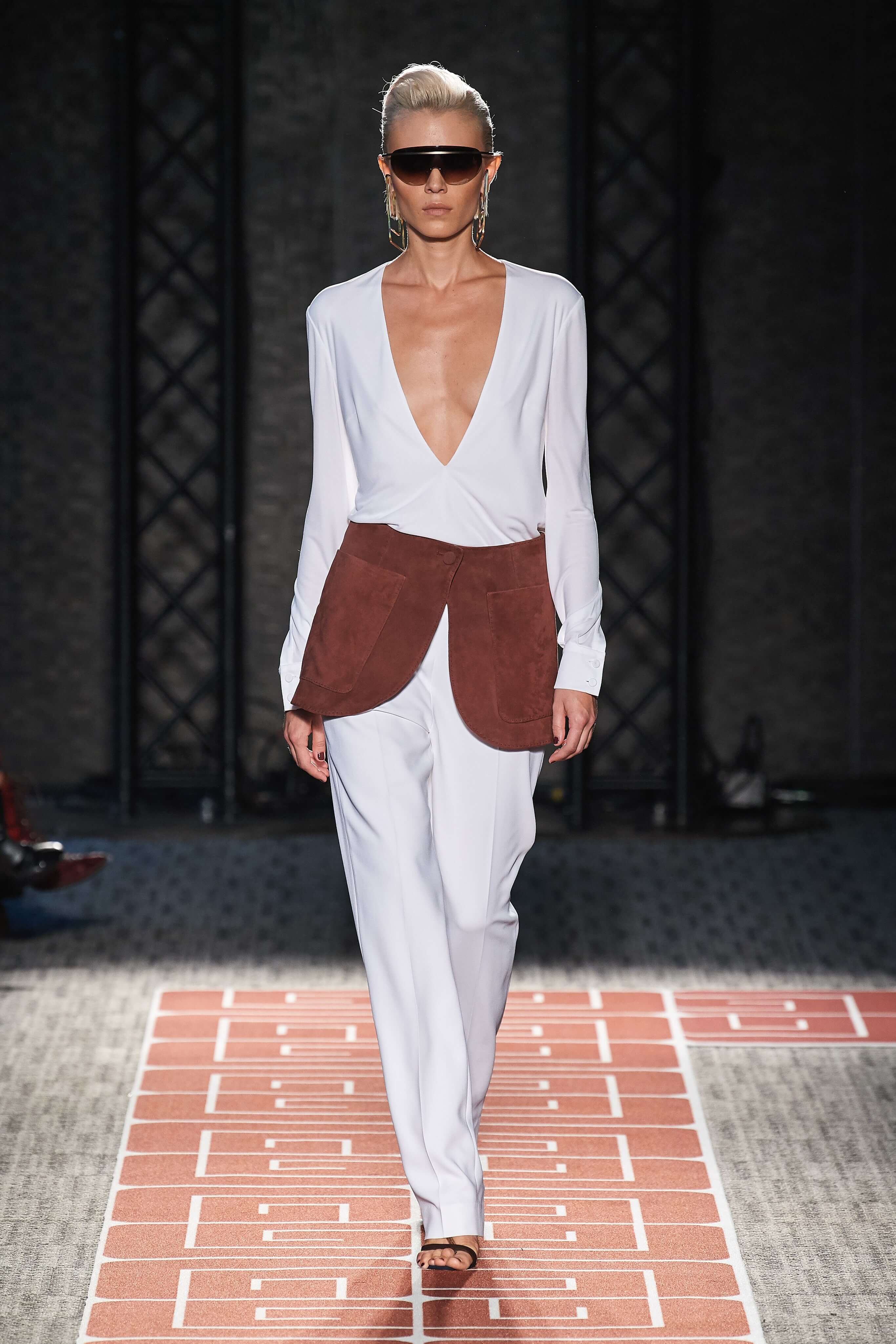 Раскованный стиль и буржуазная элегантность, которыми славились лучшие представители секс-индустрии, нашли воплощение в лощеных силуэтах и чистых линиях кроя коллекции. Белые комбинезоны и скромные платья-рубашки чередовались на подиуме с соблазнительными нарядами из летящих тканей с круглыми вырезами, обнажающими разные участки тела, пальто прямых силуэтов, в которых ходила бы сама Джеки Кеннеди, сменяли топы и комбинезоны с глубокими вырезами. В руках модели несли неброские, практичные дипломаты и вместительные сумки.