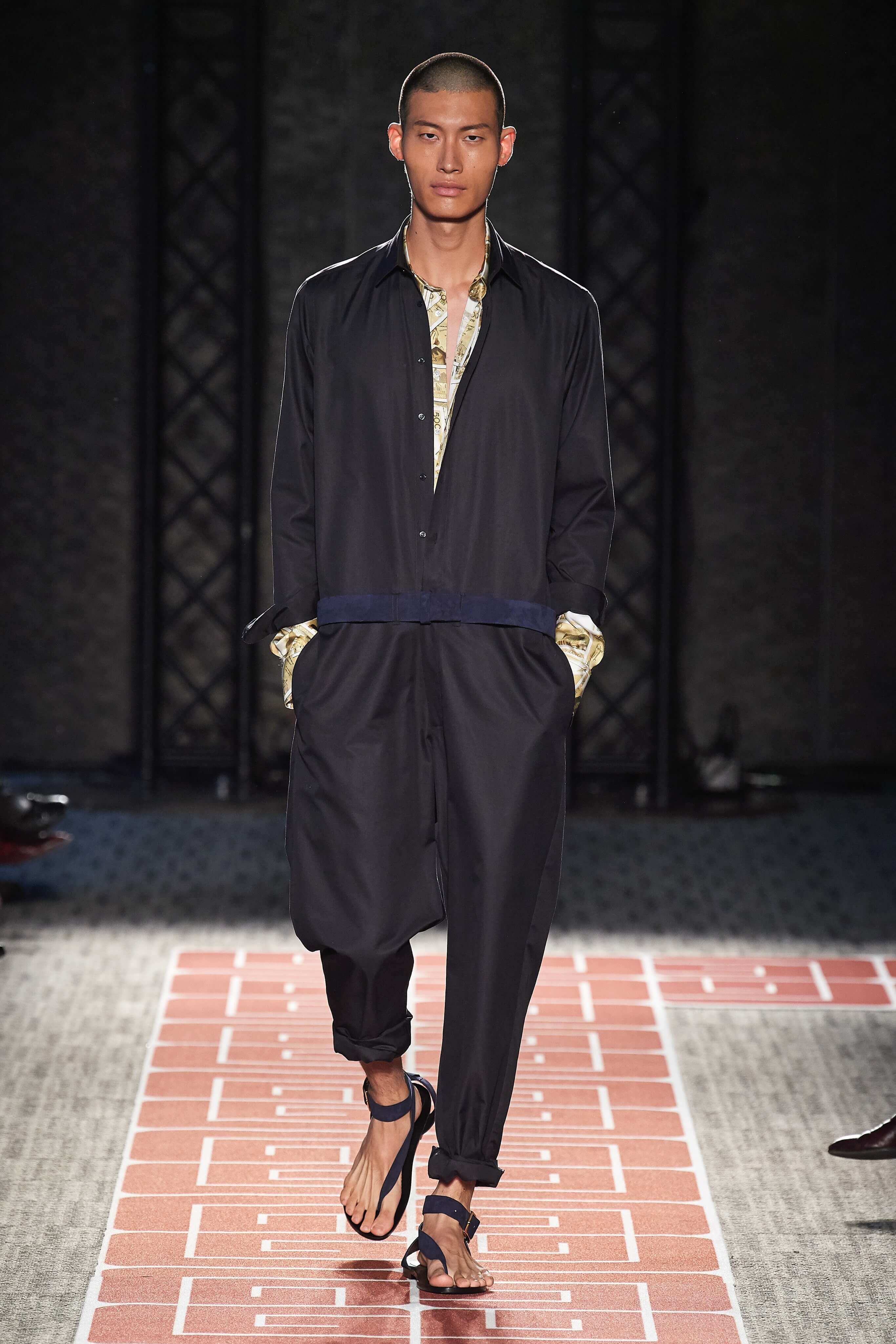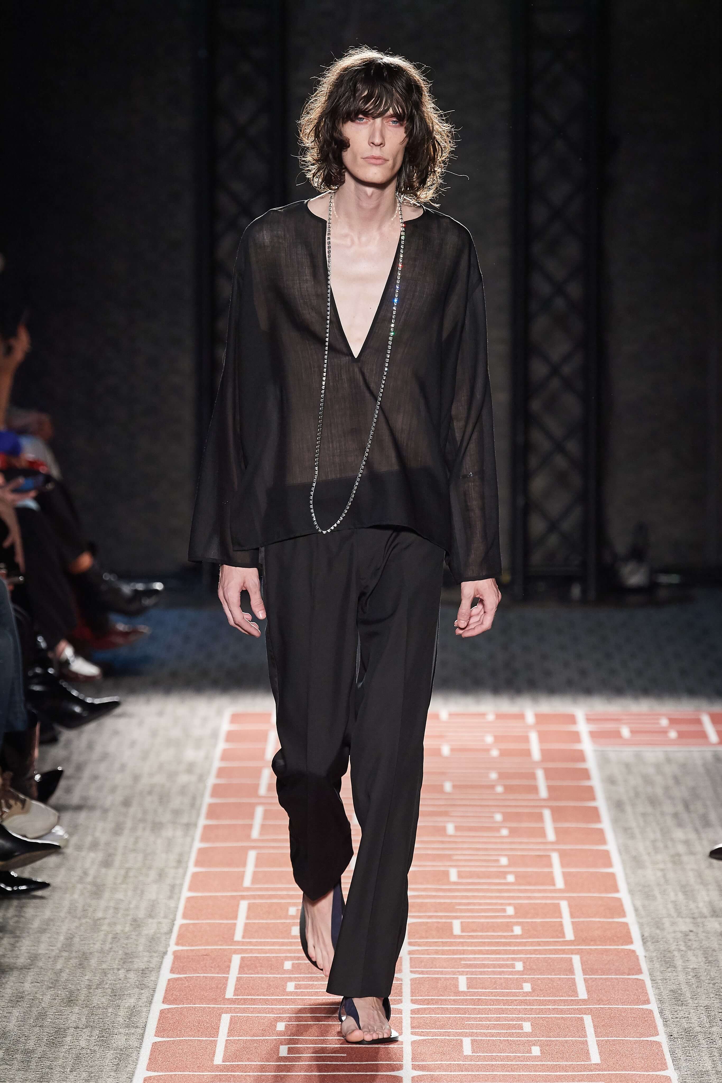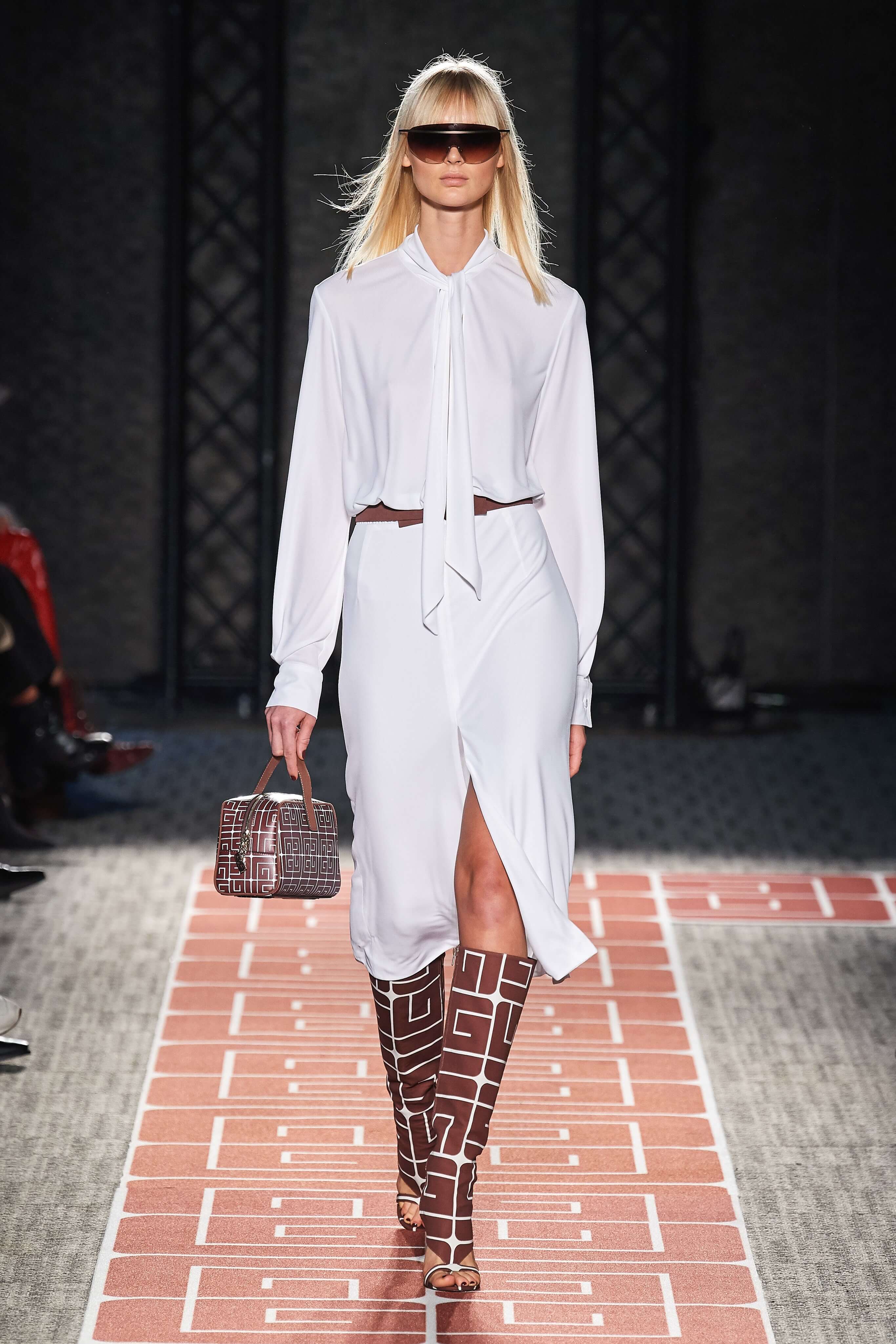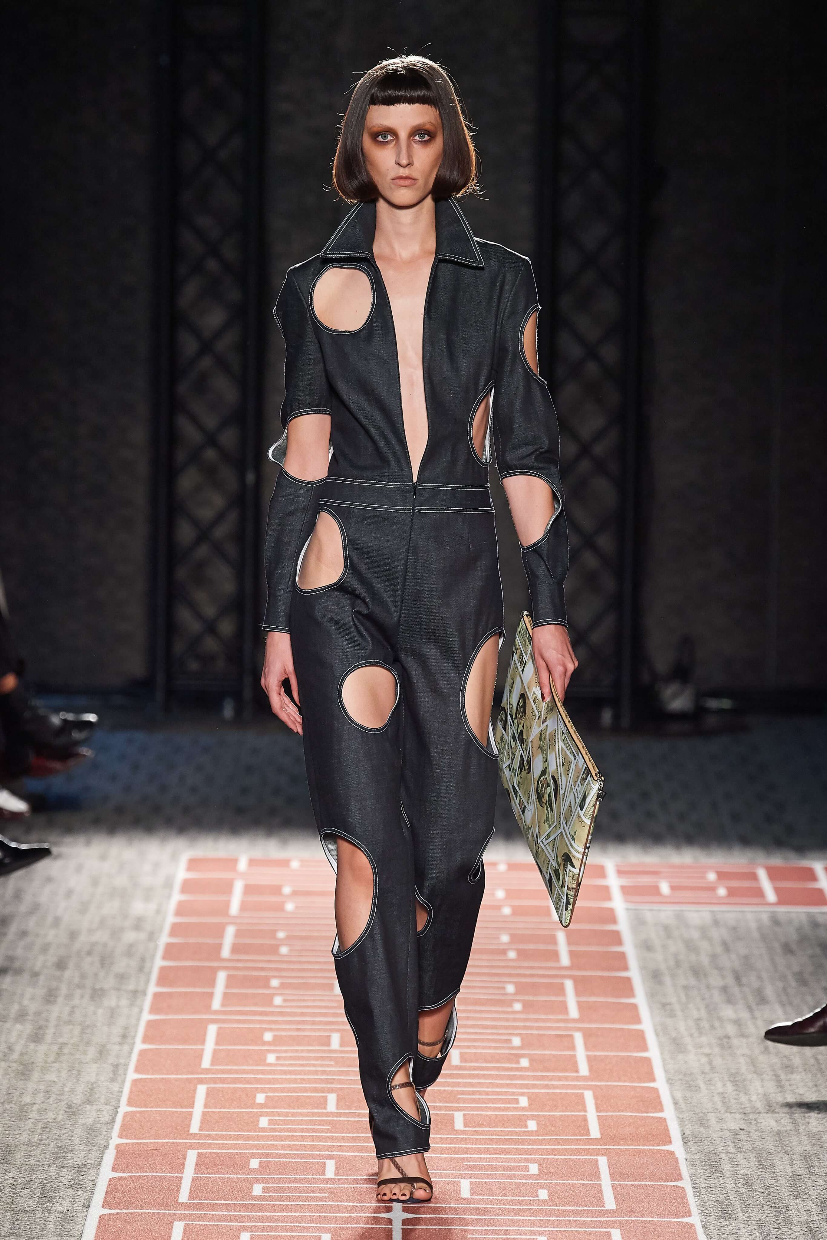 Раскованный стиль и буржуазная элегантность, которыми славились лучшие представители секс-индустрии, нашли воплощение в лощеных силуэтах и чистых линиях кроя коллекции. Белые комбинезоны и скромные платья-рубашки чередовались на подиуме с соблазнительными нарядами из летящих тканей с круглыми вырезами, обнажающими разные участки тела, пальто прямых силуэтов, в которых ходила бы сама Джеки Кеннеди, сменяли топы и комбинезоны с глубокими вырезами. В руках модели несли неброские, практичные дипломаты и вместительные сумки.