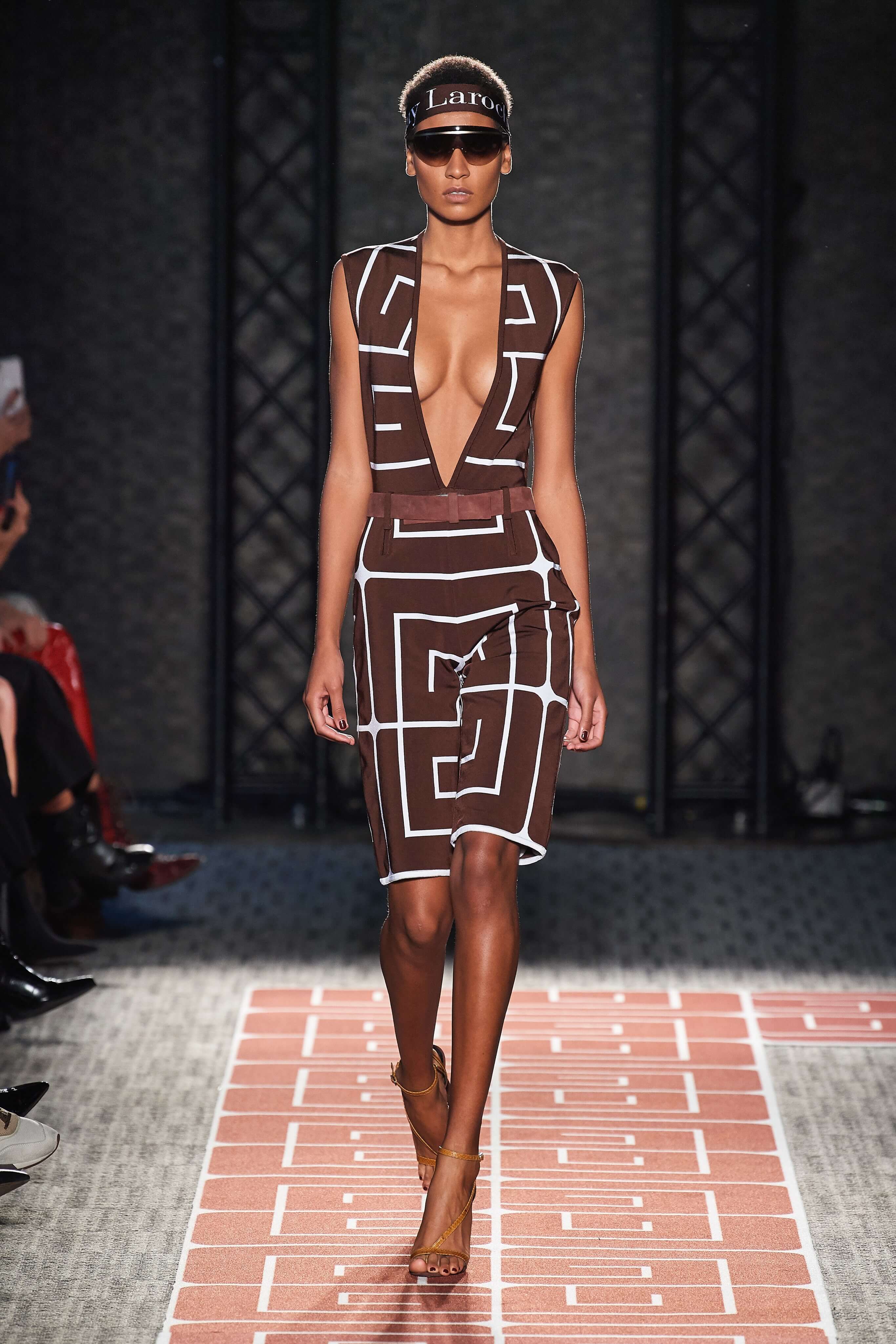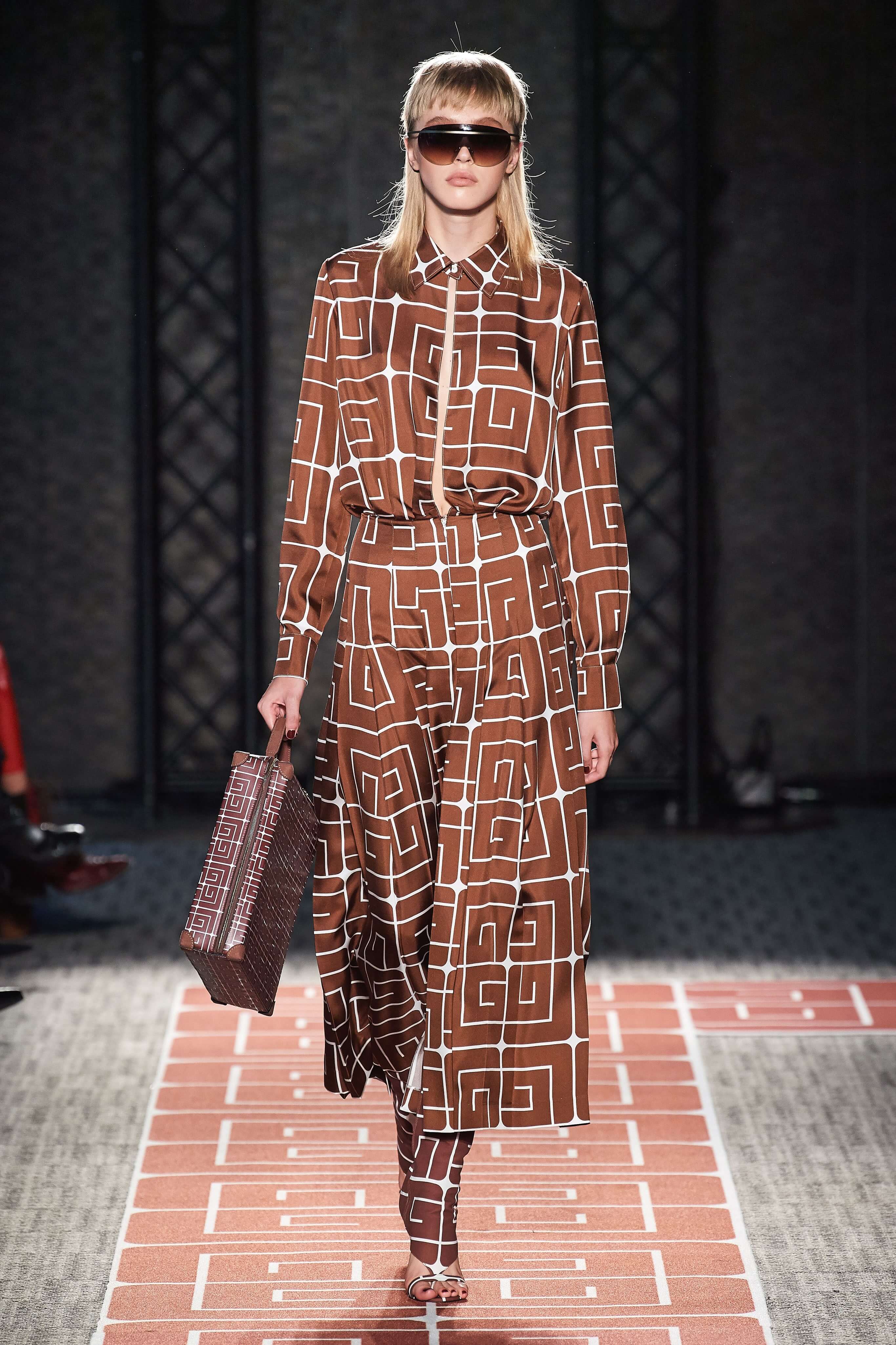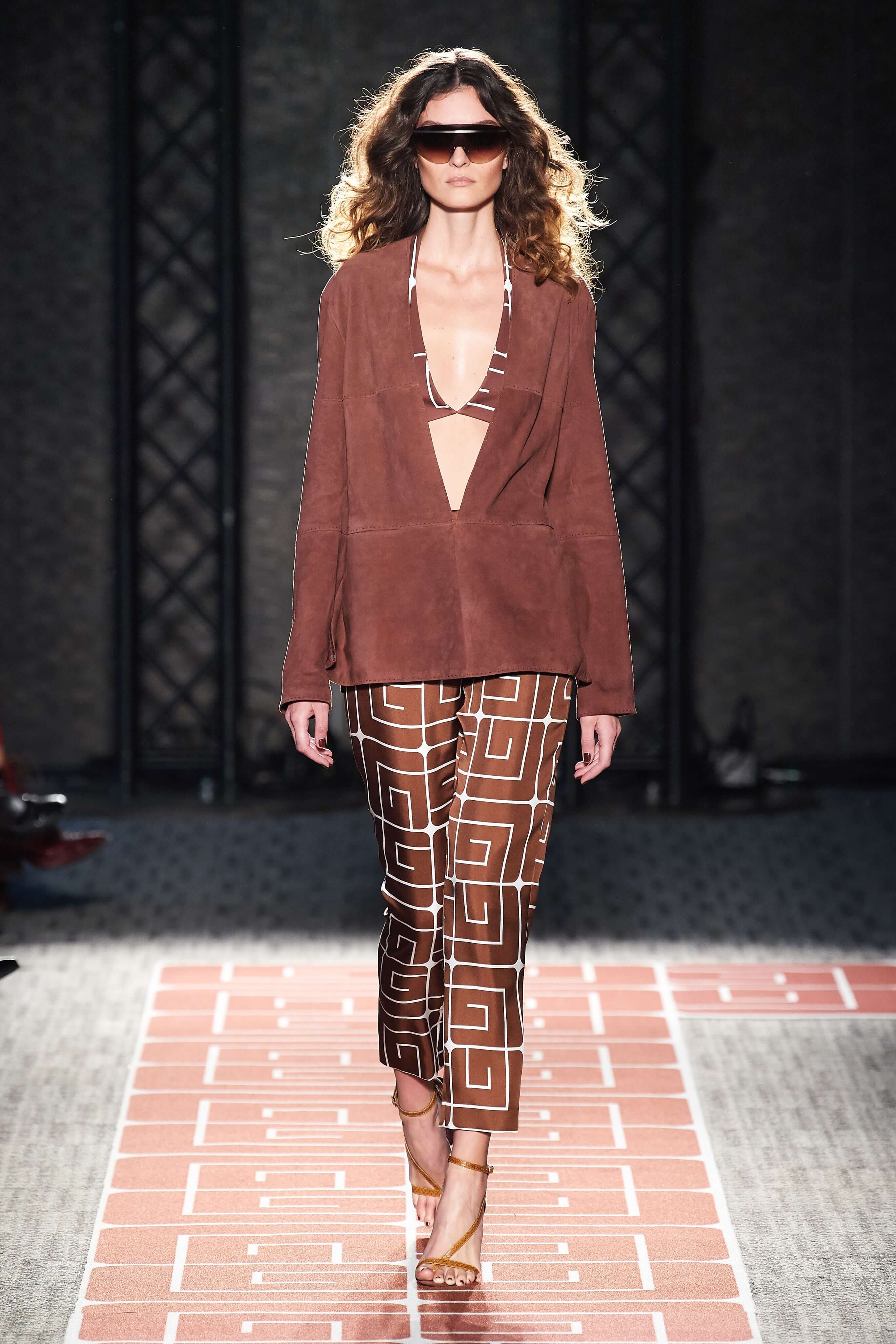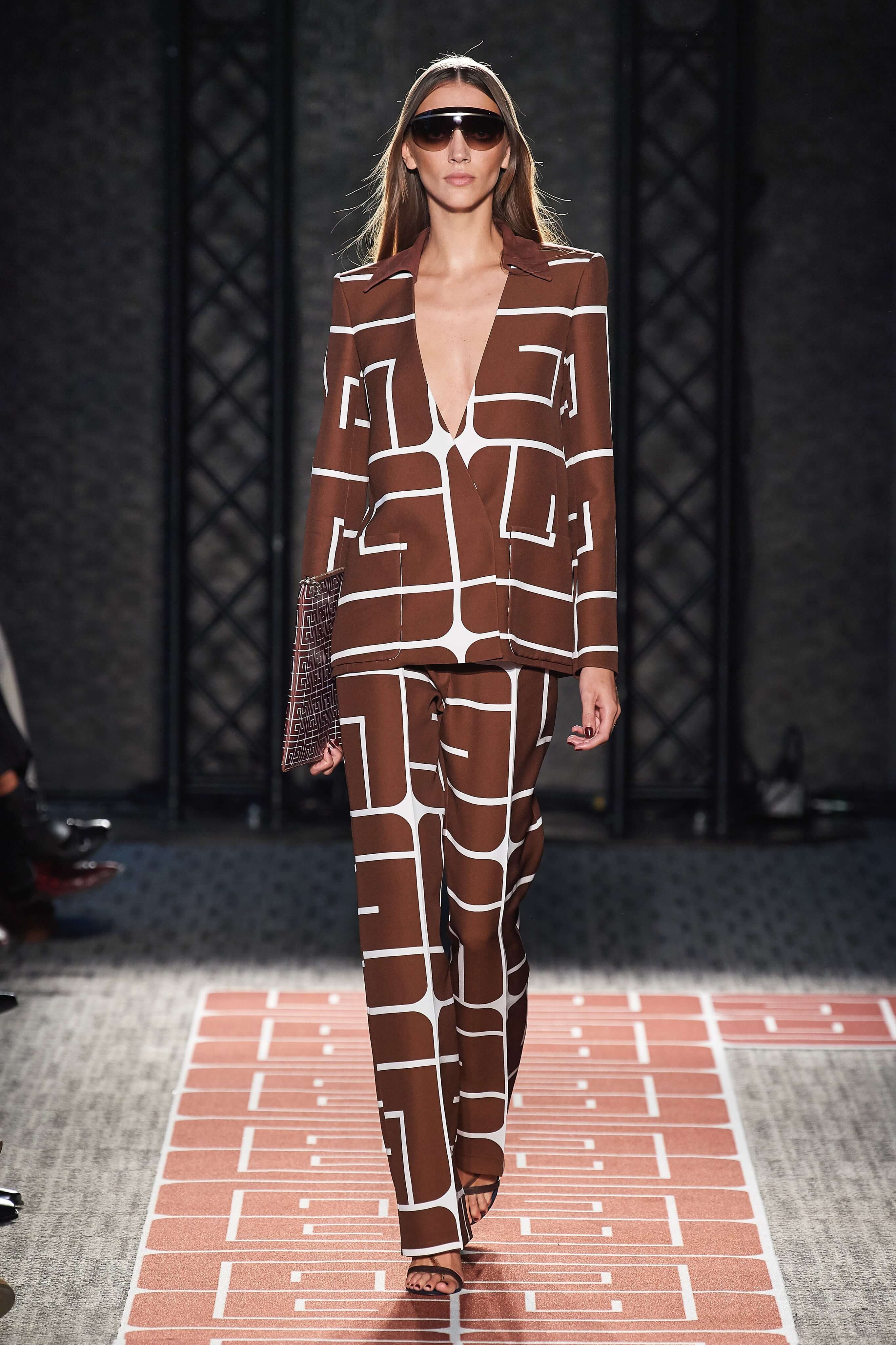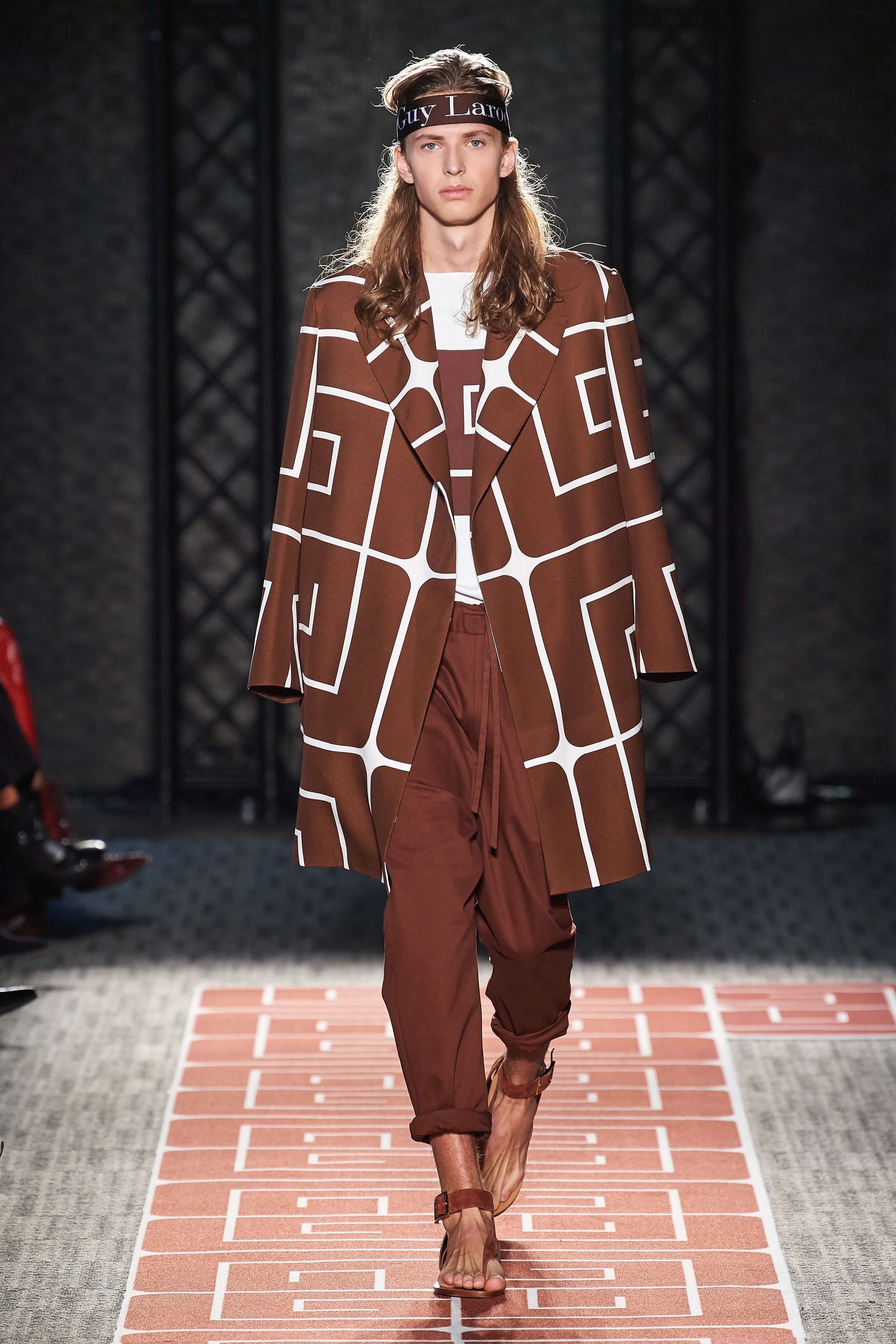 В весенней коллекции Guy Laroche почти все вещи покрыты стилизованным логотипом бренда, выполнены в оттенках корицы, шоколада, черного и белого, и интерпретируют силуэты 70-х.