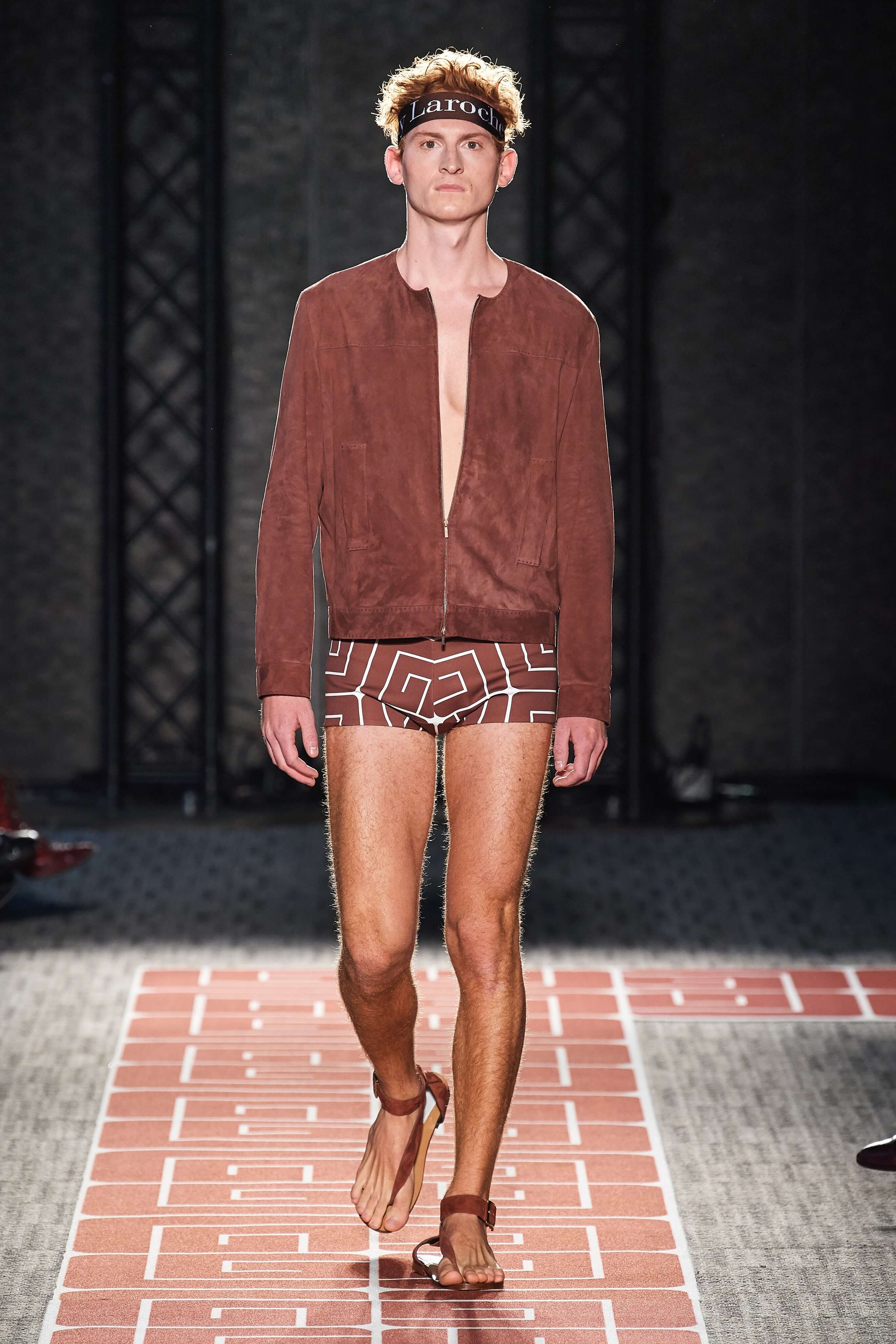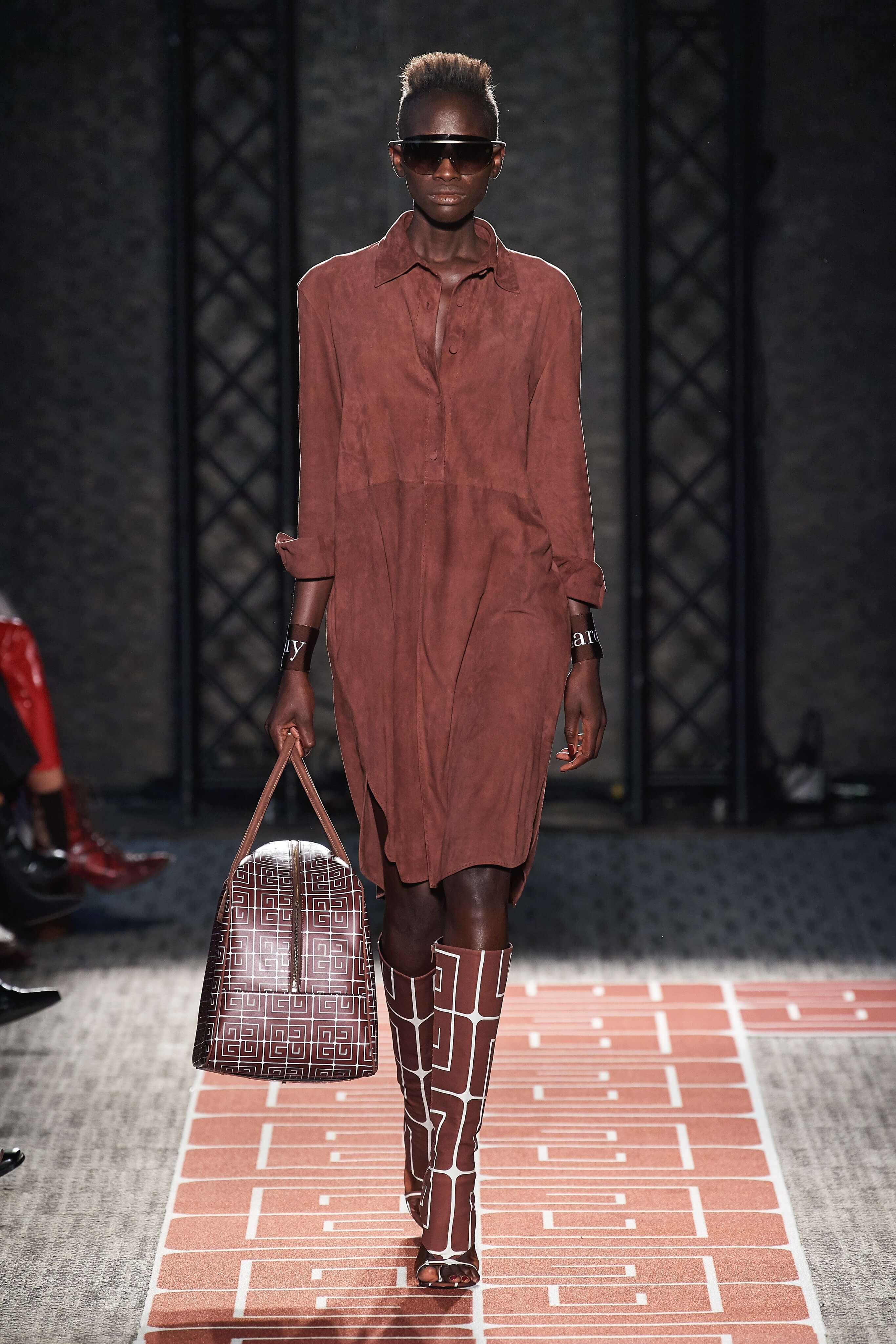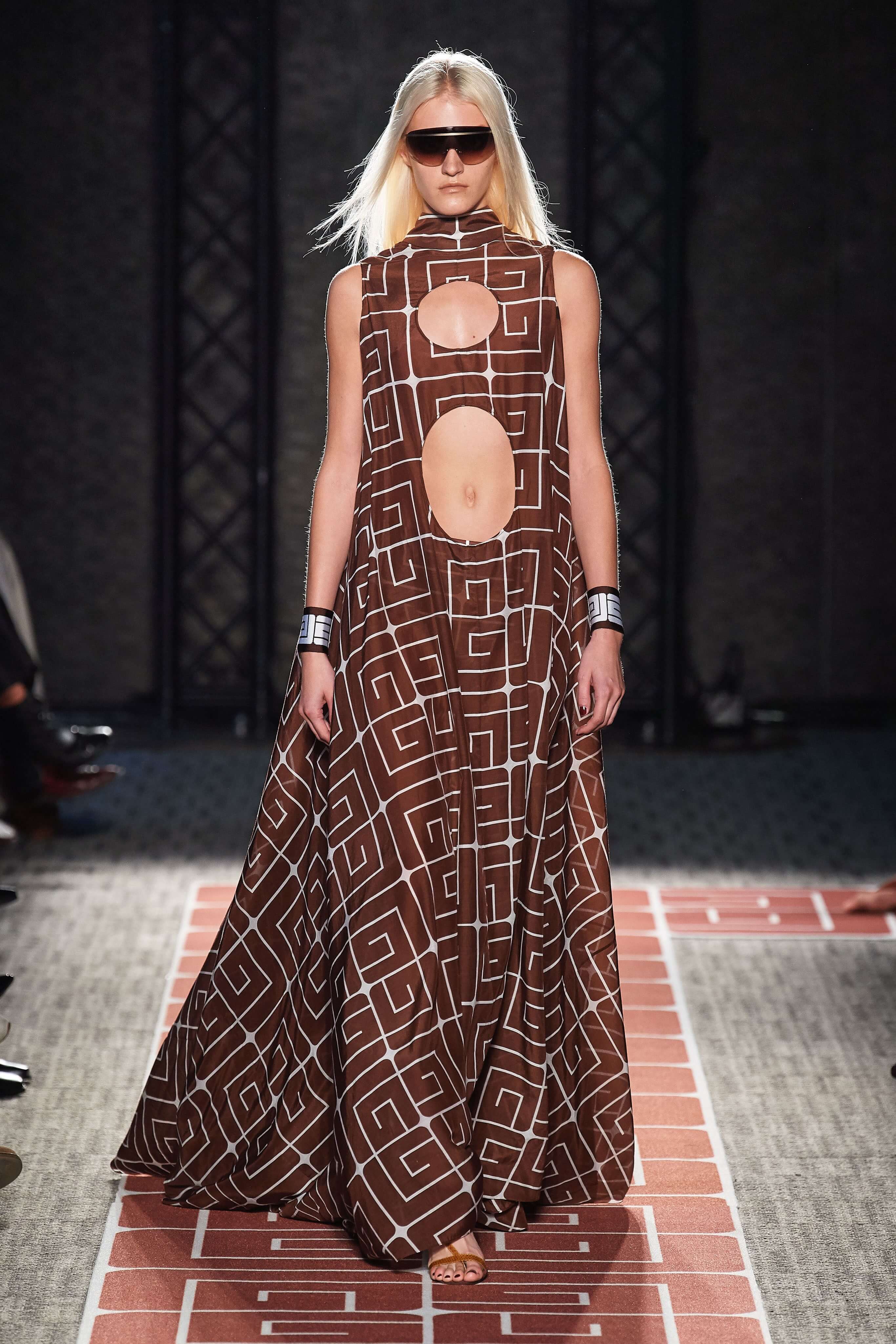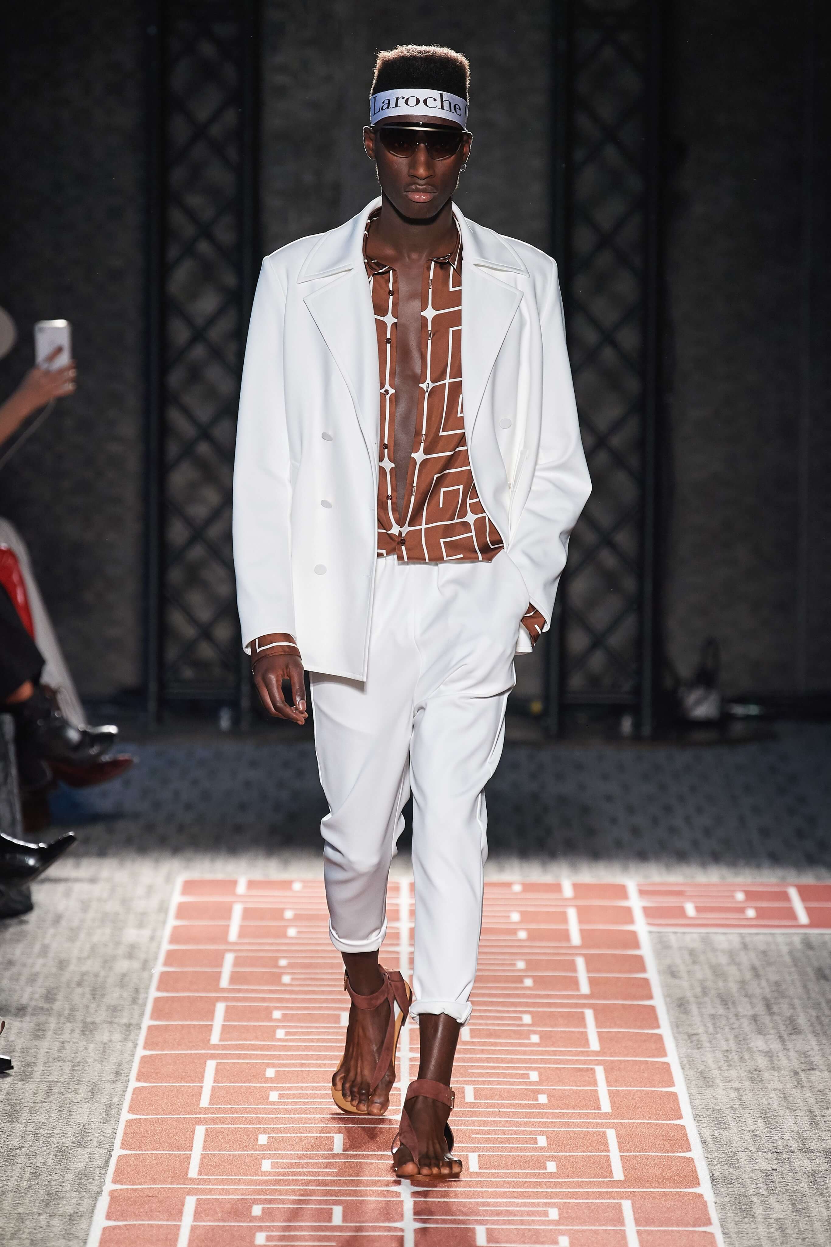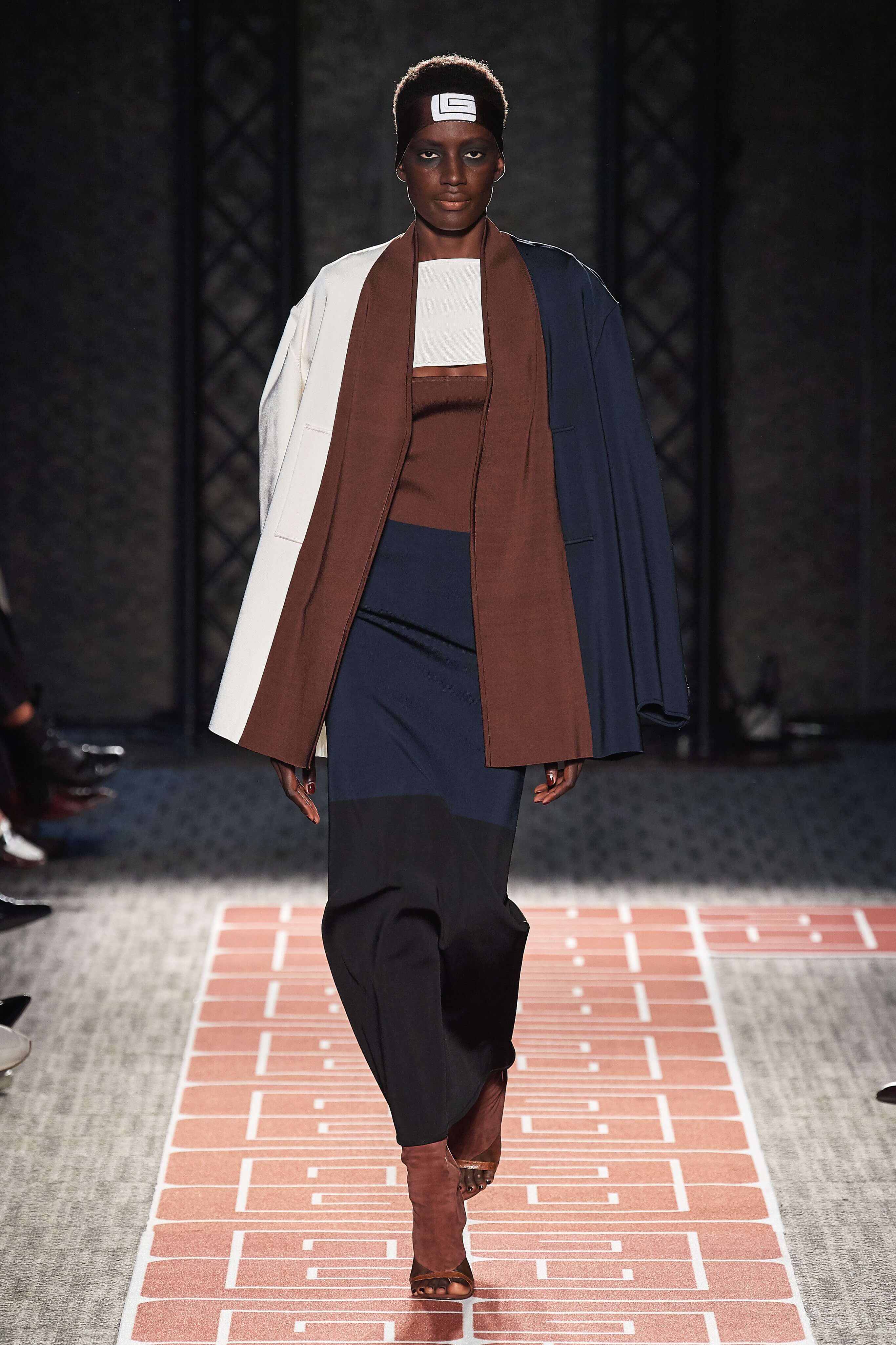 В весенней коллекции Guy Laroche почти все вещи покрыты стилизованным логотипом бренда, выполнены в оттенках корицы, шоколада, черного и белого, и интерпретируют силуэты 70-х.