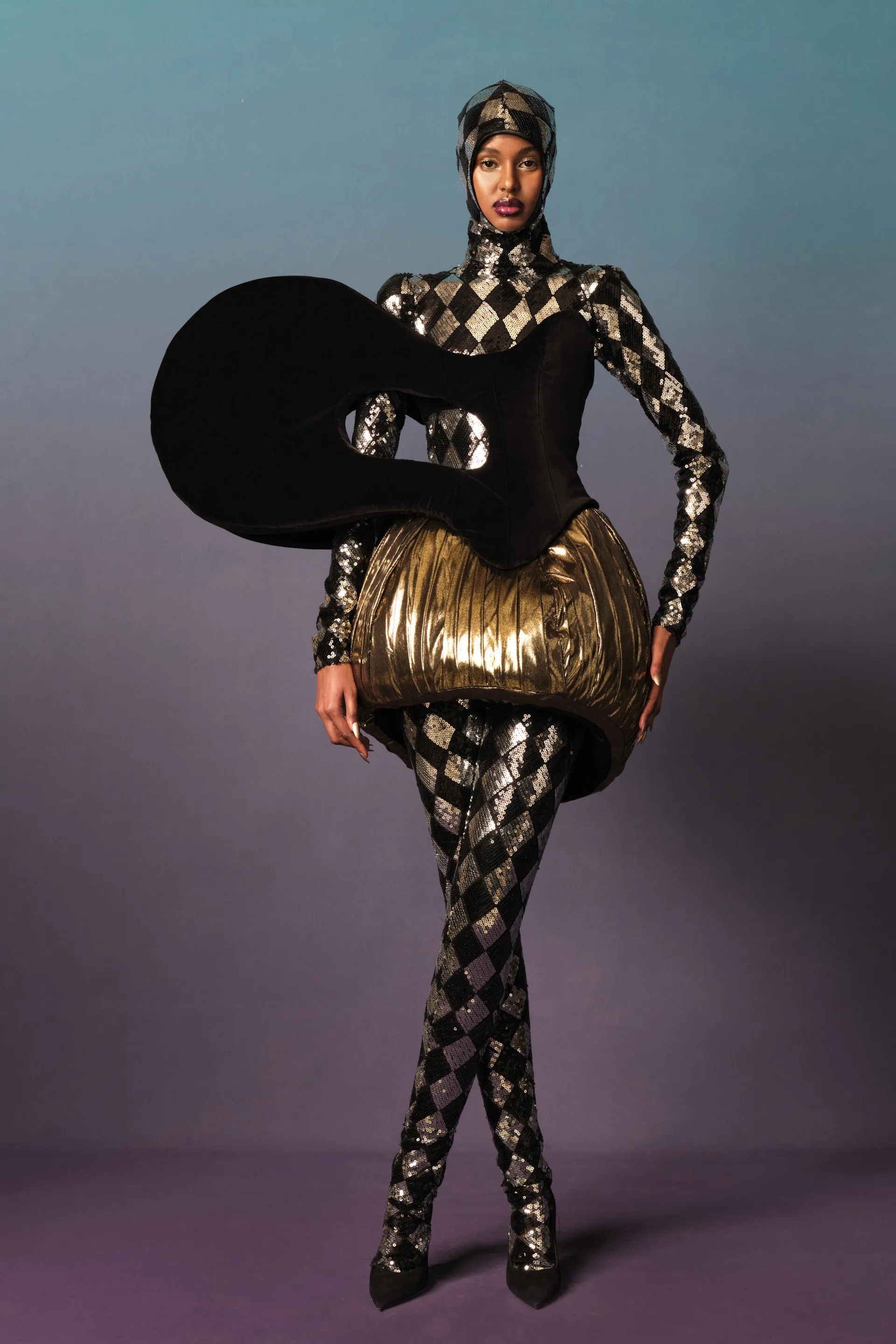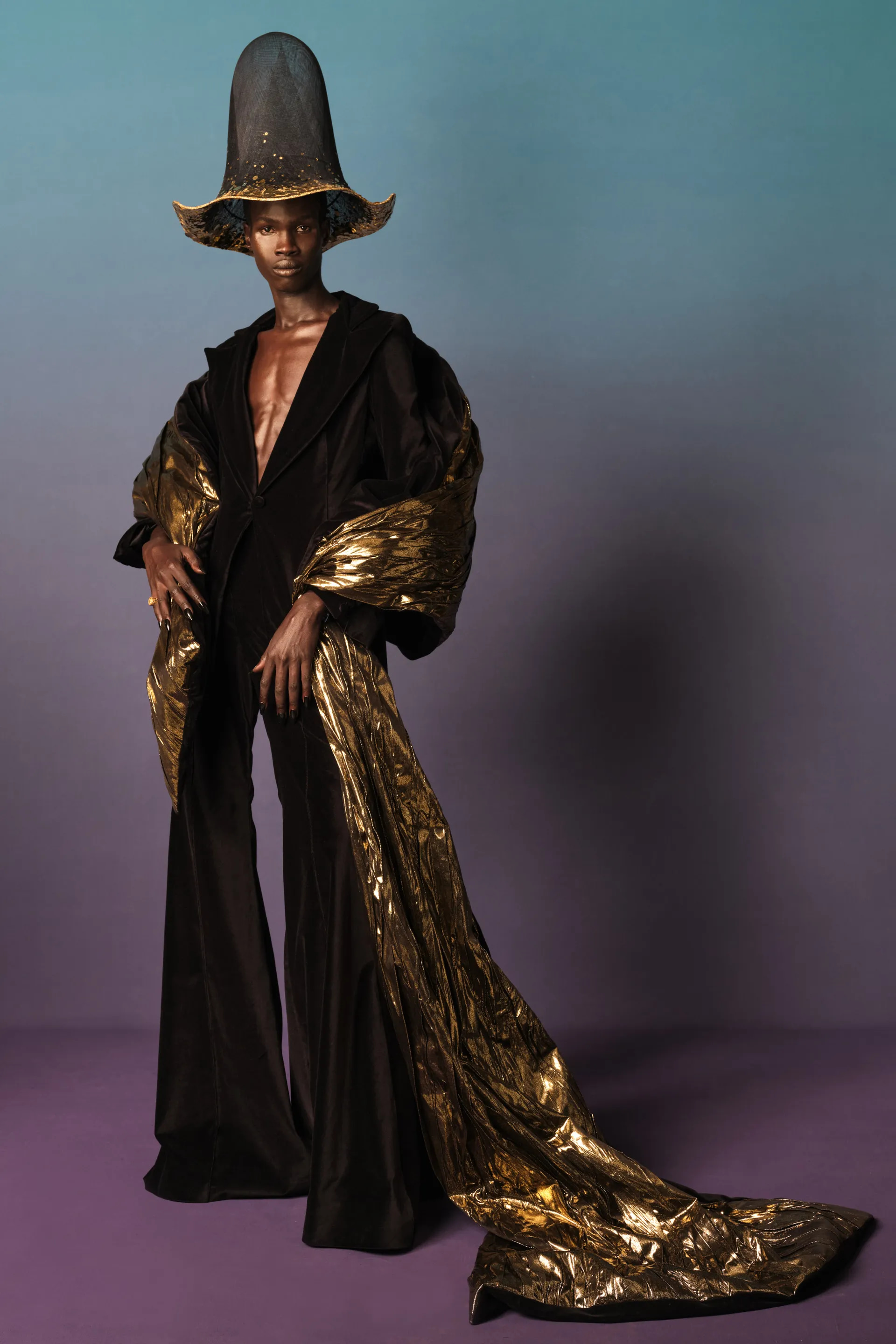Наприклад, об’ємні юбки із золотої ламе, не менш об’ємні елементи суконь та капелюхи, наче з “Аліси у країні див”. До речі, ці капелюхи Harris Reed вперше представив у SS`23 у вересні минулого року.