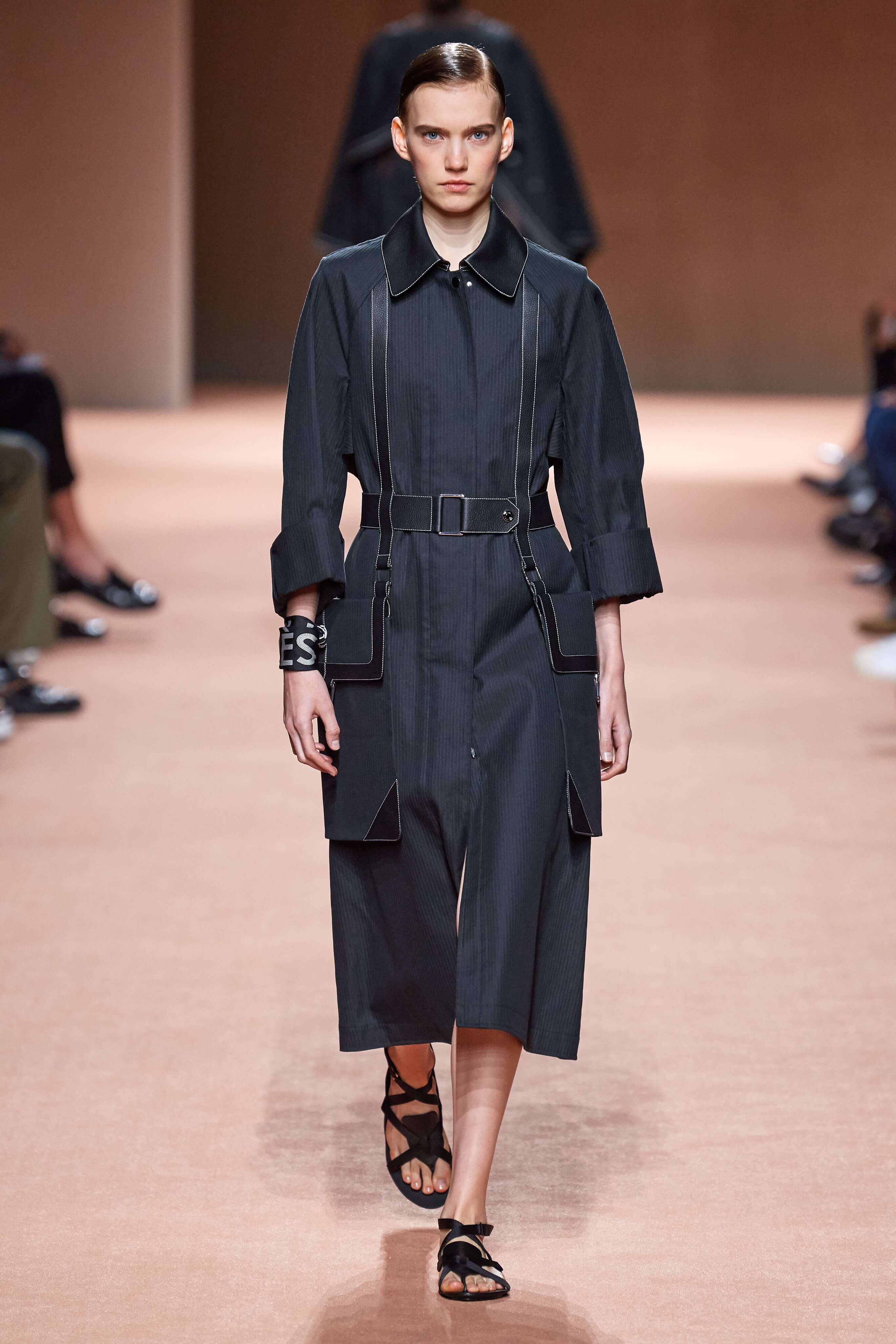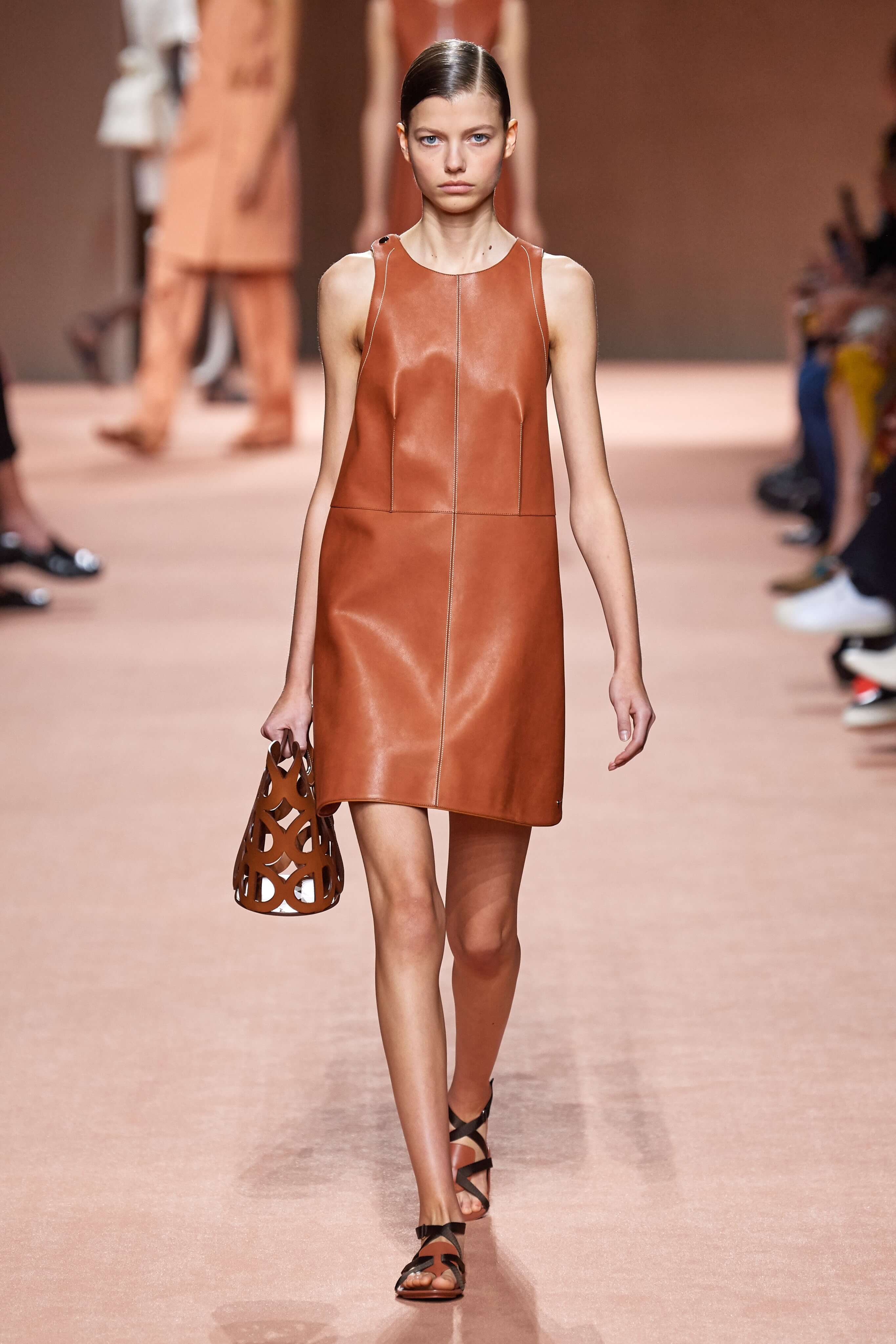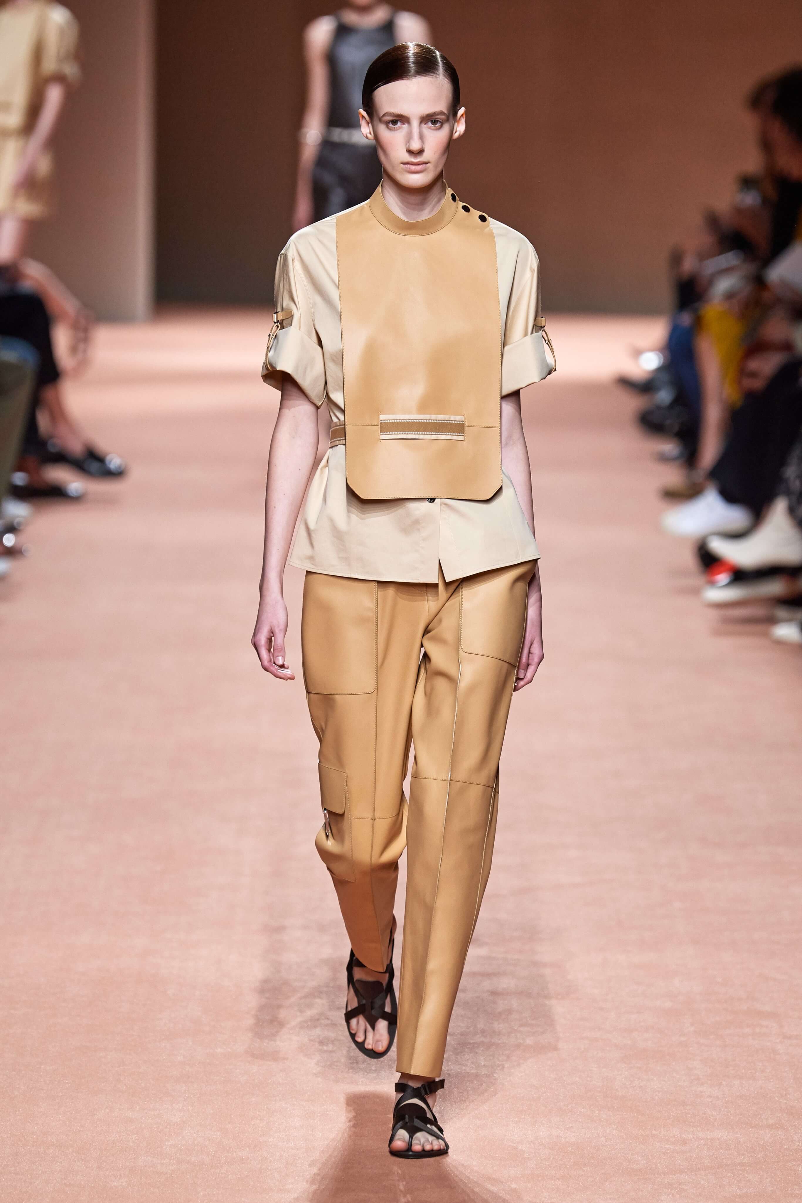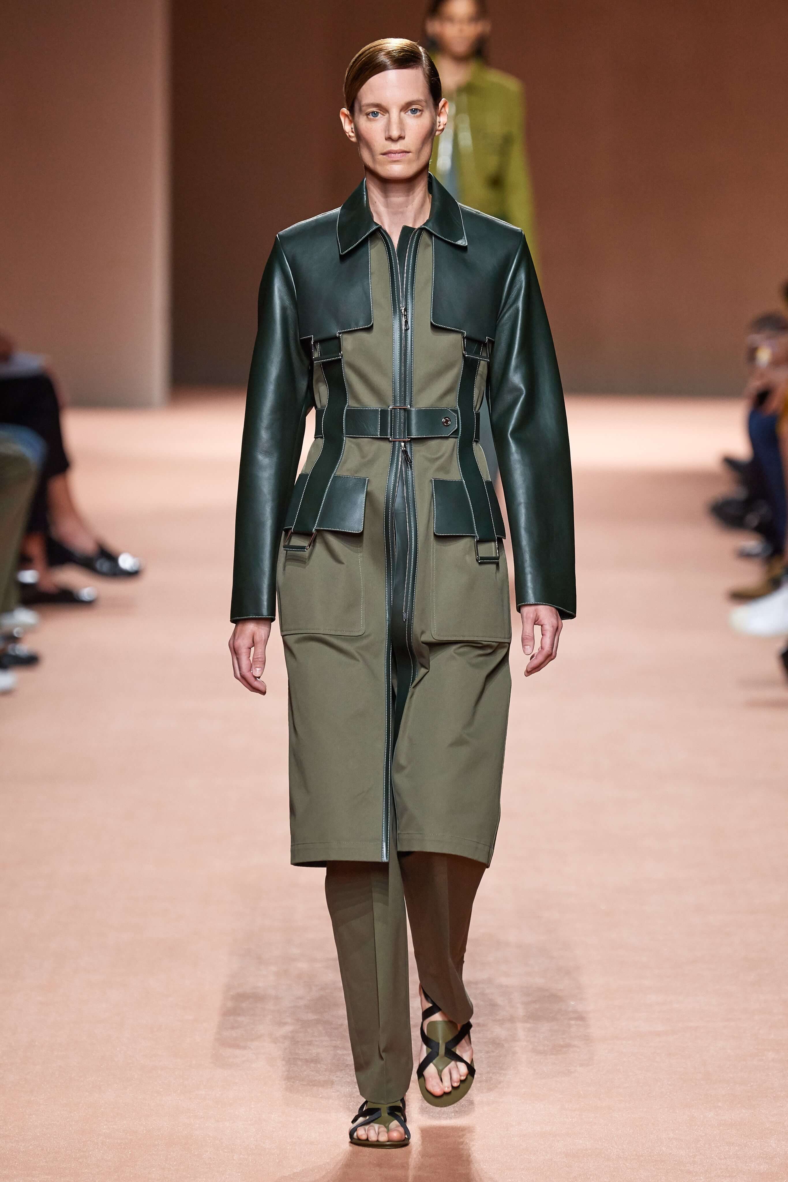 Креативный директор марки Hermès Надеж Ване-Цыбульски представила свою новую коллекцию в Париже. В неё вошли вещи из кожи и замши — это платья, комбинезоны и куртки, напоминающие рабочую одежду мастеров ремесленного цеха прошлого века. Удлиненные фартуки с застёжками, доходящие до горла, созданы наподобие тех, что носили портные Hermès.