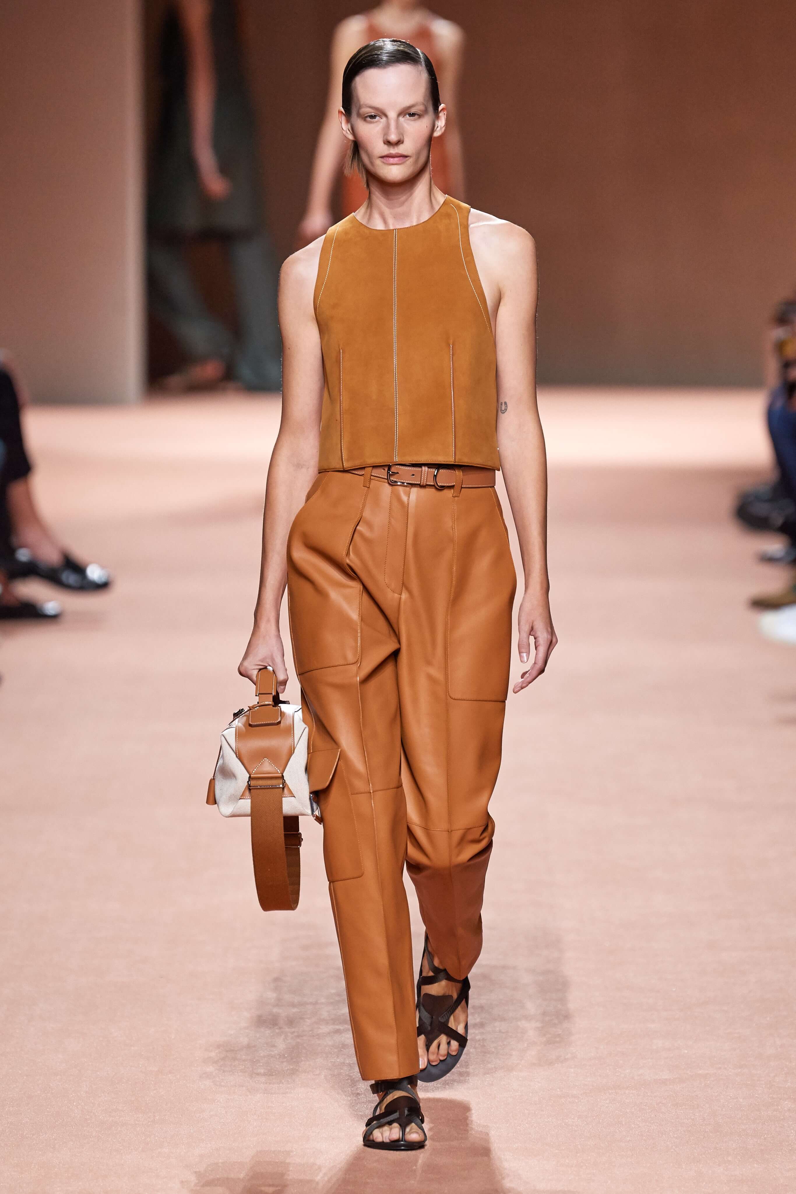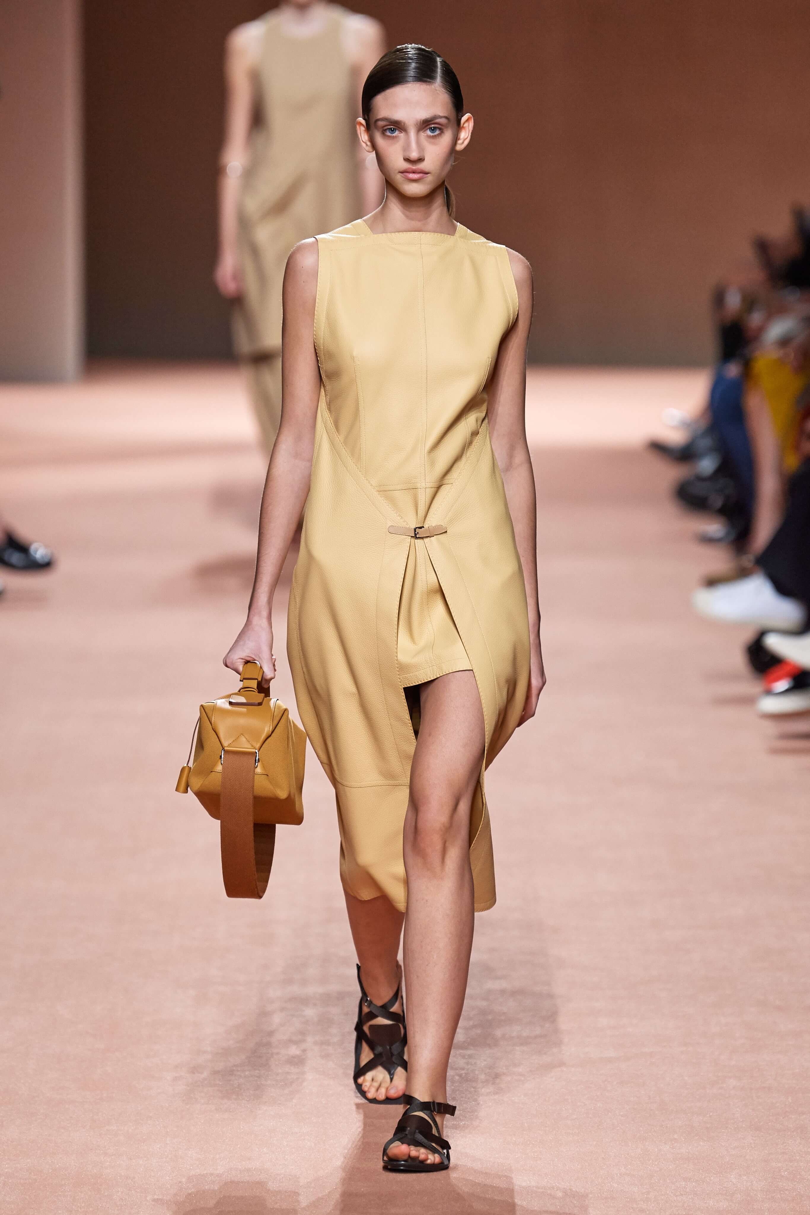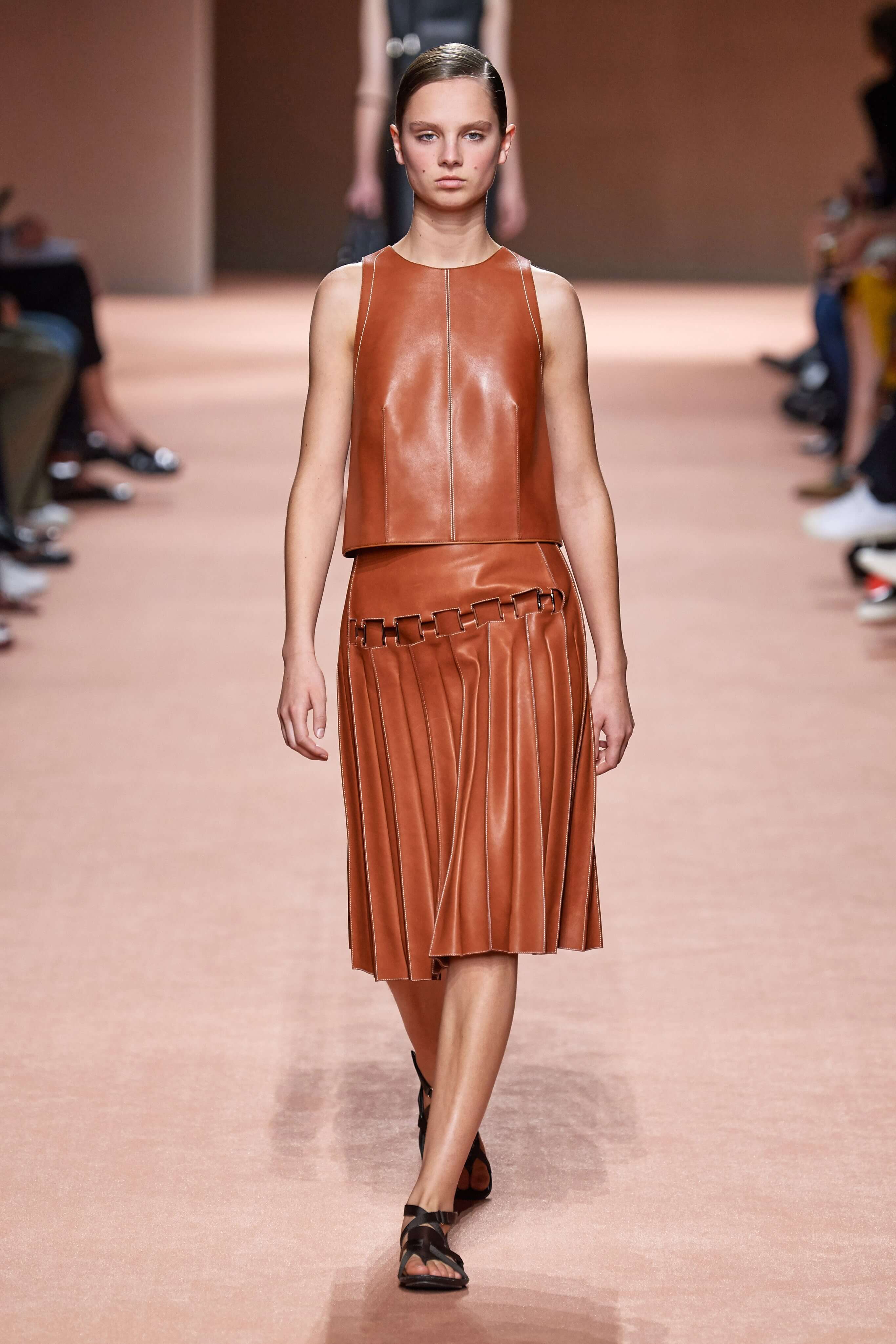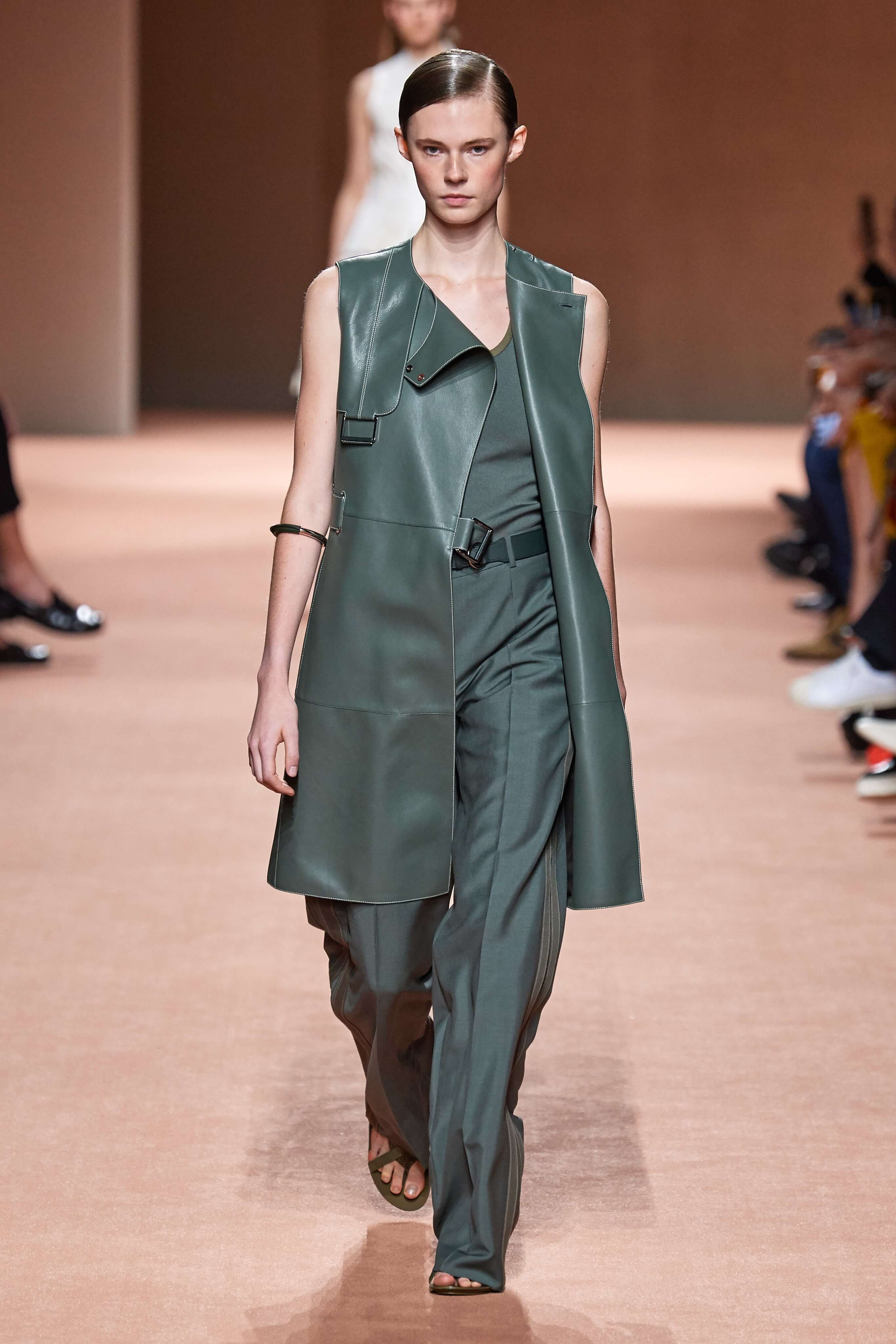 Креативный директор марки Hermès Надеж Ване-Цыбульски представила свою новую коллекцию в Париже. В неё вошли вещи из кожи и замши — это платья, комбинезоны и куртки, напоминающие рабочую одежду мастеров ремесленного цеха прошлого века. Удлиненные фартуки с застёжками, доходящие до горла, созданы наподобие тех, что носили портные Hermès.