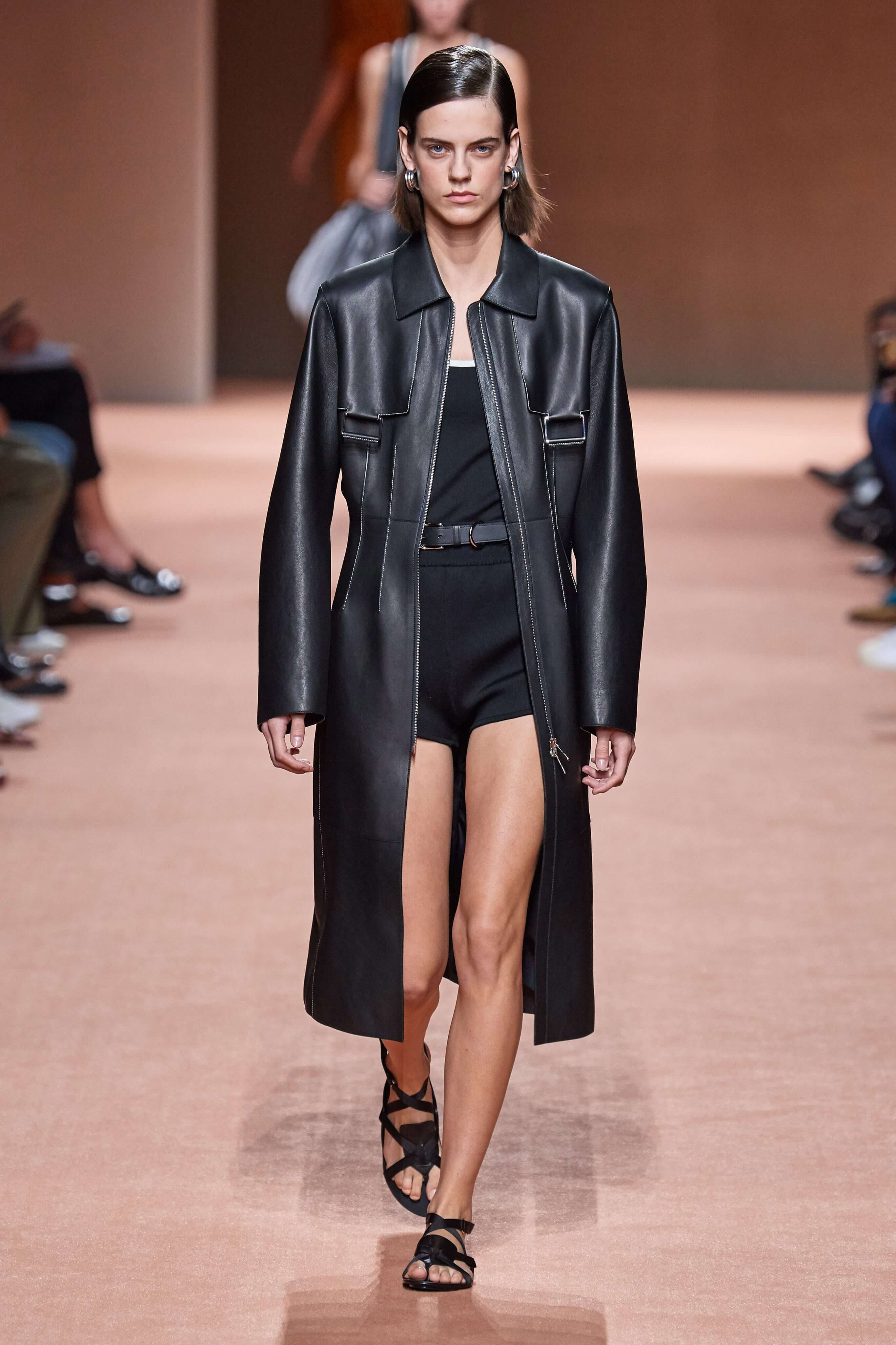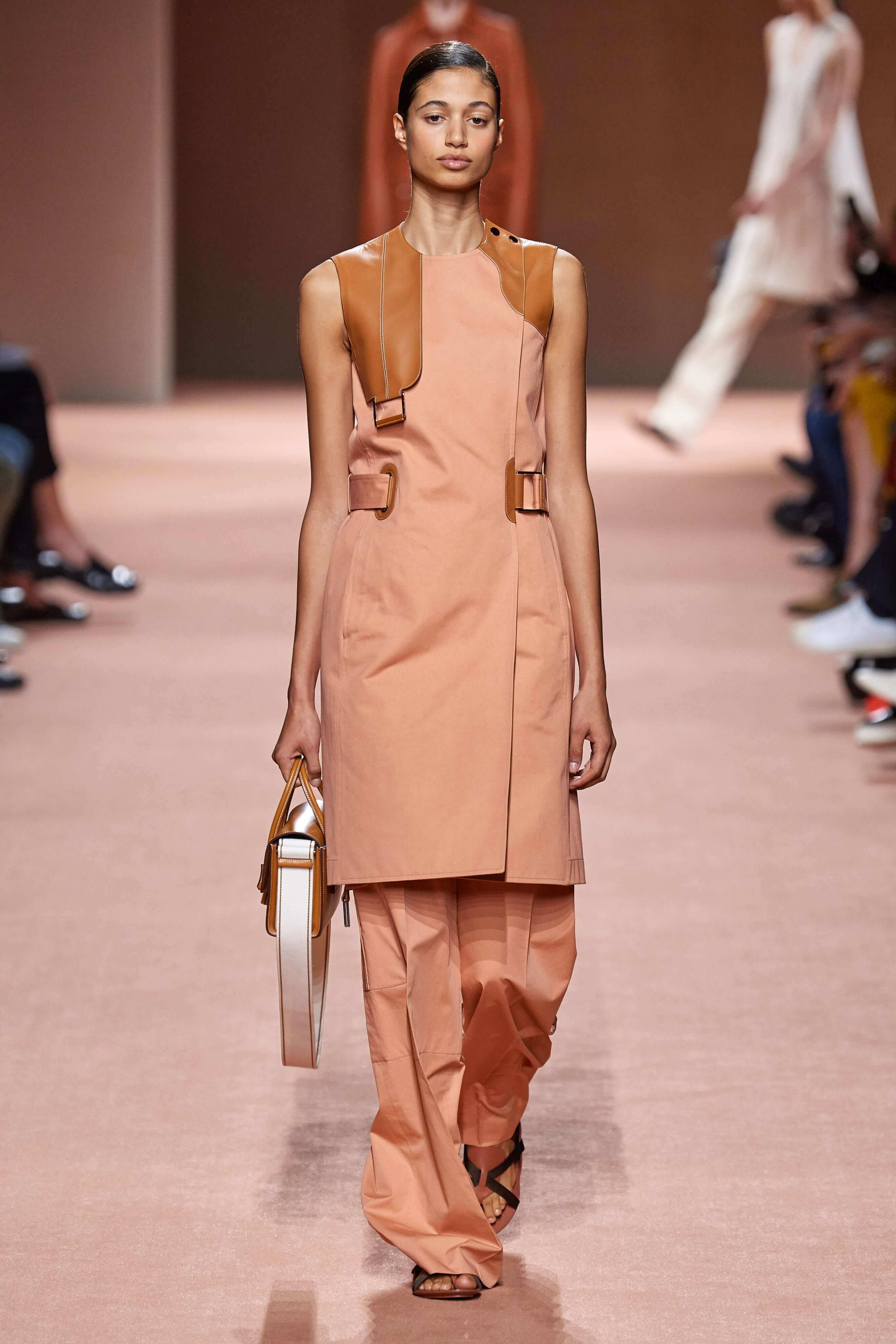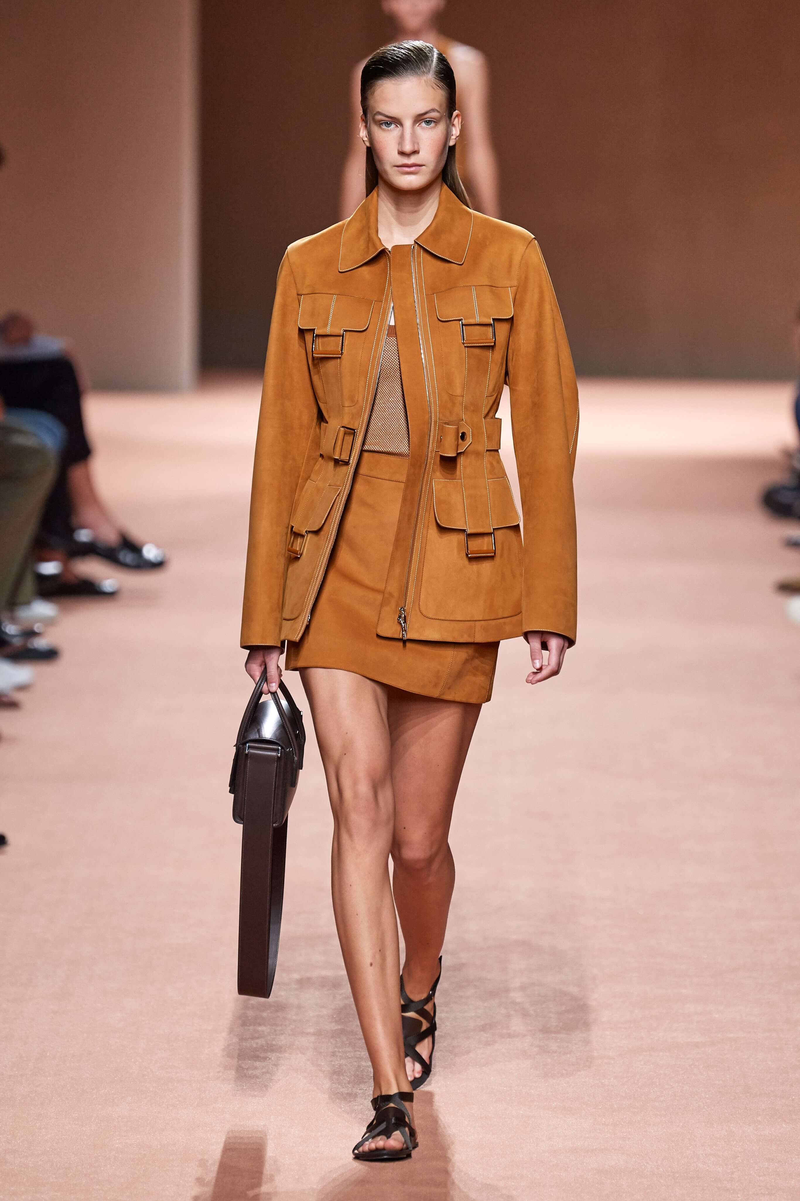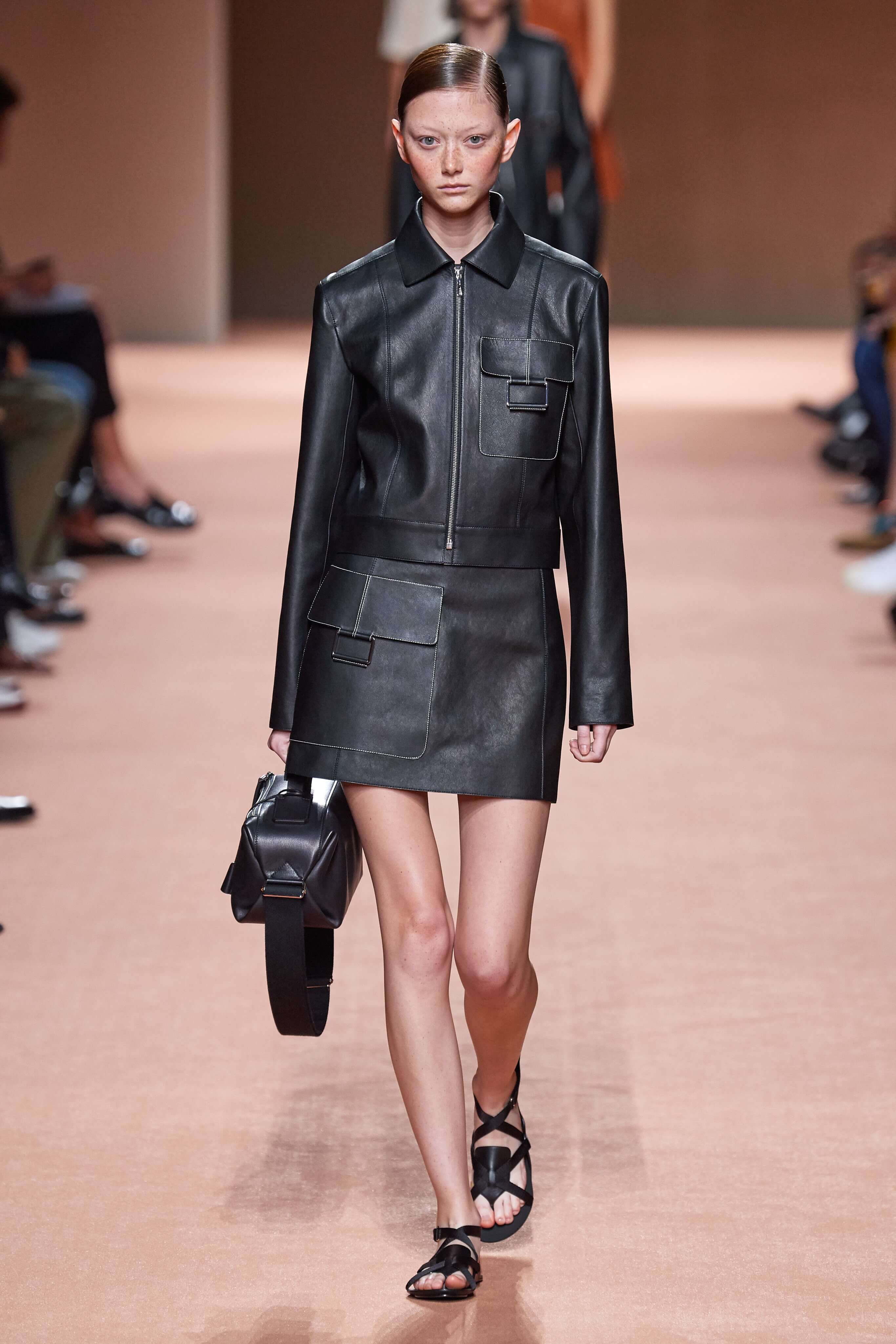 Креативный директор марки Hermès Надеж Ване-Цыбульски представила свою новую коллекцию в Париже. В неё вошли вещи из кожи и замши — это платья, комбинезоны и куртки, напоминающие рабочую одежду мастеров ремесленного цеха прошлого века. Удлиненные фартуки с застёжками, доходящие до горла, созданы наподобие тех, что носили портные Hermès.