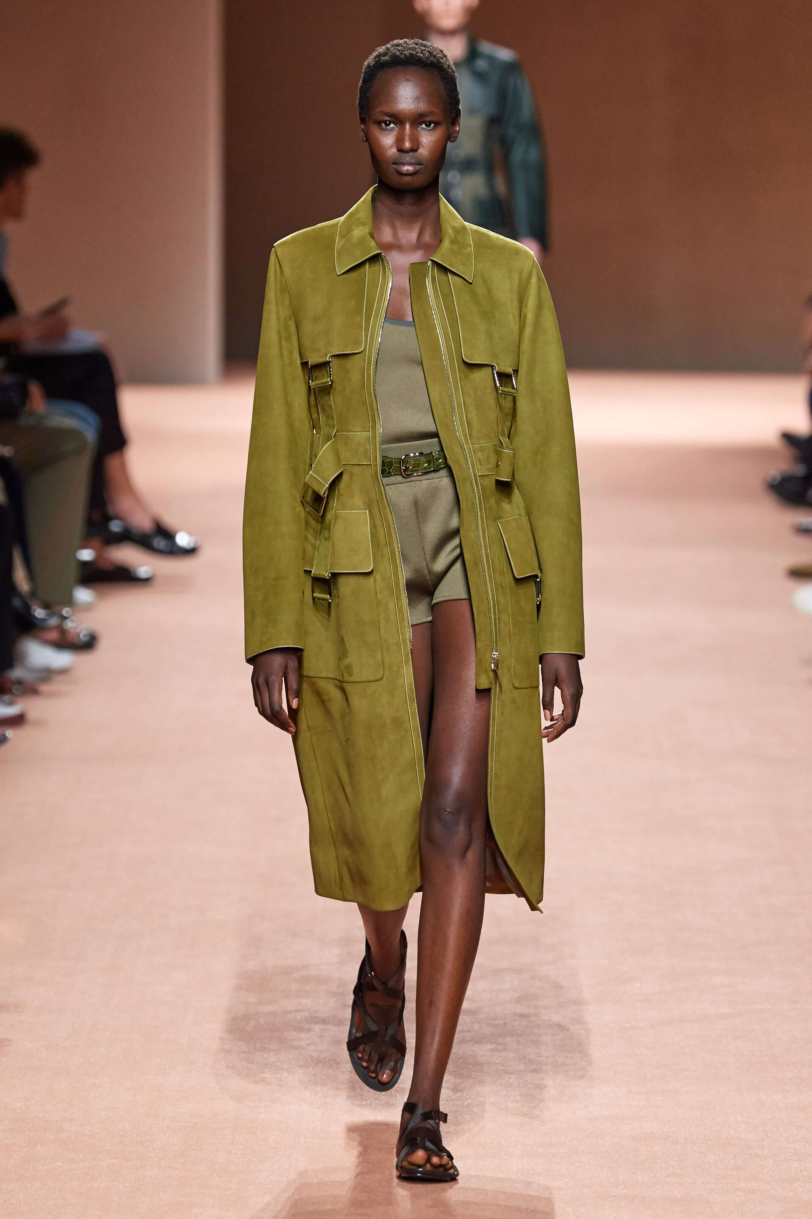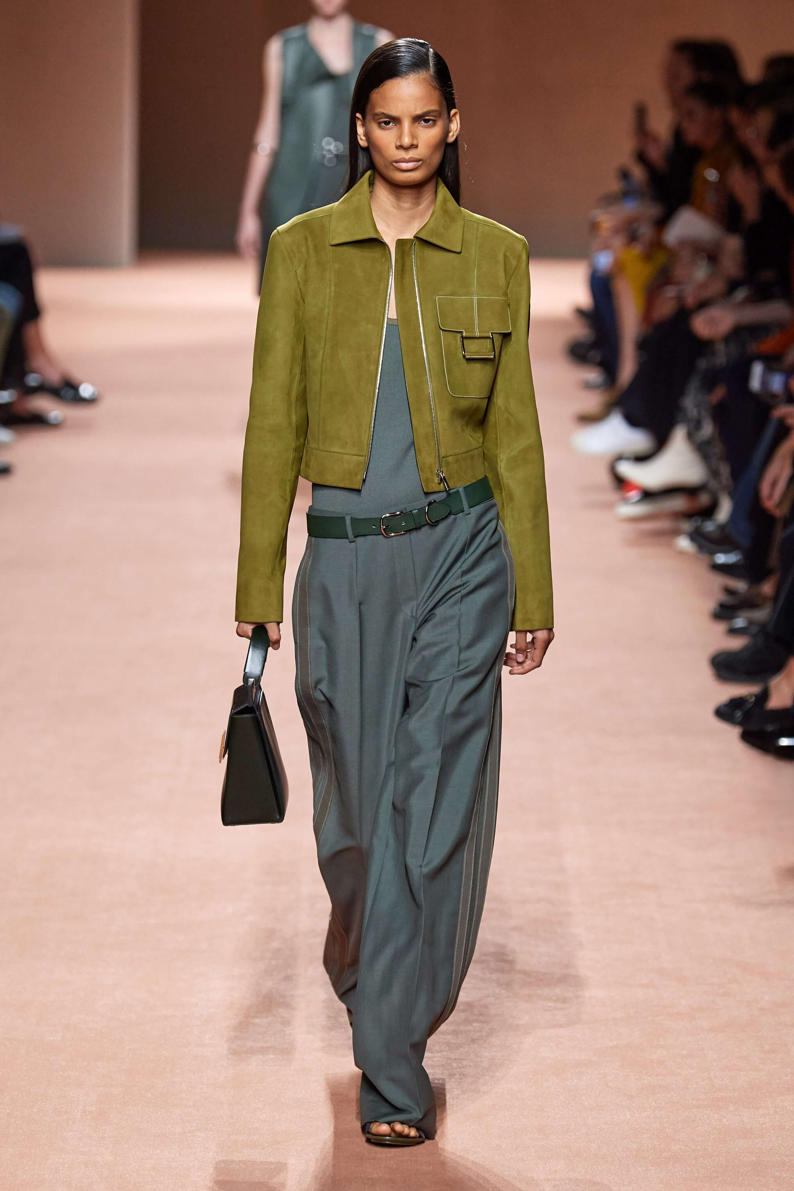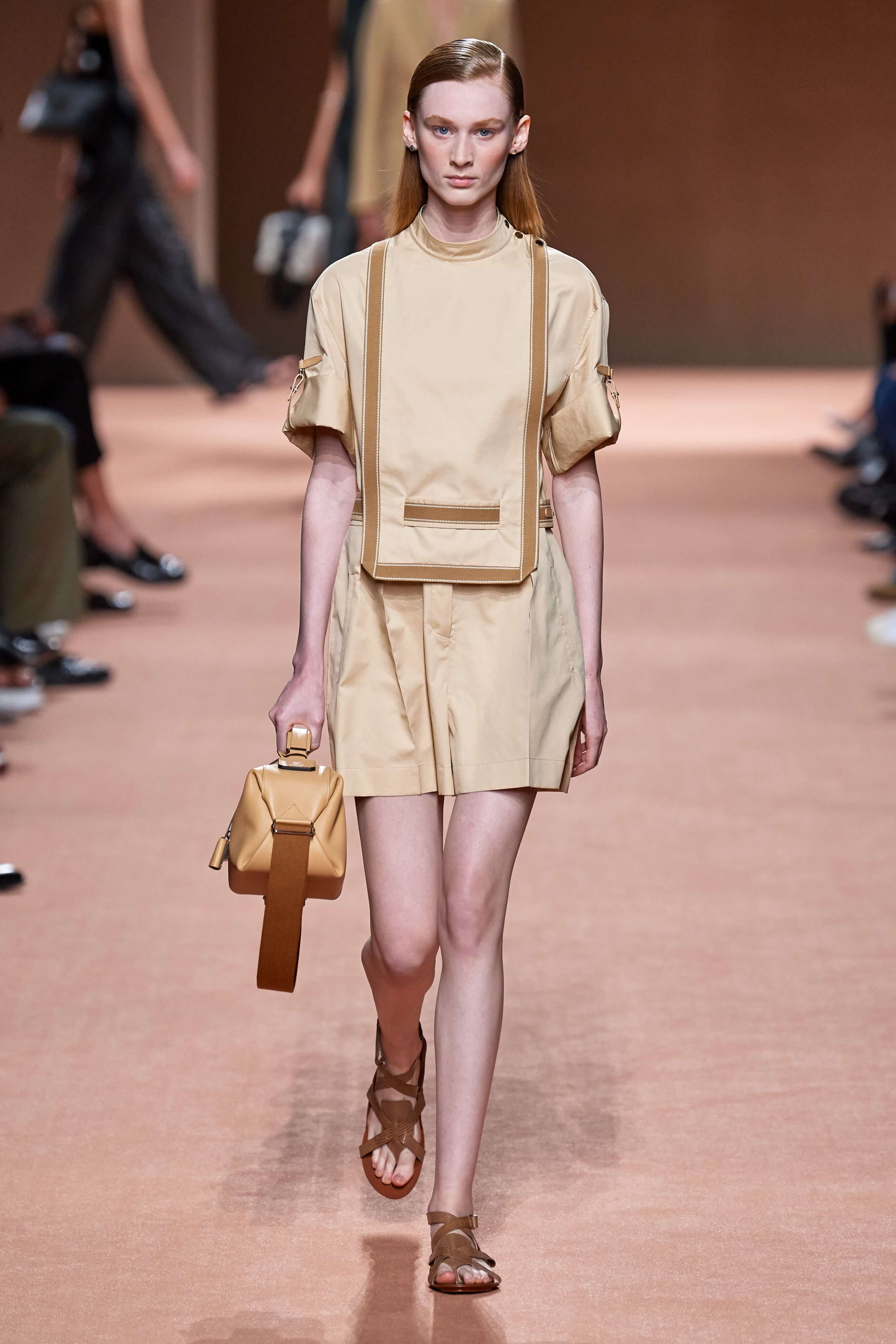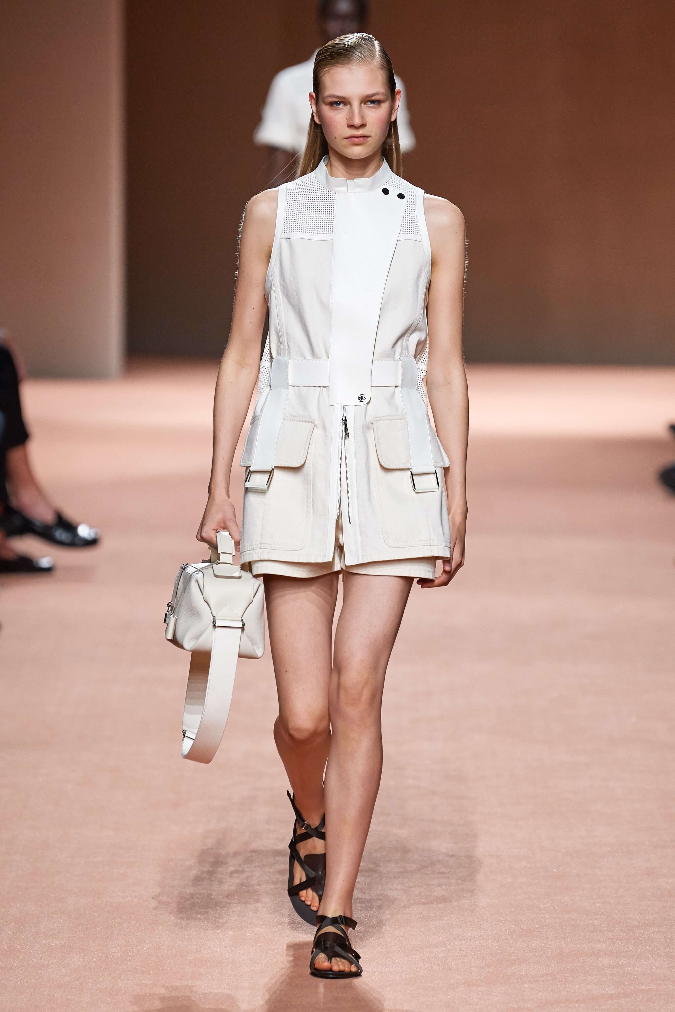 Креативный директор марки Hermès Надеж Ване-Цыбульски представила свою новую коллекцию в Париже. В неё вошли вещи из кожи и замши — это платья, комбинезоны и куртки, напоминающие рабочую одежду мастеров ремесленного цеха прошлого века. Удлиненные фартуки с застёжками, доходящие до горла, созданы наподобие тех, что носили портные Hermès.