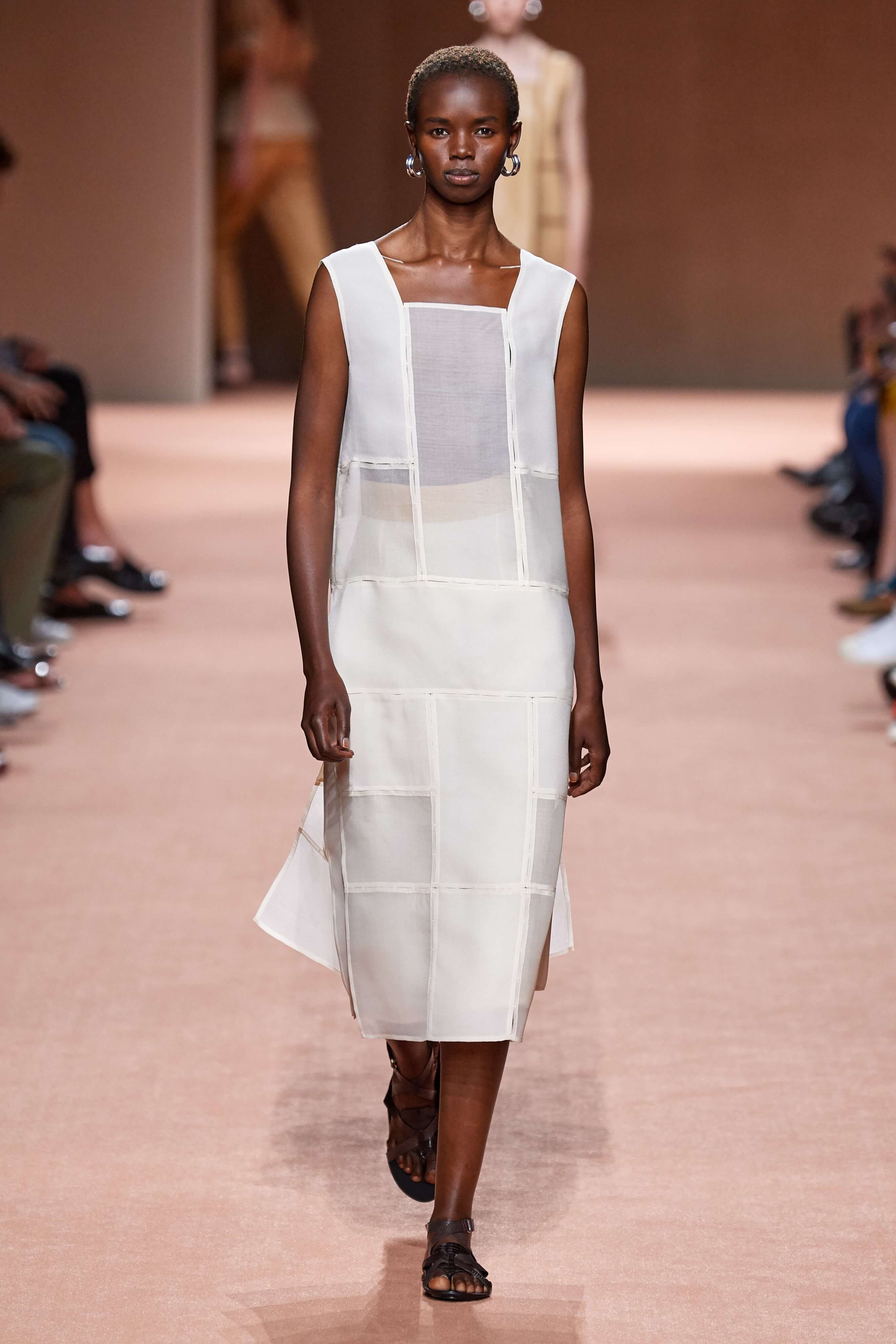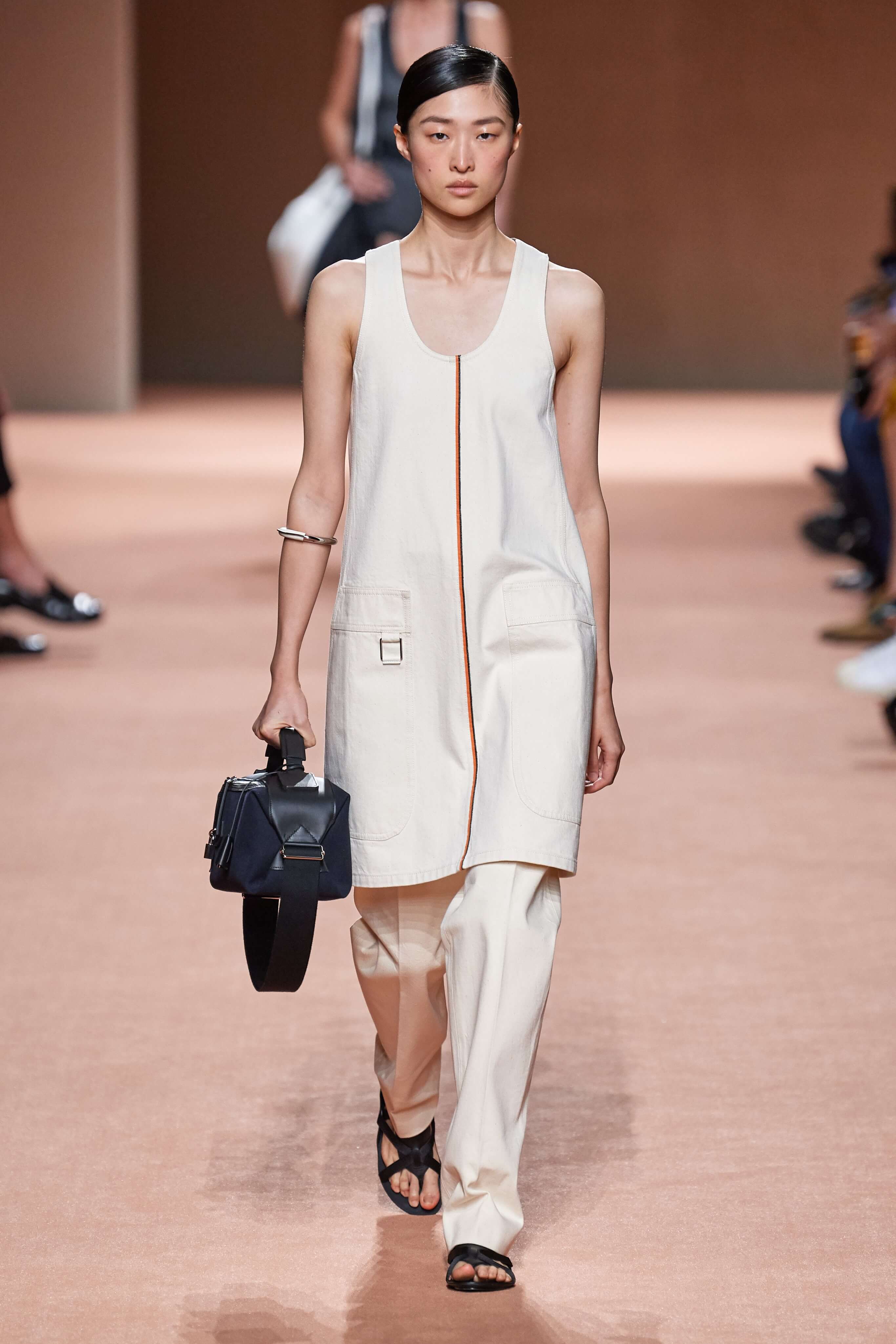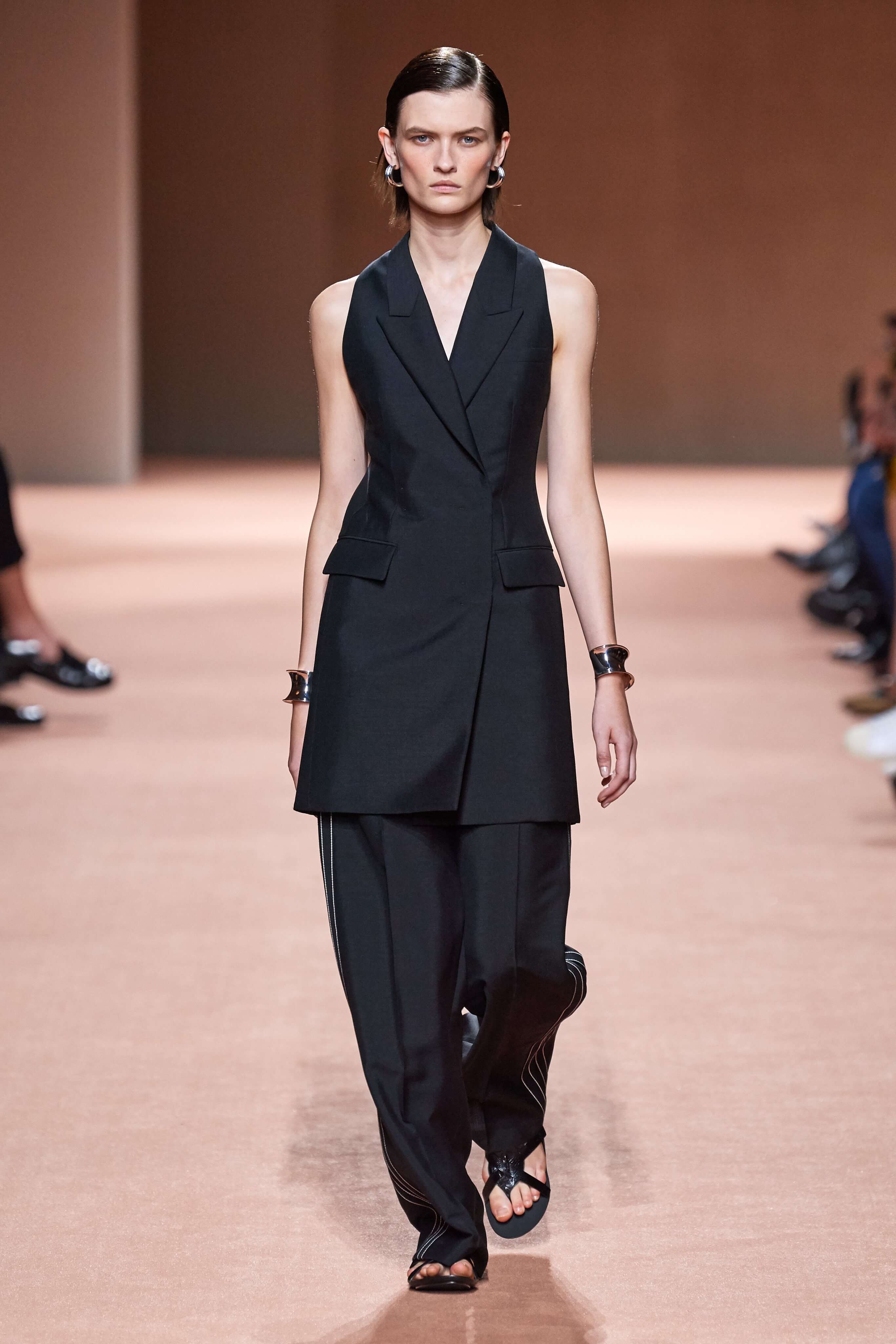 И всё же романтика Hermès от Ване-Цыбульски антиутопична и даже немного брутальна — гладкие и плотные фактуры, минимум декора, зато максимум грубых застёжек, чистые линии и жесткие силуэты. Комплекты из топов, жакетов и юбок, будто собранных из перевернутых разными сторонами квадратов ткани, дополняли минималистичные браслеты, надетые кое-где симметрично на обе руки, и вместительные сумки. Нечто от образа гладиатора скользило в каждом наряде: выражение силы, целеустремленности и нерушимой воли, — сандалии из переплетенных ремешков усиливали это впечатление.