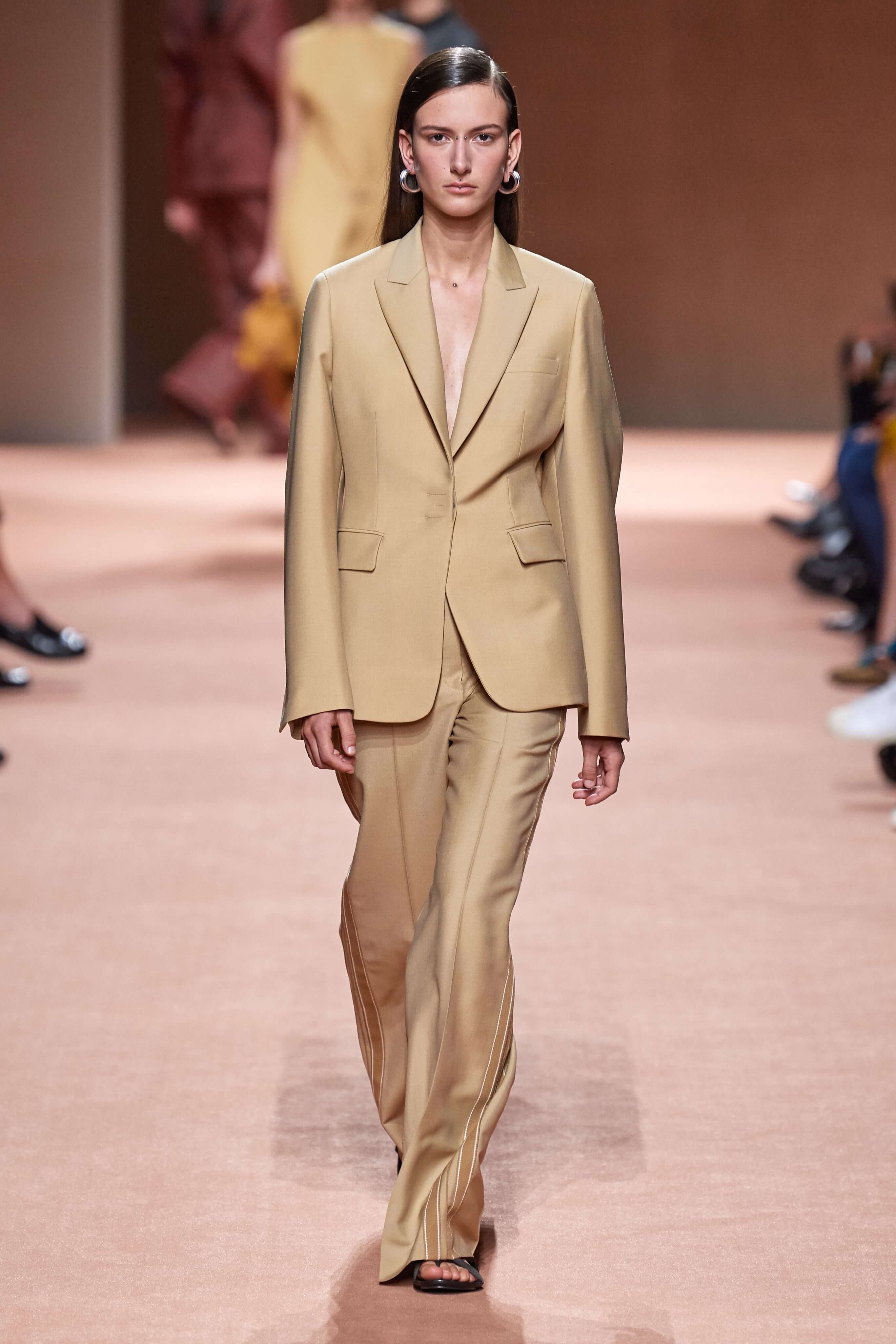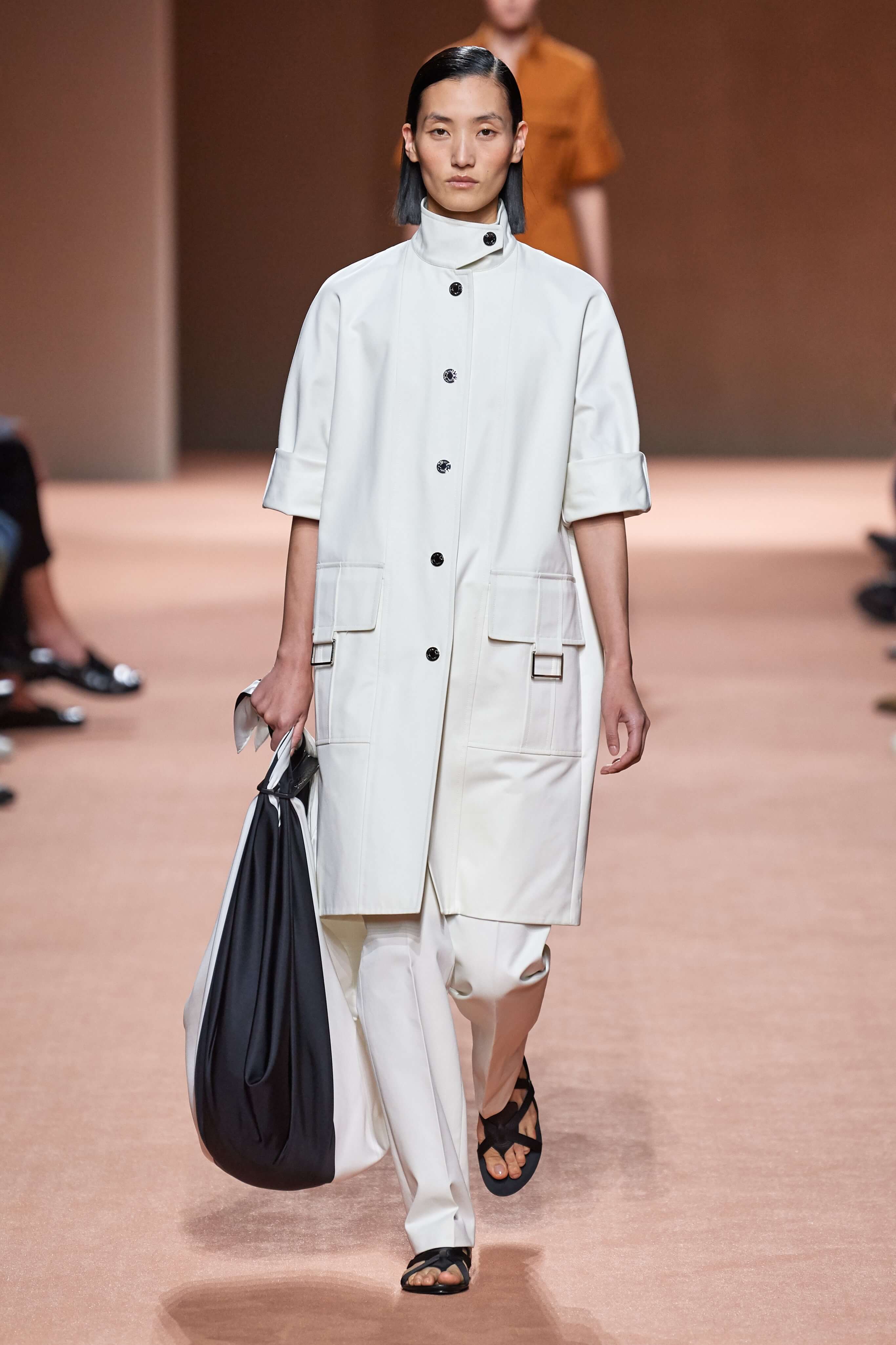 В коллекции утилитарный шик, соединен с городской практичностью, однако она не лишена и романтики — юбок миди, женственных брючных костюмов оттенка экрю и струящихся вечерних платьев.