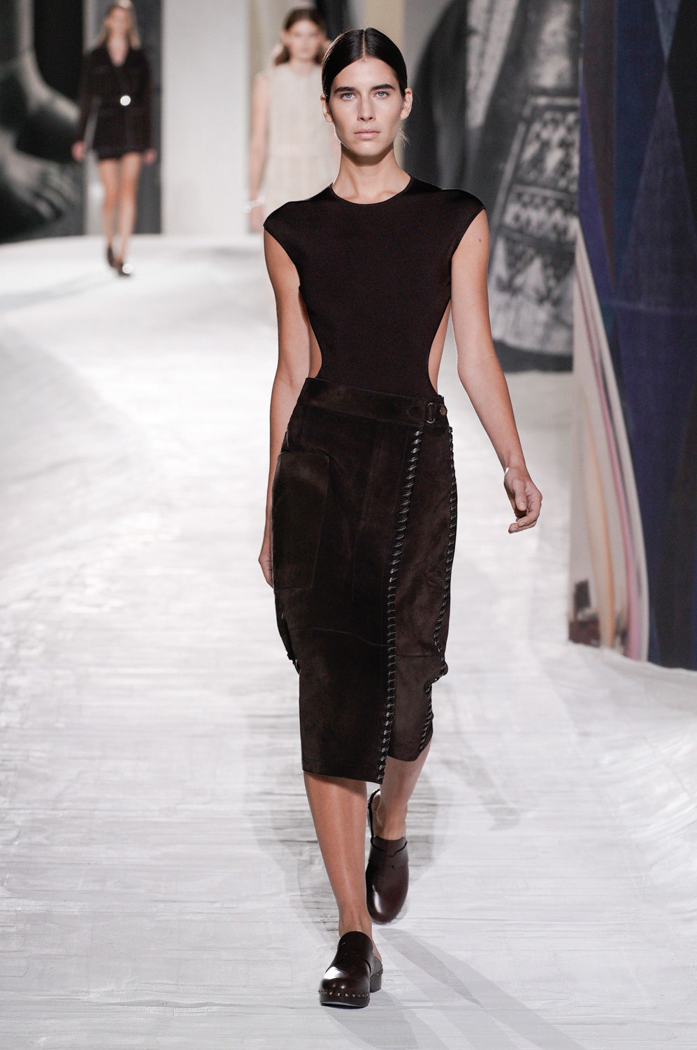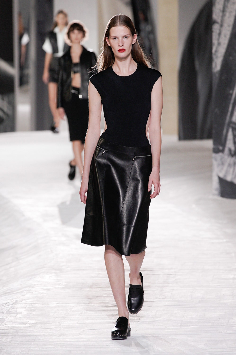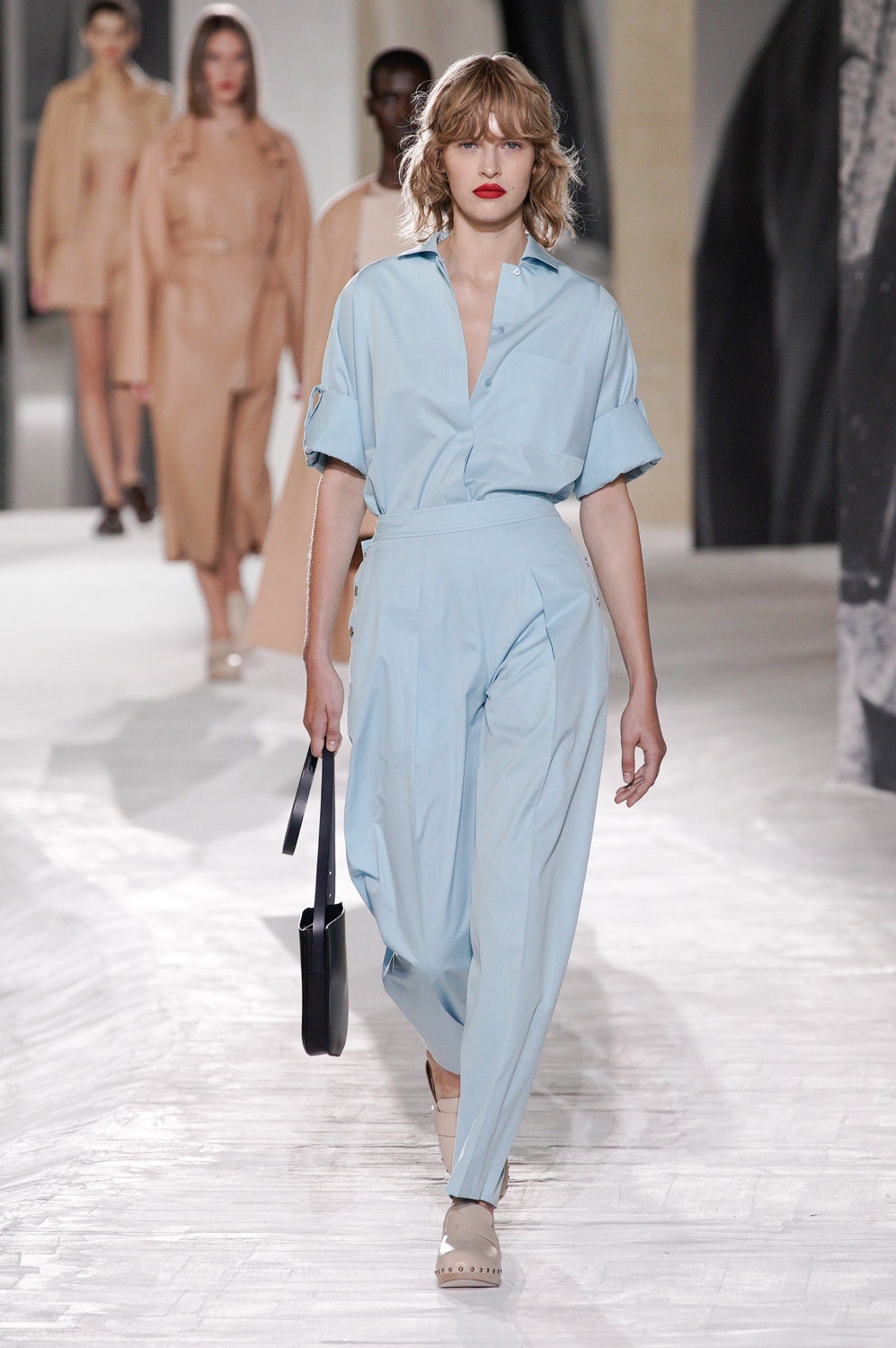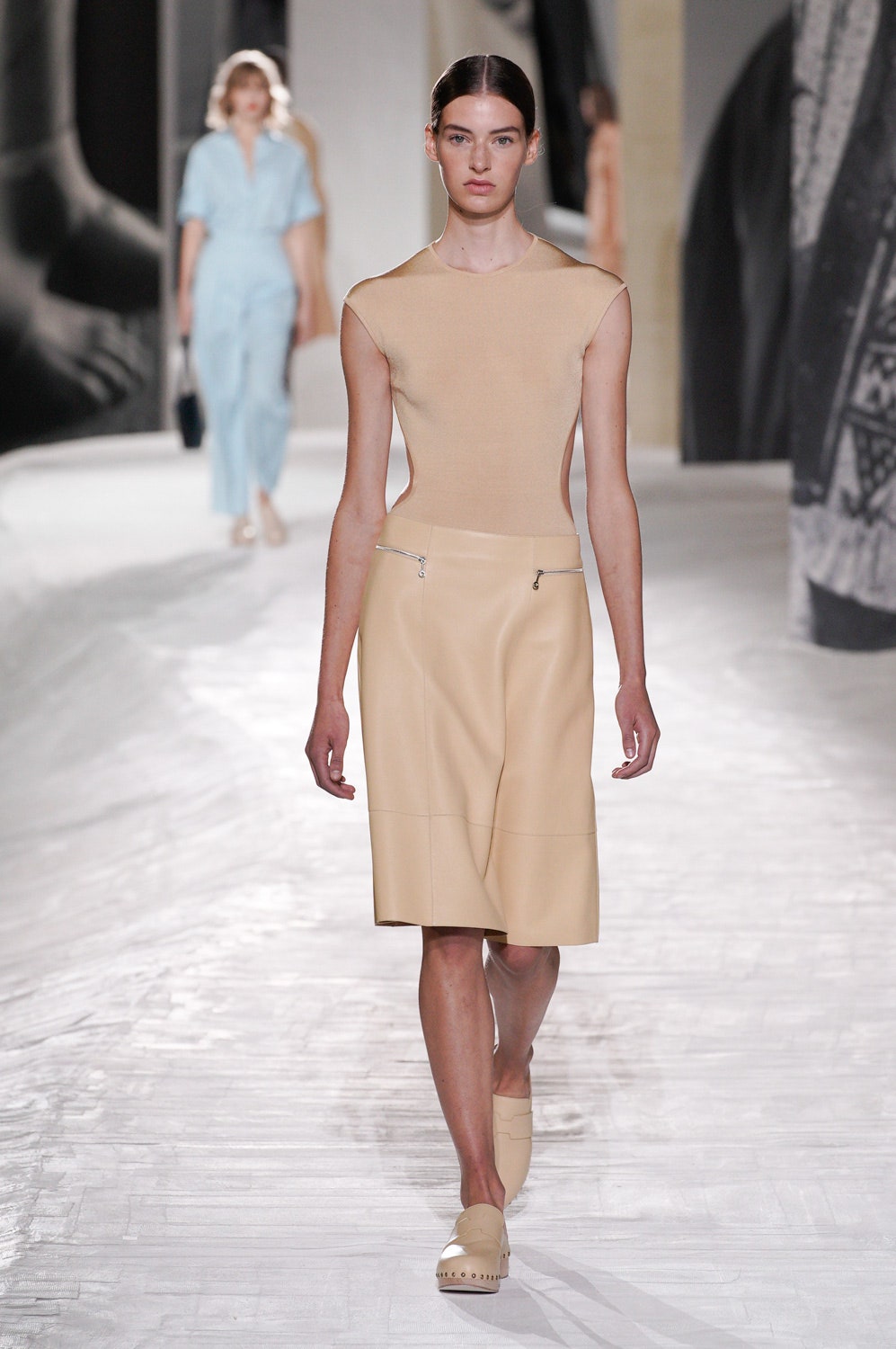 У нас могут быть десятки юбок миди, но кожаная, телесного оттенка, с серебряными молниями, идеальна, как ни одна другая. Впрочем, черная из этой же коллекции – еще лучше. Мы можем по-разному относиться к уместности комбинезонов в повседневности, но глядя на нежно-голубой в сочетании с красной помадой, в котором вышла на подиум вторая модель, хочется носить только его.