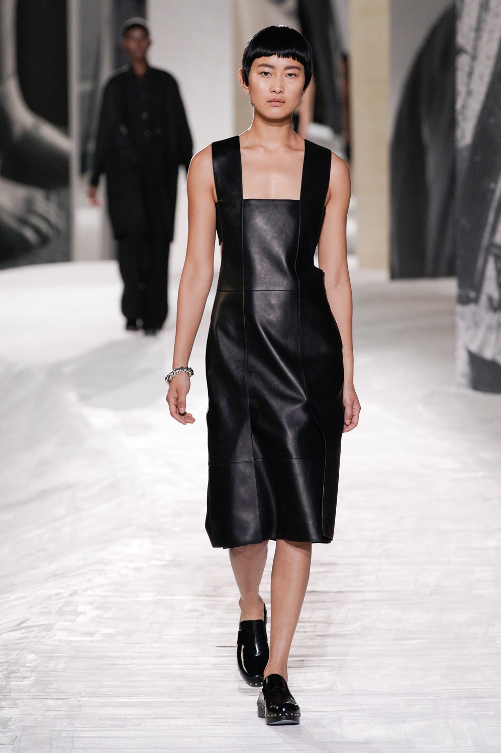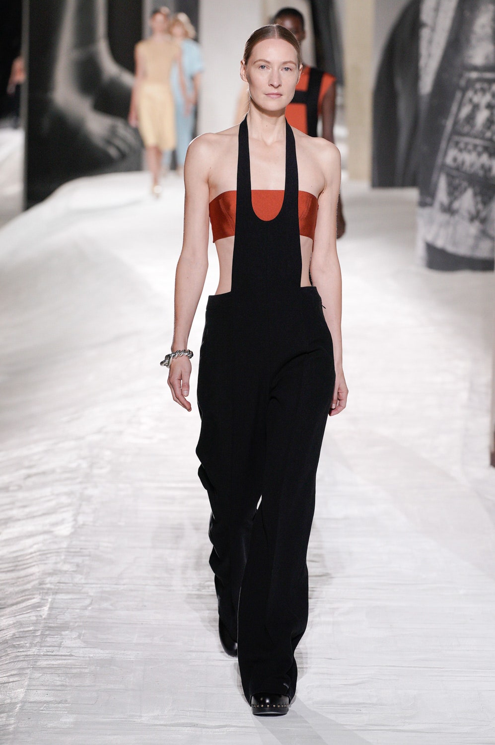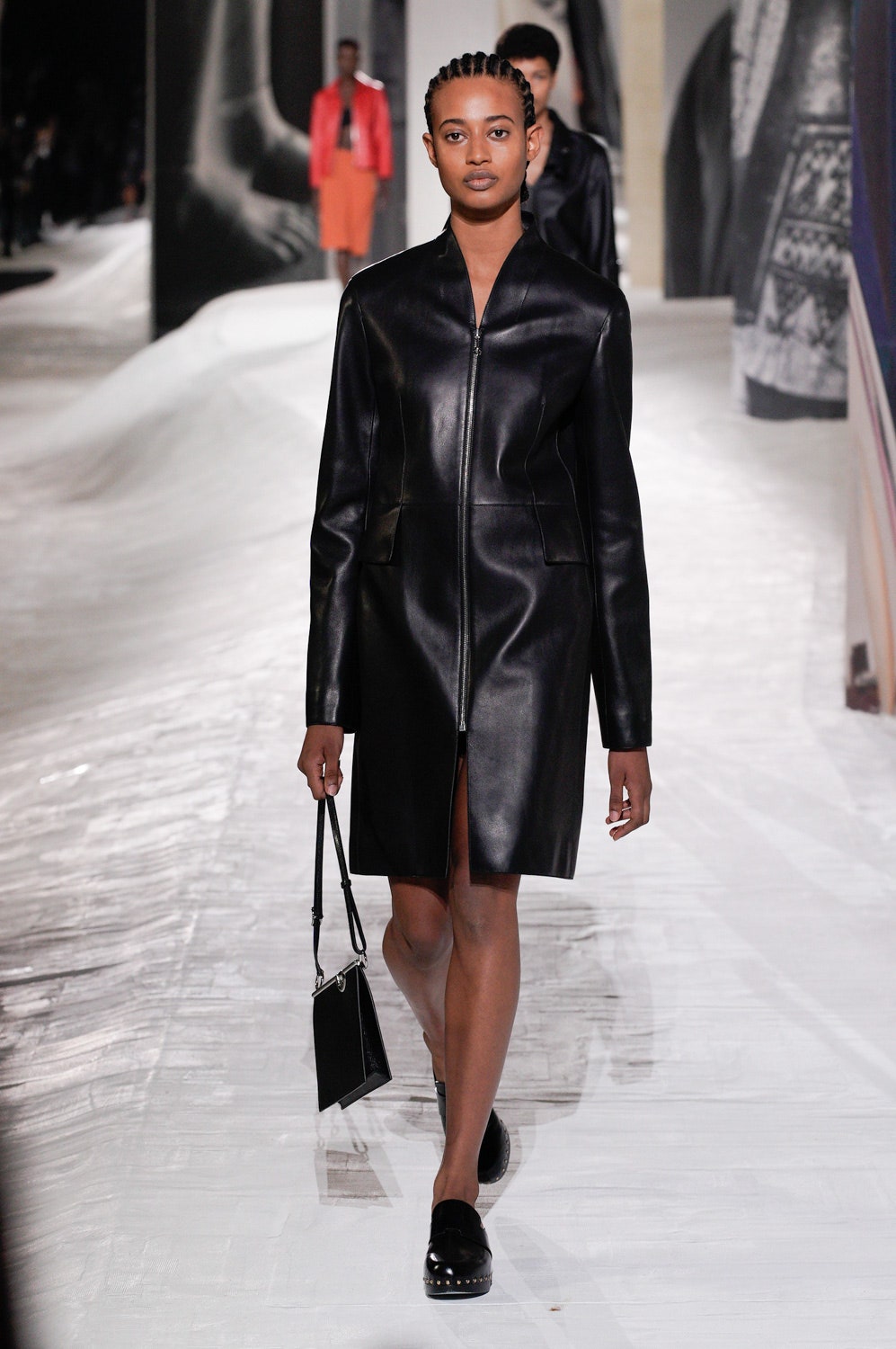 У нас могут быть десятки юбок миди, но кожаная, телесного оттенка, с серебряными молниями, идеальна, как ни одна другая. Впрочем, черная из этой же коллекции – еще лучше. Мы можем по-разному относиться к уместности комбинезонов в повседневности, но глядя на нежно-голубой в сочетании с красной помадой, в котором вышла на подиум вторая модель, хочется носить только его.