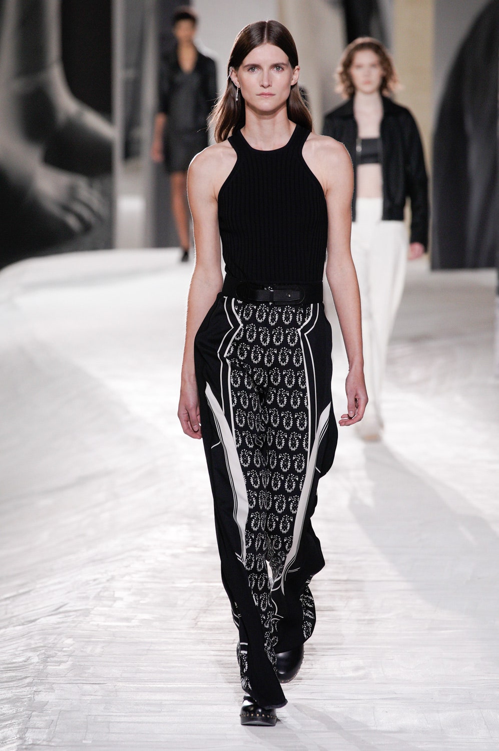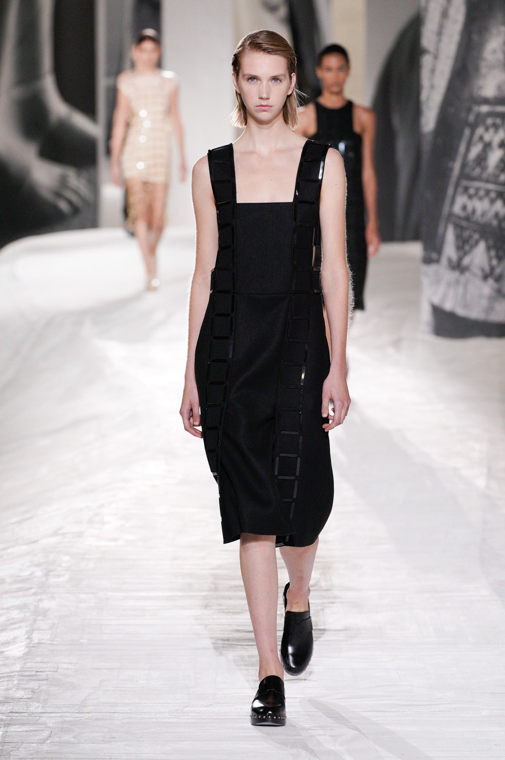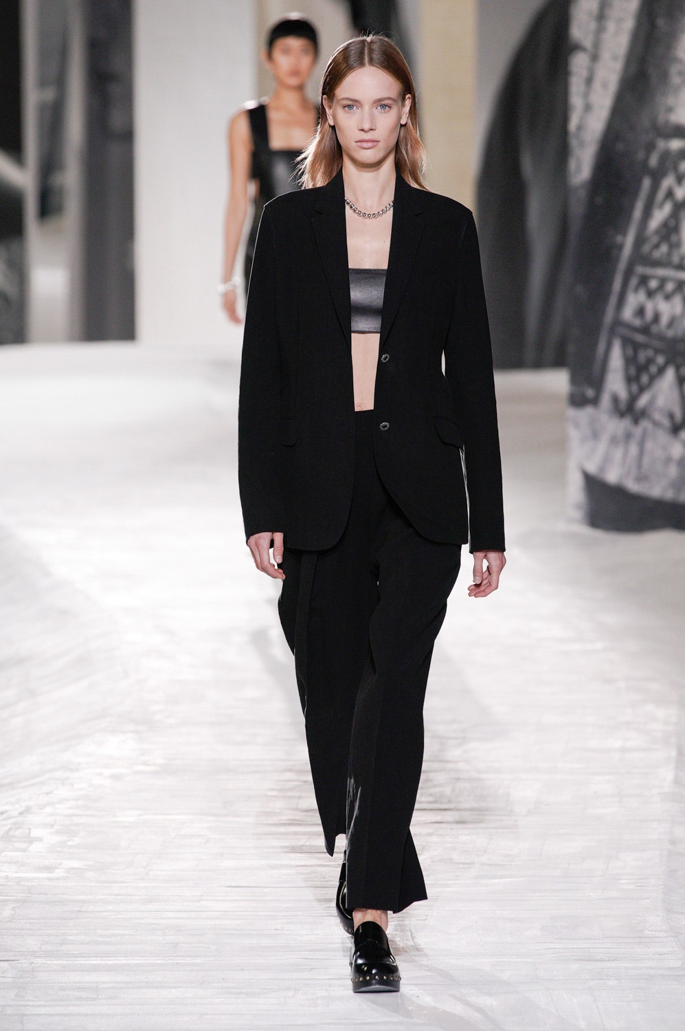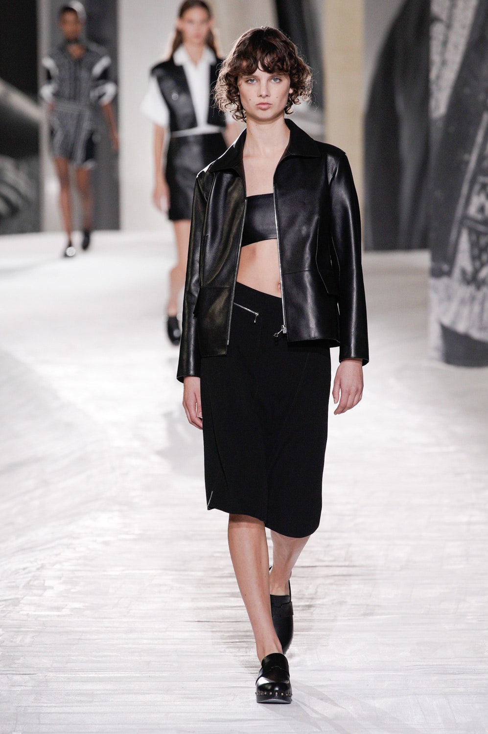 У нас могут быть десятки юбок миди, но кожаная, телесного оттенка, с серебряными молниями, идеальна, как ни одна другая. Впрочем, черная из этой же коллекции – еще лучше. Мы можем по-разному относиться к уместности комбинезонов в повседневности, но глядя на нежно-голубой в сочетании с красной помадой, в котором вышла на подиум вторая модель, хочется носить только его.