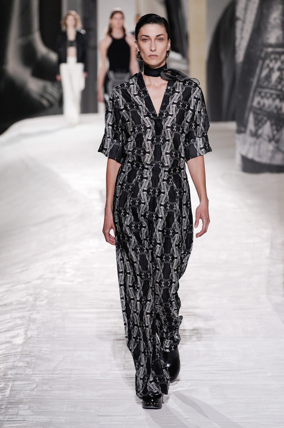 Глаза разбегаются то на принтованные шелковые платья и сочетание красного с терракотовым, то на двубортные пальто с глухими стойками, как у Кристиана Бейла в фильме "Эквилибриум". Ване-Цыбульски с легкостью удается завораживать даже минималистичной кожаной курткой в сочетании с белыми брюками.